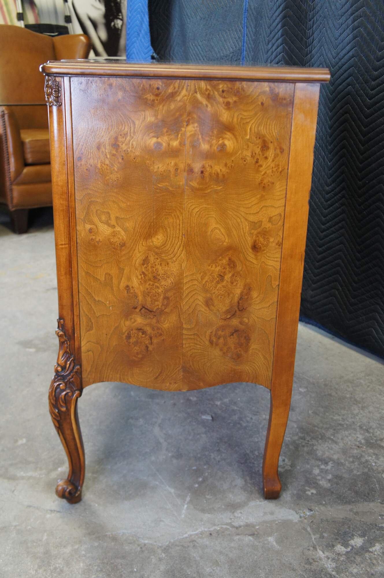 Antique Batesville French Provincial Louis XV Carpathian Elm cabinet / sideboard / buffet / credenza / console / commode / server. Made of Carpathian cluster elm burl featuring serpentine form with floral and acanthus carvings, and cabriole legs. 645.