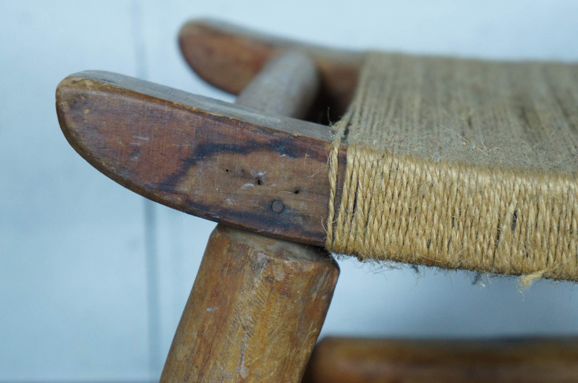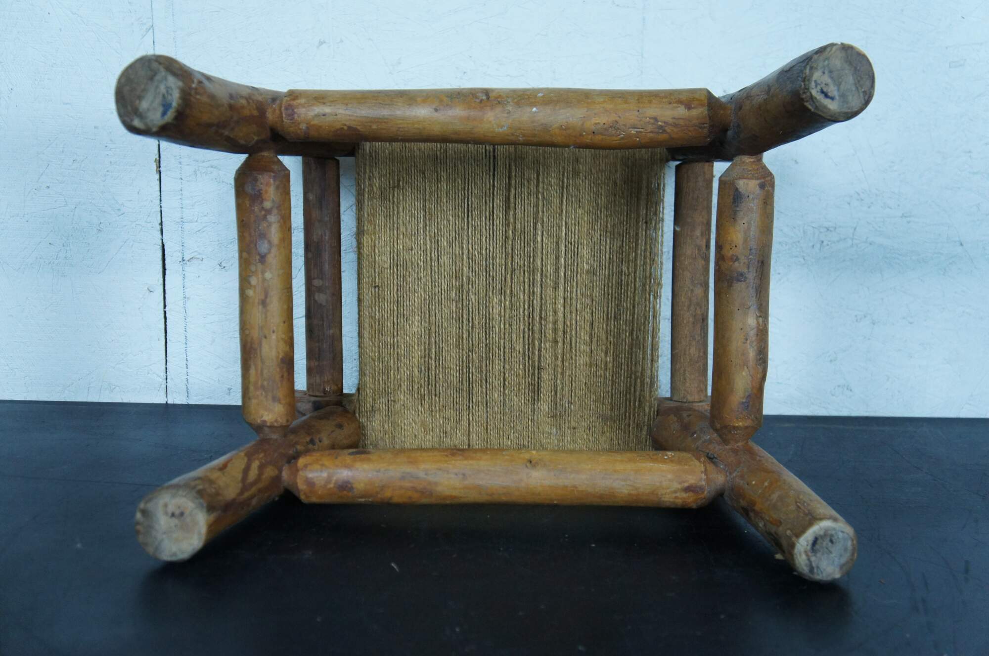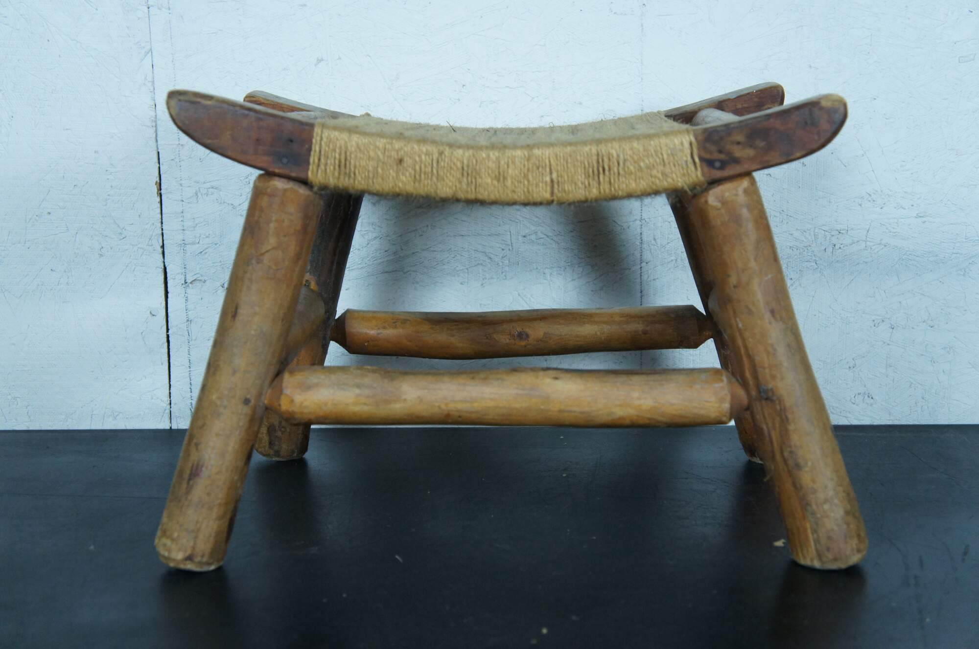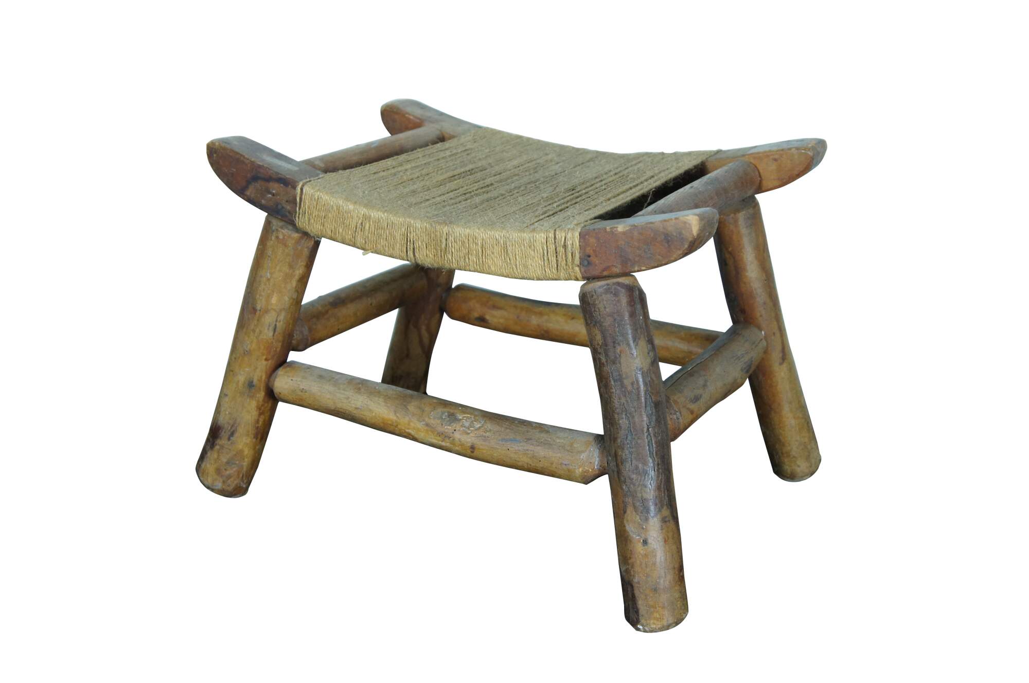 Early 20th century rustic early American / country farmhouse / Shaker style milking stool / foot rest featuring adirondack log form carved legs, bowed top and a simple jute rope seat.