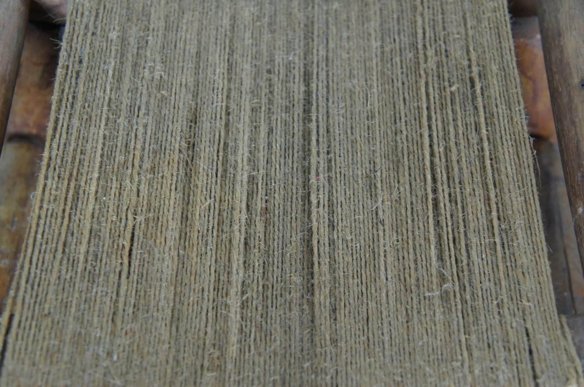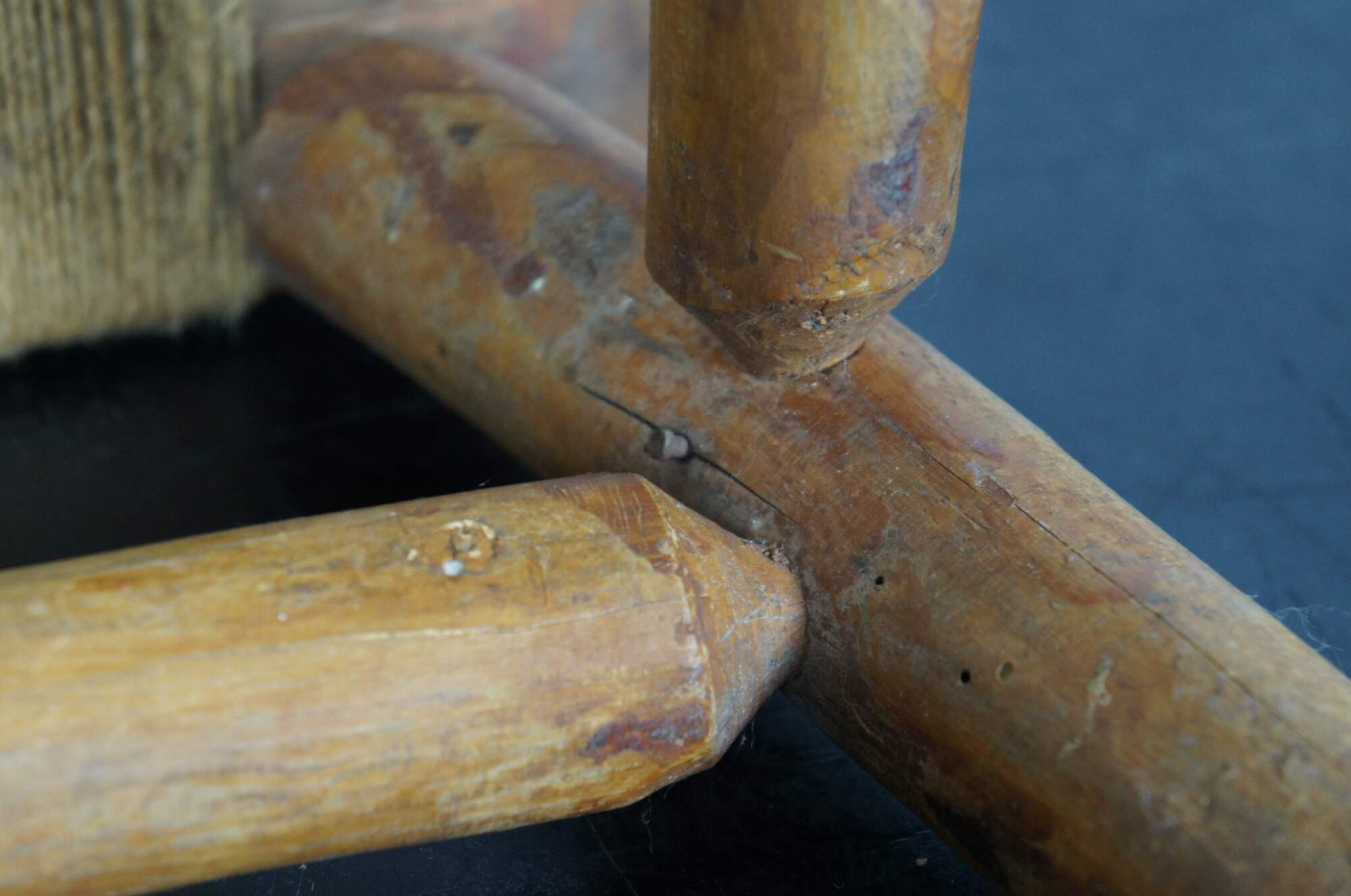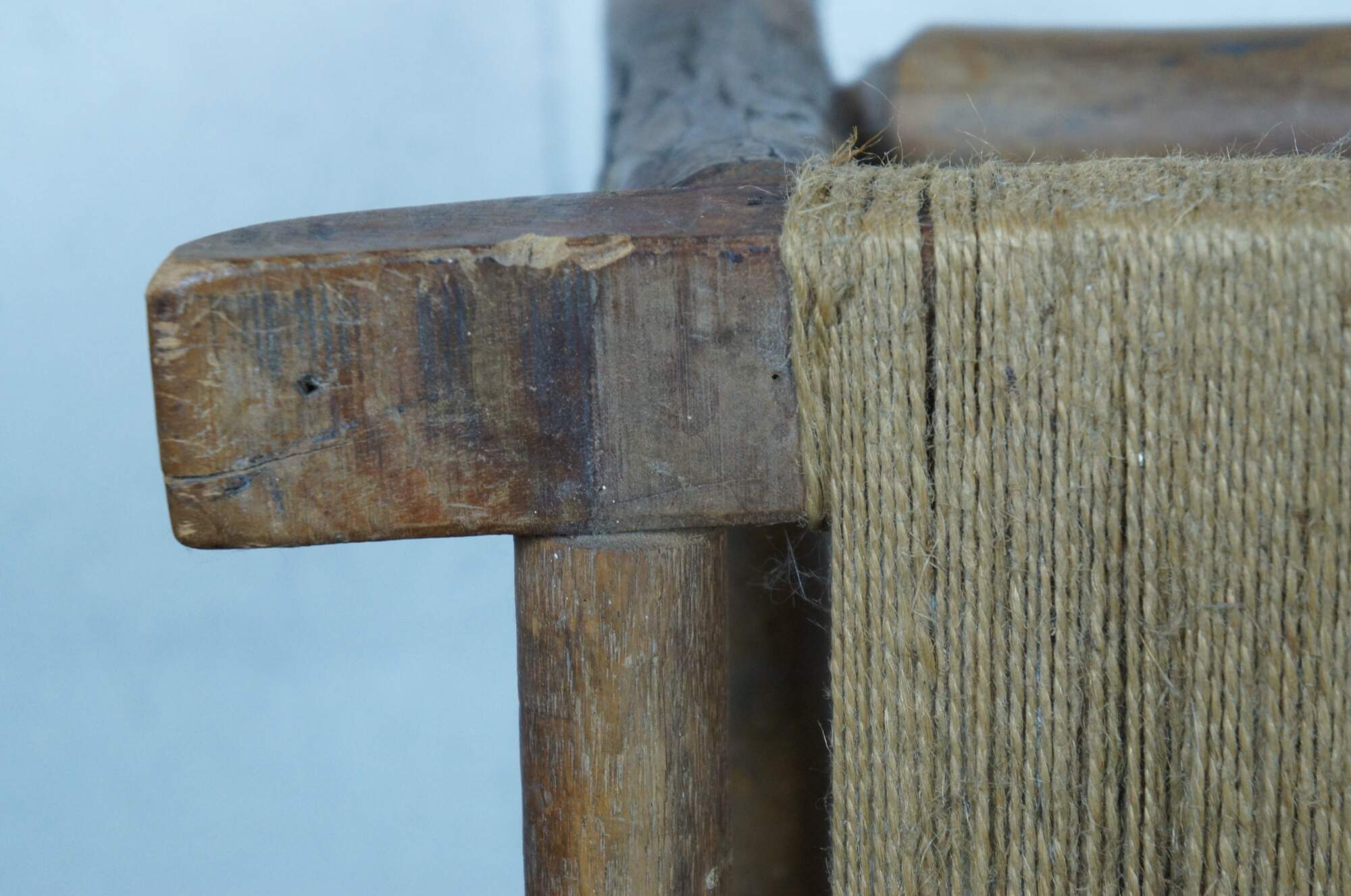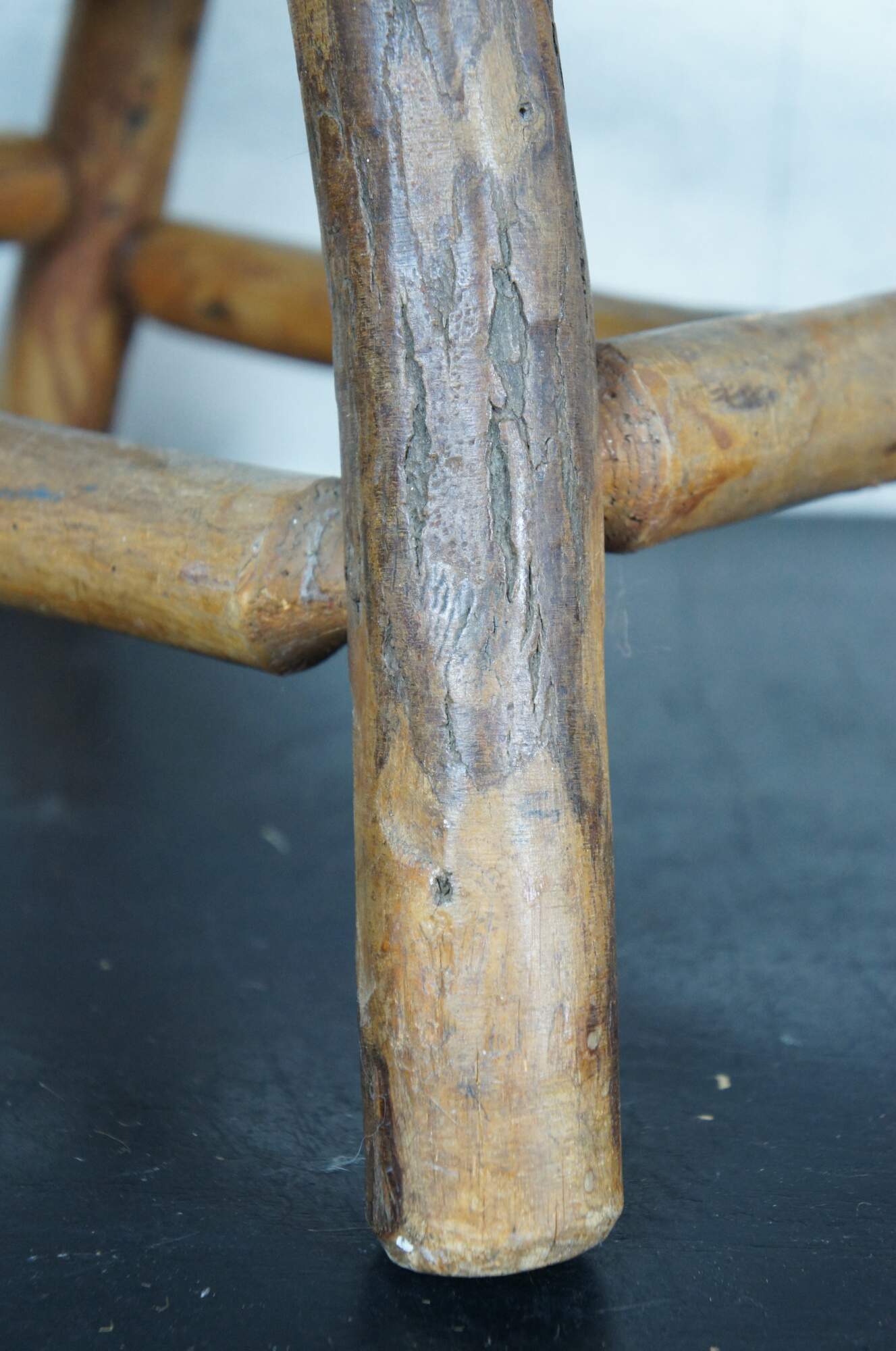 Early 20th century rustic early American / country farmhouse / Shaker style milking stool / foot rest featuring adirondack log form carved legs, bowed top and a simple jute rope seat.