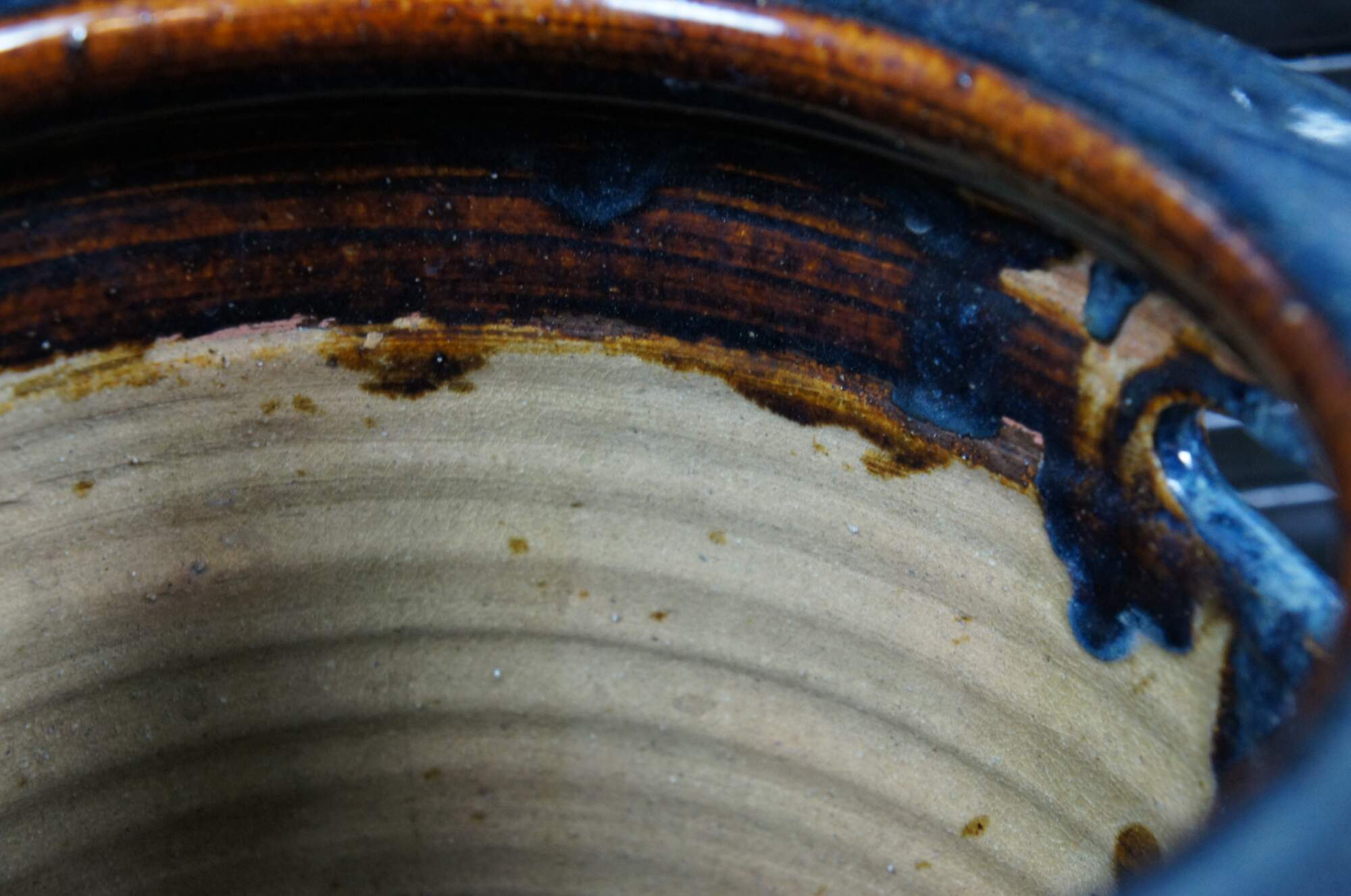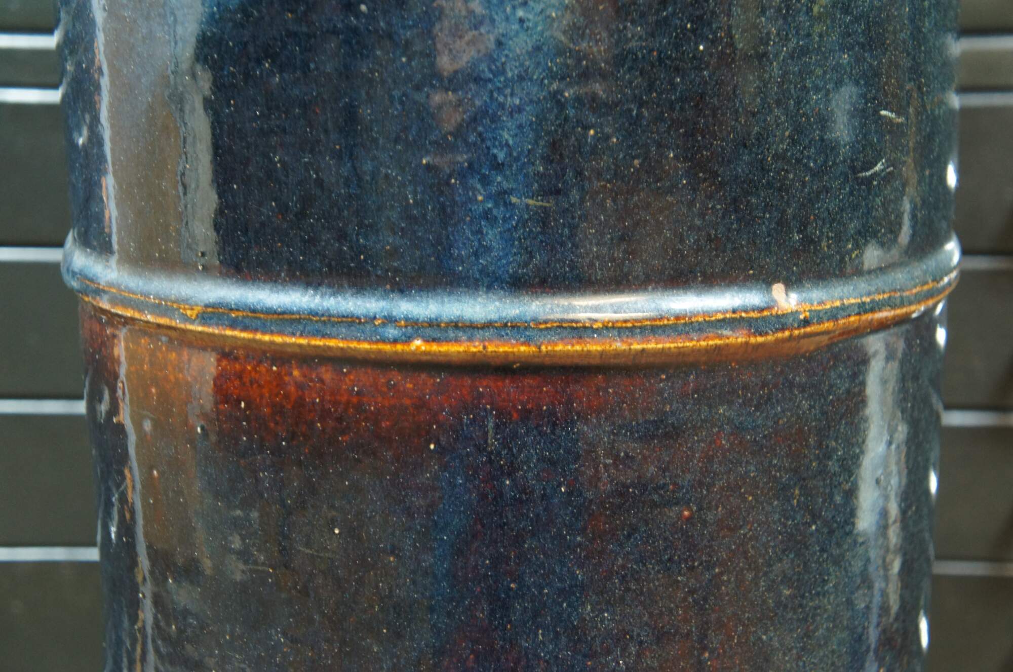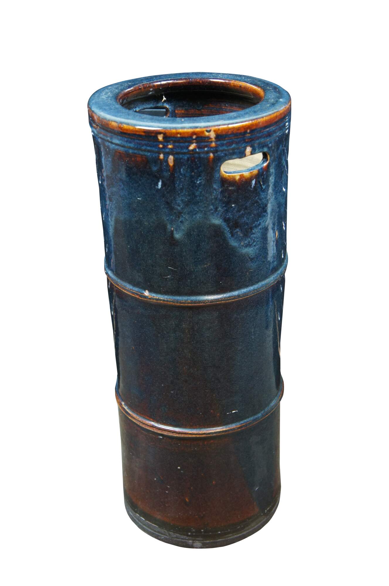 Mid century ceramic umbrella stand / floor vase, cylindrical form, molded like bamboo with cut out handles, glazed in blue and brown.