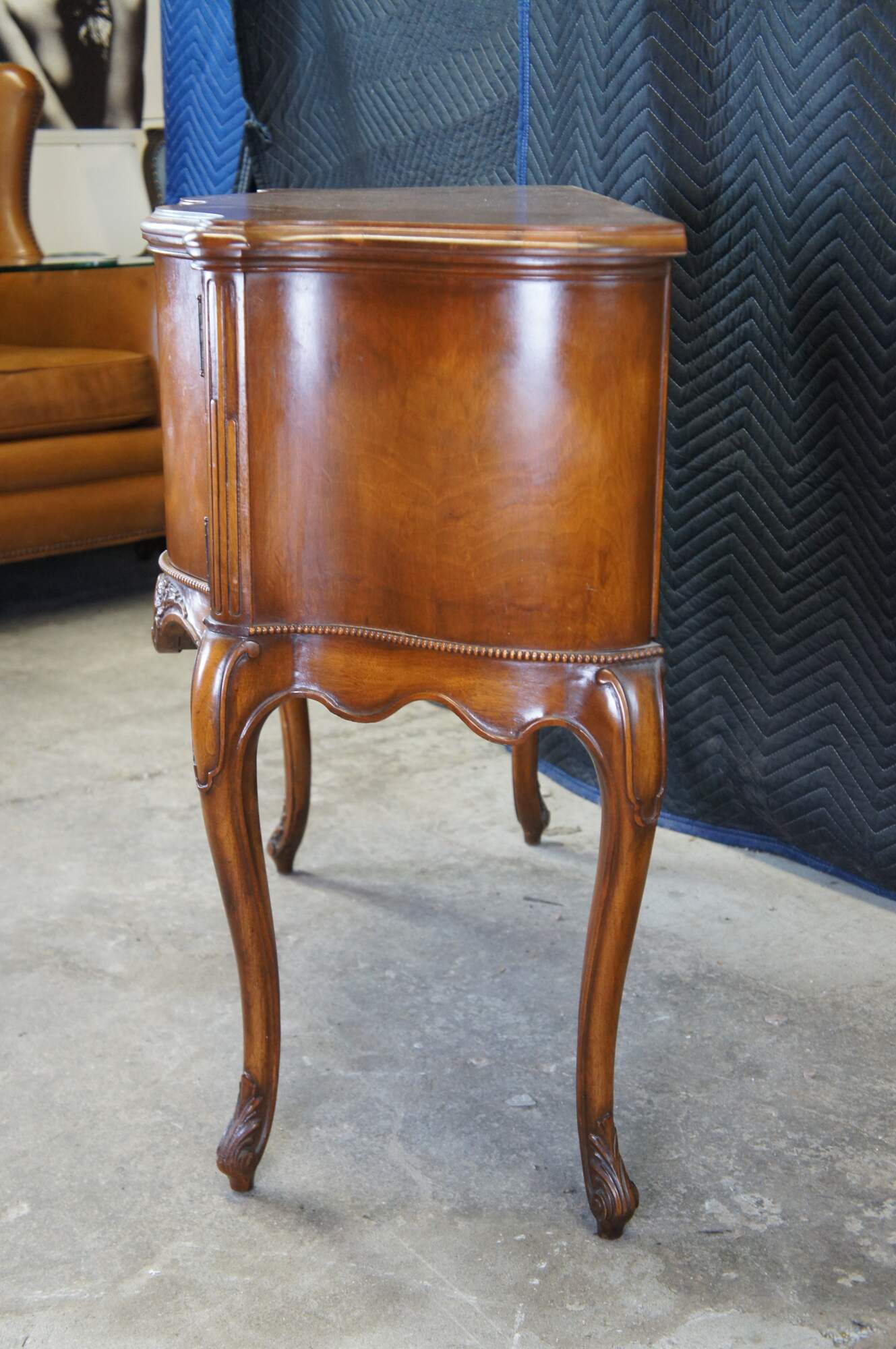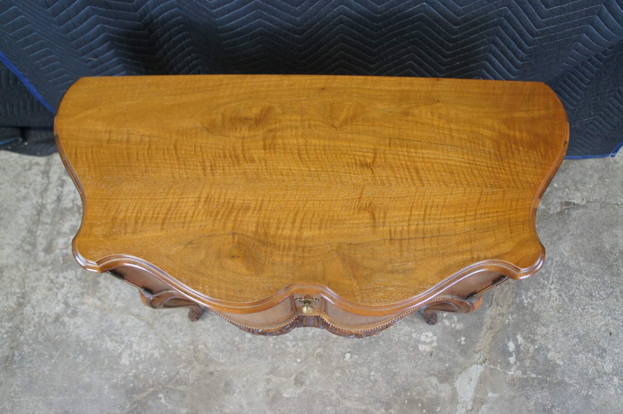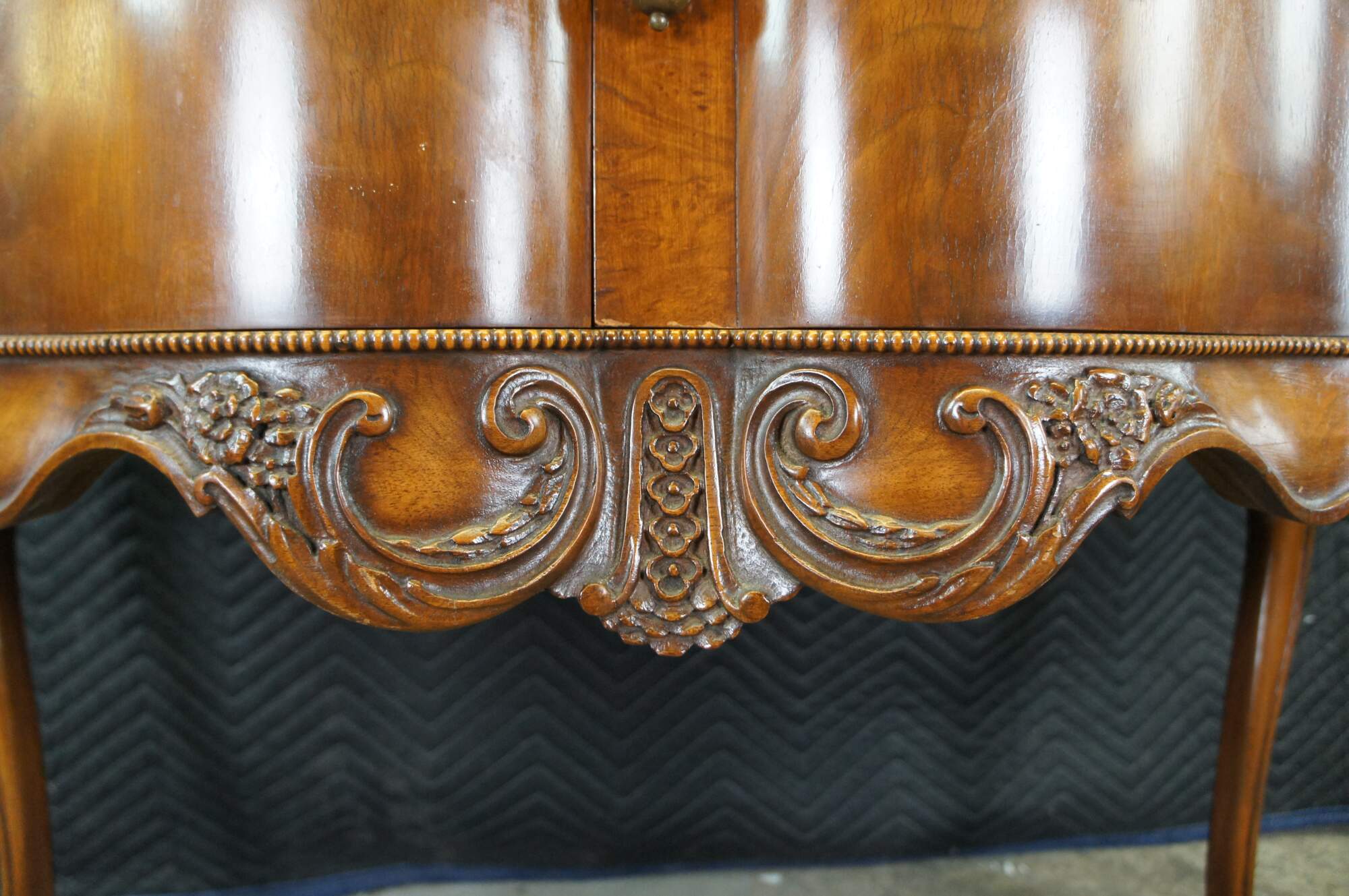 Antique Imperial Cabinet Co French Provincial Louis XV console table / server / sideboard / credenza / commode. Made of walnut featuring serpentine / demilune form with carved floral and acanthus design. Made in Grand Rapids Michigan, 15 46.