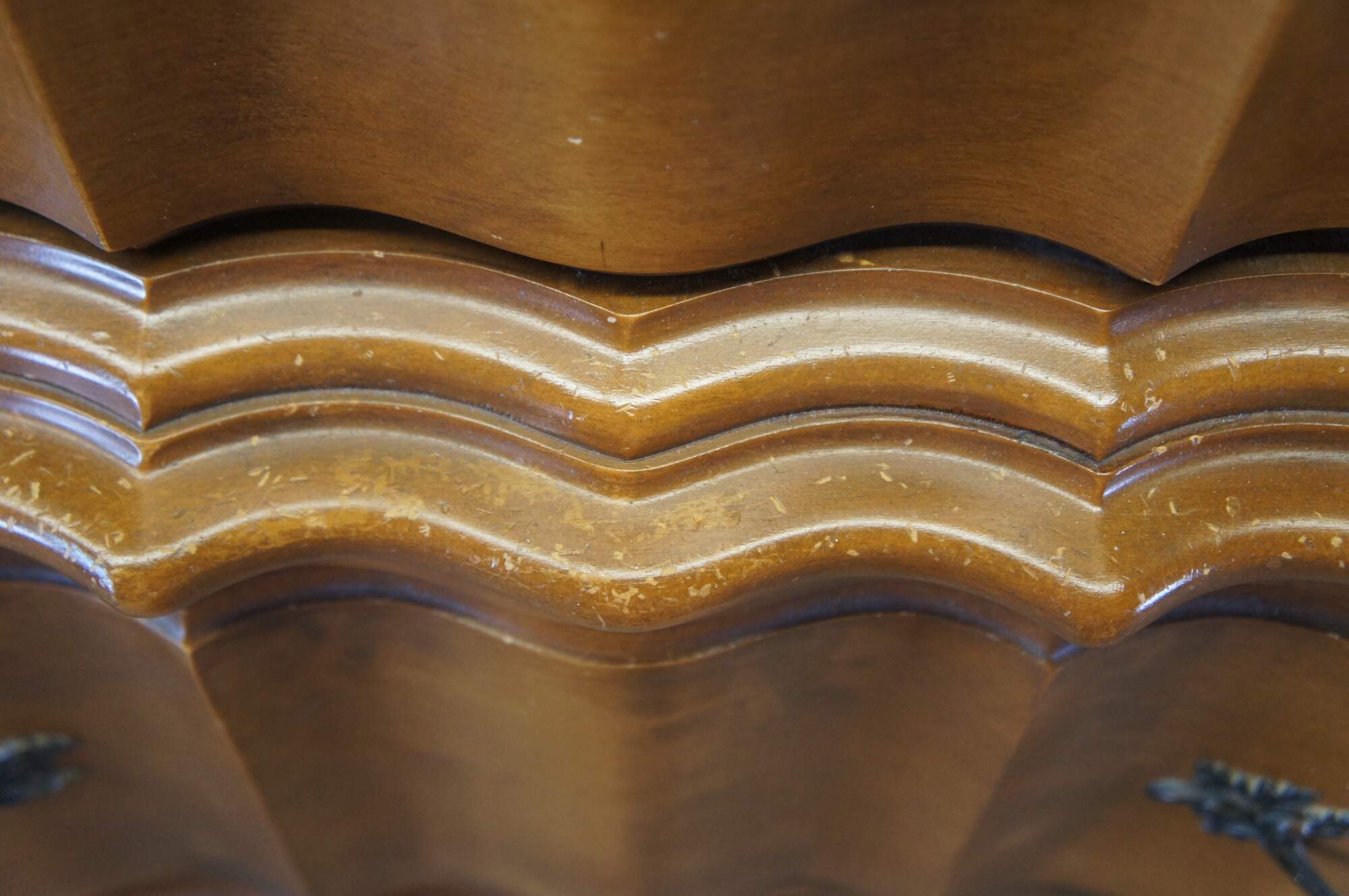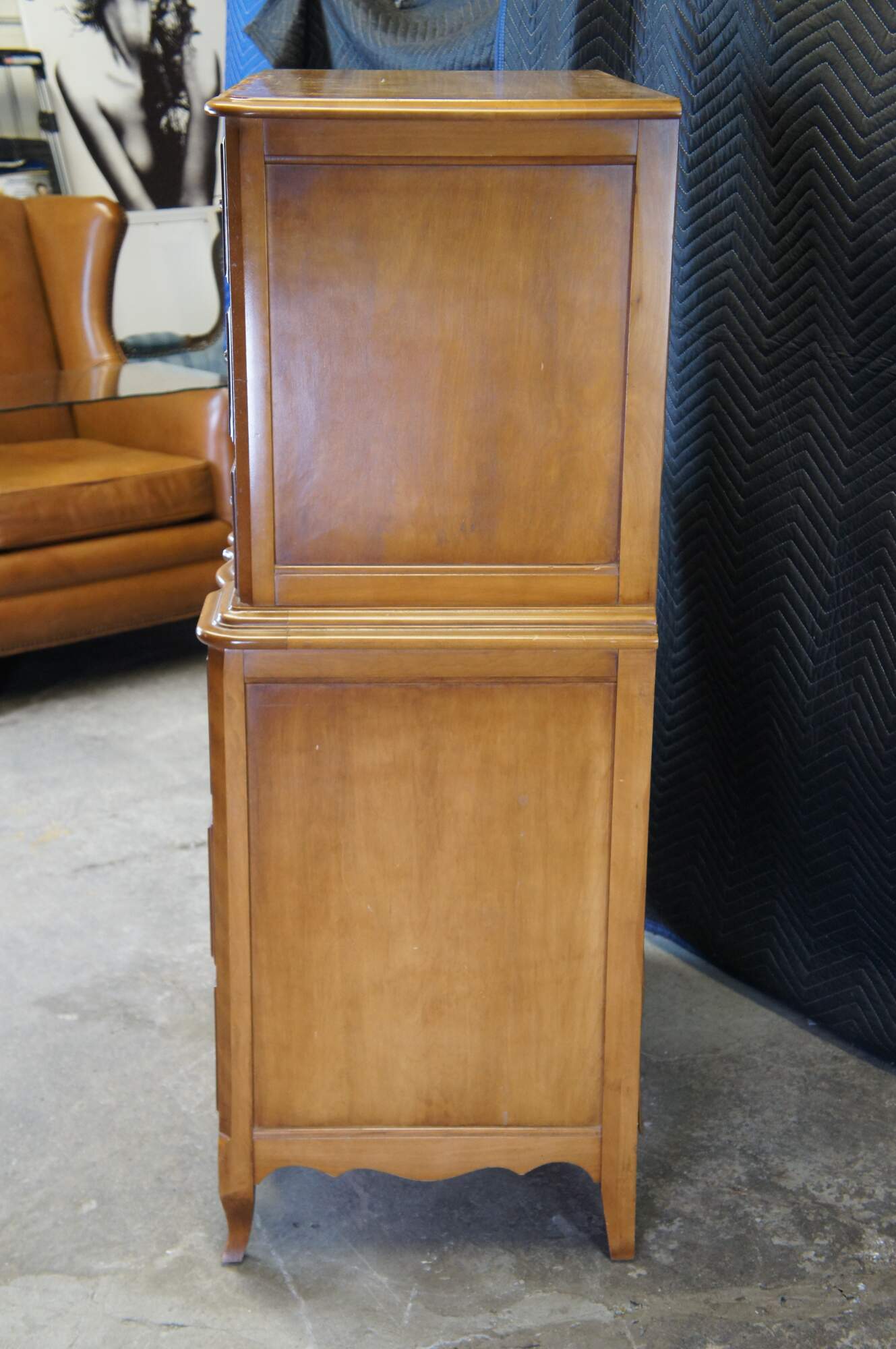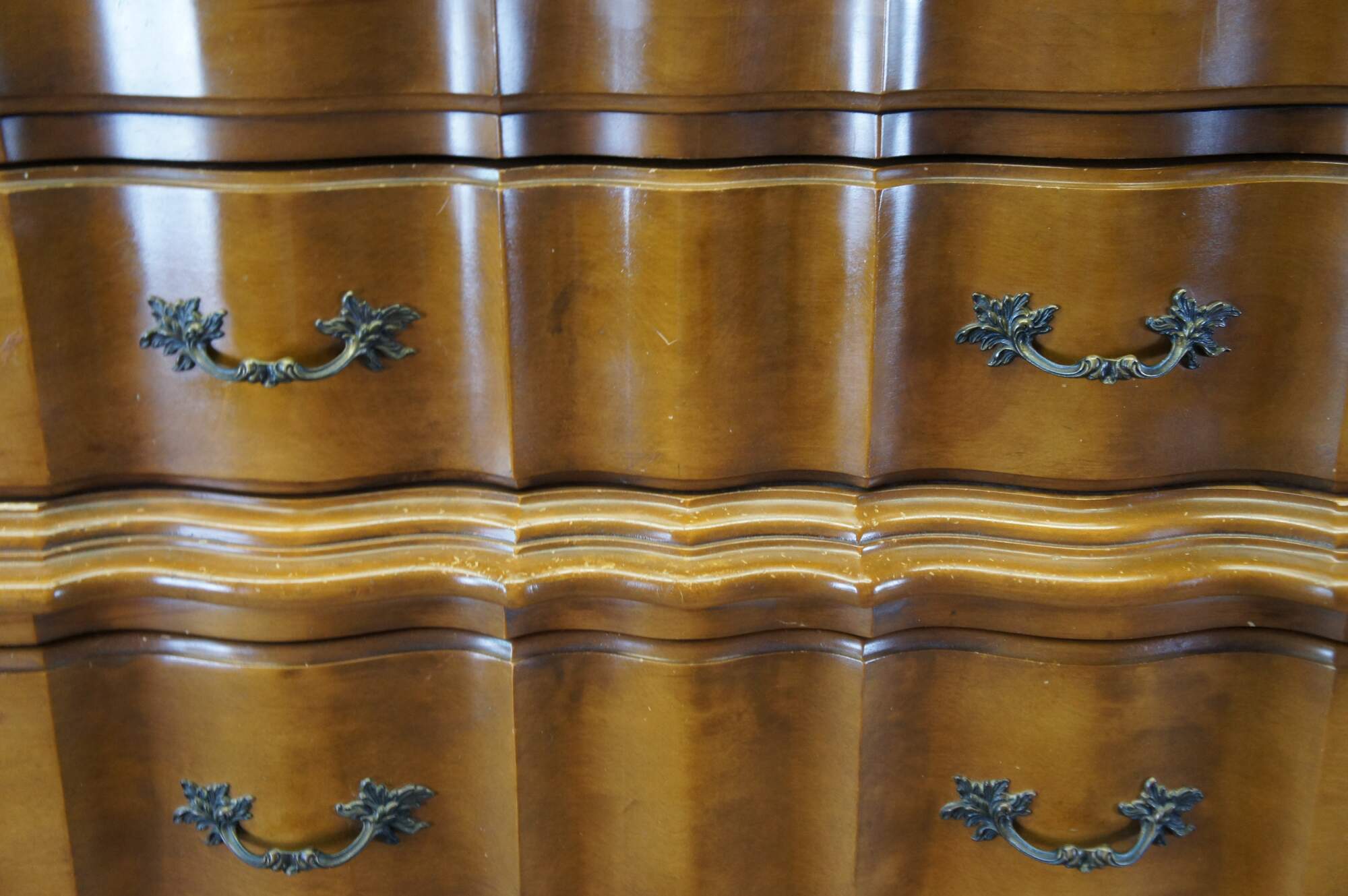 Mid Century French Provincial Burns Case Goods tallboy / highboy chest of drawers / chest on chest style dresser. Made of walnut featuring serpentine form with six drawers and brass hardware.