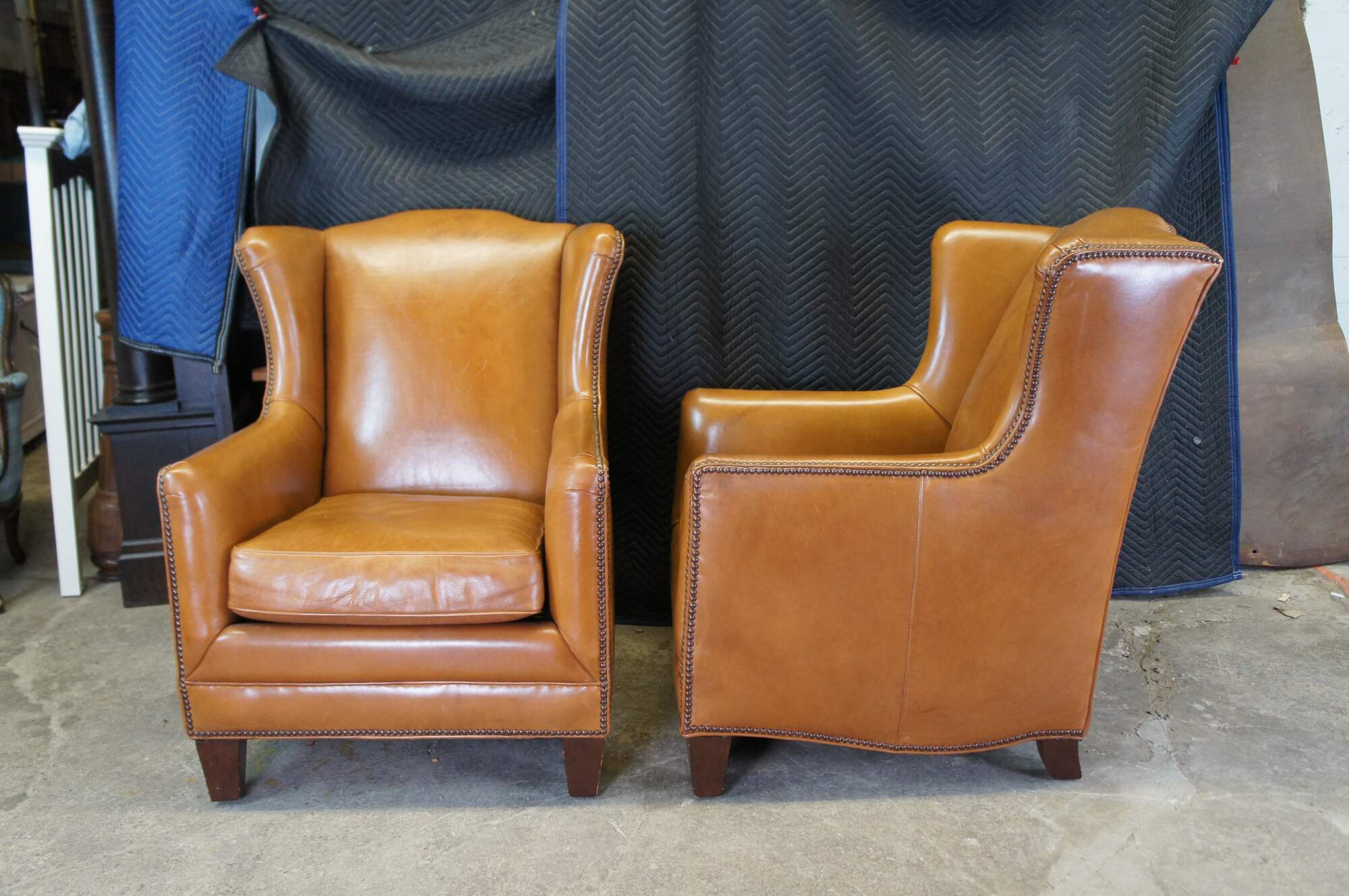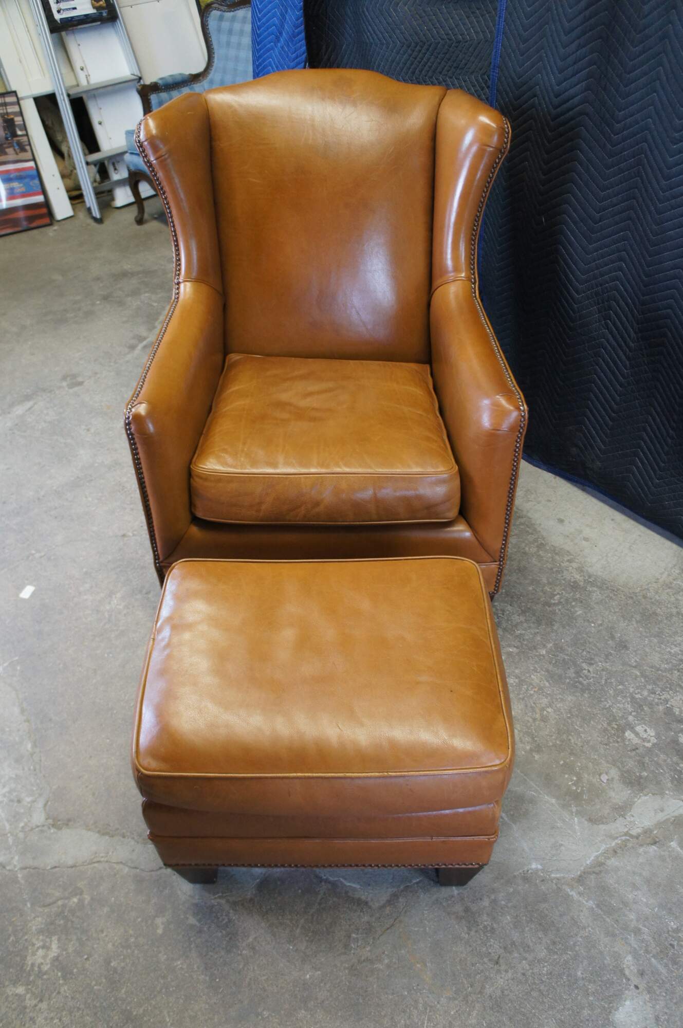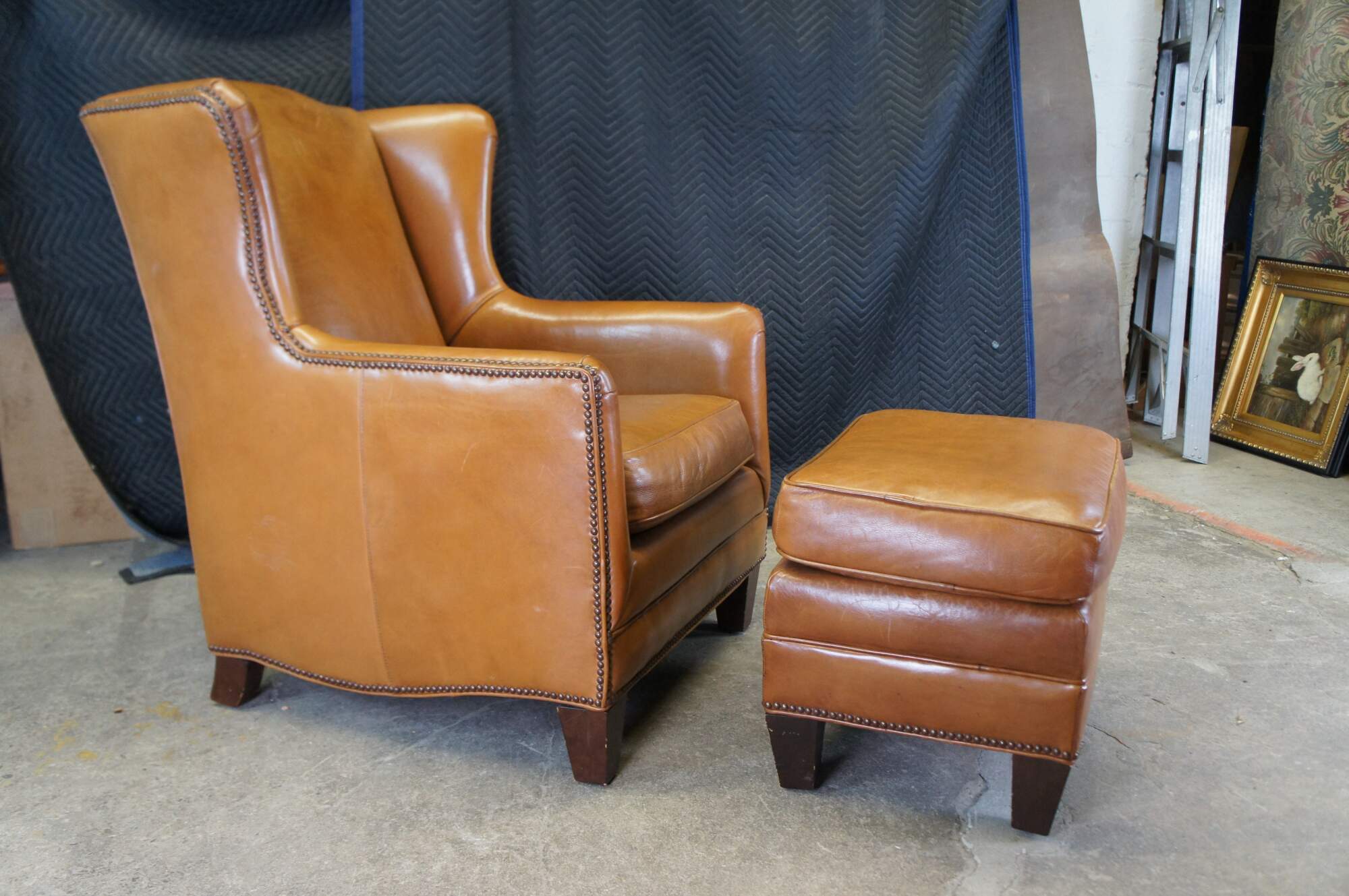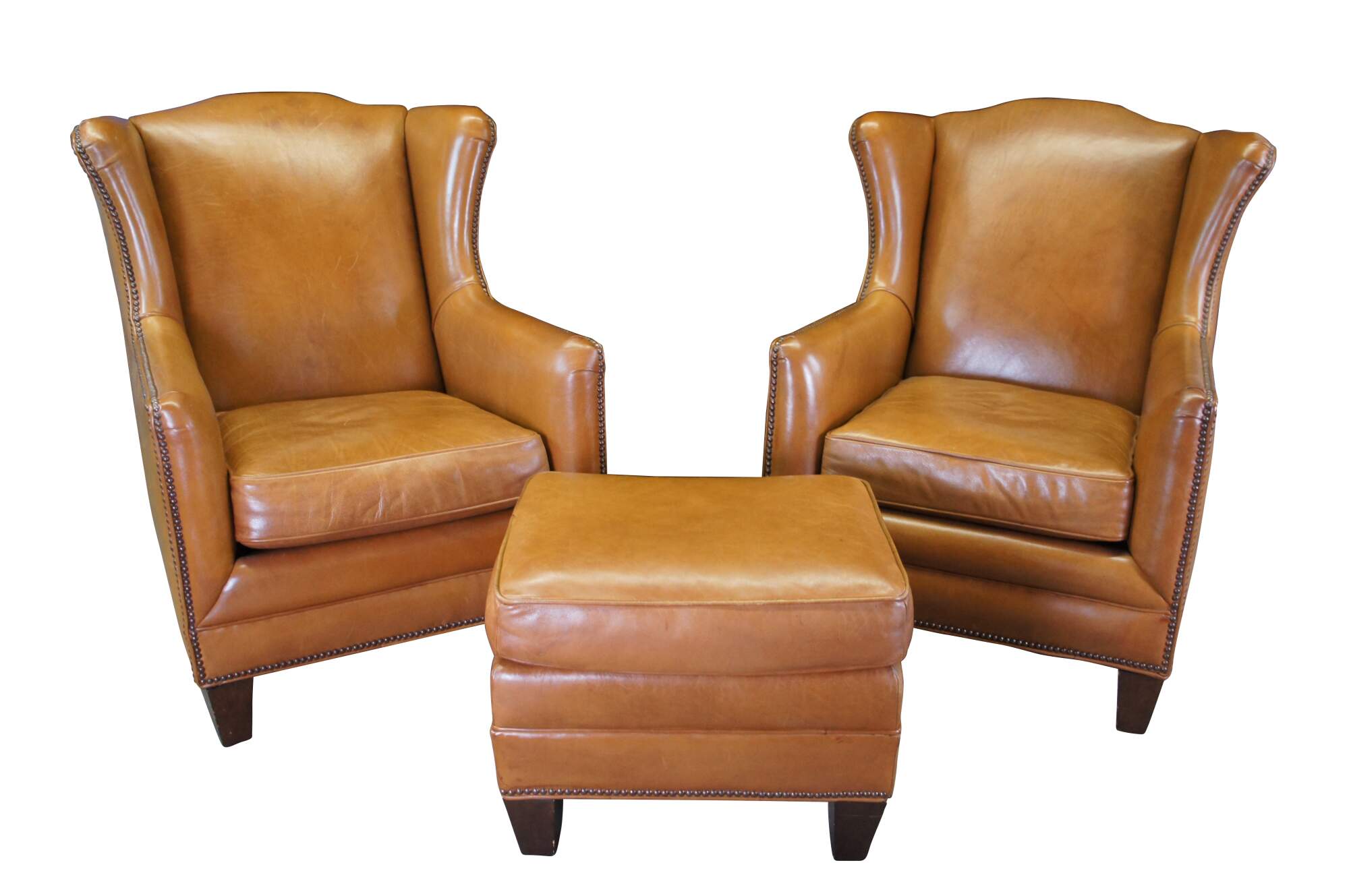 Set of two vintage Henredon club / lounge / library wingback arm chairs and ottoman featuring traditional styling with brown leather upholstery and nailhead trim.