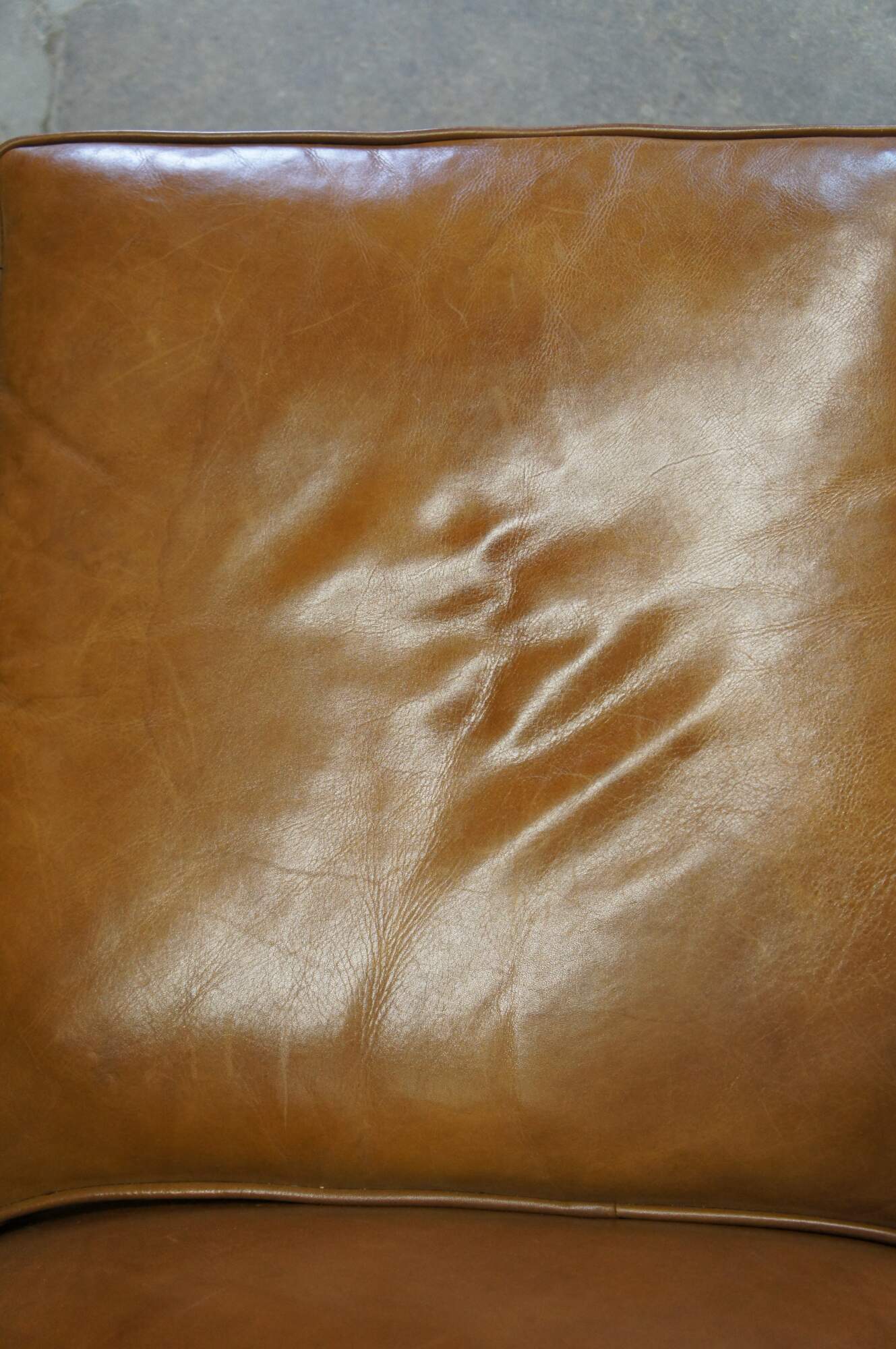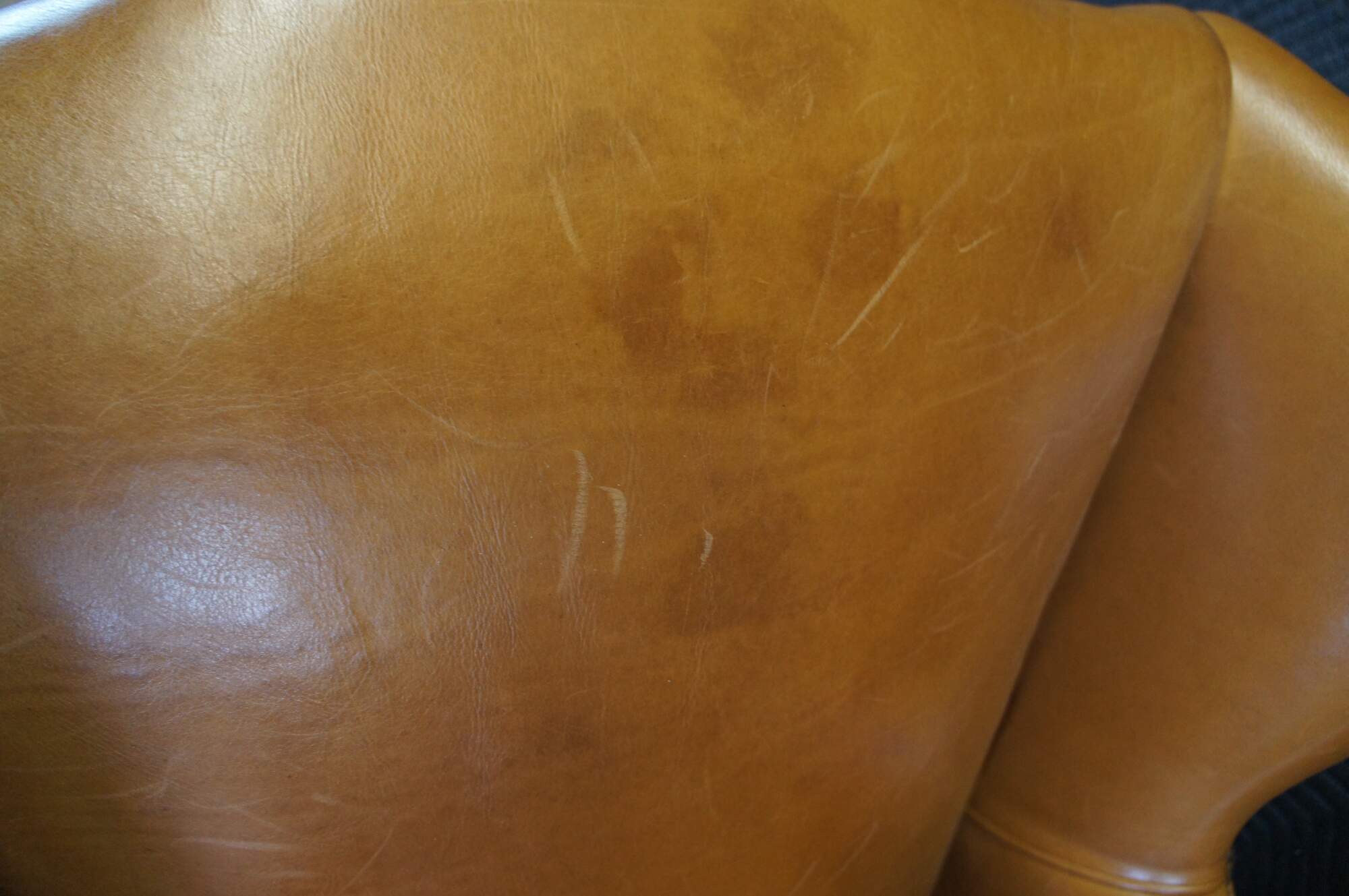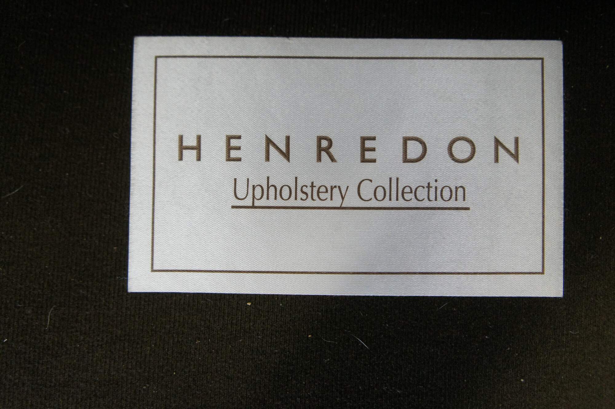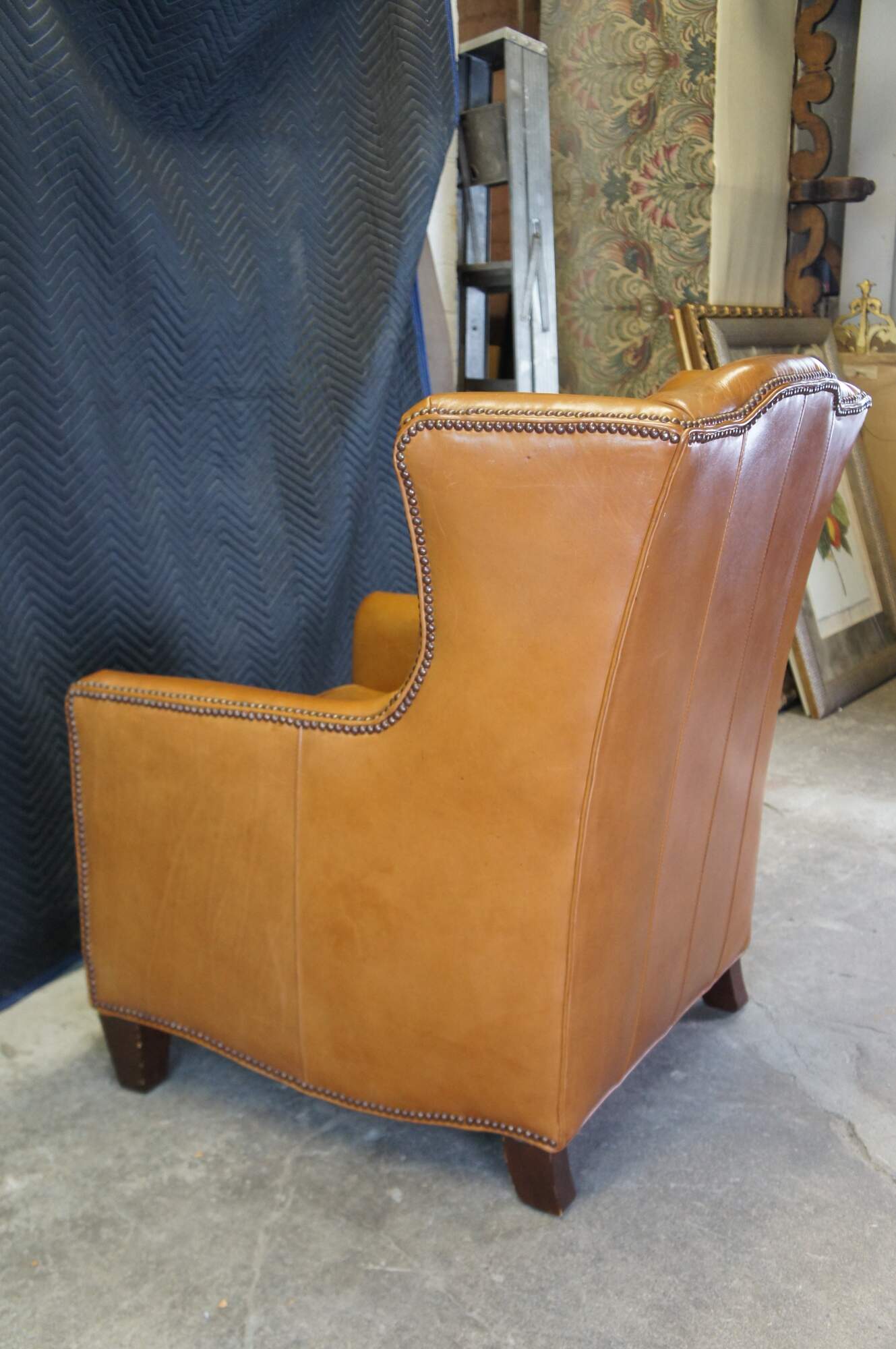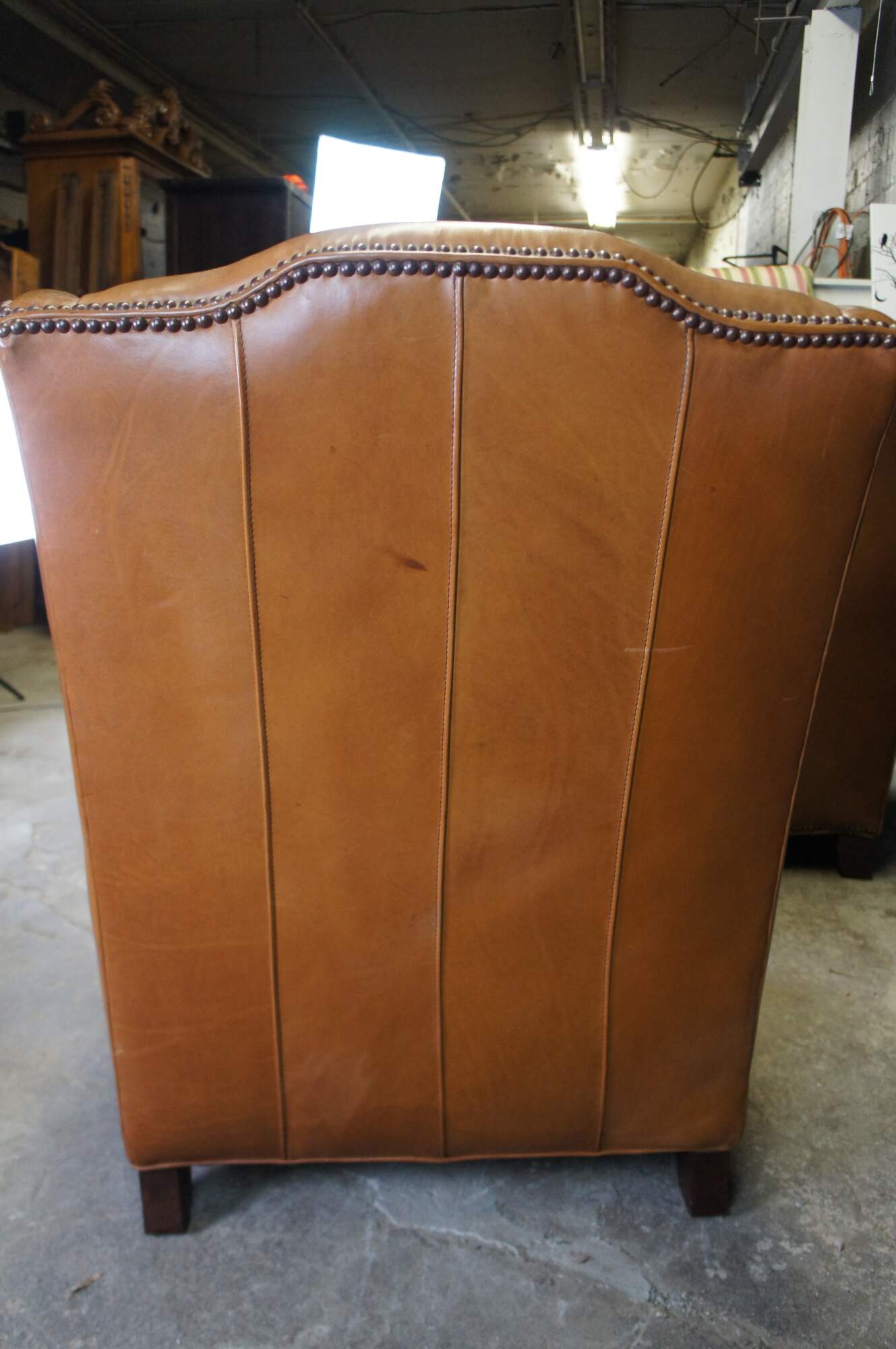 Set of two vintage Henredon club / lounge / library wingback arm chairs and ottoman featuring traditional styling with brown leather upholstery and nailhead trim.