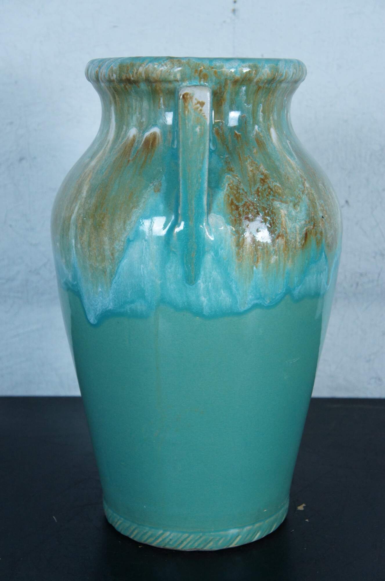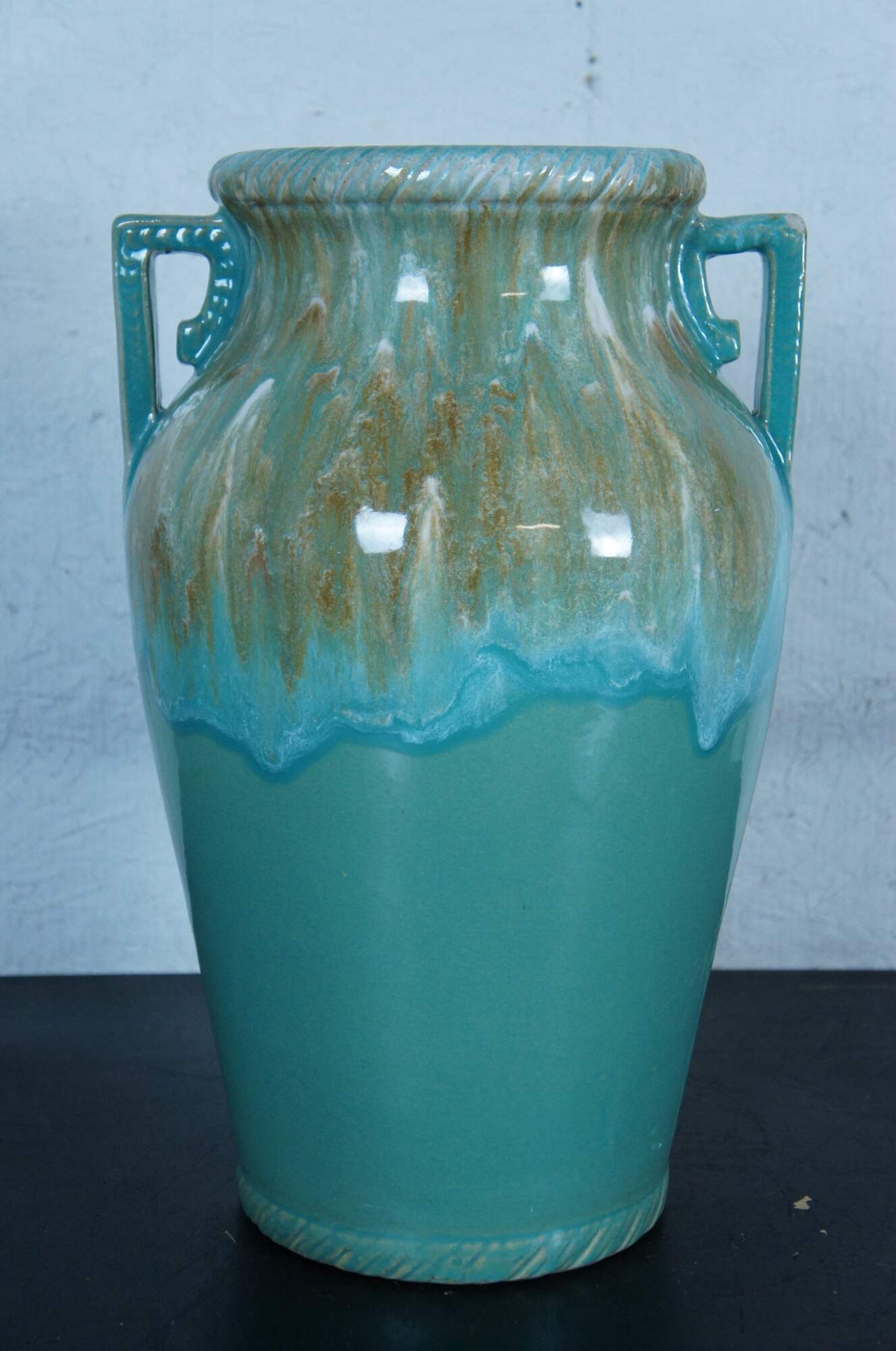 Vintage Robinson Ransbottom, number 155 floor vase / urn. Traditional shape with geometric art deco / pseudo Greek Key handles and rope twist edging at the rim and base. Finished in a turquoise green / blue / brown rip glaze. Incised USA 155 on base.