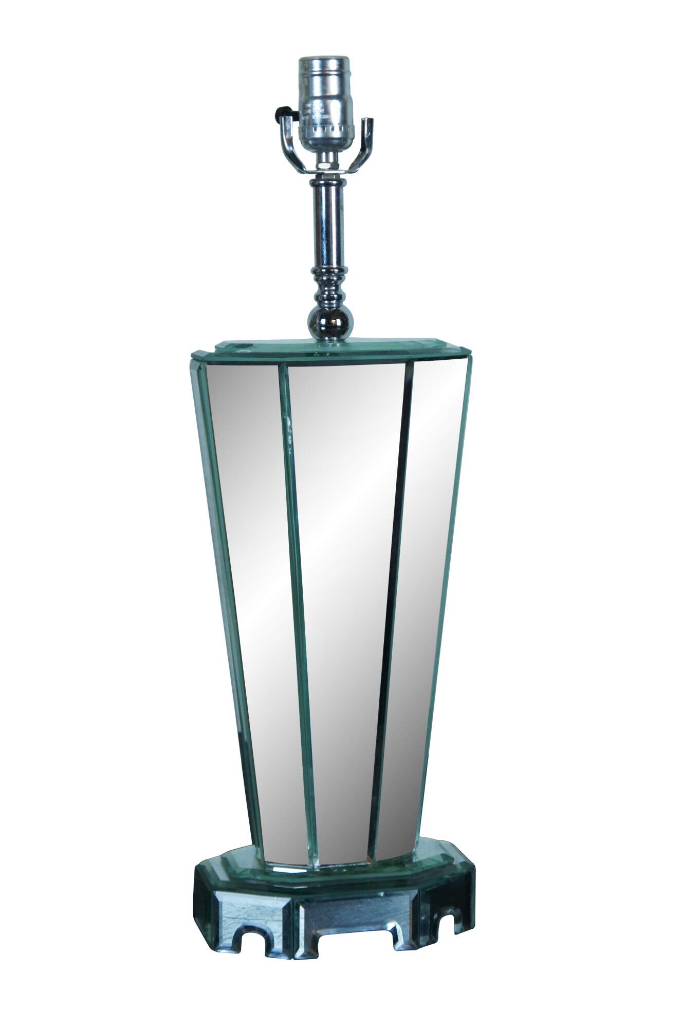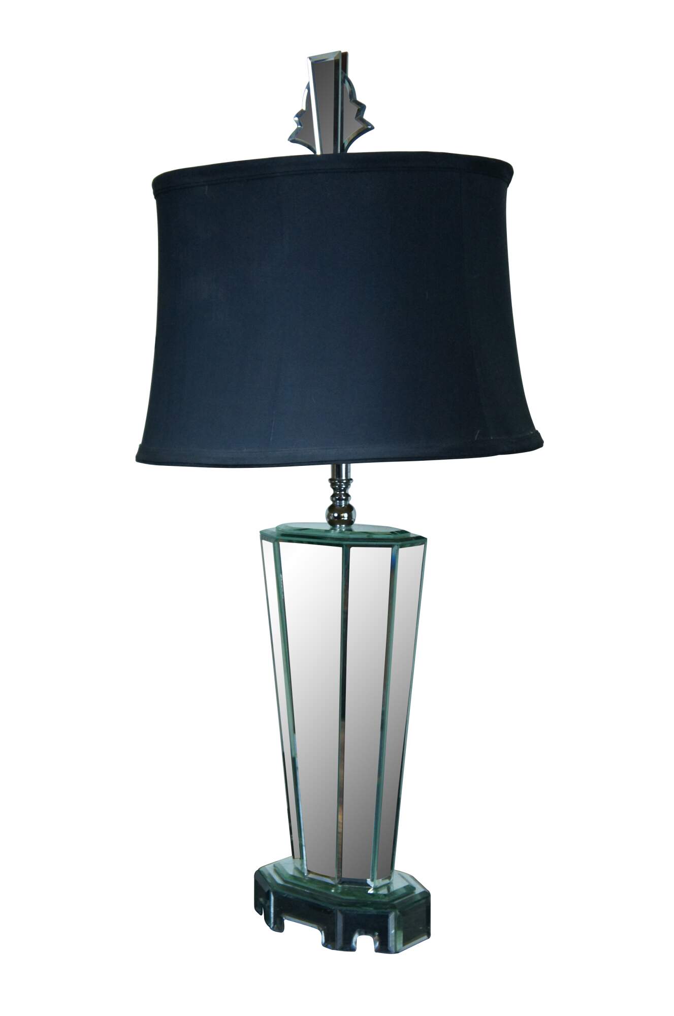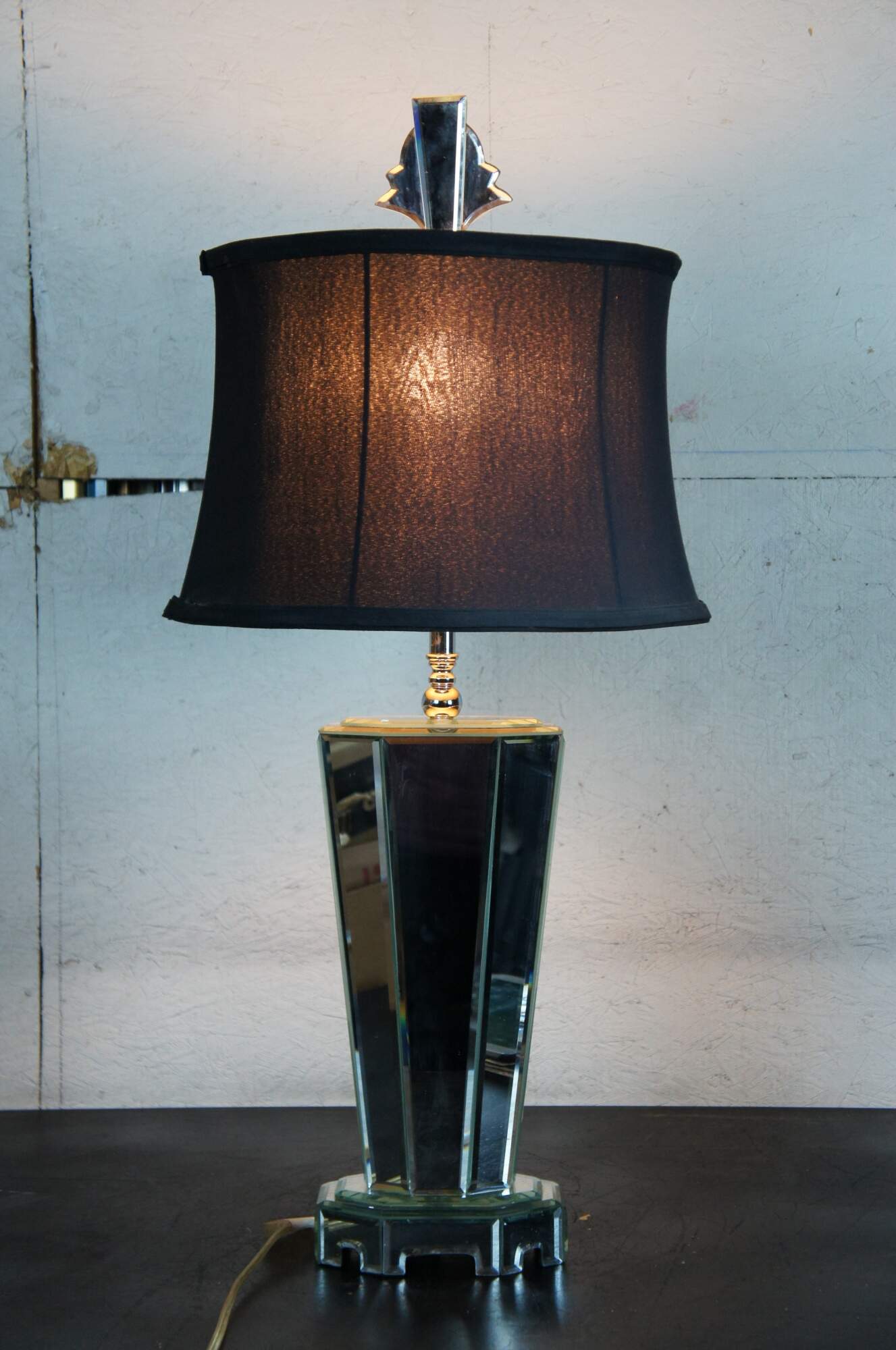 Late 20th century Venetian / Art Deco style table lamp featuring a crenelated base with a tapered mirrored column and chrome hardware. Includes harp, fan shaped finial, and black fabric shade.