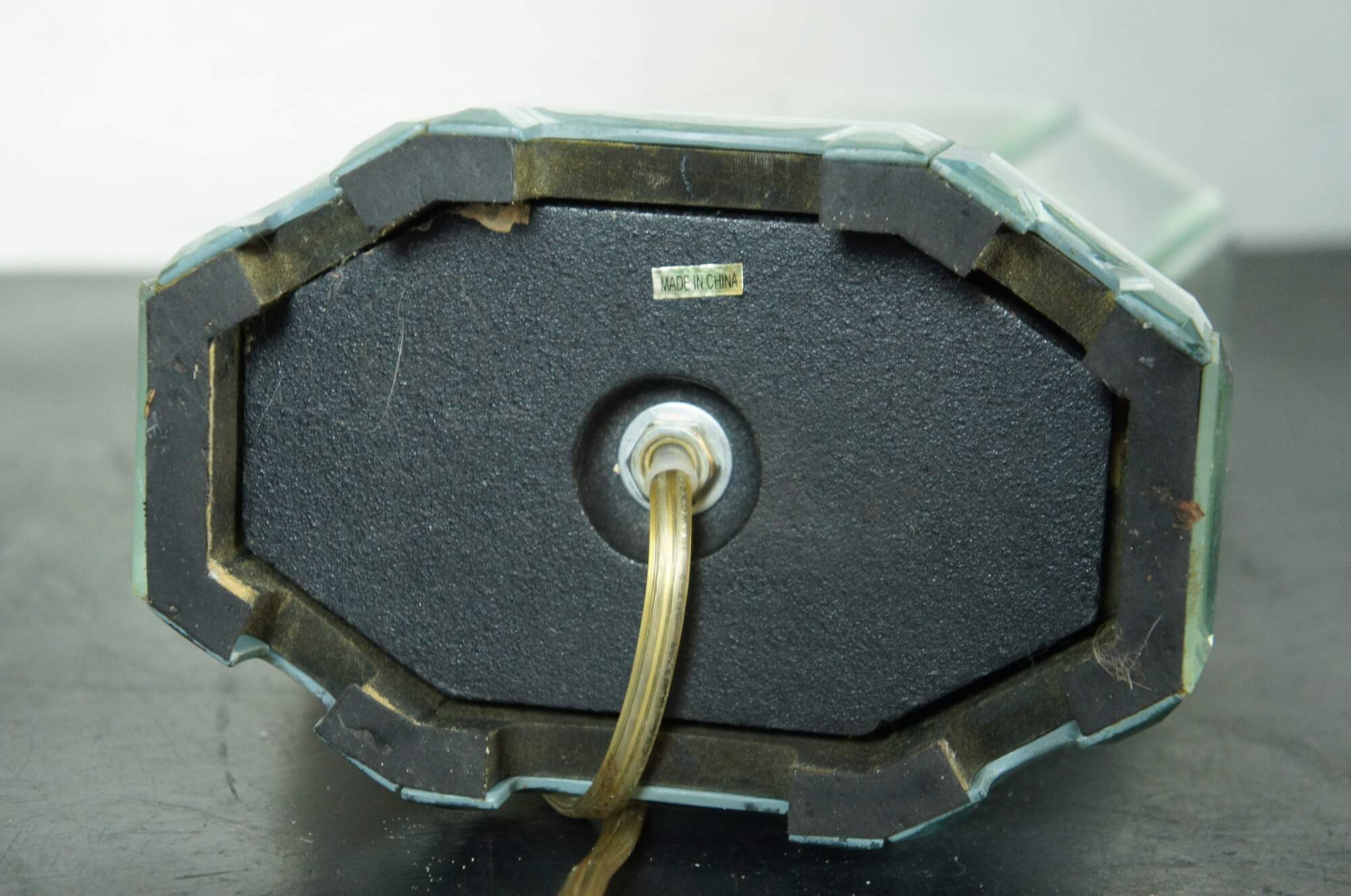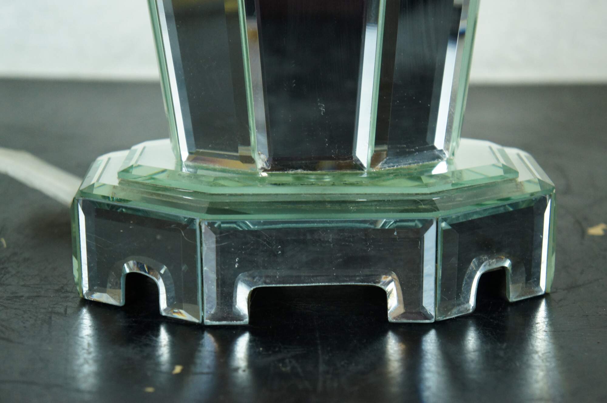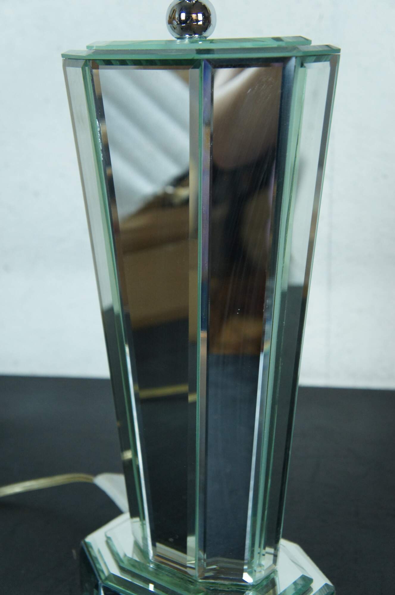 Late 20th century Venetian / Art Deco style table lamp featuring a crenelated base with a tapered mirrored column and chrome hardware. Includes harp, fan shaped finial, and black fabric shade.