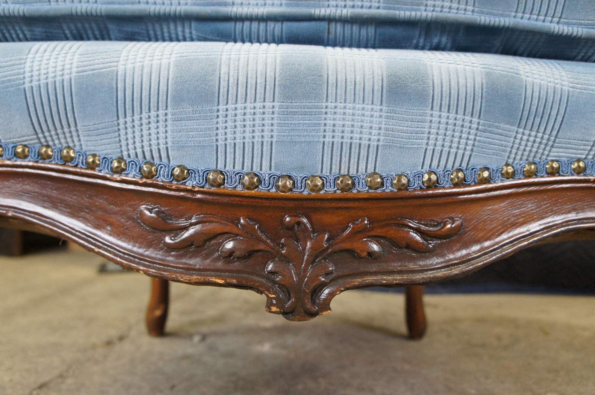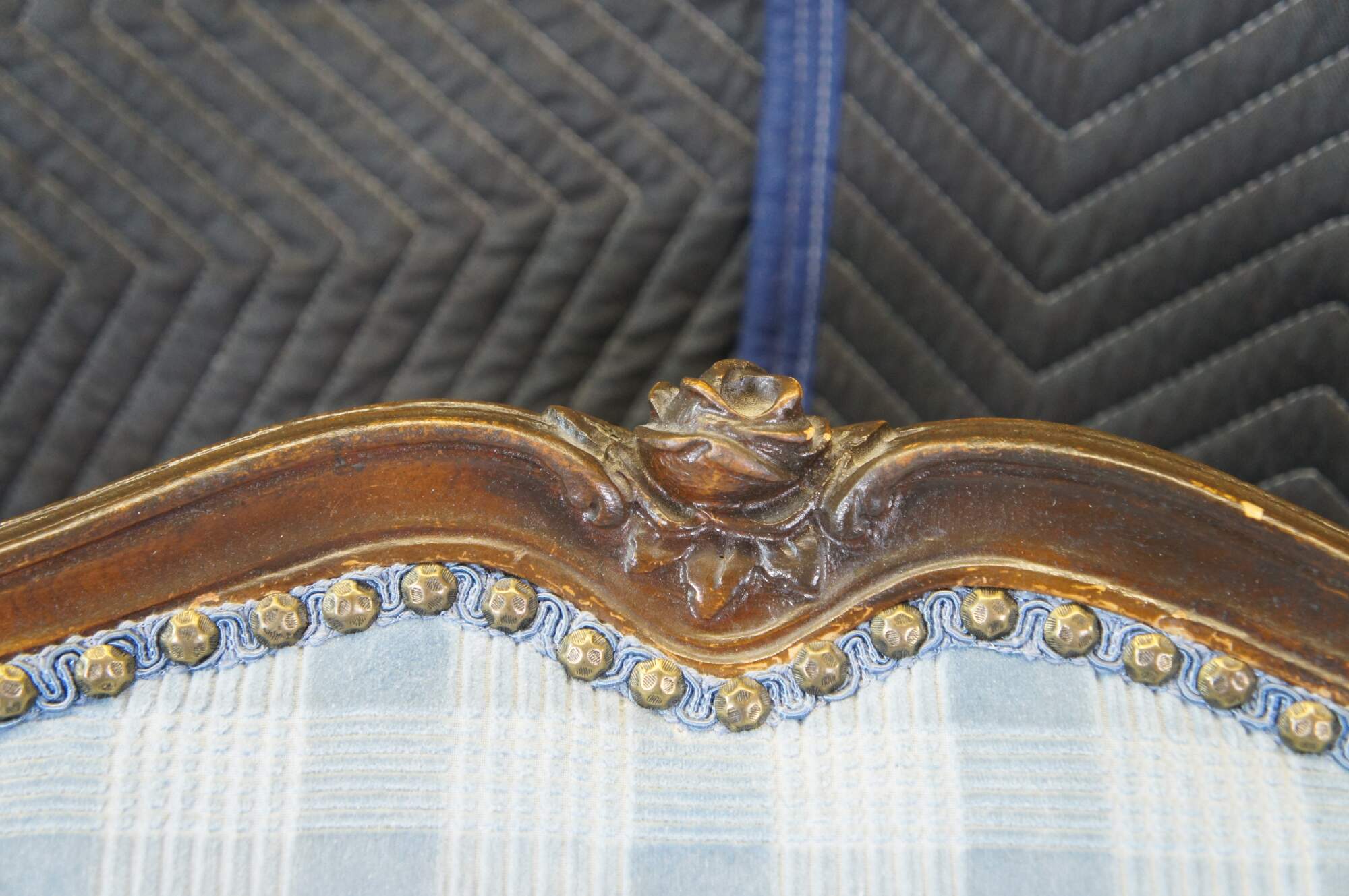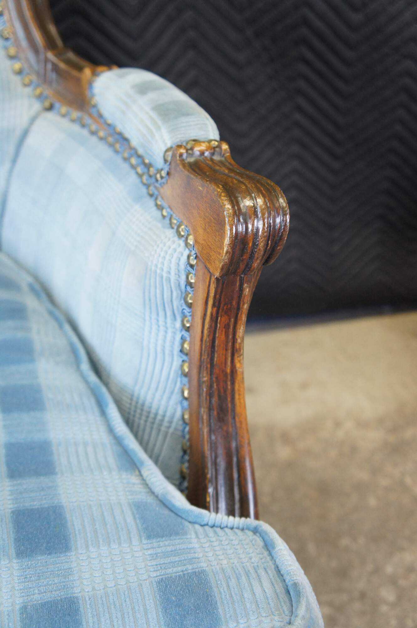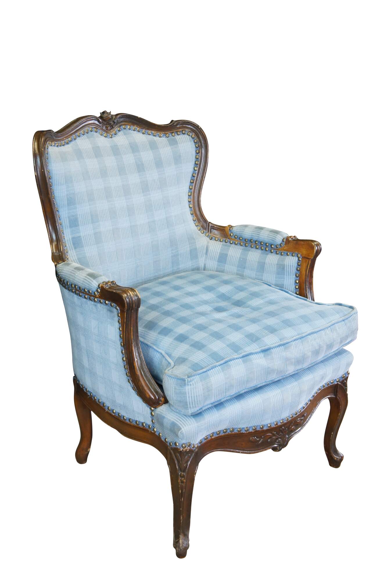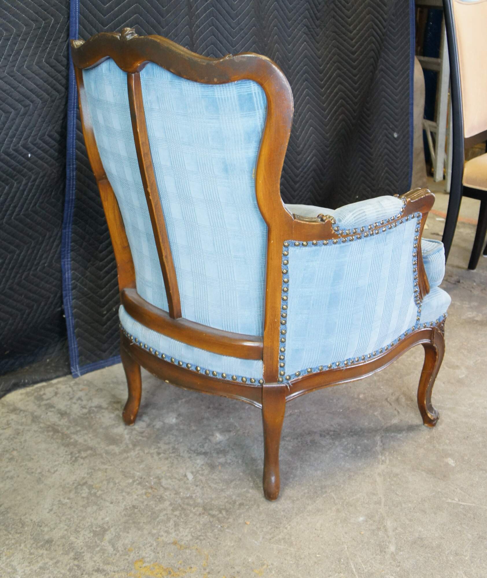 Mid Century French Provincial club lounge library arm chair. Walnut frame featuring serpentine wingback style design with carved rose and acanthus accents, padded fauteuil arms and blue plaid / geometric / checked upholstery.