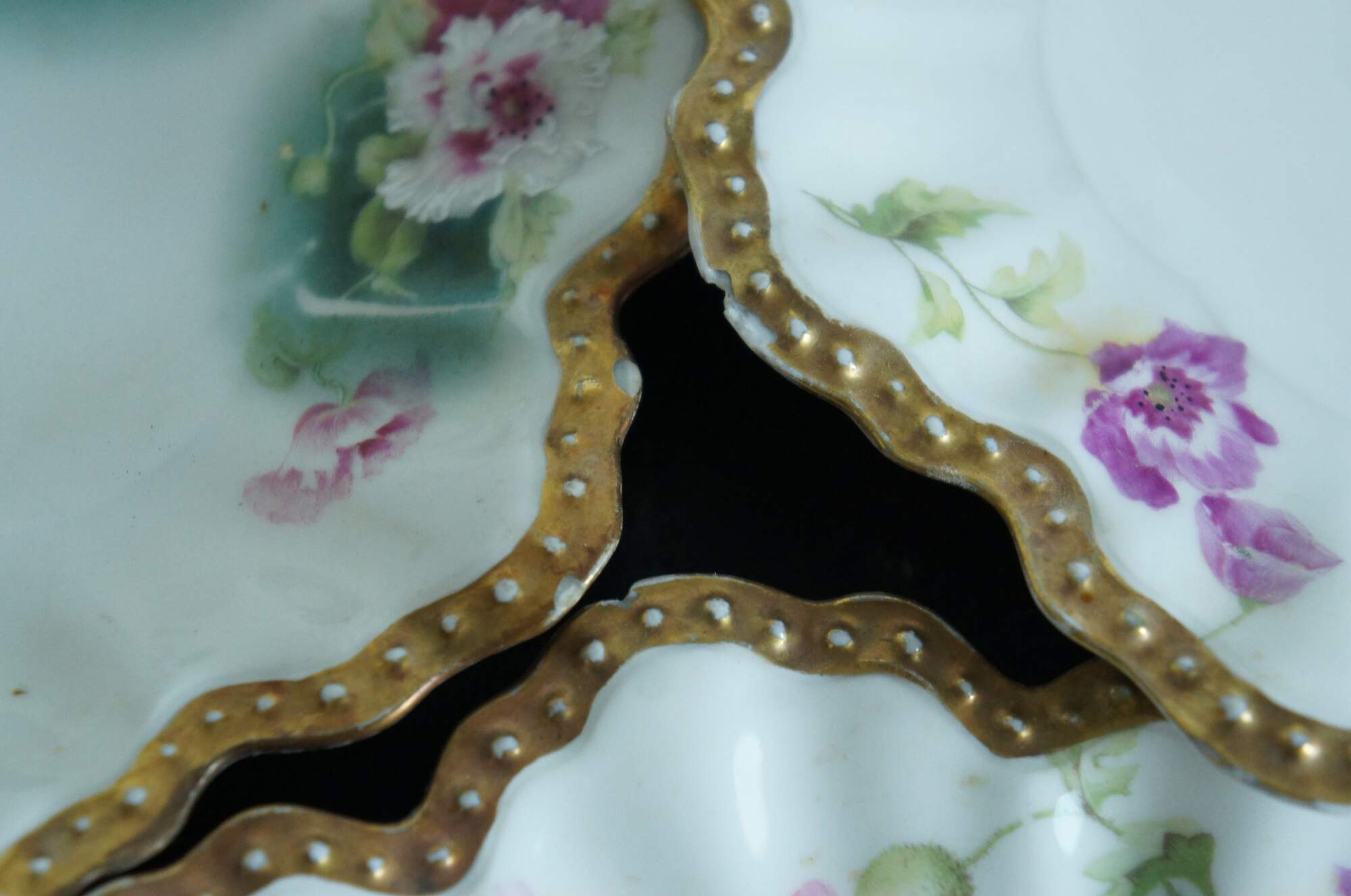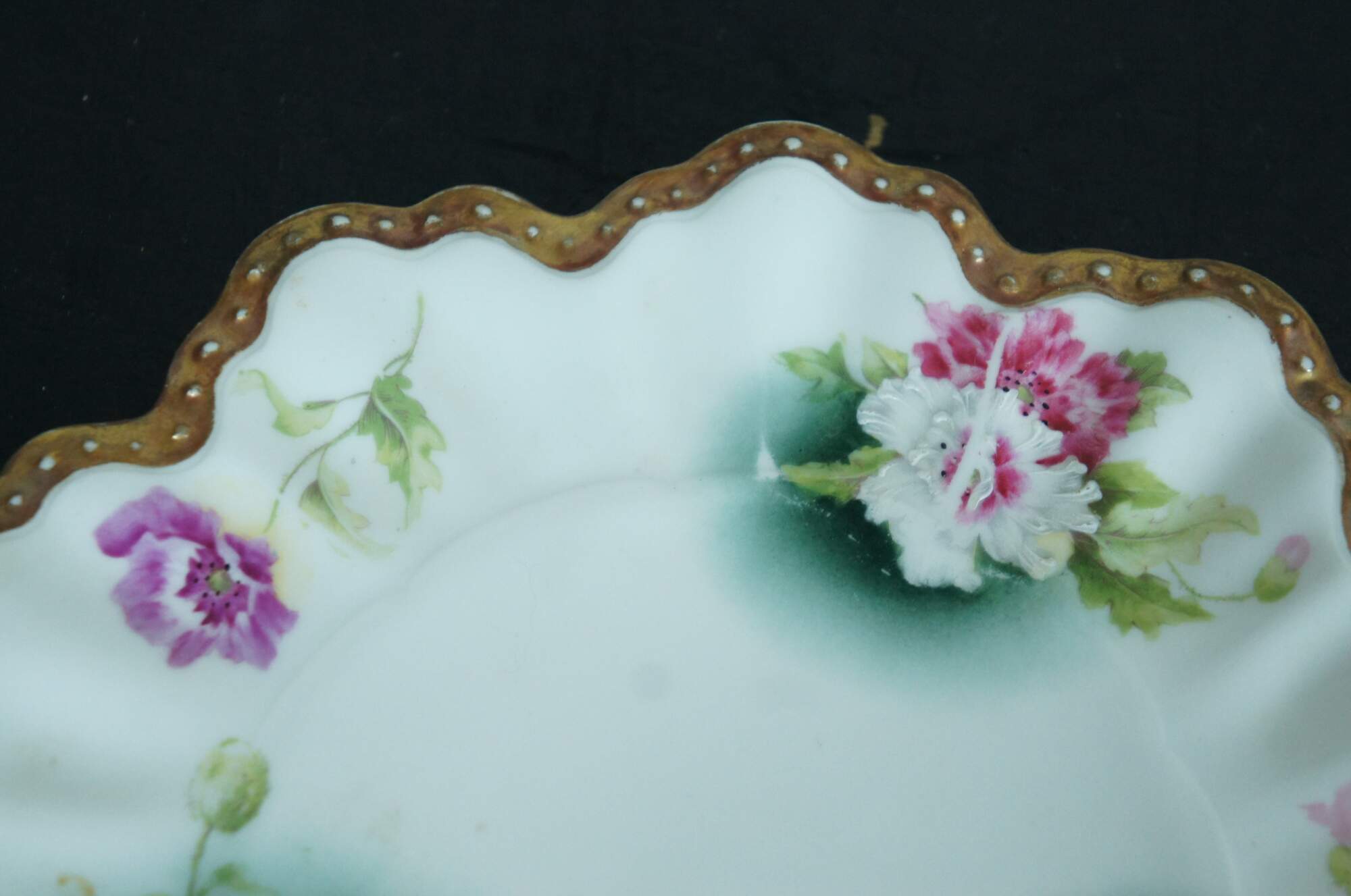 Set of 8 late 19th - early 20th century A. Lanternier & Co Limoges porcelain plates with deeply scalloped and gilded edges resembling flower petals, echoing the green, pink, and purple floral pattern. Mark used circa 1891-1914.