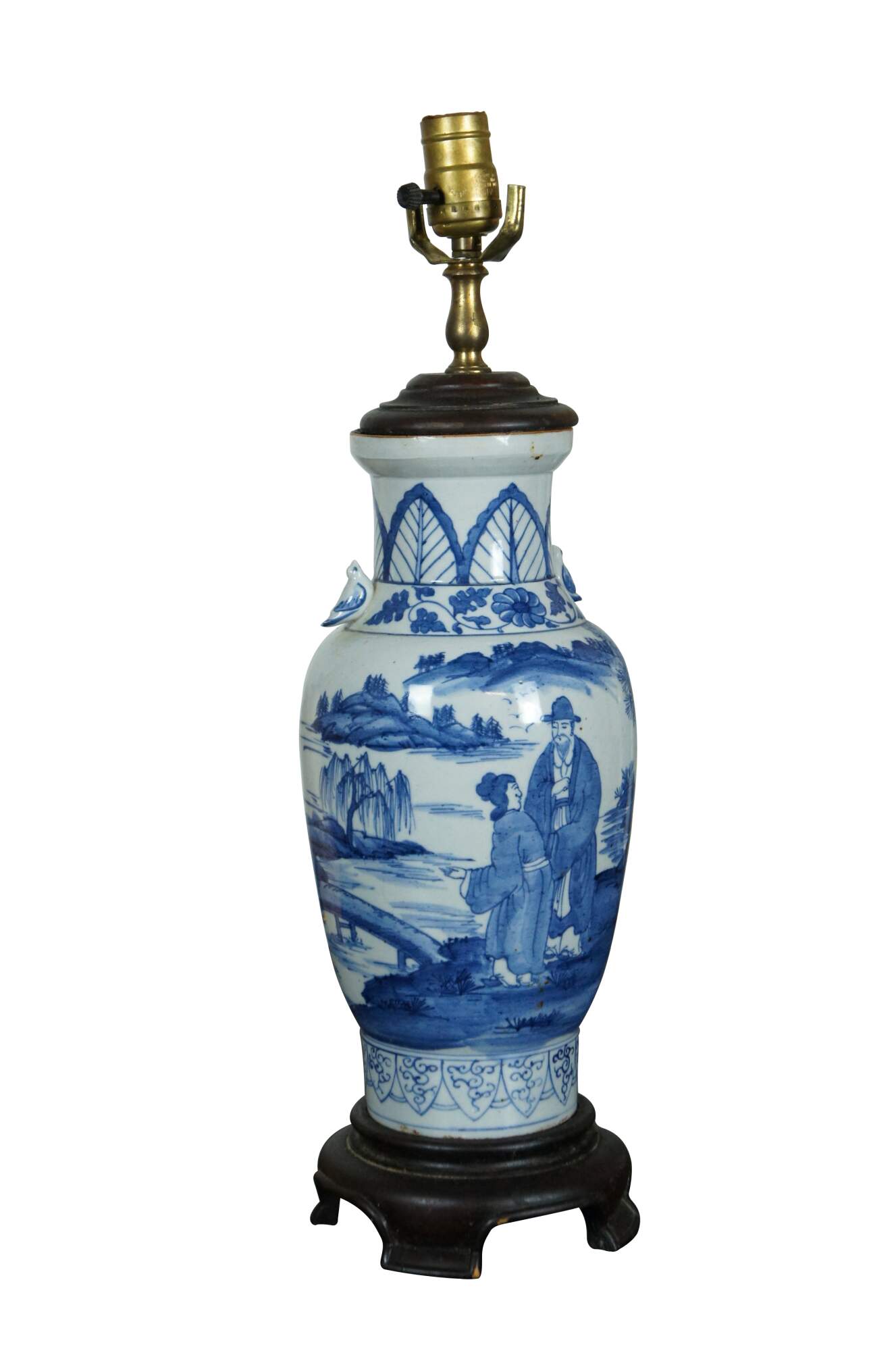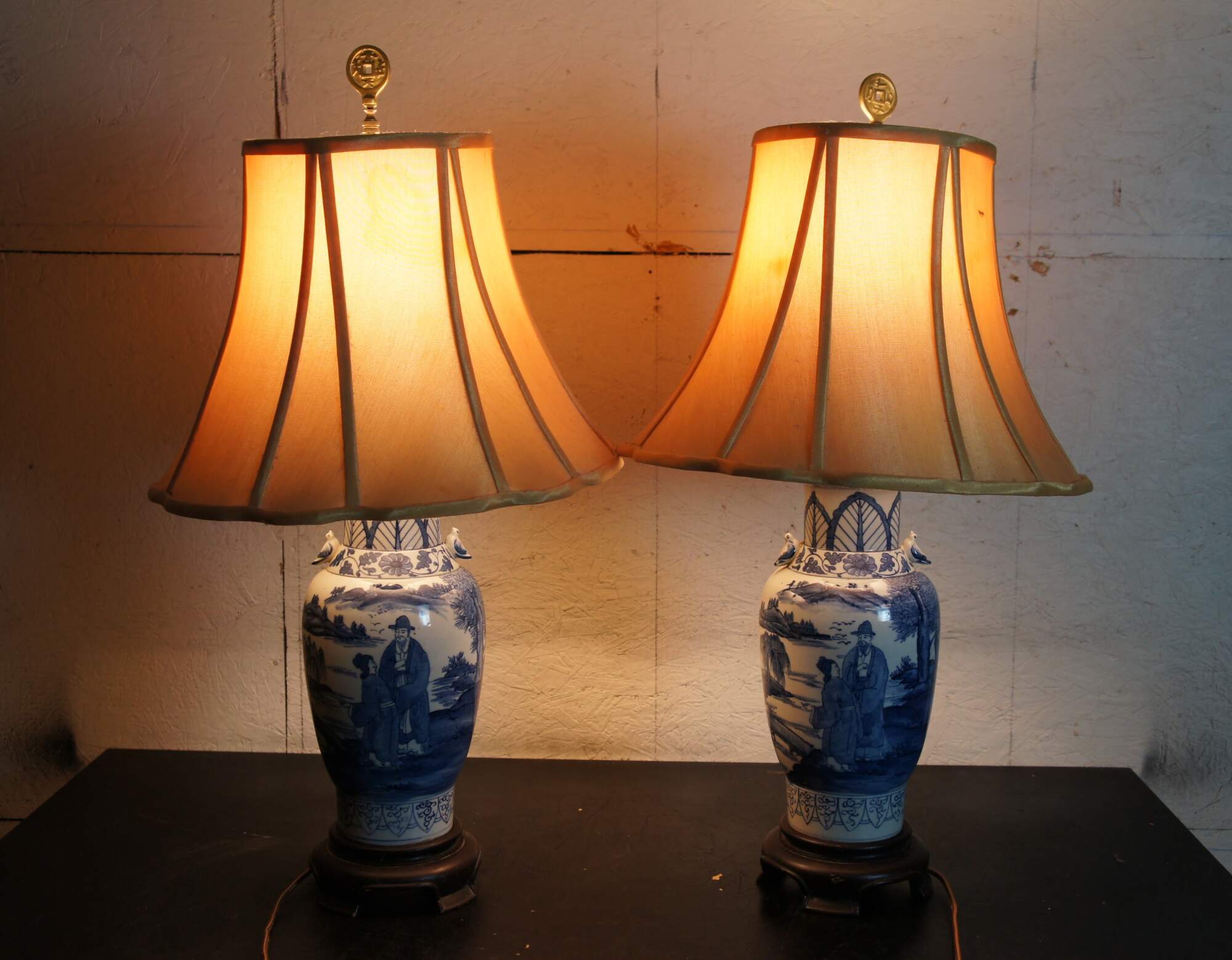 Pair of two antique blue and white Chinese porcelain ginger jar / urn shaped table lamps. Hand painted with a landscape showing a couple preparing to cross a small bridge, floral and leaf patterned border and a pair of bird / dove shaped handles. Wooden cap and base. Includes lucky coin shaped finial, harp, and silk shades.
