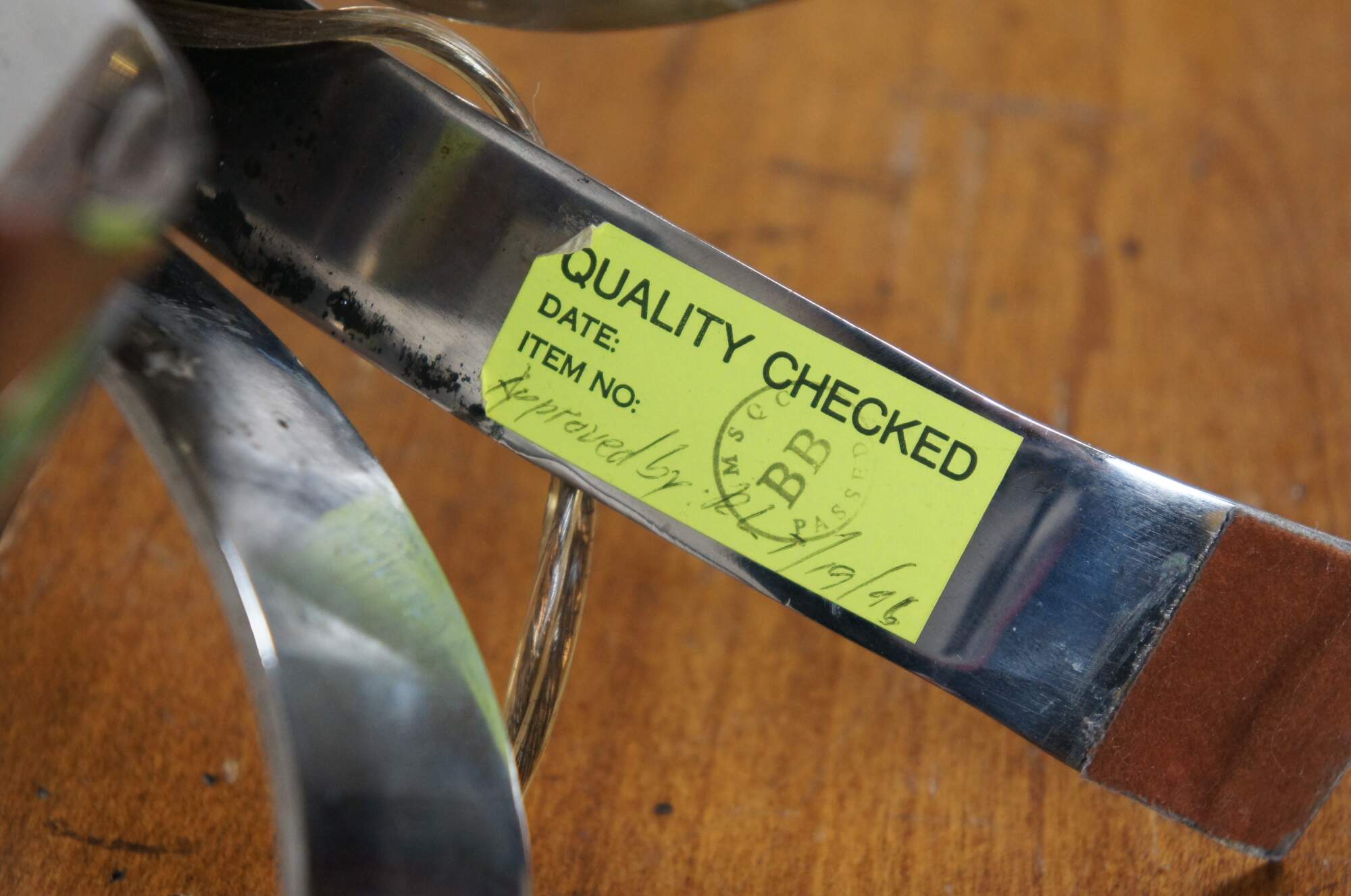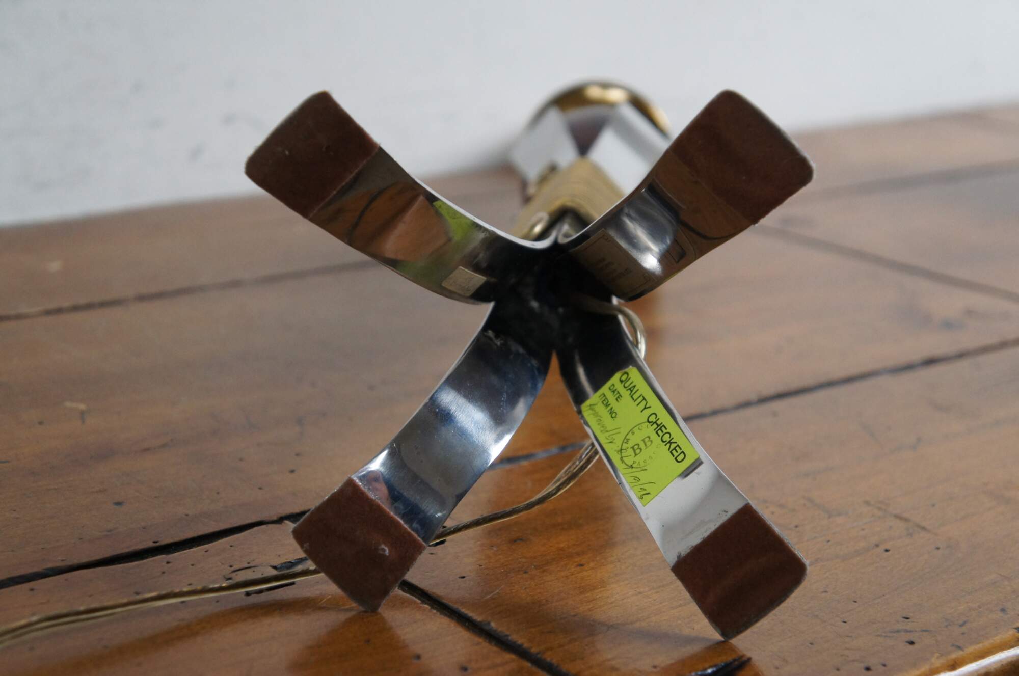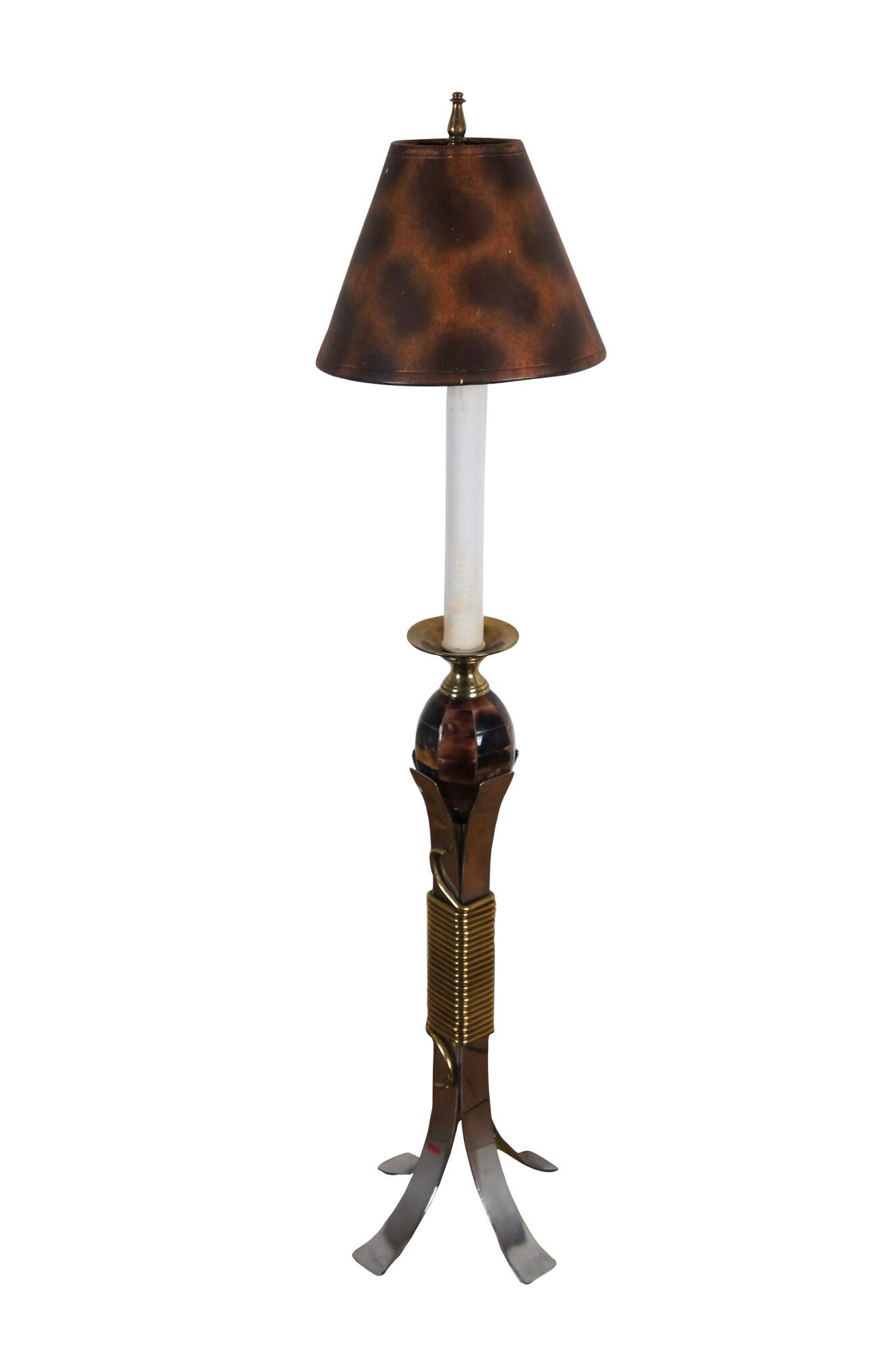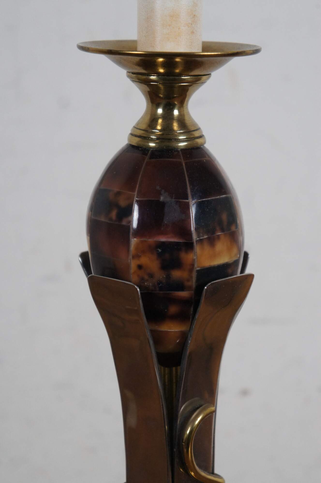 Vintage Maitland Smith 1996 modern candlestick table lamp featuring four chrome legs bound with brass wire, supporting an ovoid / egg shape of tessellated horn in the manner of Faux Tortoise, toped with brass candle cup and faux candle. Includes leather shade with foiled interior and brass finial.