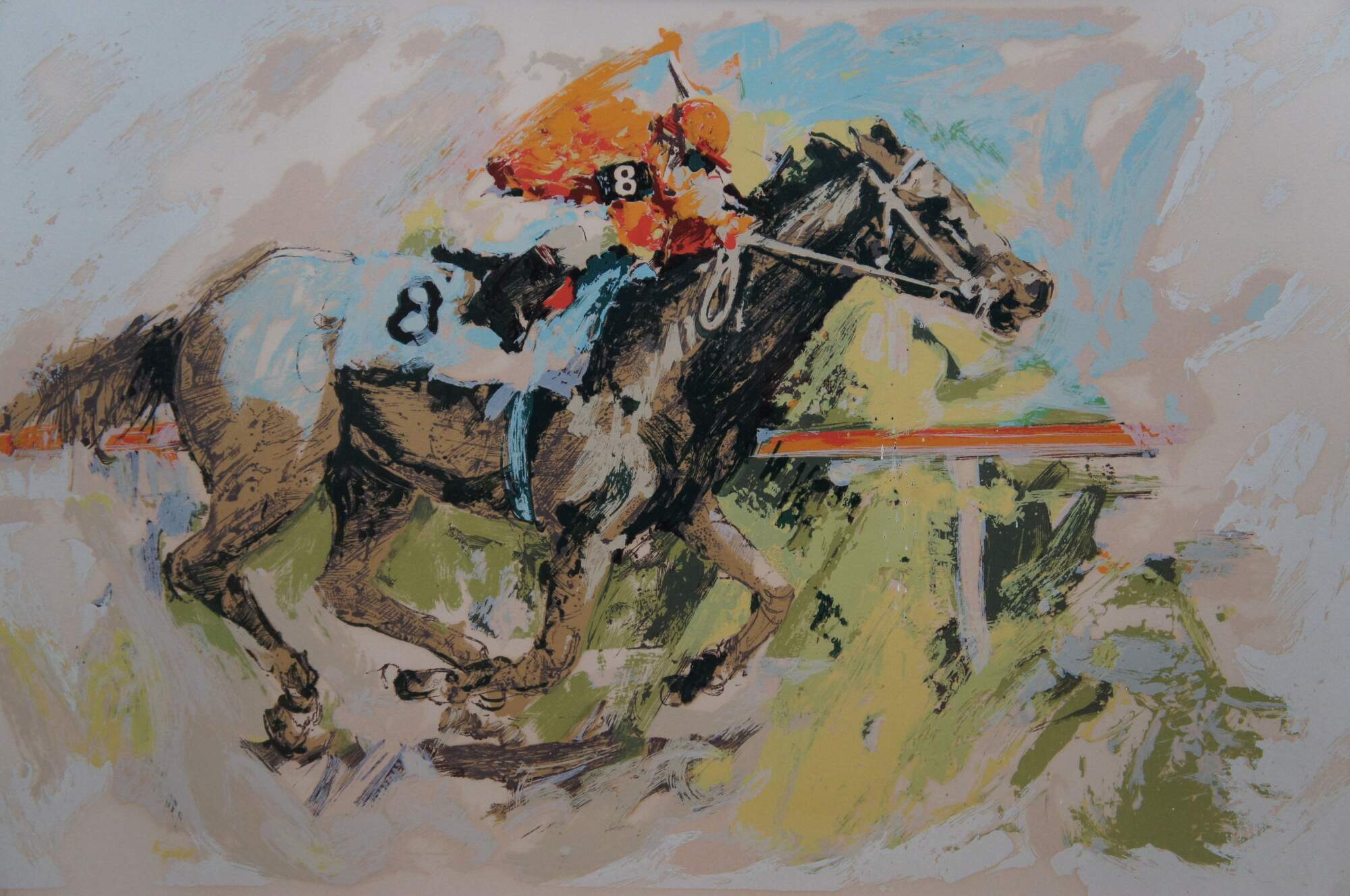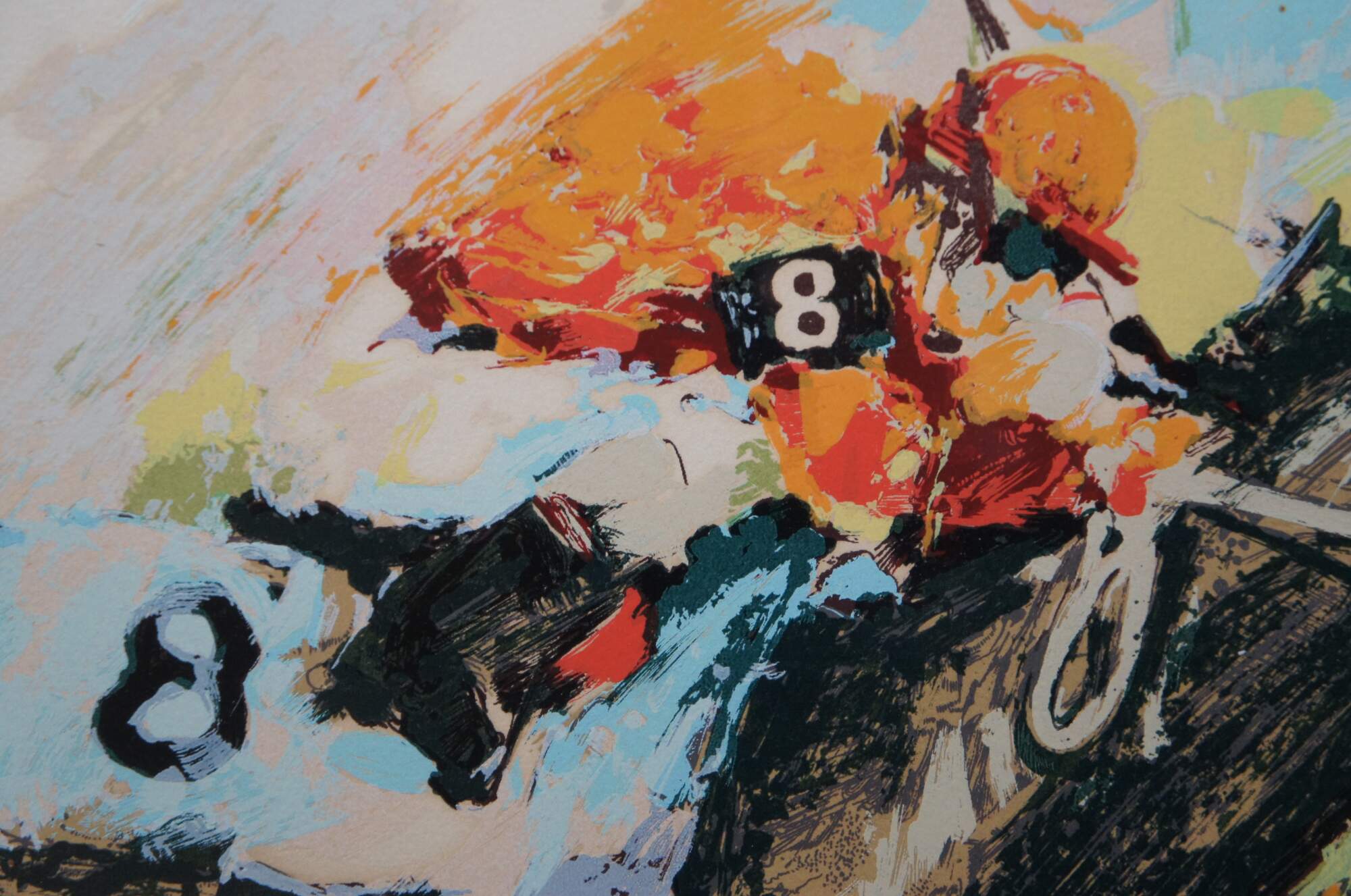 Late 20th century serigraph print titled "Horse Race" by Wayland Moore, featuring a Number 8 horse and jockey in the midst of a race. Pencil signed and numbered 93/300 along the lower edge.