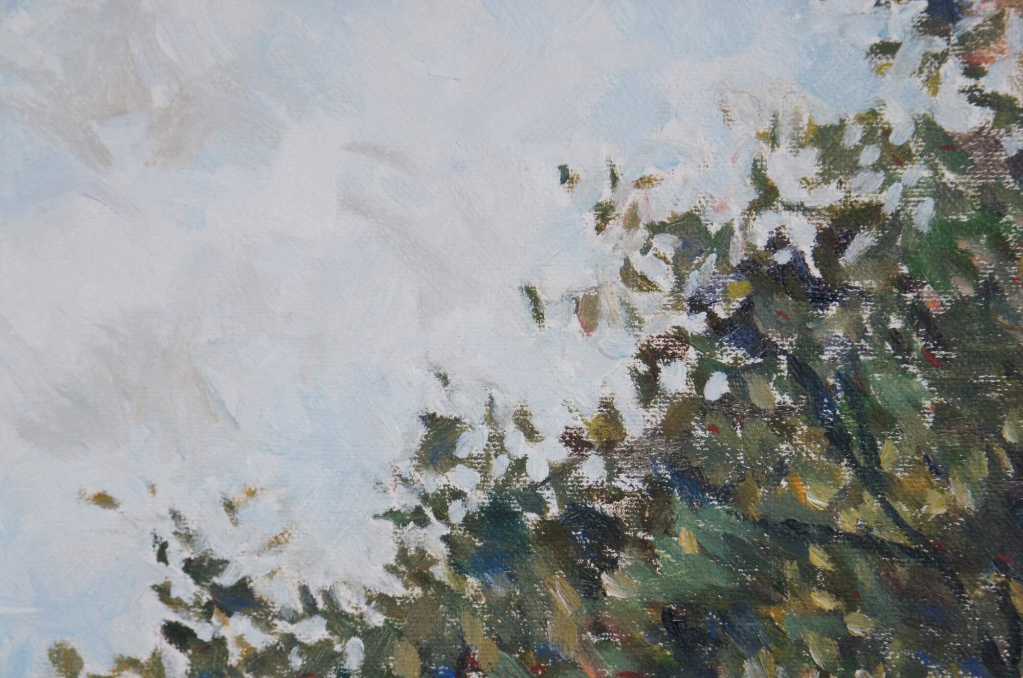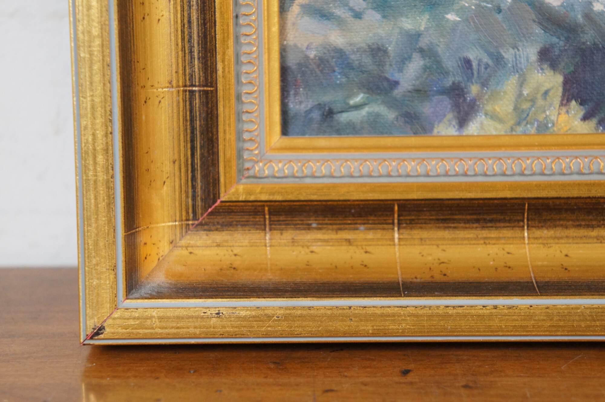 Vintage Impressionist style riverscape / landscape oil painting on canvas, showing a quiet river lined with trees and flowering banks. Signed Bonilla in lower right. Beveled giltwood frame with carved detail. Circa 2000.