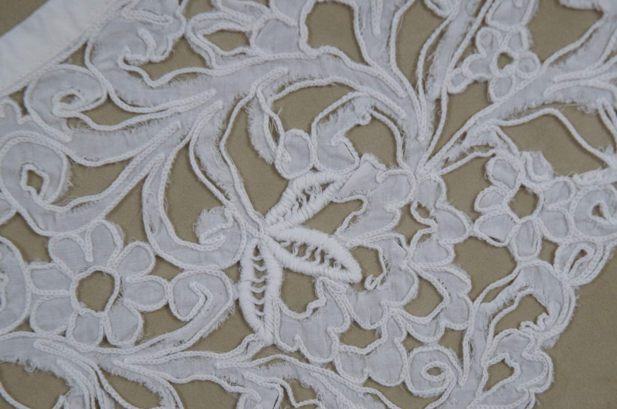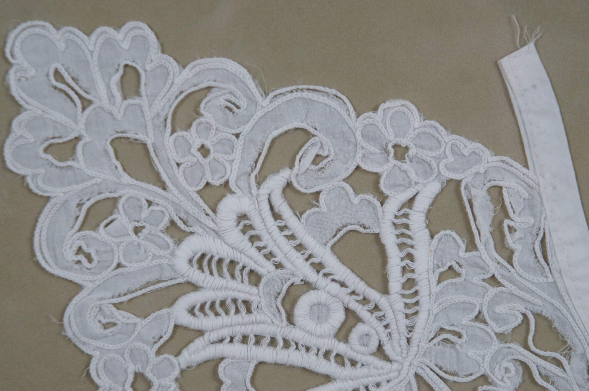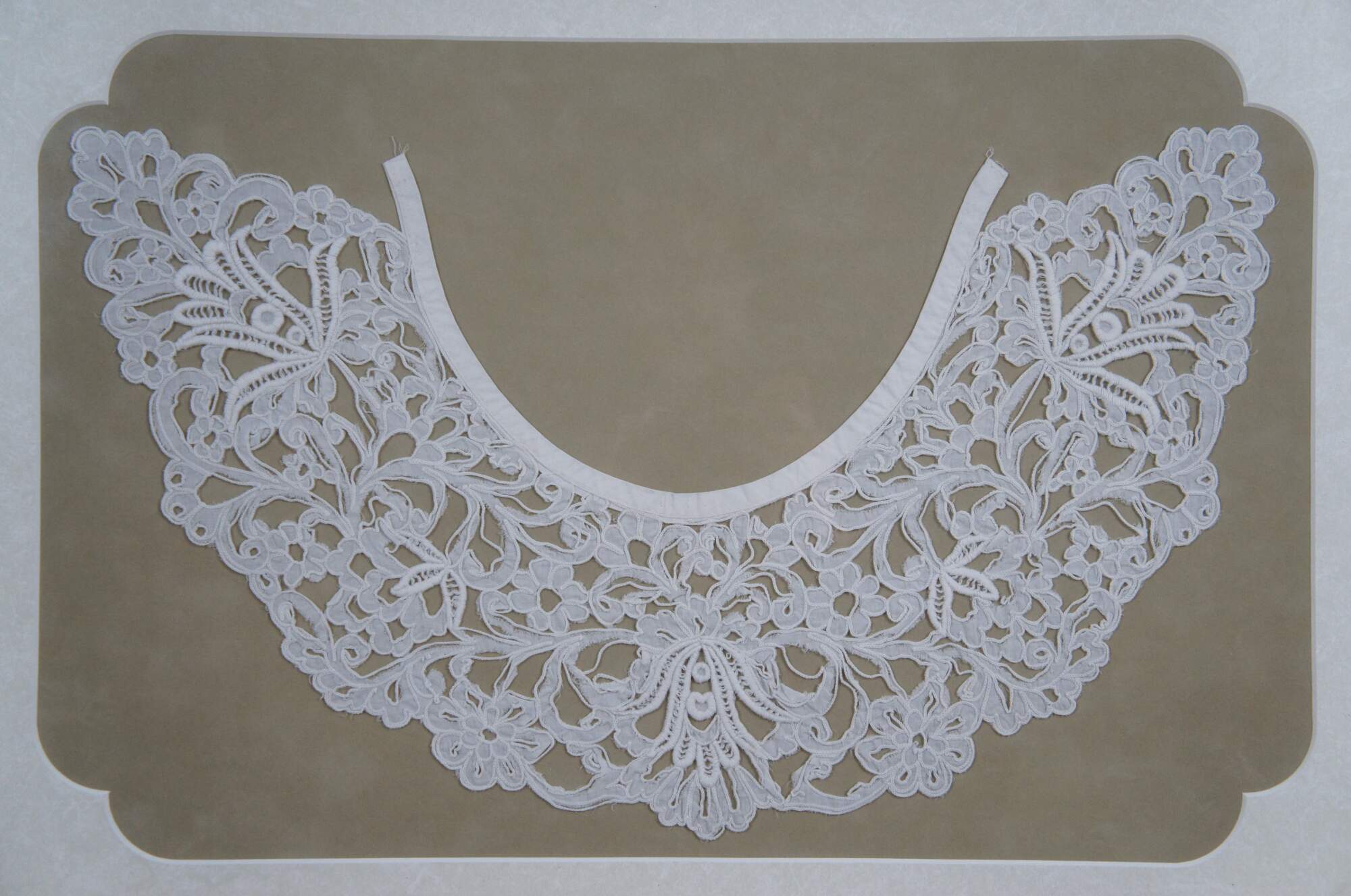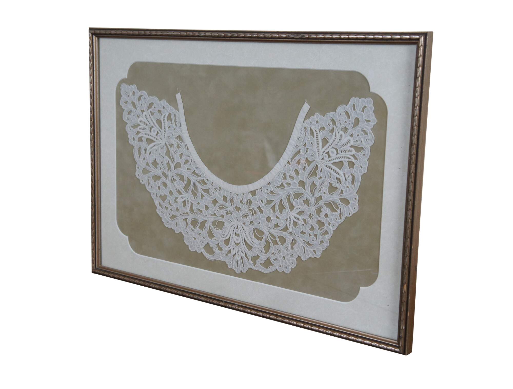 Late 19th - early 20th century Victorian / Edwardian lace collar - scrolling, twisting design of flowers and leaves, hand stitched on linen with cotton neck line. Set on beige fabric with white mat and leave carved champagne gilt frame.