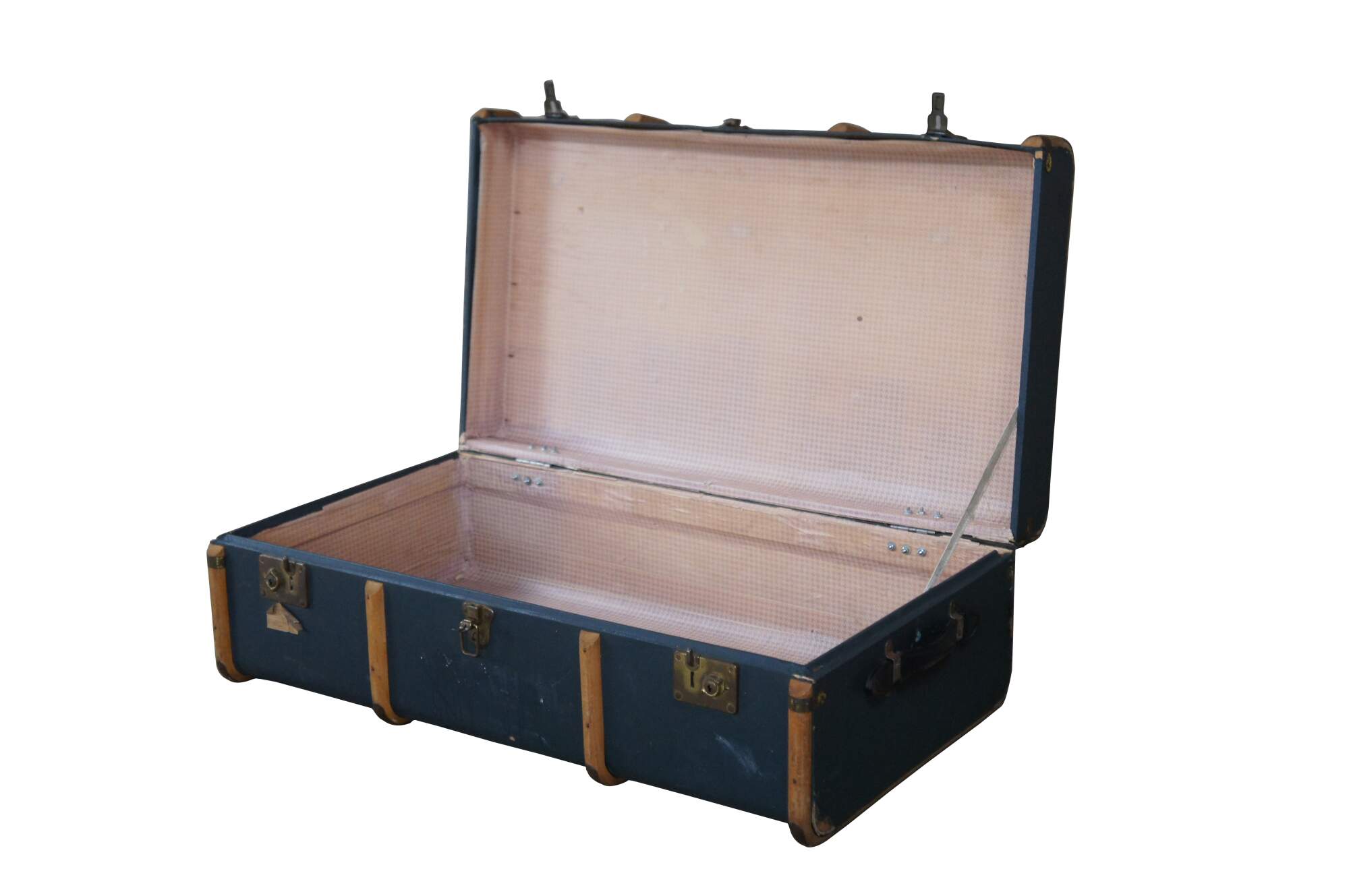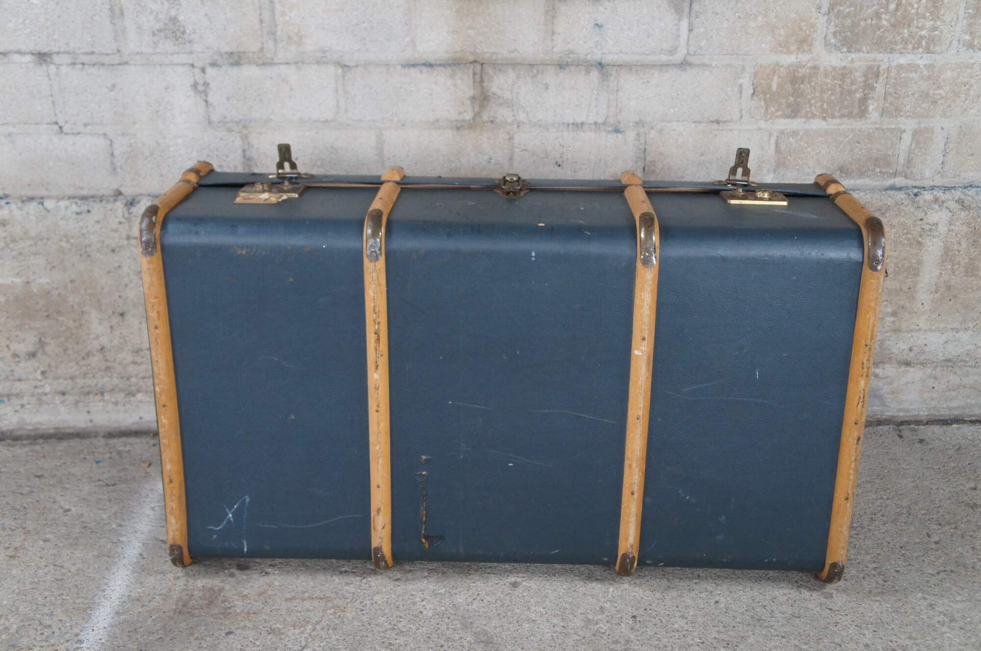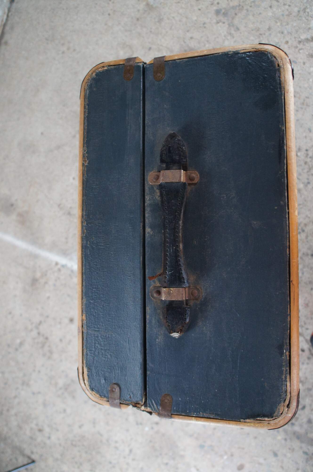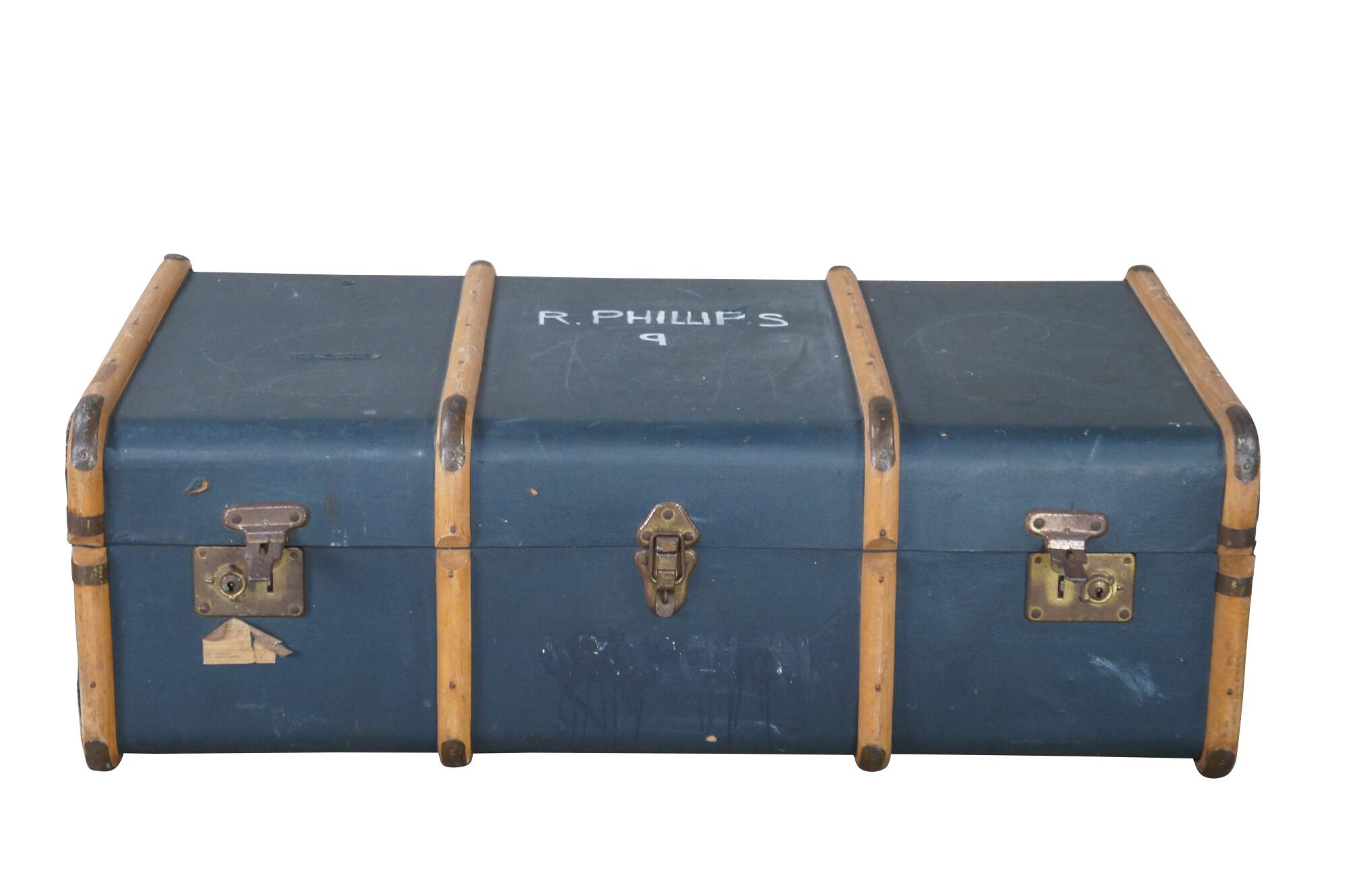 Antique English steamer trunk / suitcase / luggage / travel case featuring wood banding, leather handles, and the name RH Phillips of Sussex United Kingdom UK.