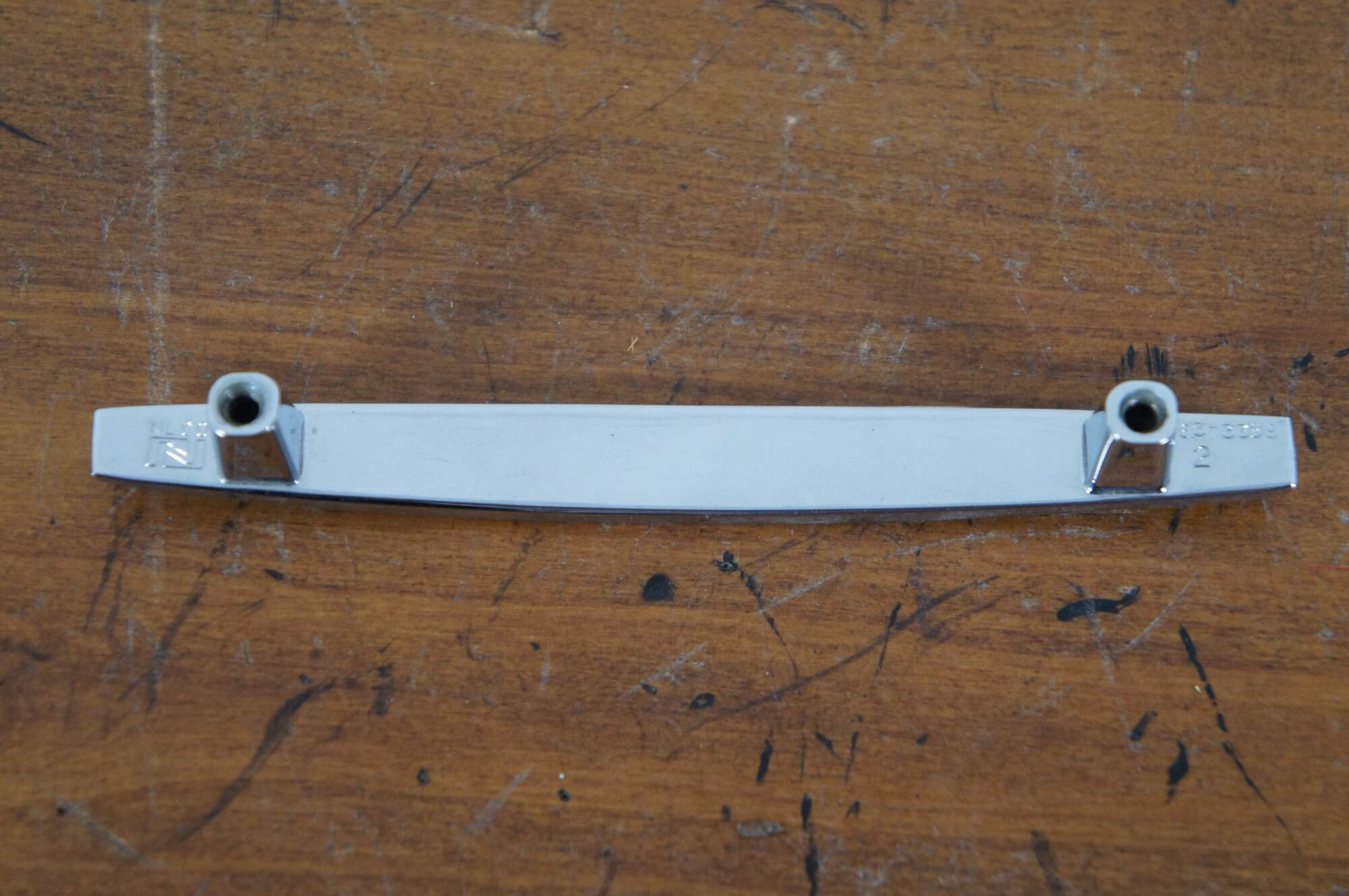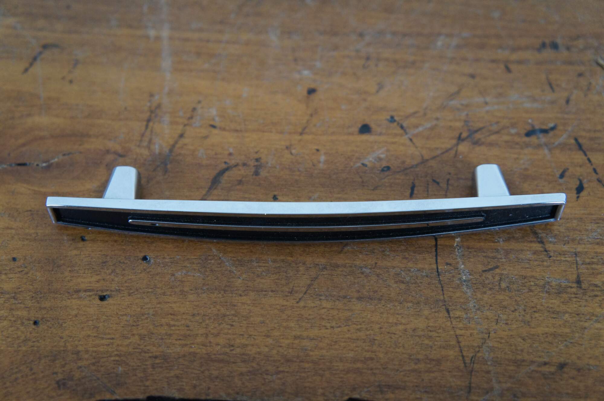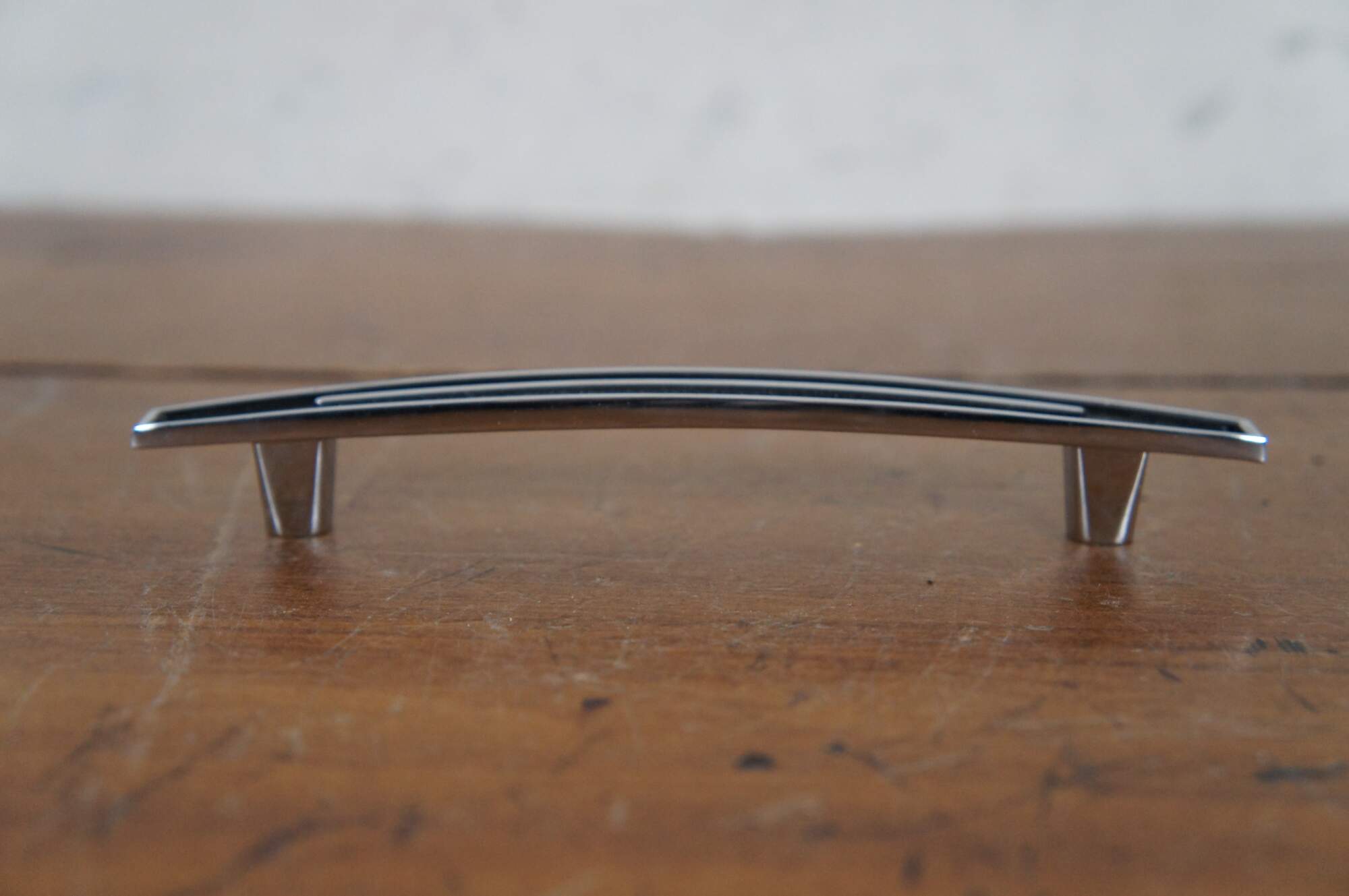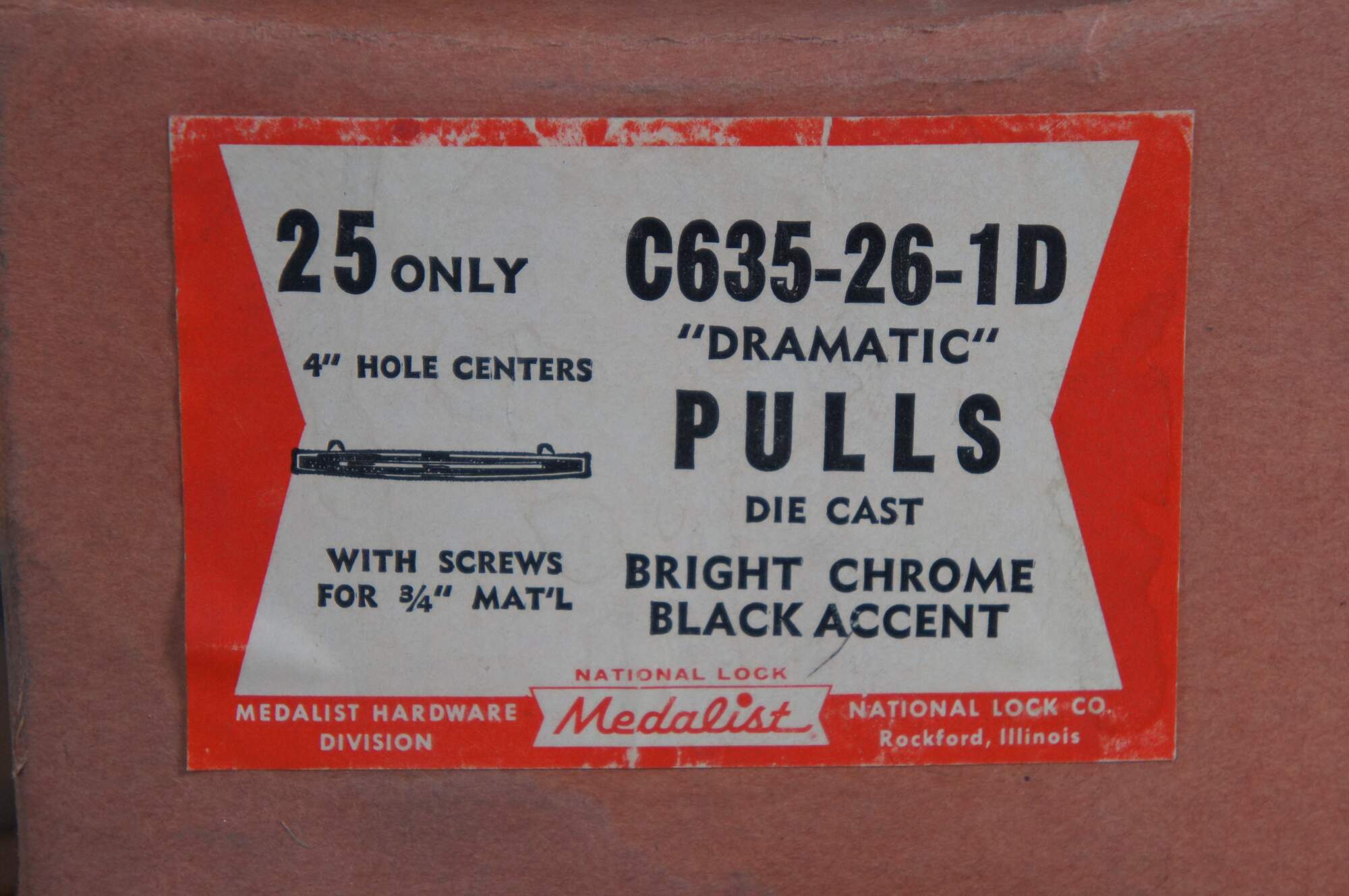 34 Available - Mid to late 20th century old-stock drawer / cabinet pulls. National Lock Company - Medalist, item number C635-26-1D Pulls, Dramatic, Bright Chrome Black Accent. Mid Century Modern styling. Bowed out, rounded rectangular shape with recessed, lightly textured recessed surface and ridge along center. Hole Centers - 4