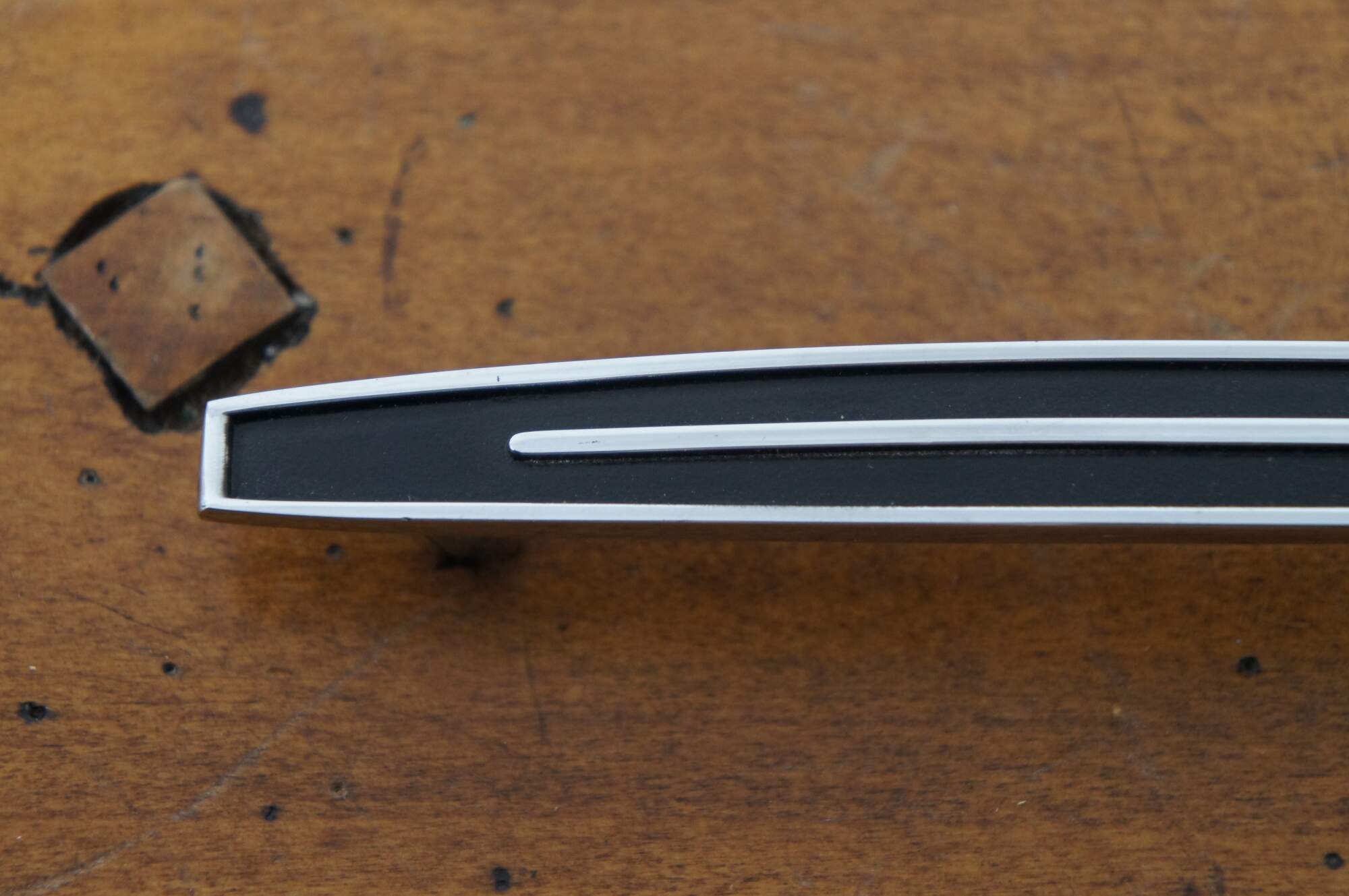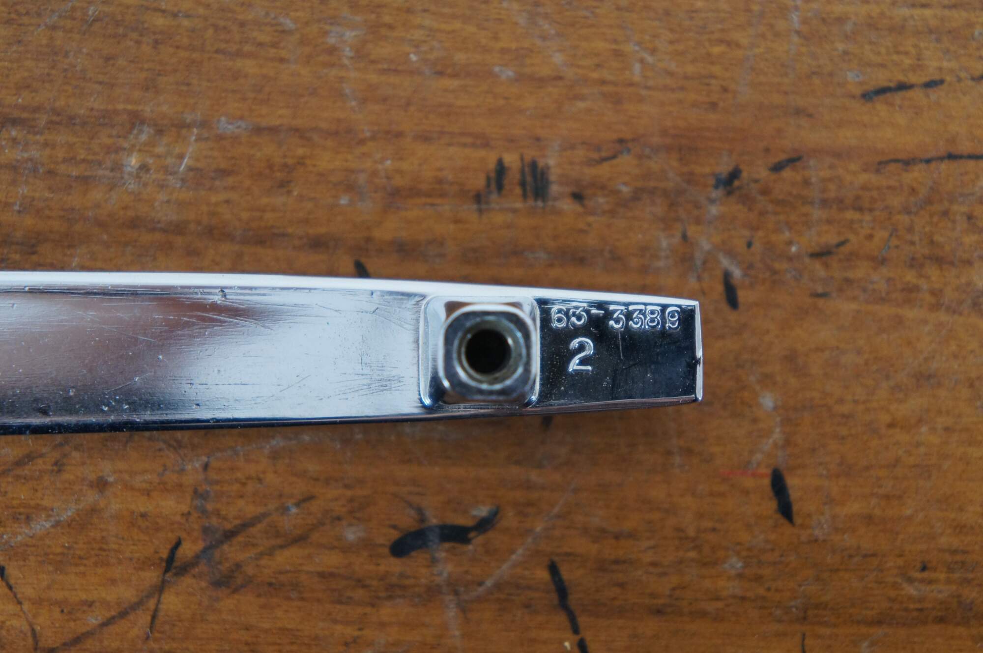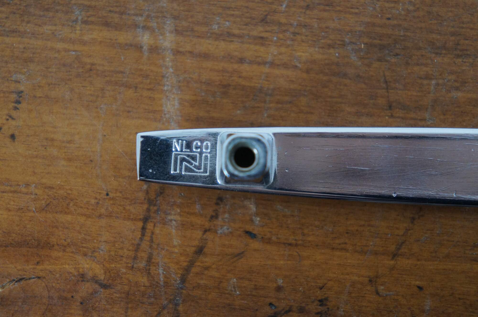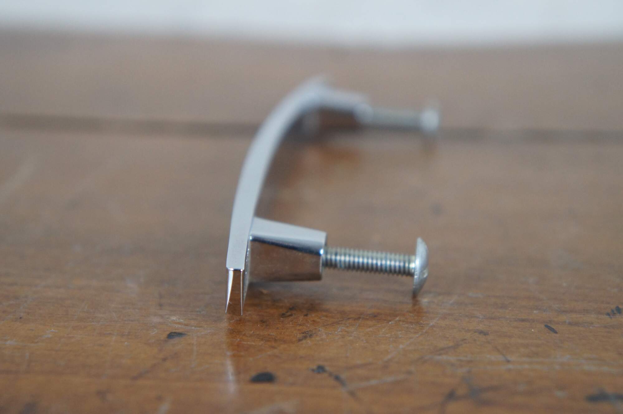 34 Available - Mid to late 20th century old-stock drawer / cabinet pulls. National Lock Company - Medalist, item number C635-26-1D Pulls, Dramatic, Bright Chrome Black Accent. Mid Century Modern styling. Bowed out, rounded rectangular shape with recessed, lightly textured recessed surface and ridge along center. Hole Centers - 4
