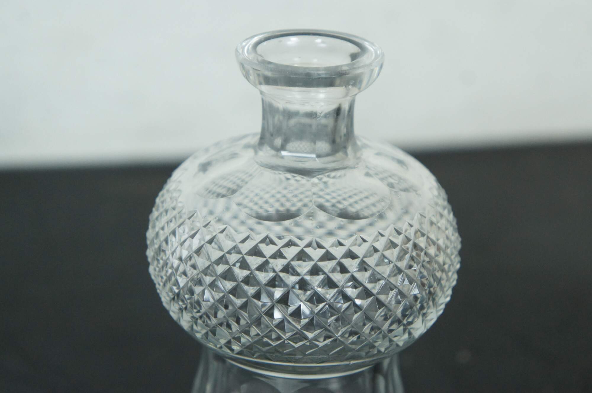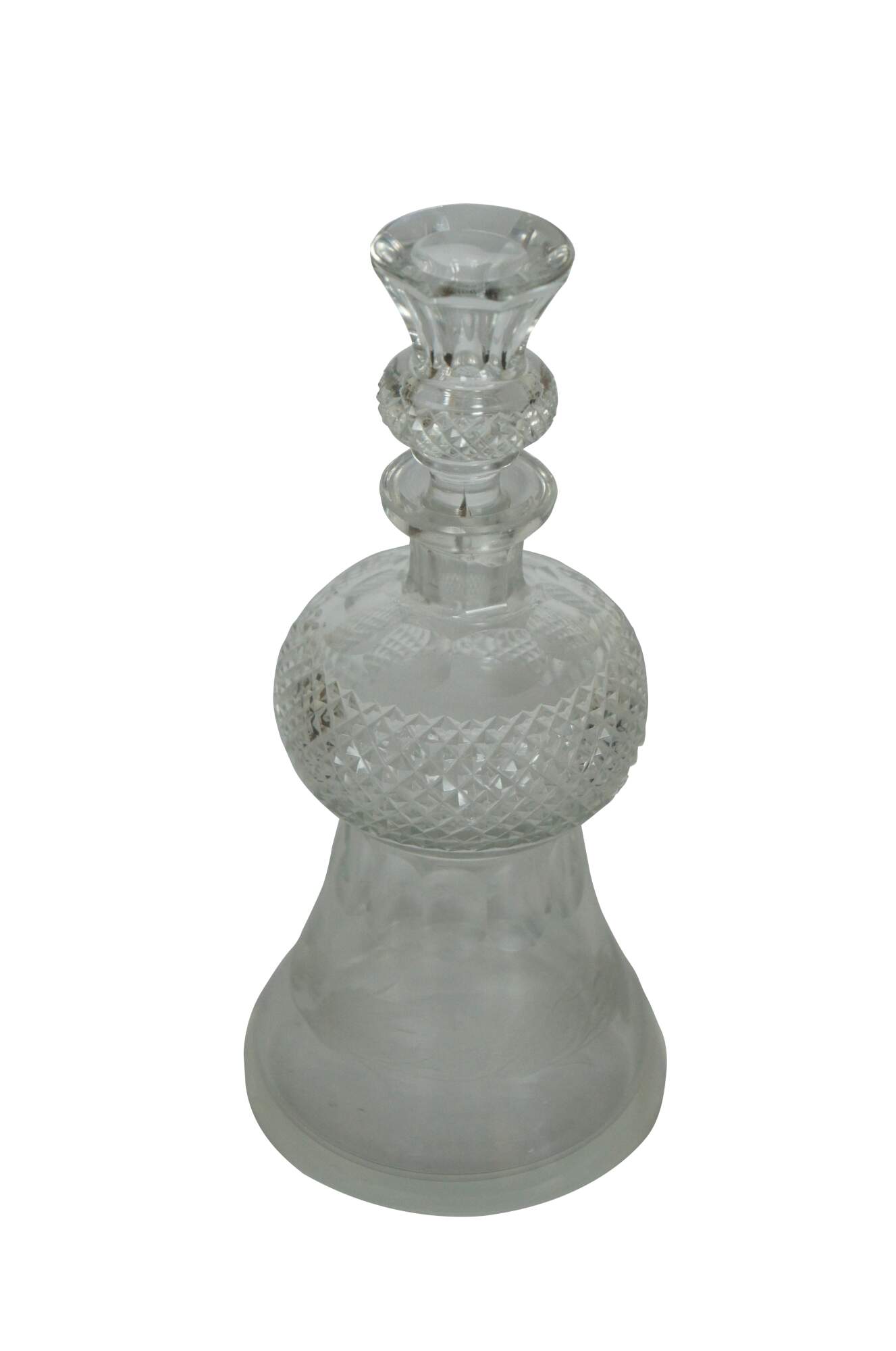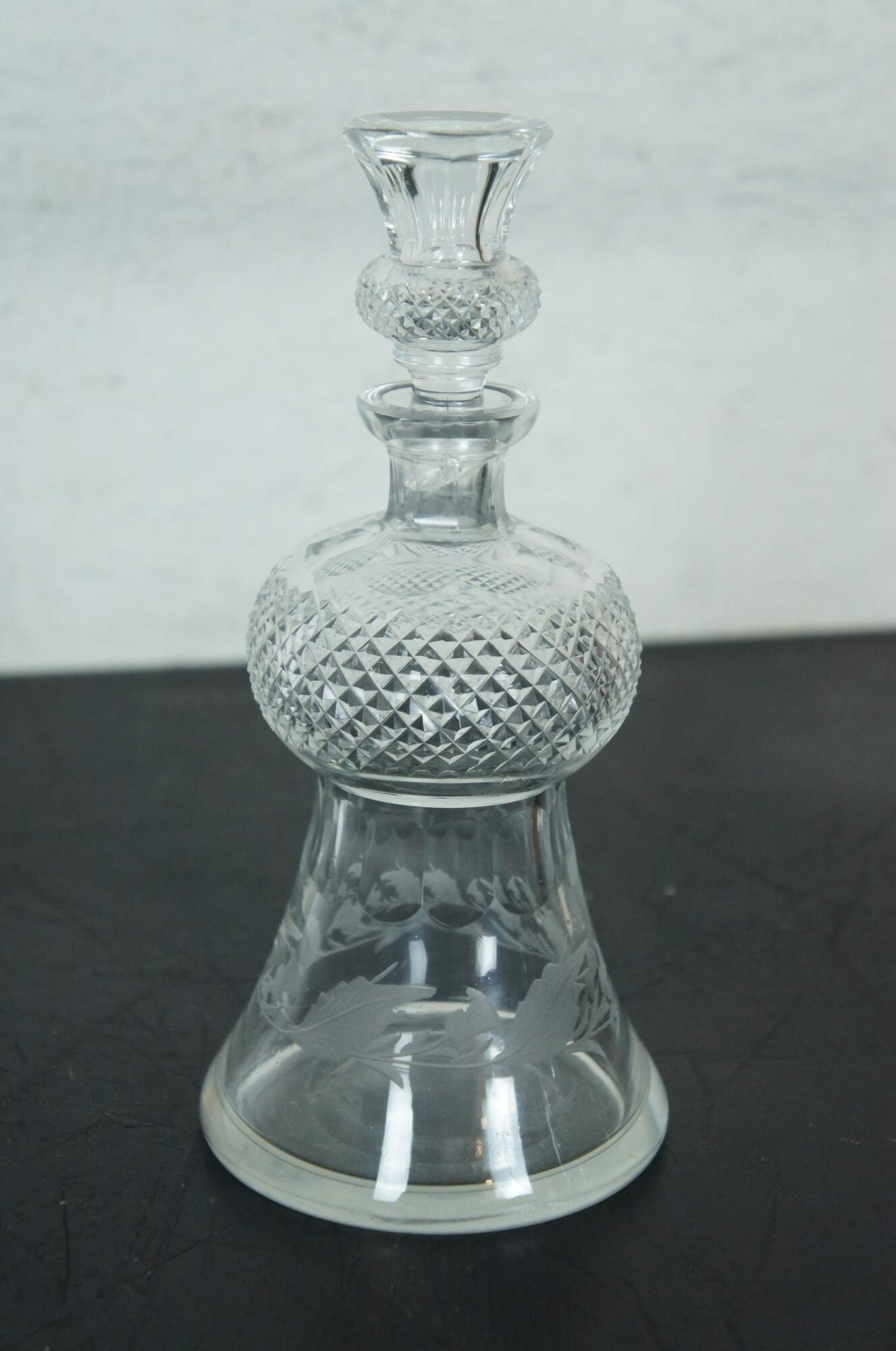 20th century crystal decanter featuring a unique thistle blossom shape with a flared base decorated with etched thistle blossoms and leaves and thumbprint detail, tapering to meet a round diamond cut middle and faceted mouth, echoed by the matching thistle blossom shaped stopper. Attributed to Edinburgh Crystal.