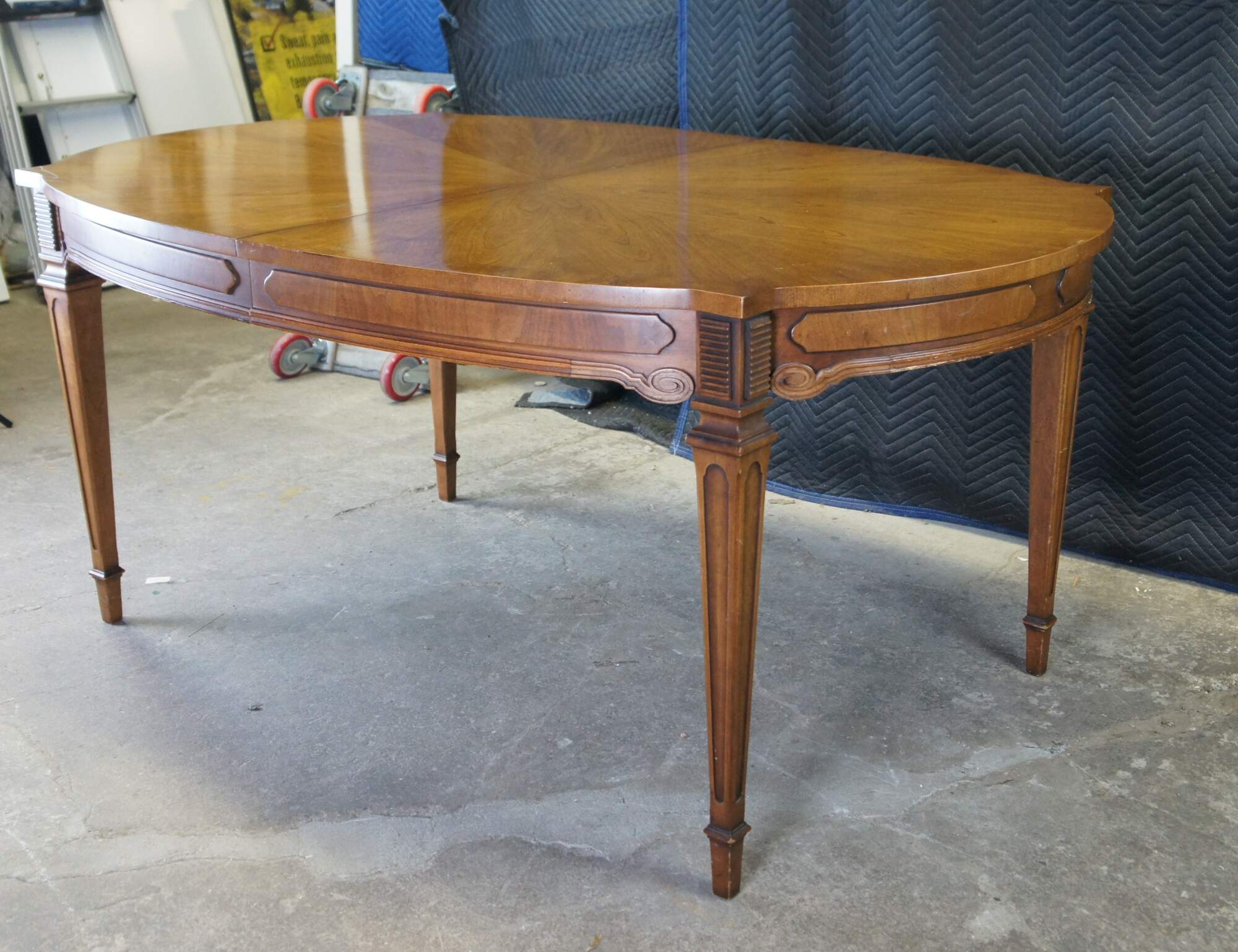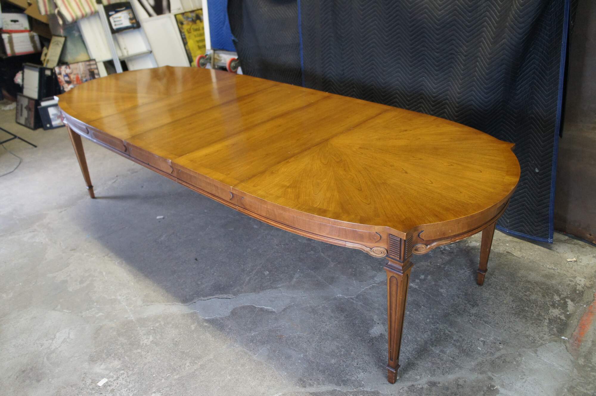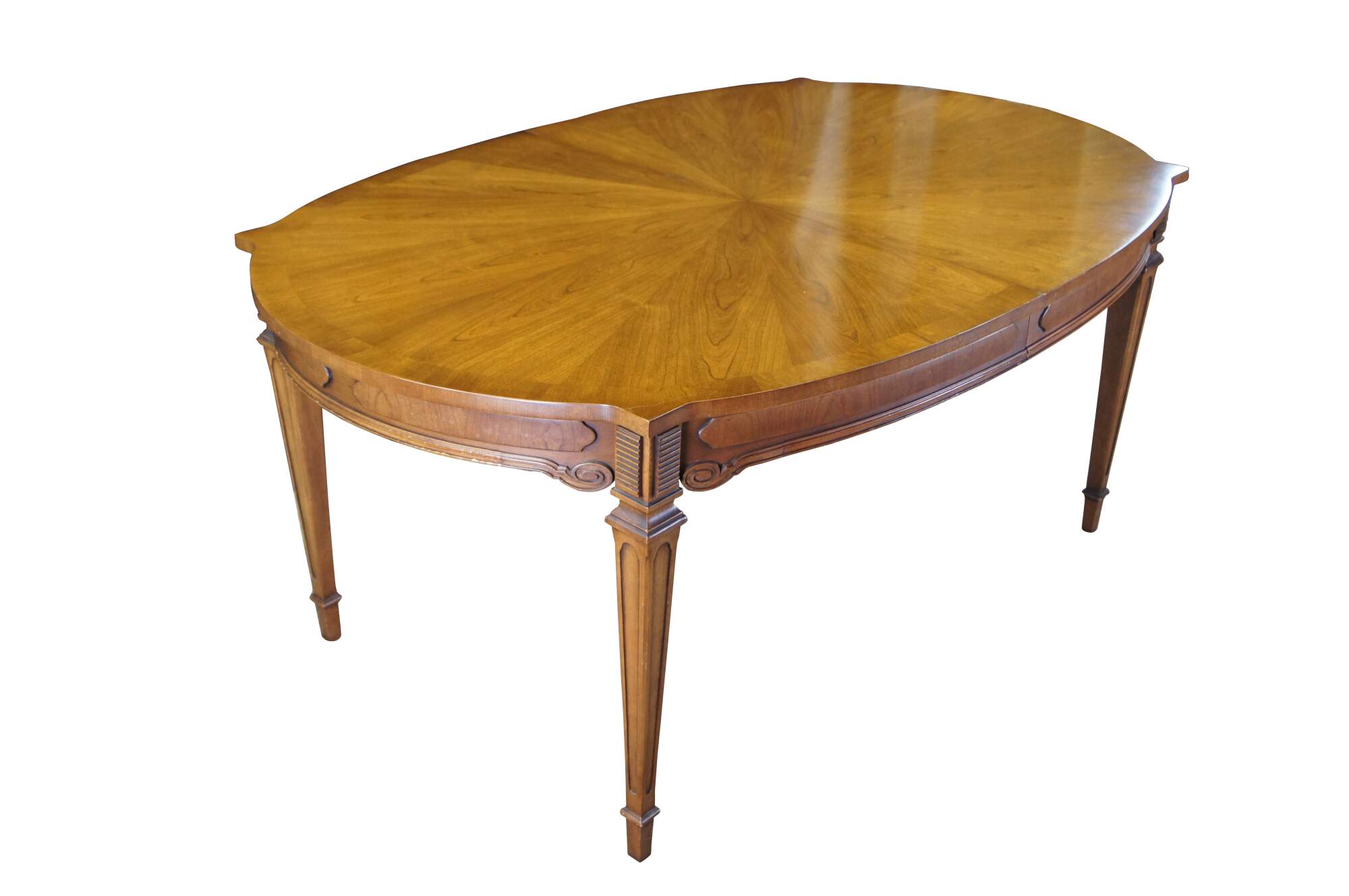 Antique Italian Provincial dining table. Made of cherry featuring oval form with starburst style matchbook top, three leaves, and tapered legs.