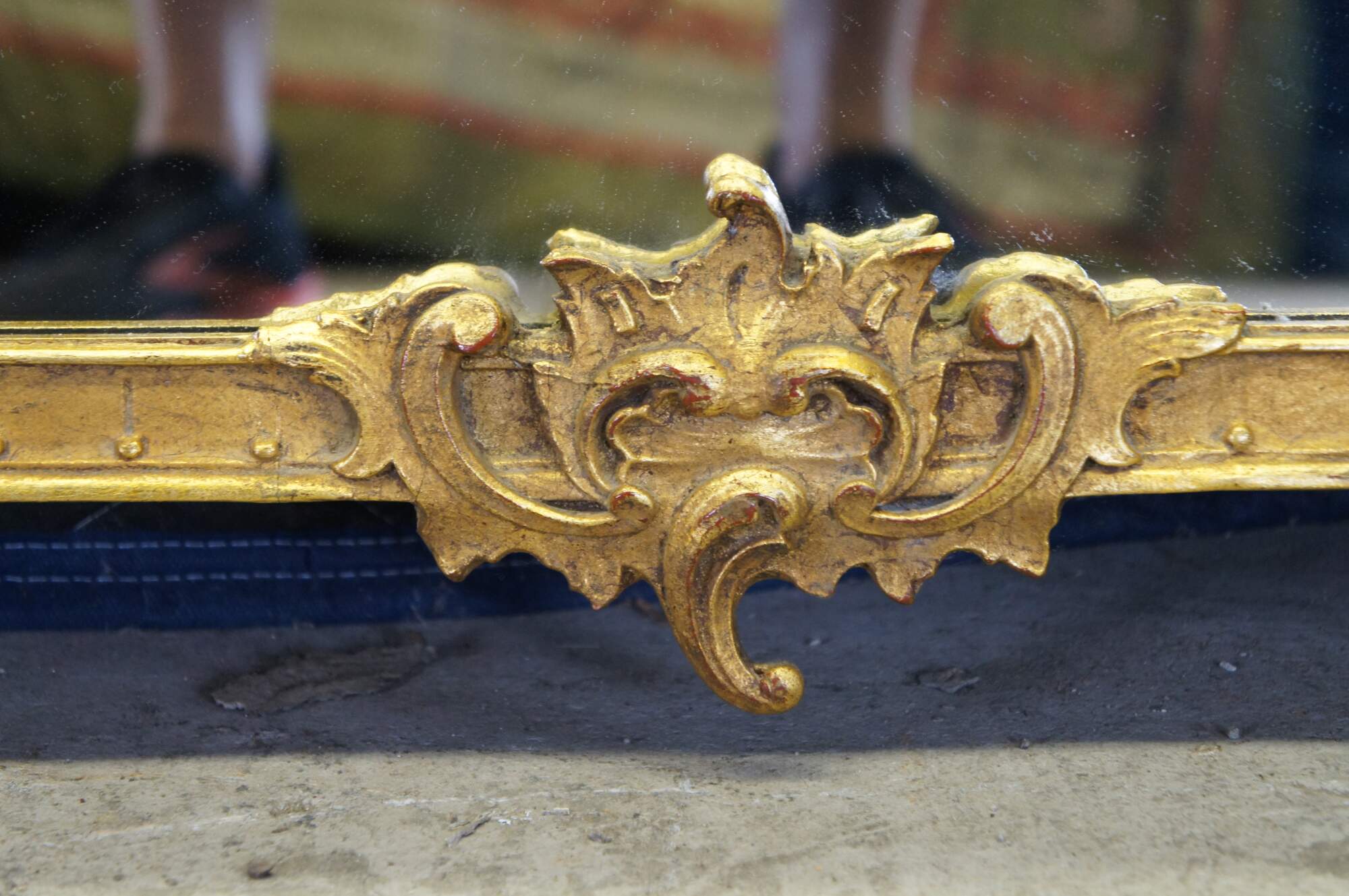 Mid Century 1940s French baroque / Hollywood Regency style gold gilt mirror by D Milch & Sons featuring carved floral and acanthus design with reticulated / pierced accents.