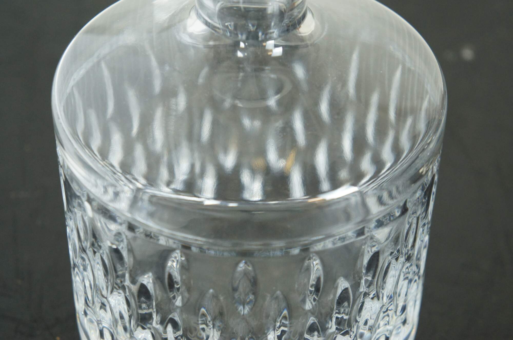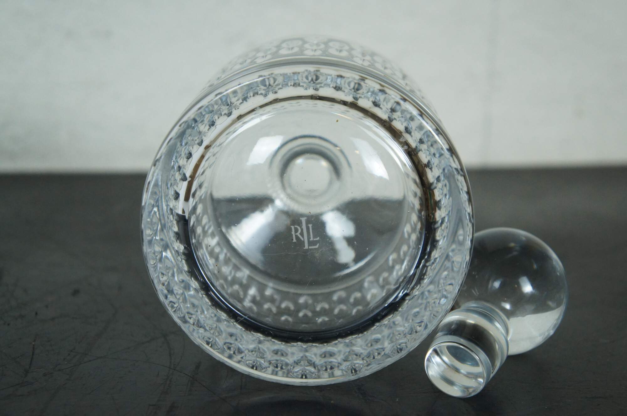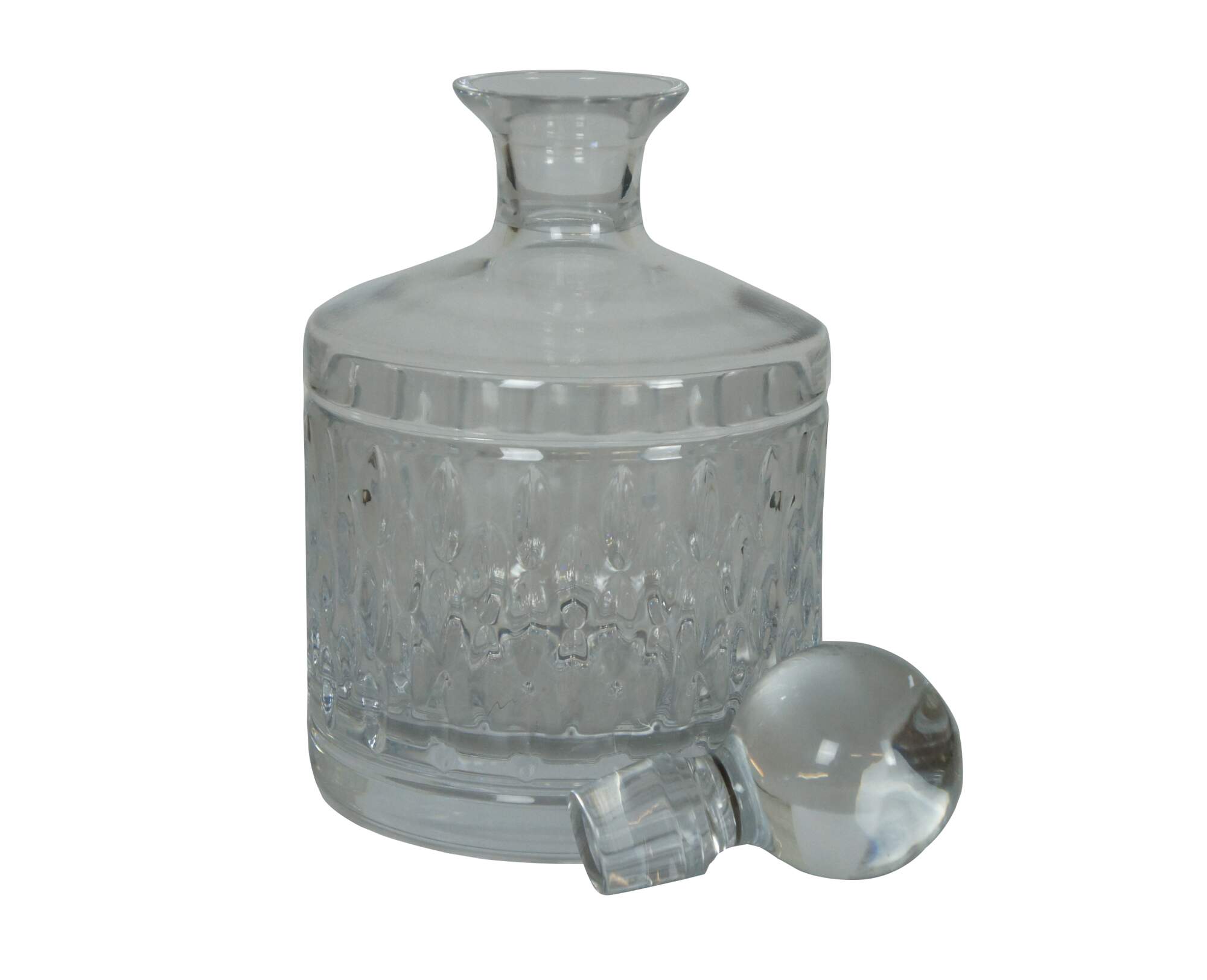Vintage Aston crystal whiskey decanter / bottle by Ralph Lauren. Cylindrical body with cut almond pattern, flared neck and orb stopper. Lead crystal; 28 oz capacity. Made in Slovenia.