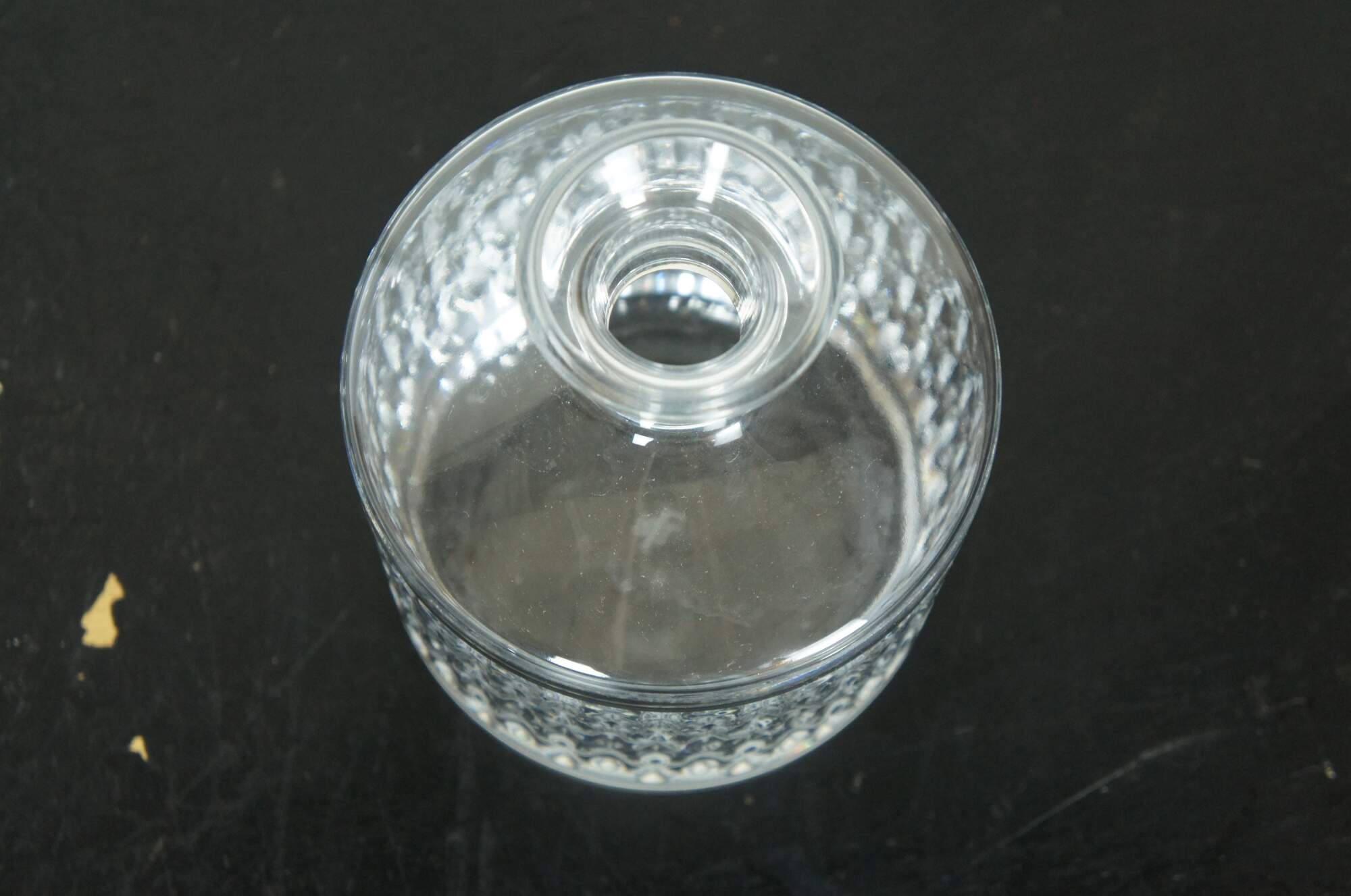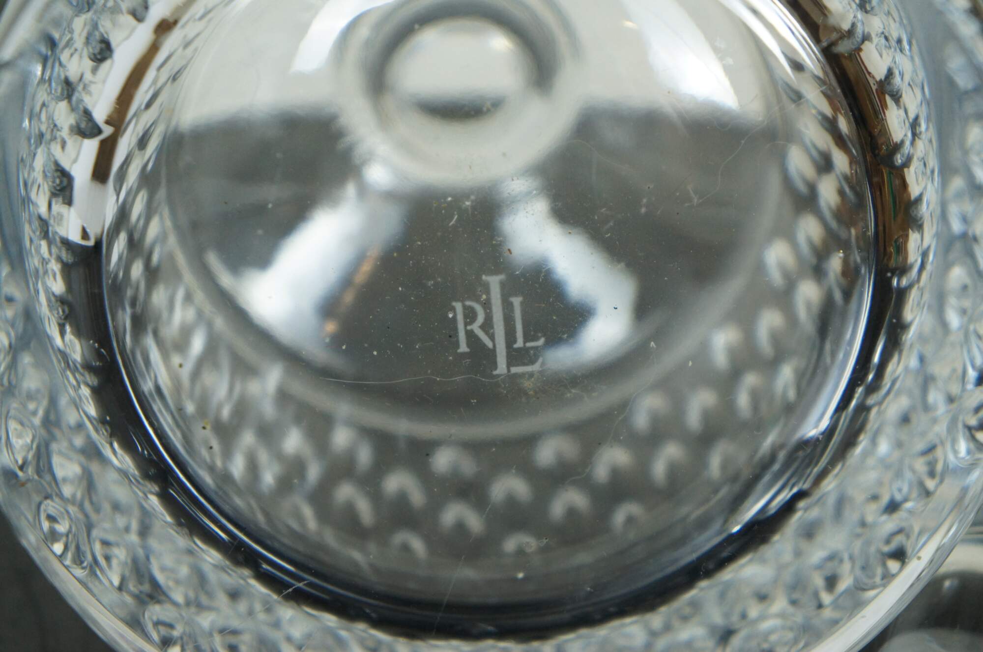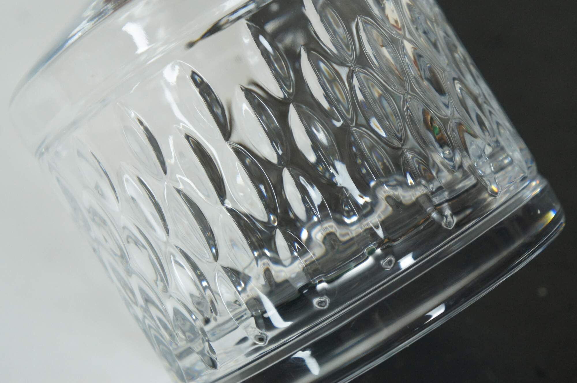 Vintage Aston crystal whiskey decanter / bottle by Ralph Lauren. Cylindrical body with cut almond pattern, flared neck and orb stopper. Lead crystal; 28 oz capacity. Made in Slovenia.