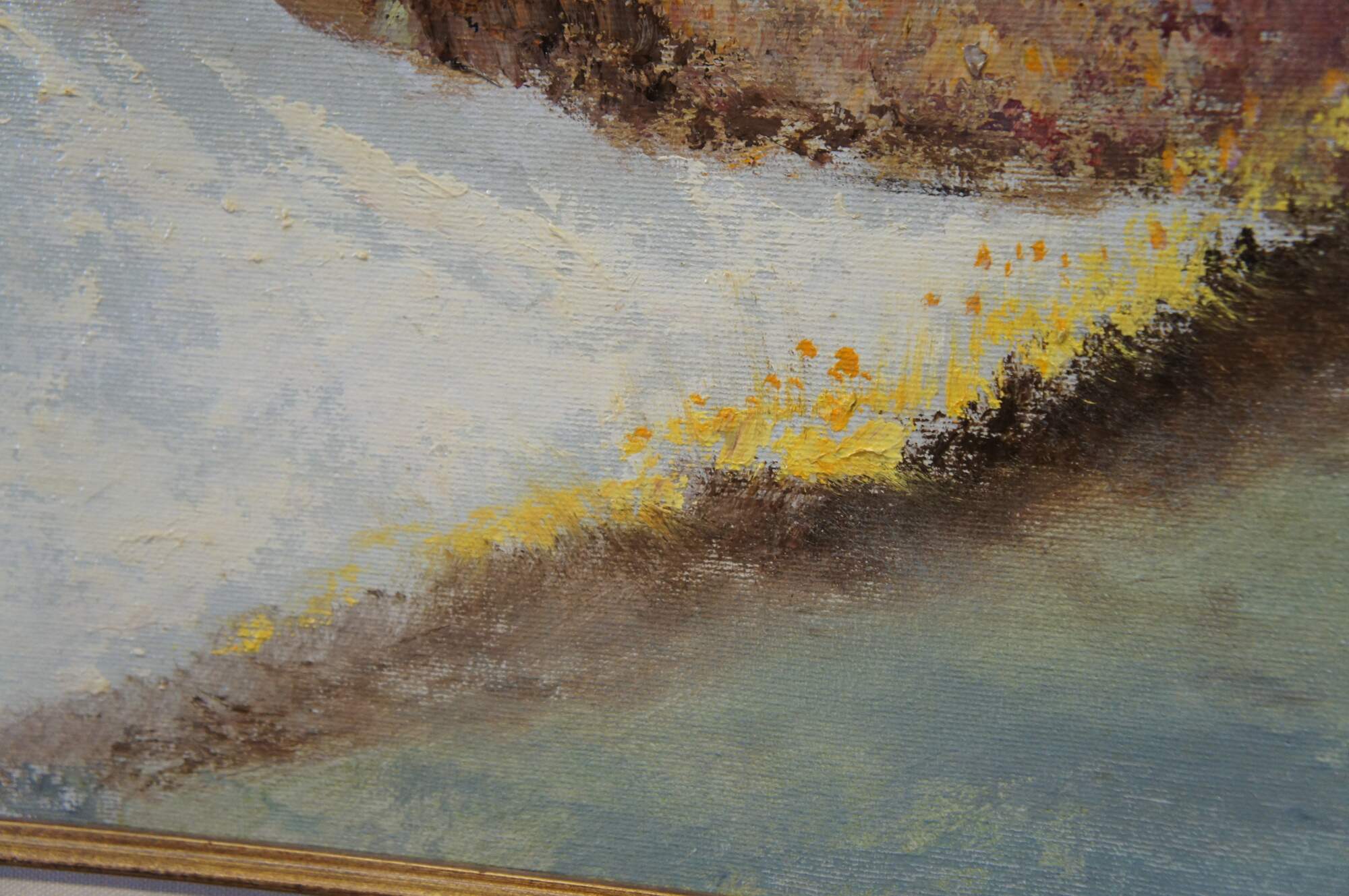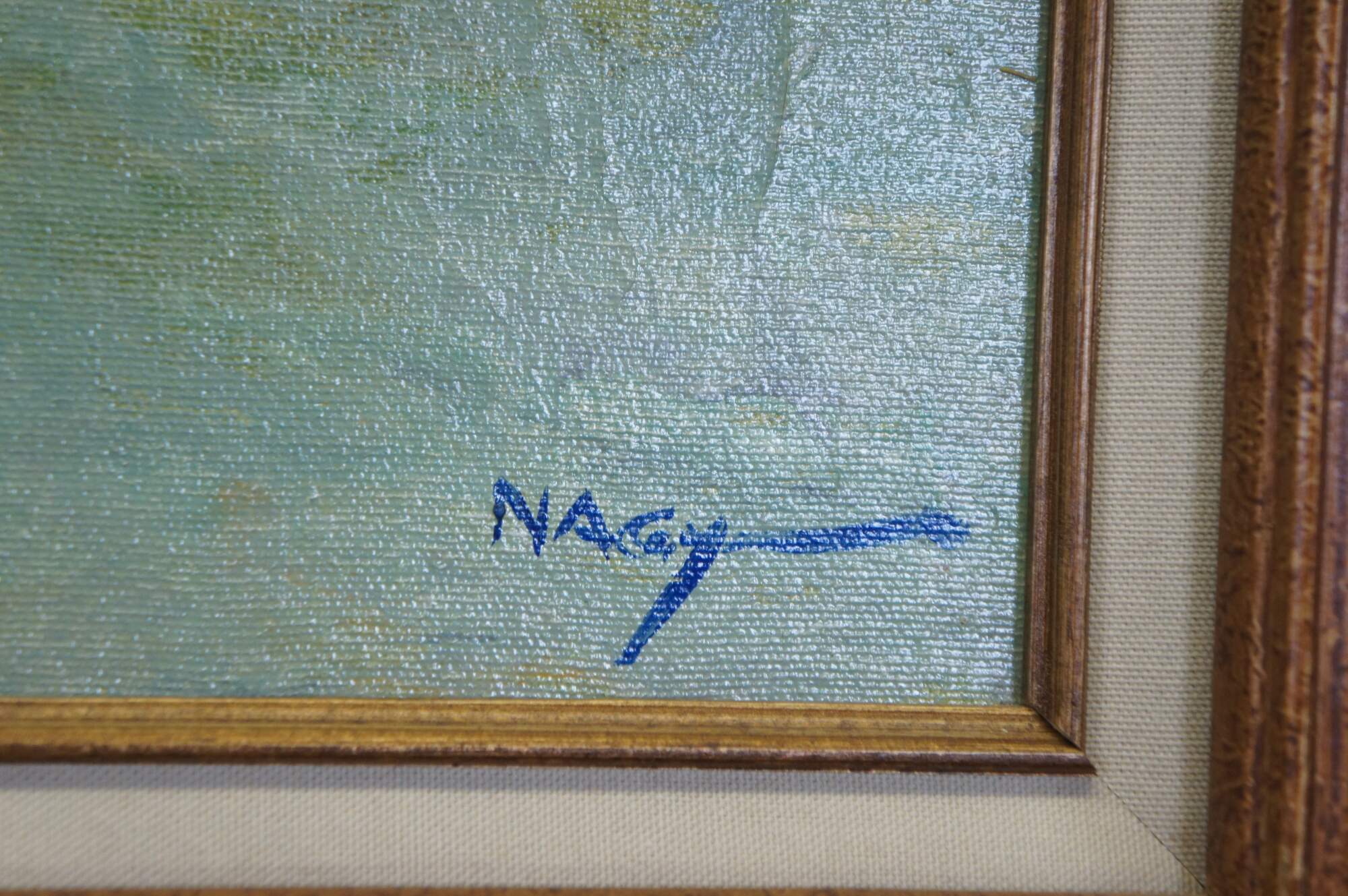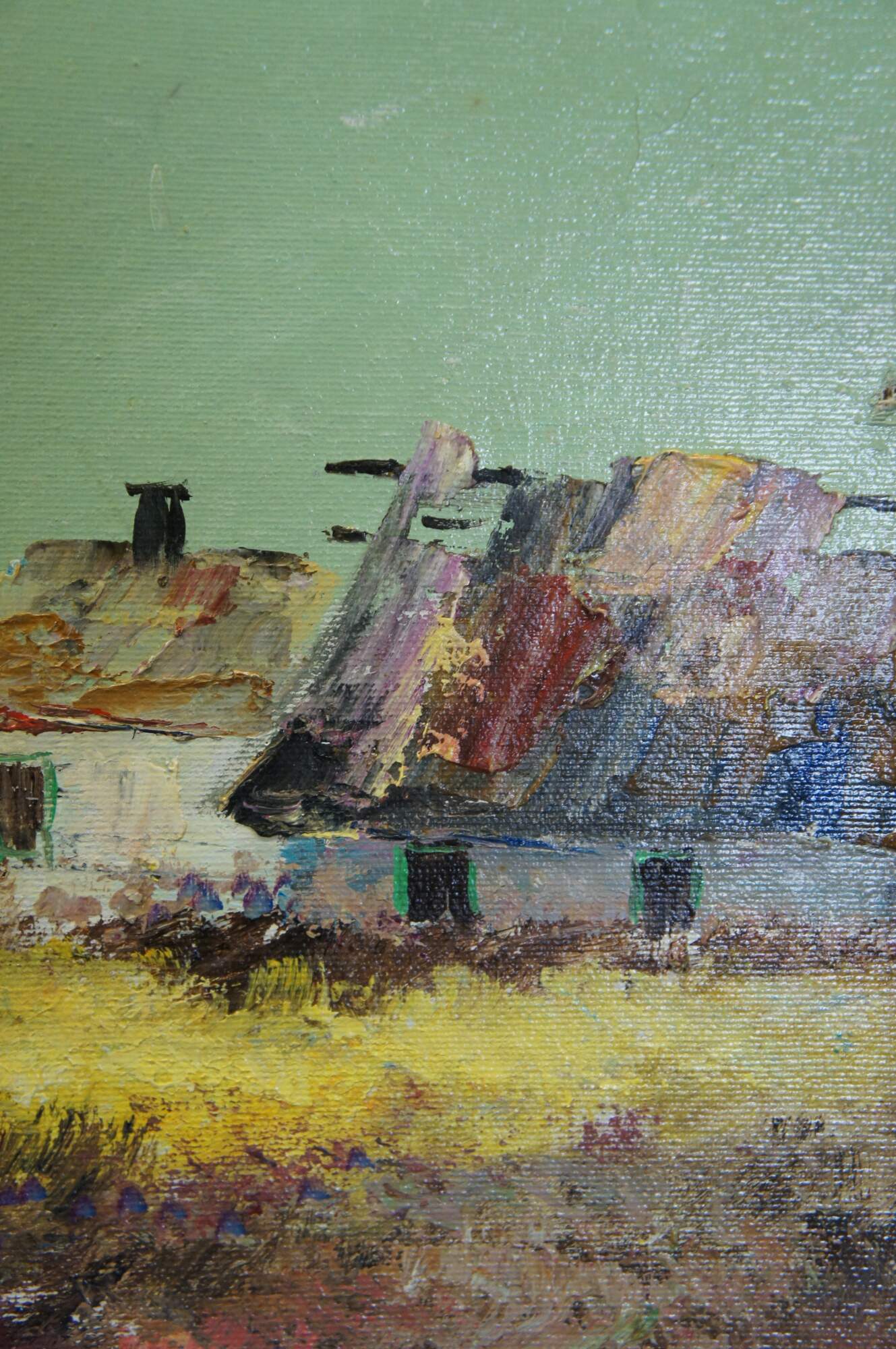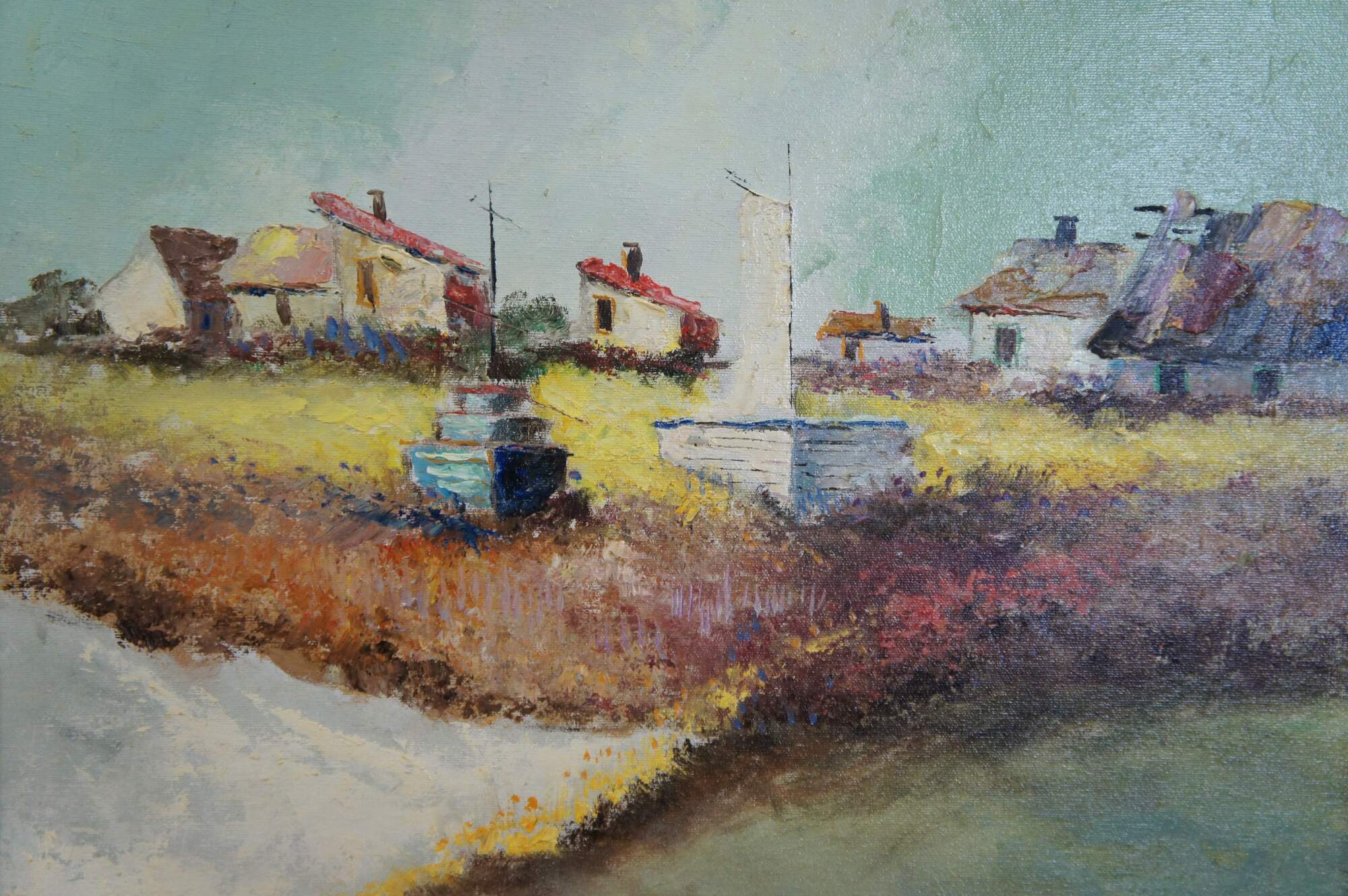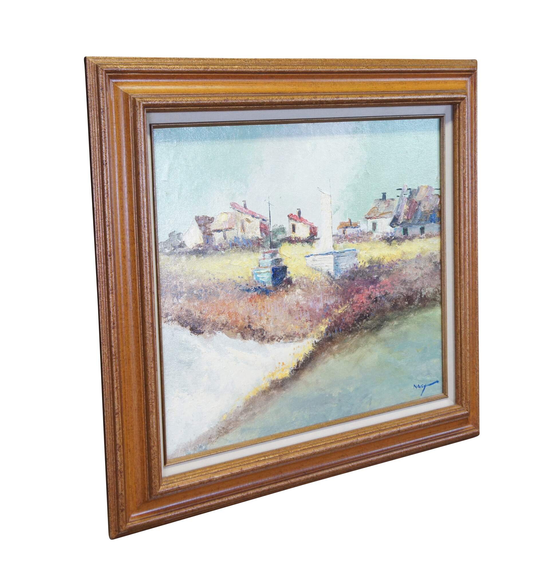 Vintage Impressionist oil painting on canvas by Joseph Nagy. It features a landscape theme of houses overlooking two beached sailboats / boats and water. Signed lower right.