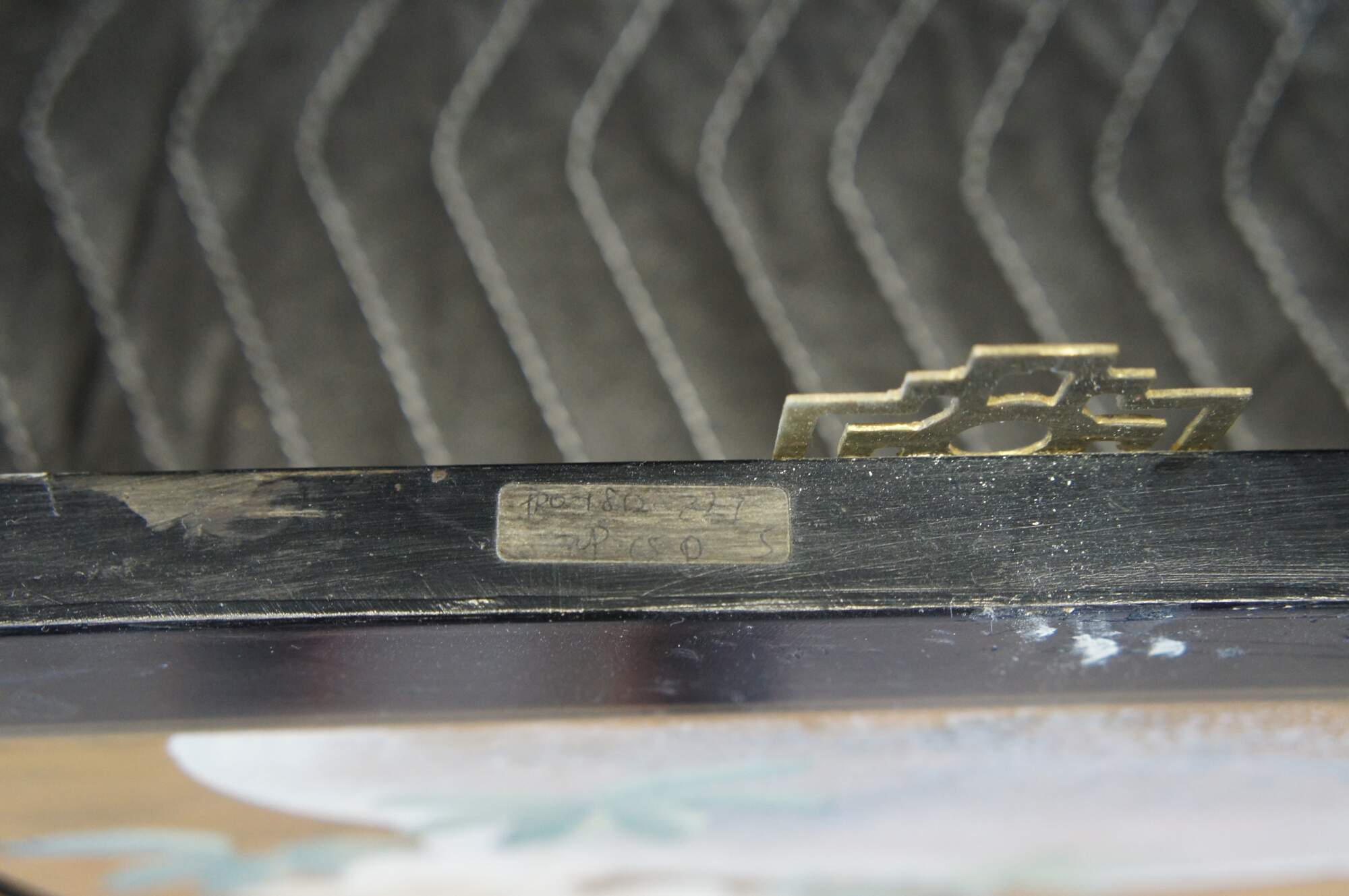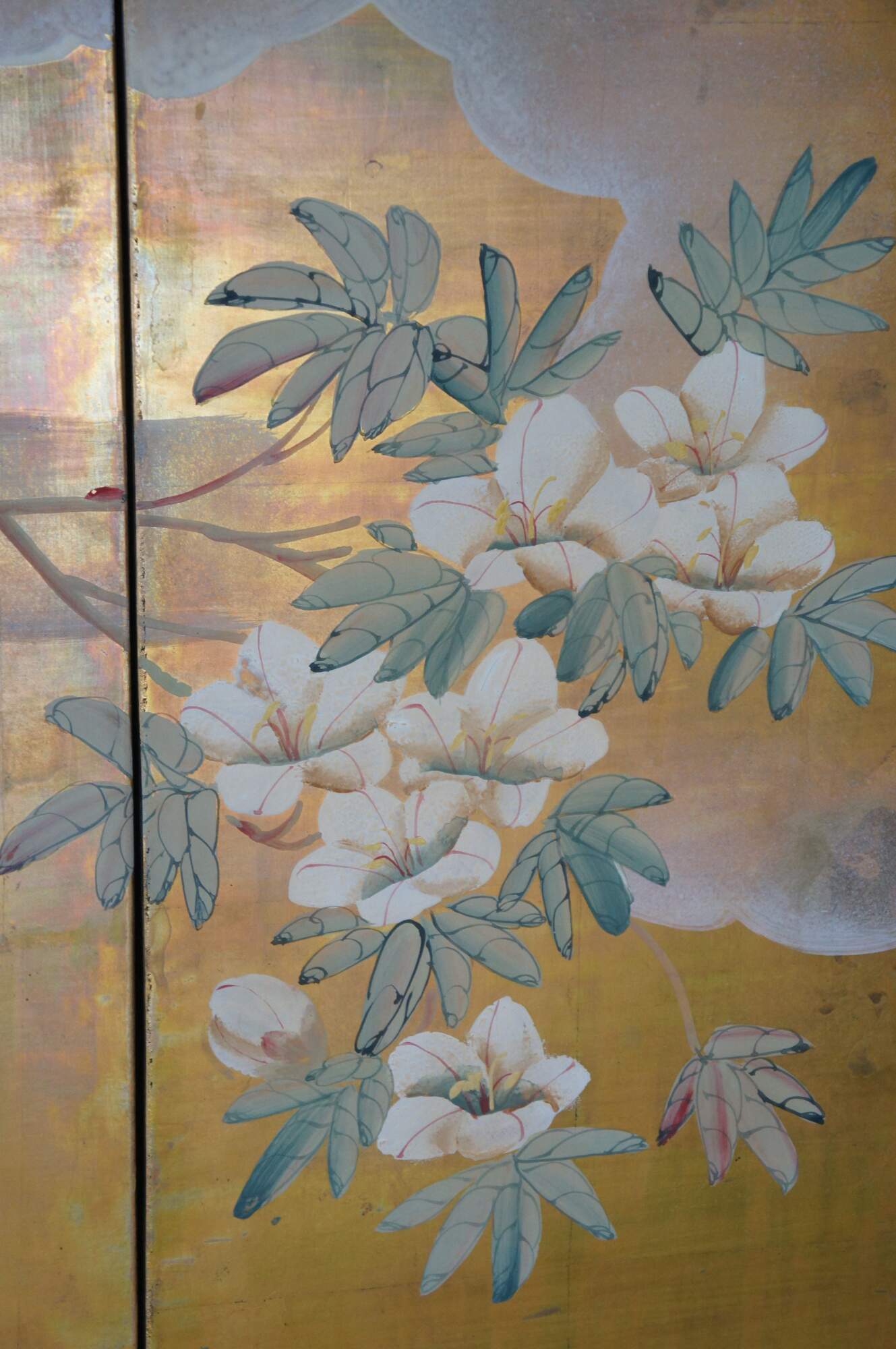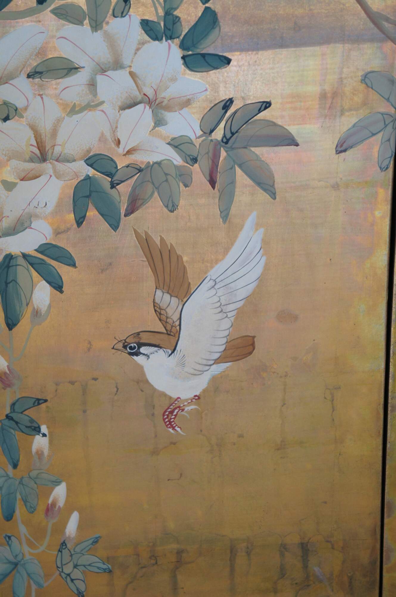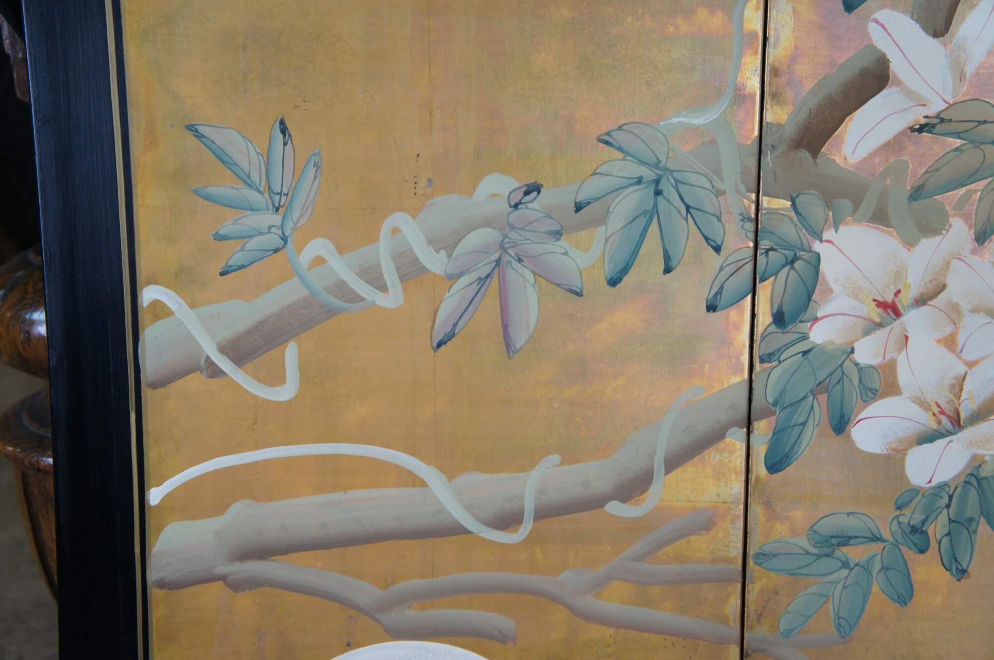 Vintage Japanese Chinoiserie four panel folding screen featuring black lacquer and gold painted scene with two songbirds and a flowering tree with clouds.