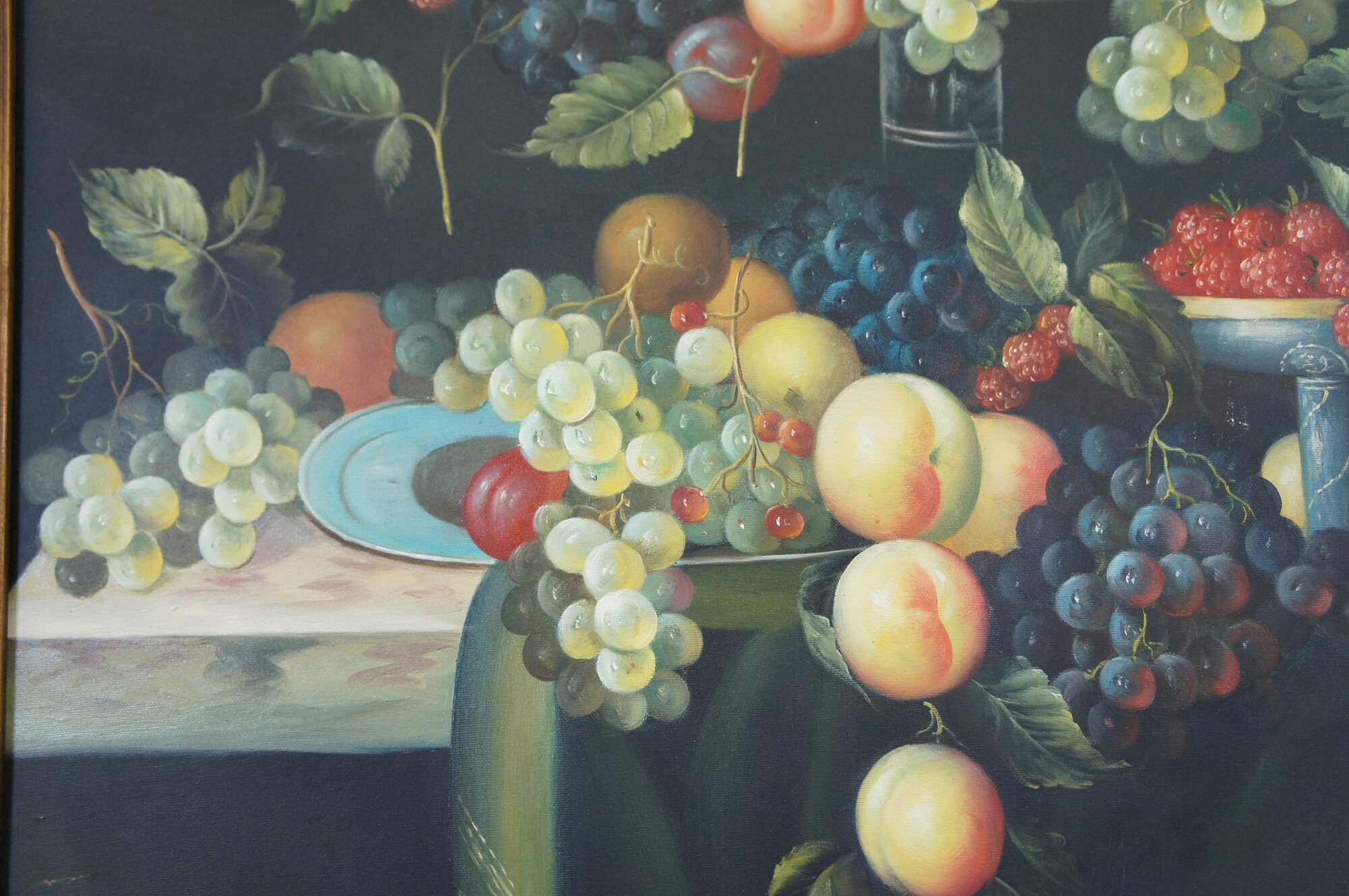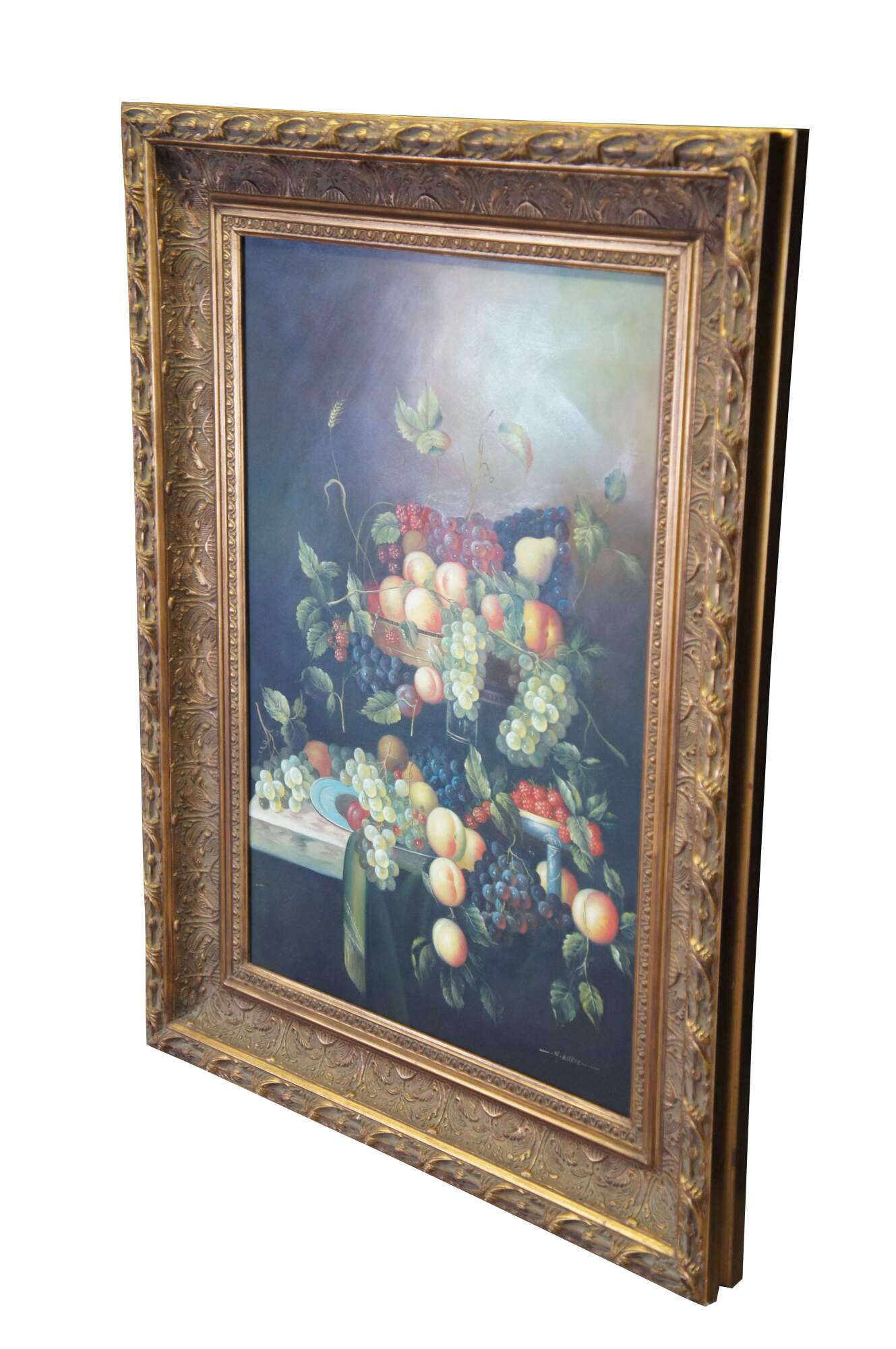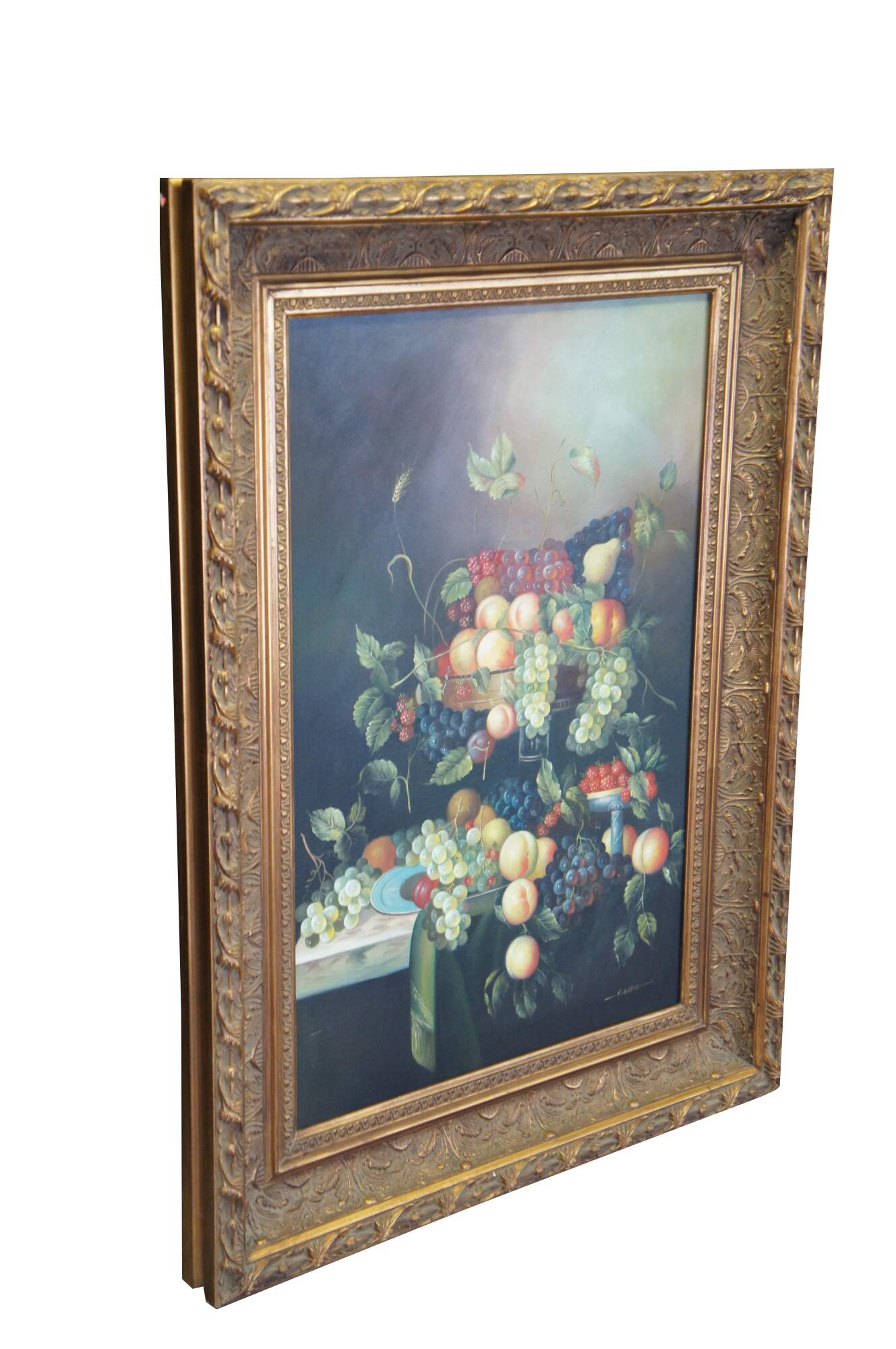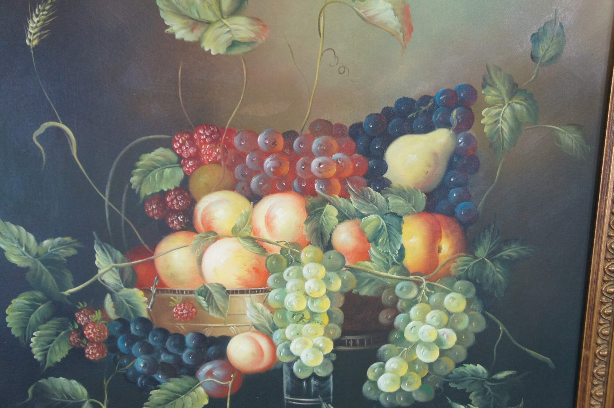 Vintage large still life oil painting by H. Eudie. It features a theme of grapes in many colors, strawberries, peaches, apples, pears, and assorted leaves. Framed in orante gold frame with acanthus design. Grapevine, wine, farmhouse, feast, platter.