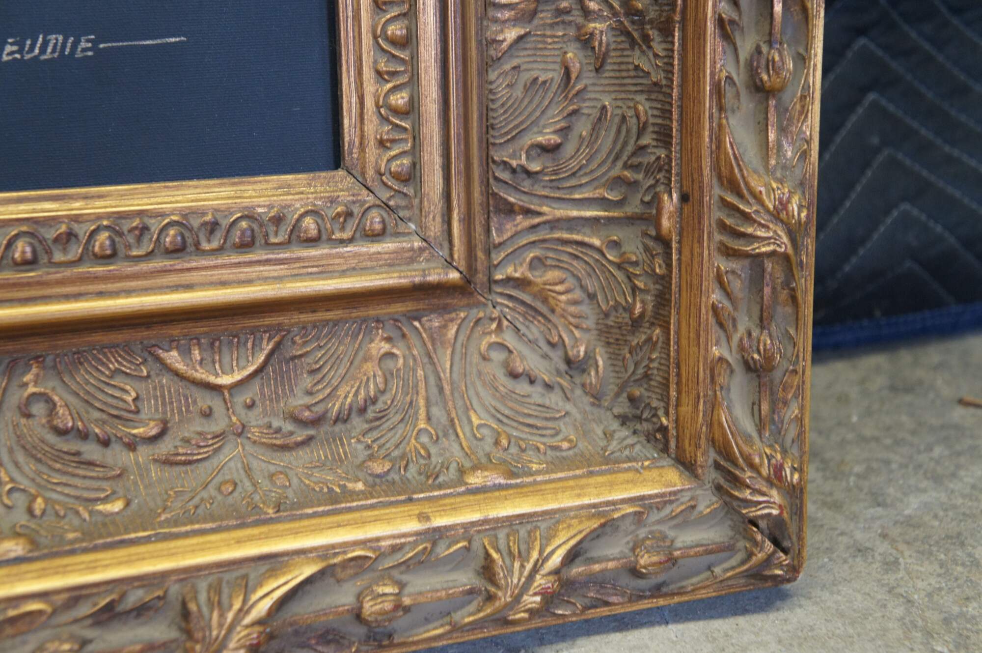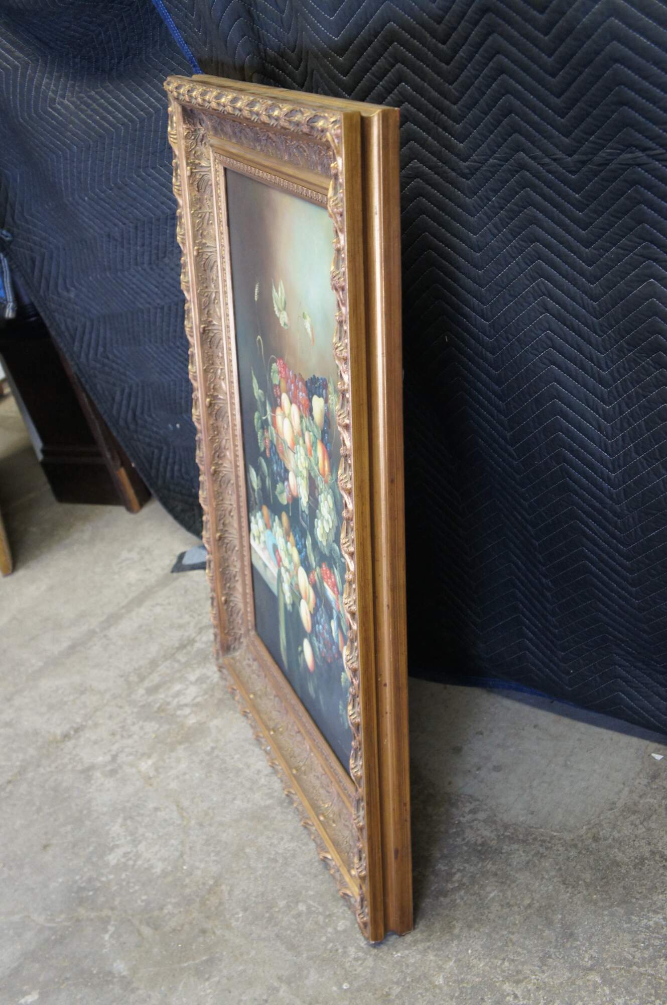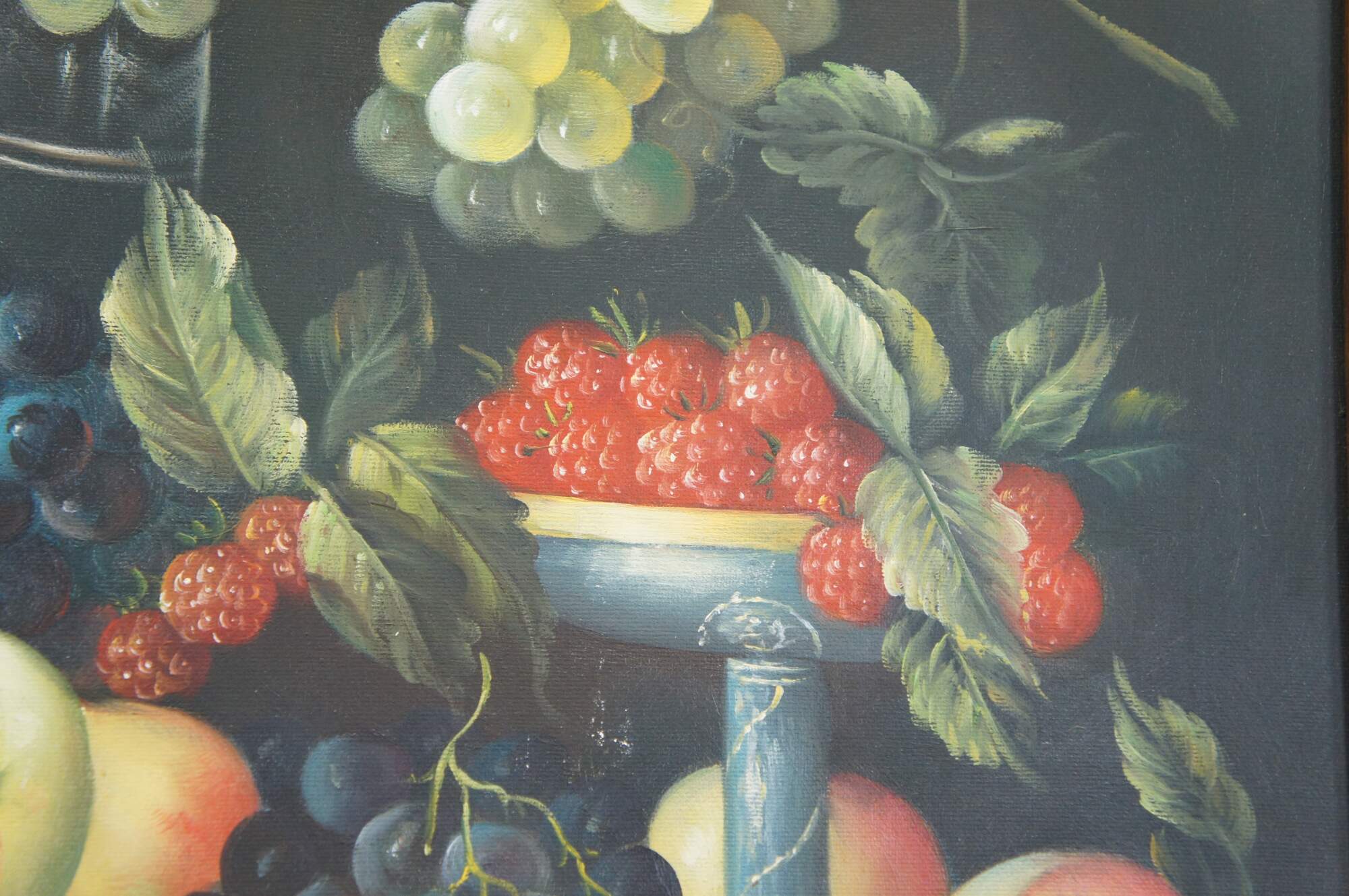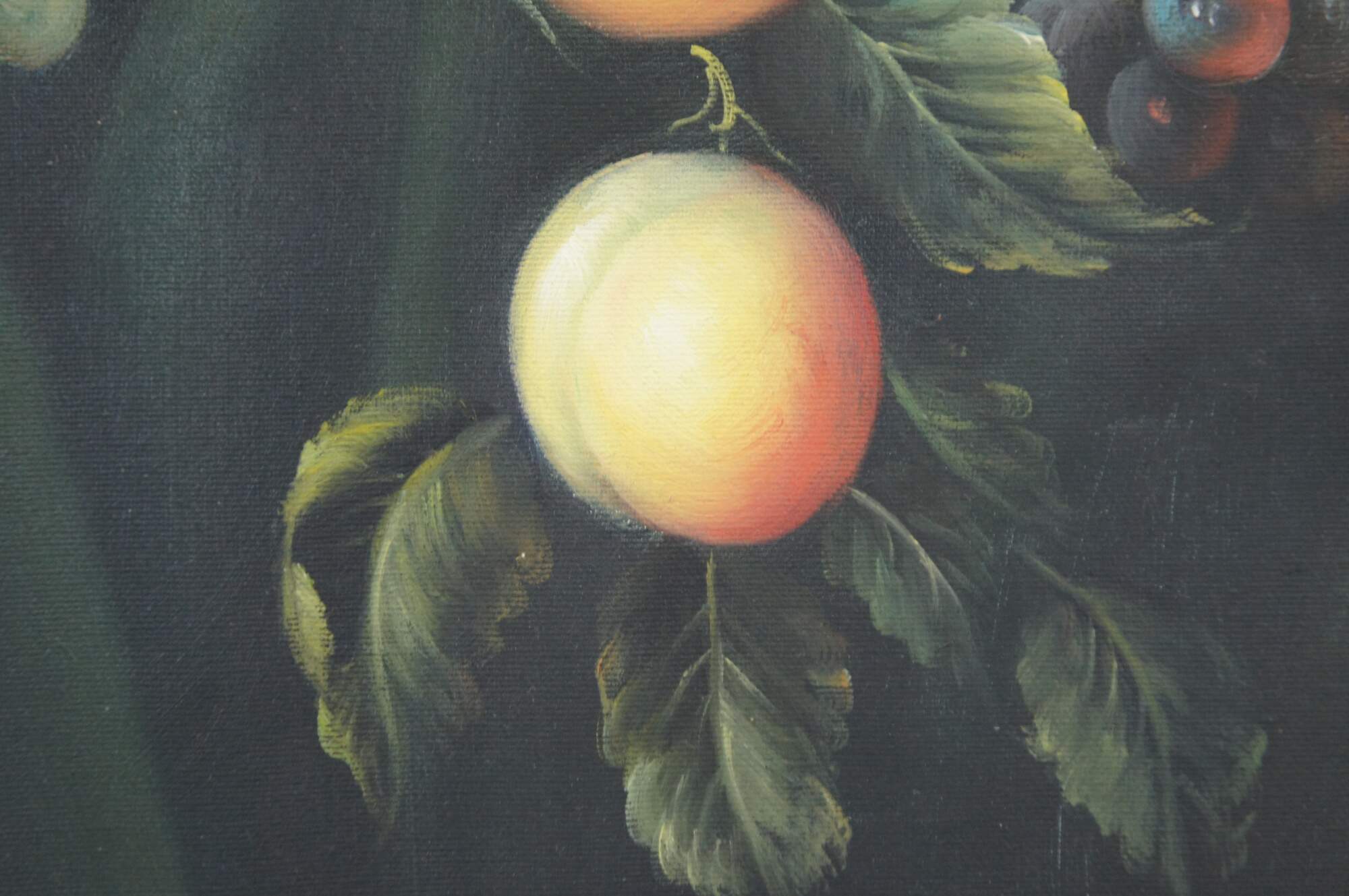 Vintage large still life oil painting by H. Eudie. It features a theme of grapes in many colors, strawberries, peaches, apples, pears, and assorted leaves. Framed in orante gold frame with acanthus design. Grapevine, wine, farmhouse, feast, platter.