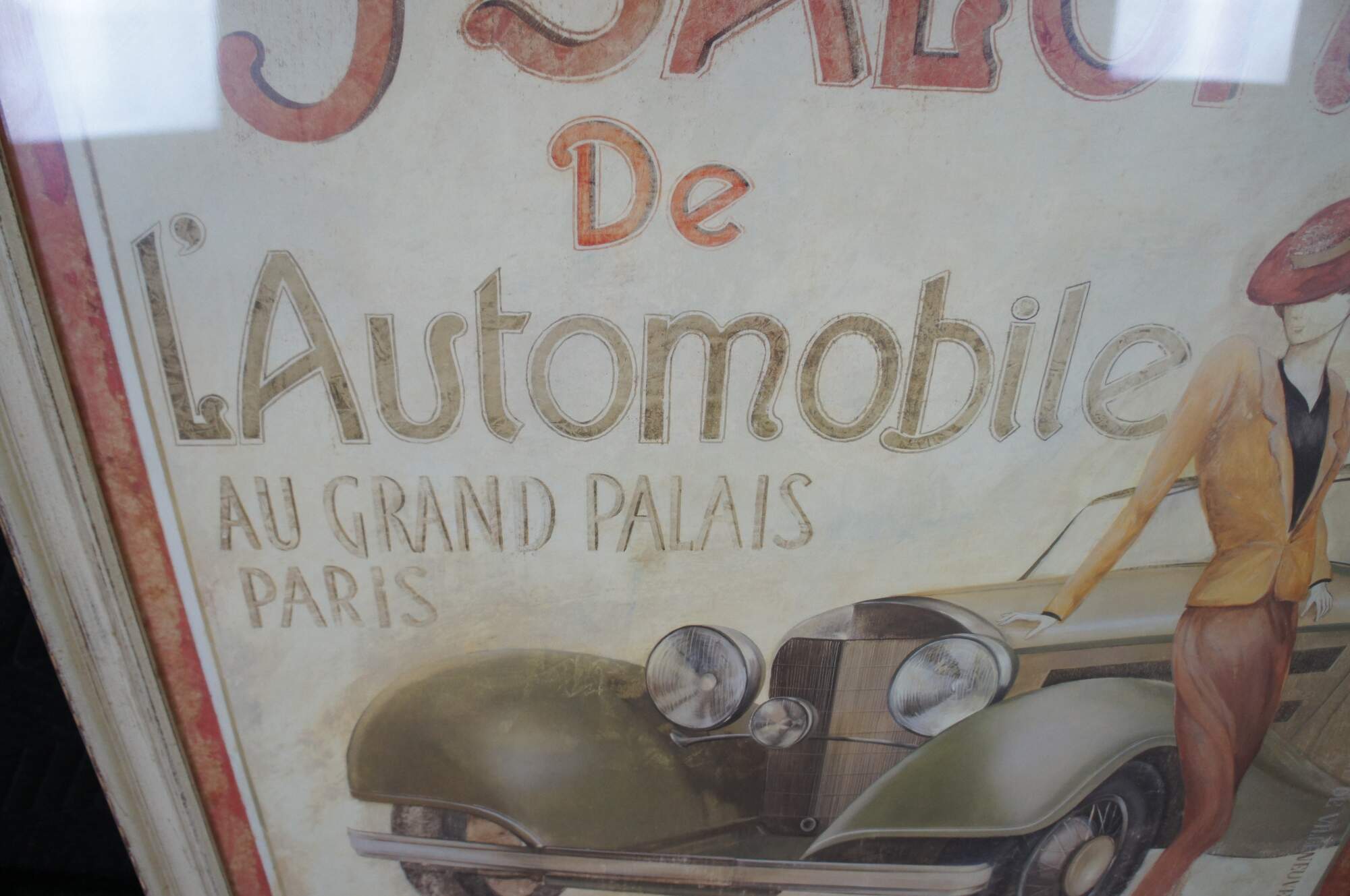 Vintage French Fabrice de Villeneuve framed car show poster print featuring a Victorian Art Deco themed advertisement for the Automobile Club of Paris France in 1926. 5 Me Salon De L'Automobile Au Grand Palais Paris, 10au25 December 1926.
