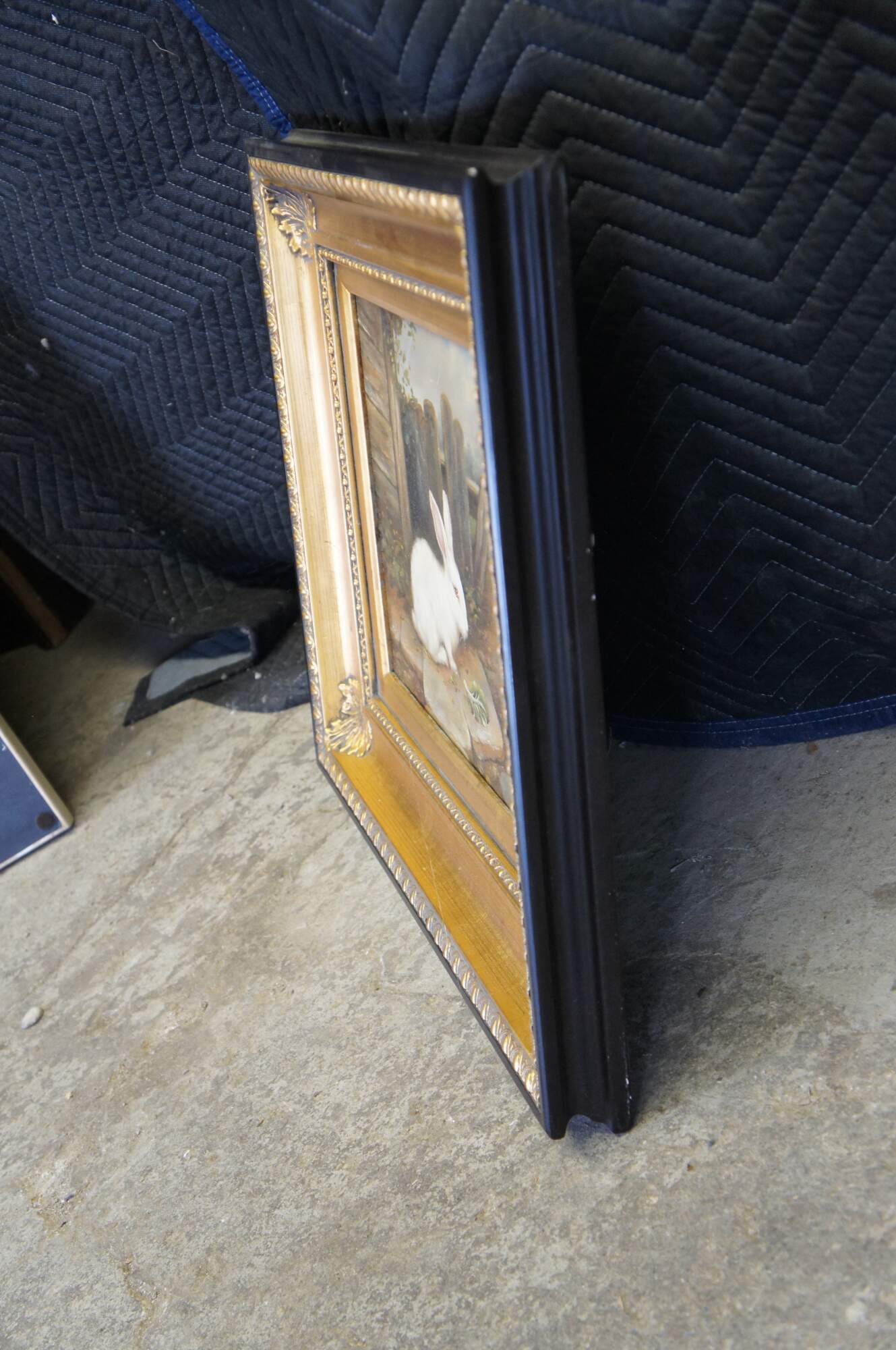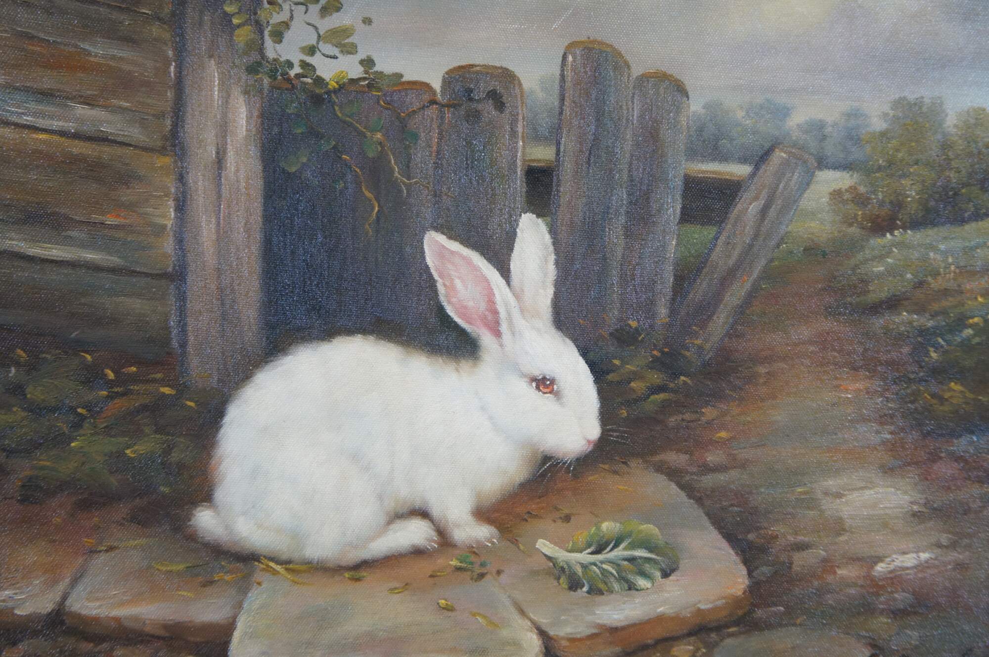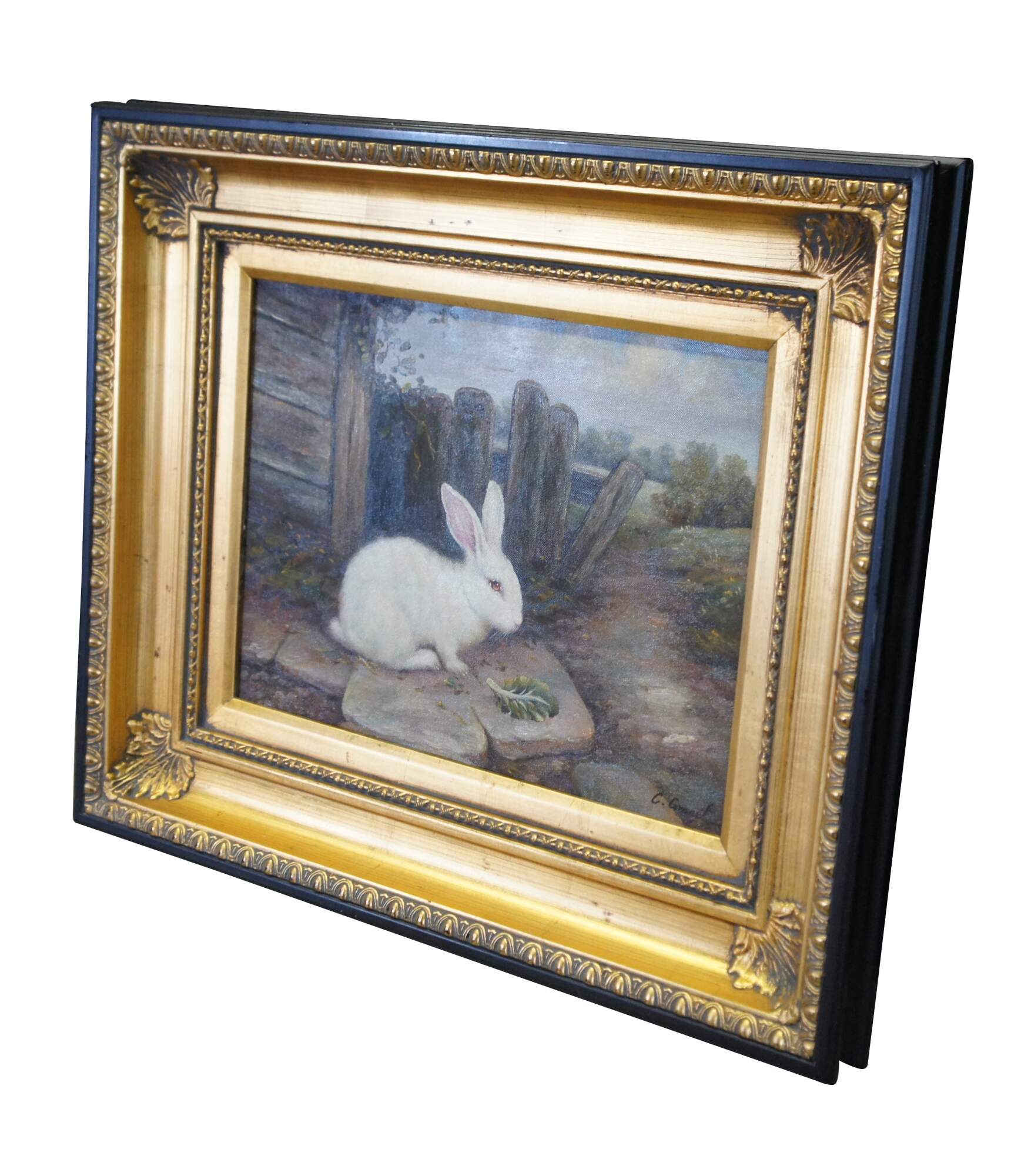 20th century C. Garnet realist bunny / rabbit landscape / portrait oil painting on canvas featuring a white rabbit eating lettuce or a leaf in the garden. Framed in ornate gold acanthus design frame with black accents. Signed lower right.