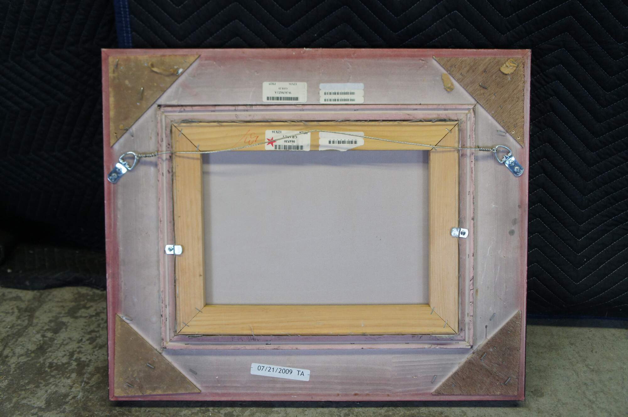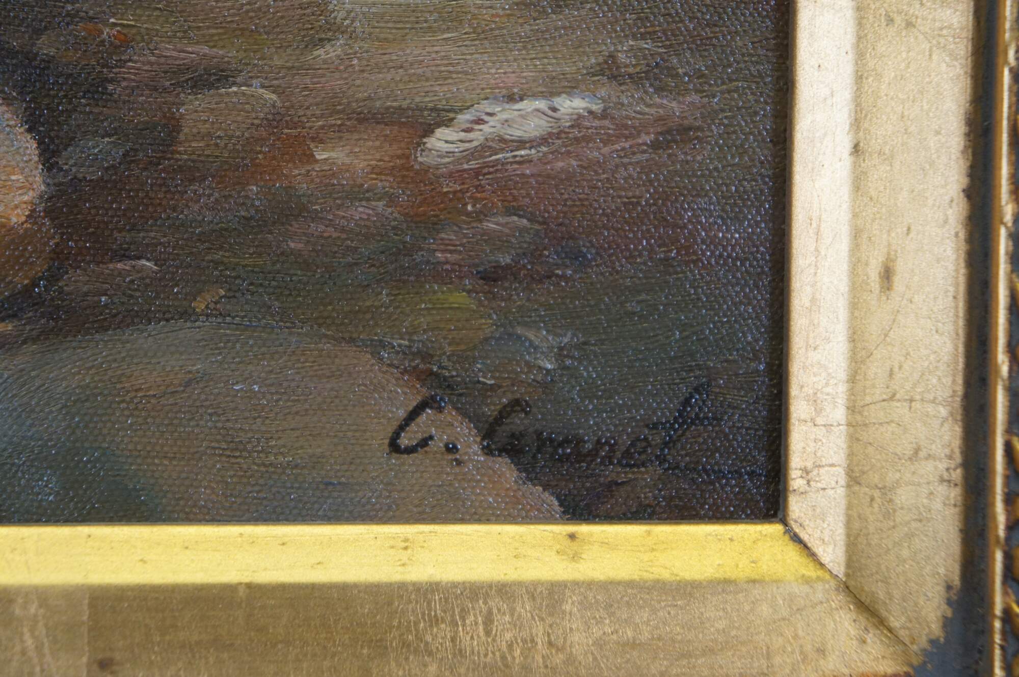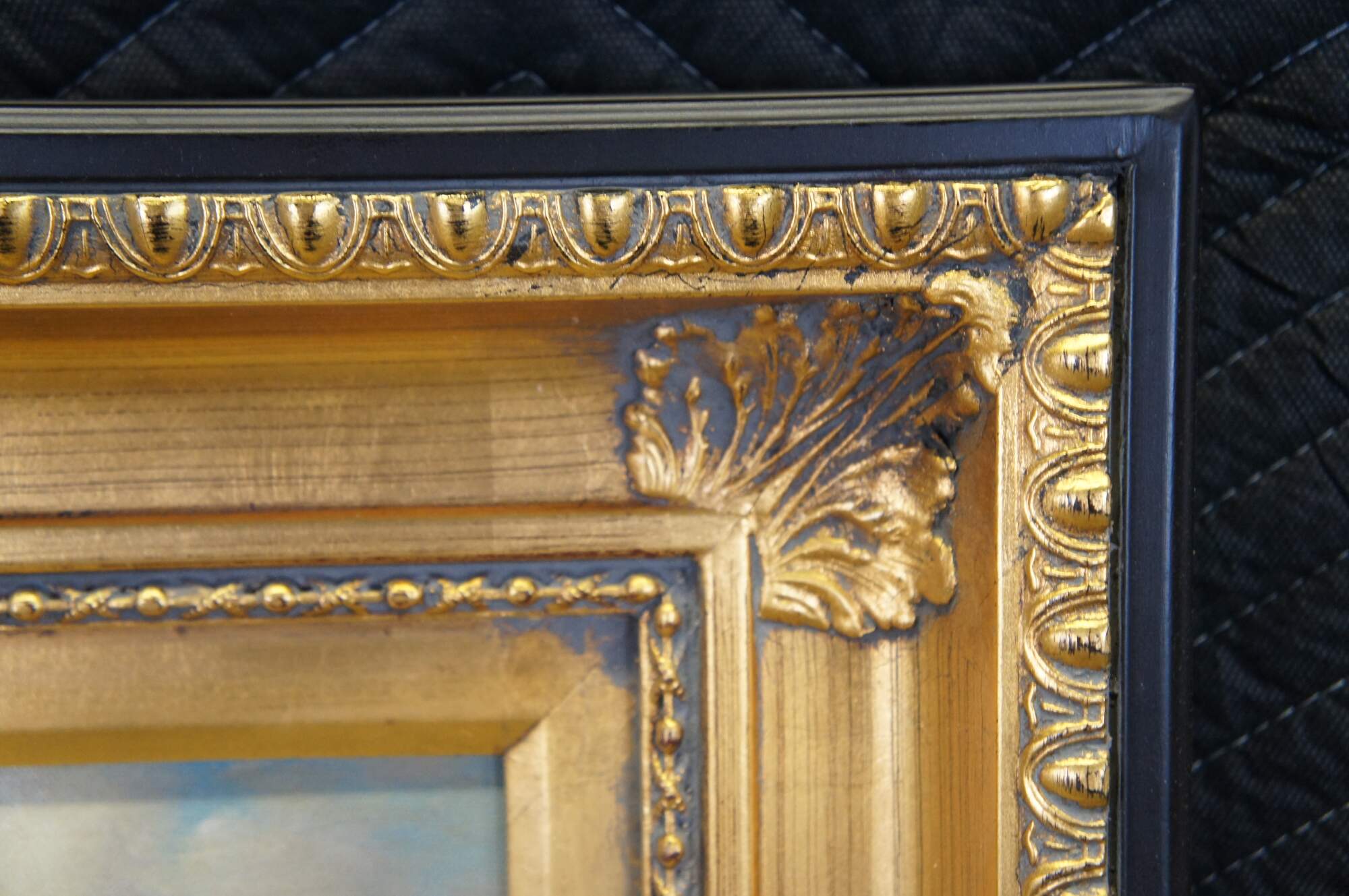 20th century C. Garnet realist bunny / rabbit landscape / portrait oil painting on canvas featuring a white rabbit eating lettuce or a leaf in the garden. Framed in ornate gold acanthus design frame with black accents. Signed lower right.