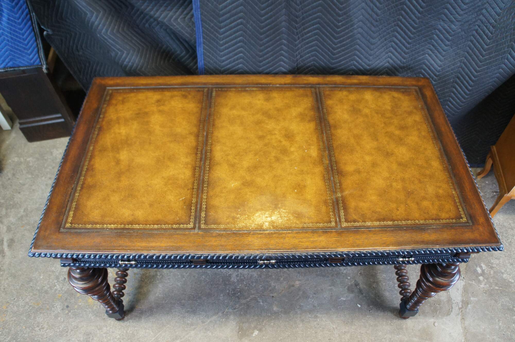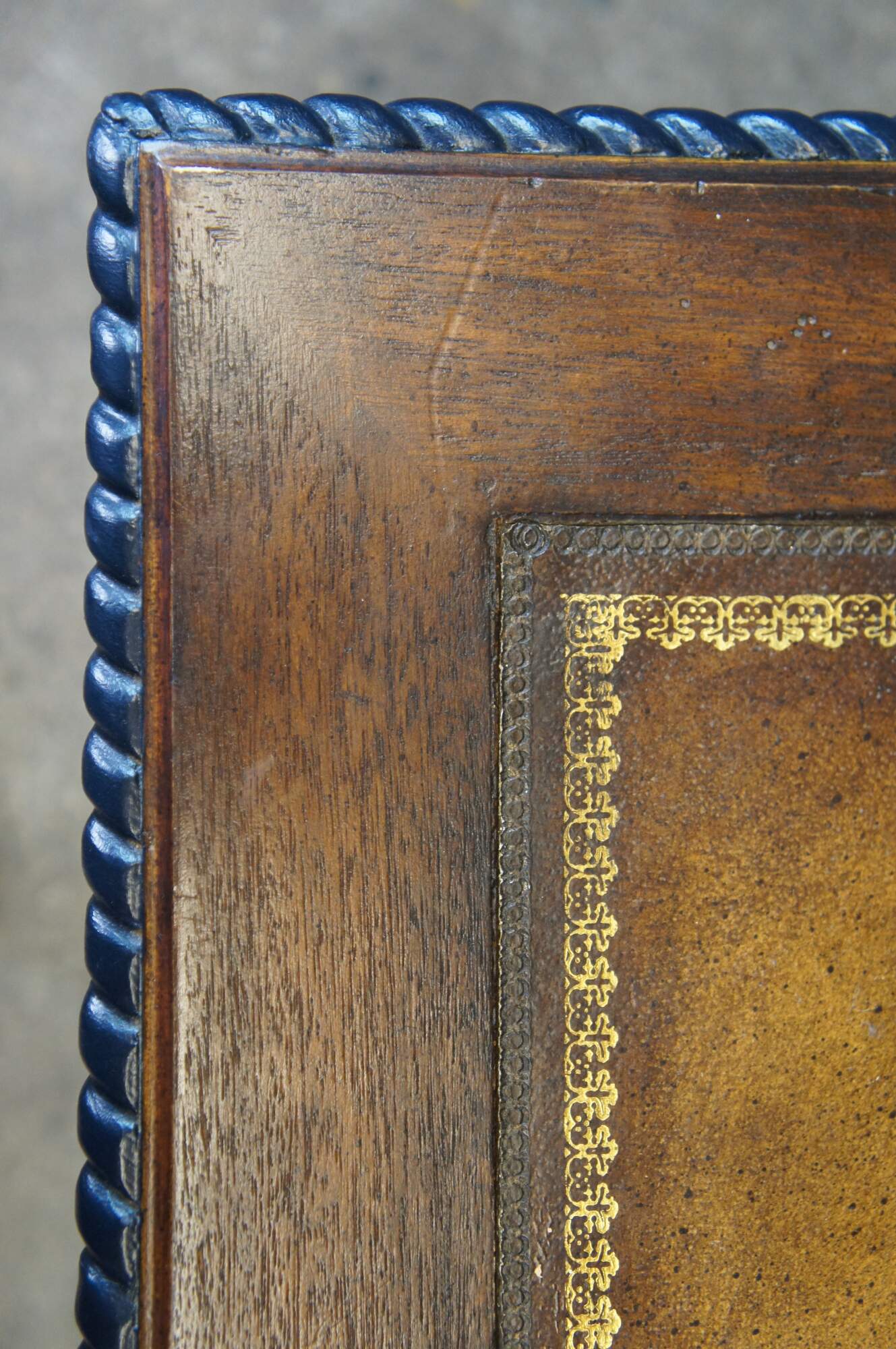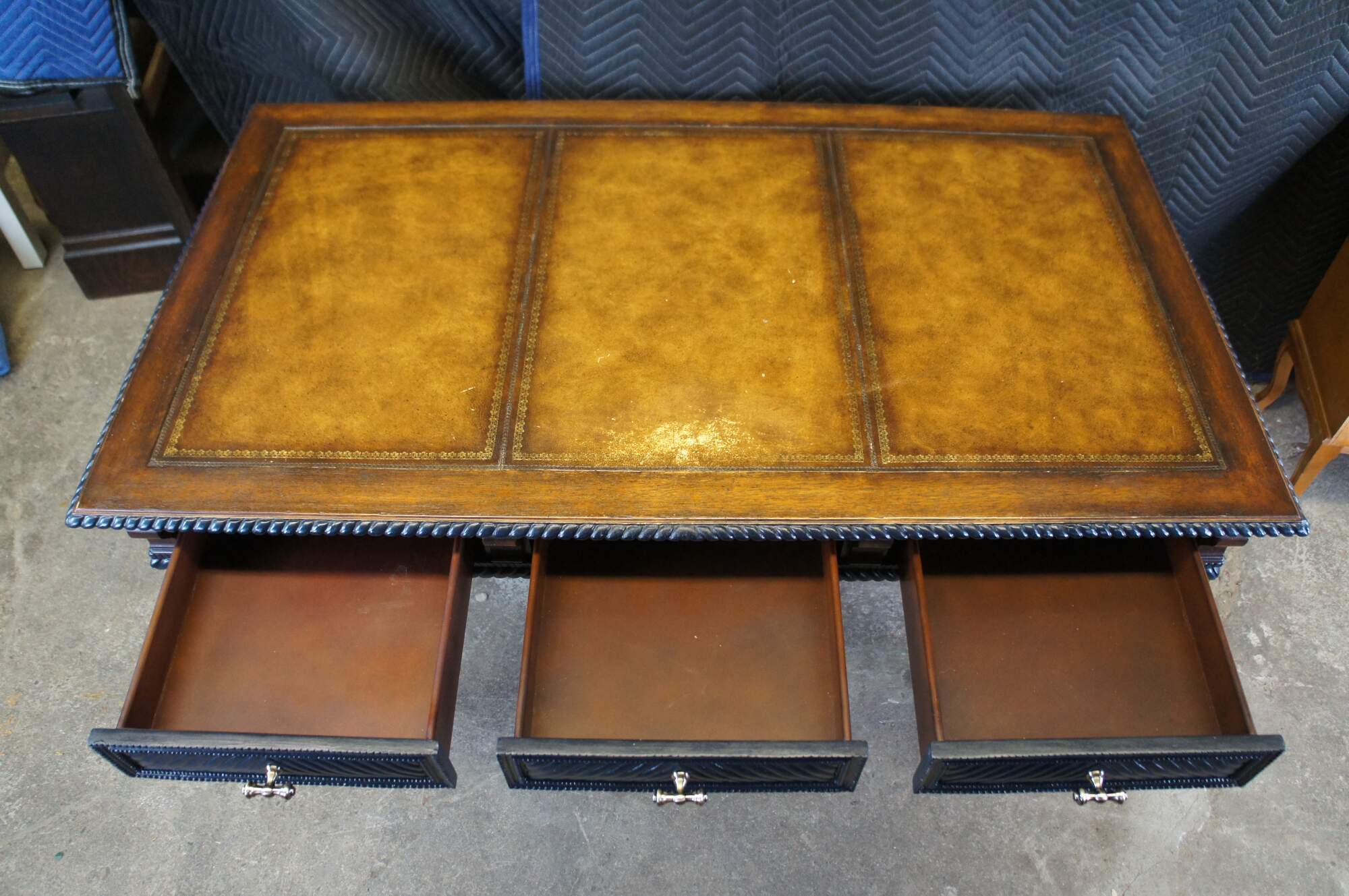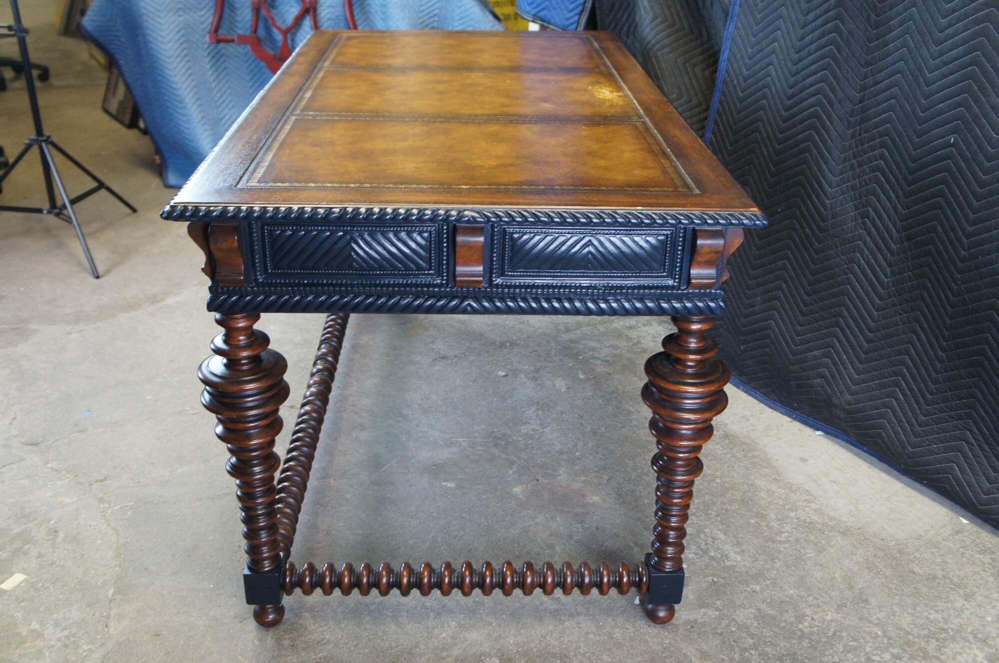 Vintage William & Mary style / Spanish / Colonial / Renaissance Revival library desk featuring a mahogany finish with ribbed and stacked design supporting a tooled leather top with three frieze drawers.