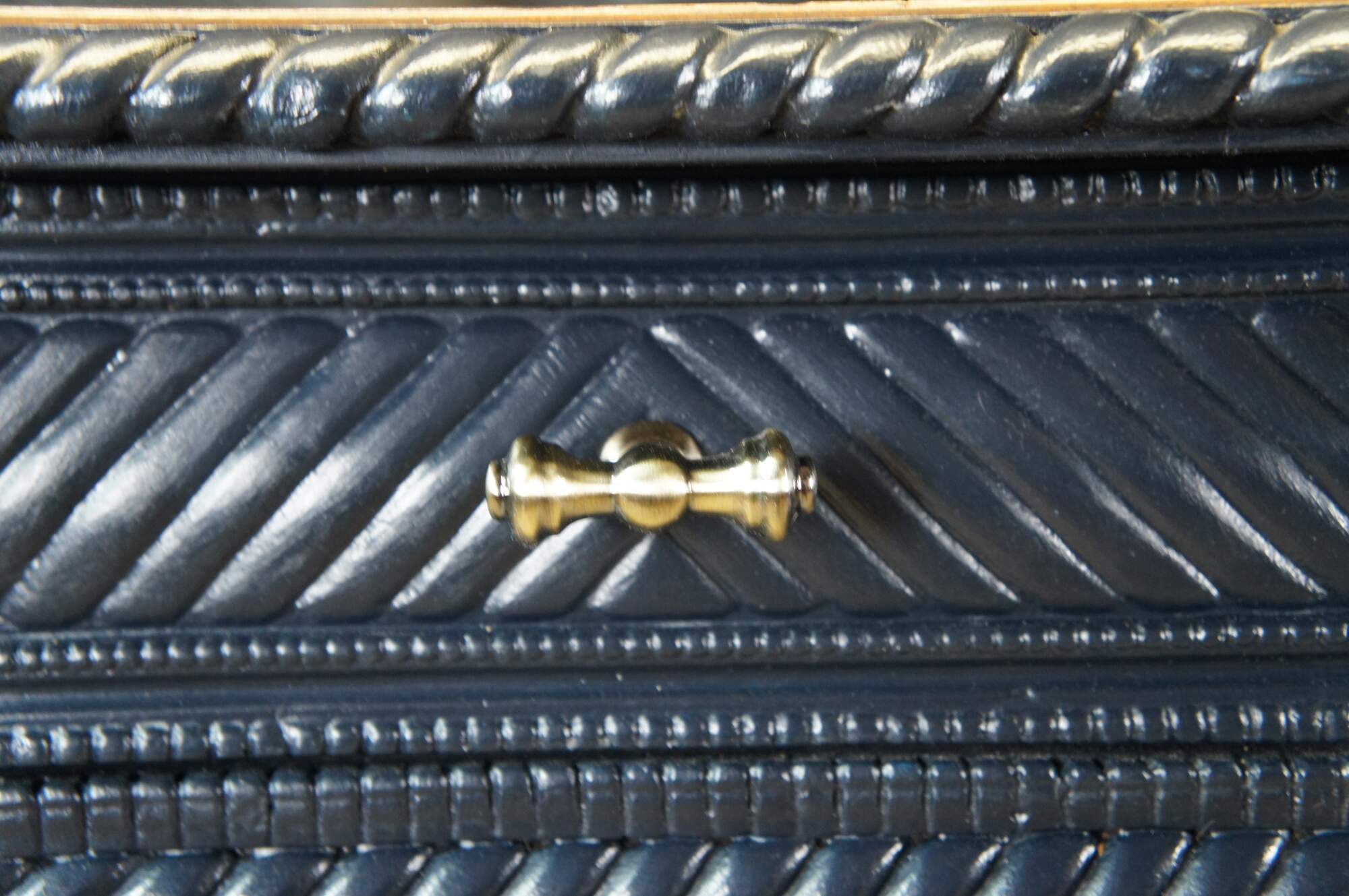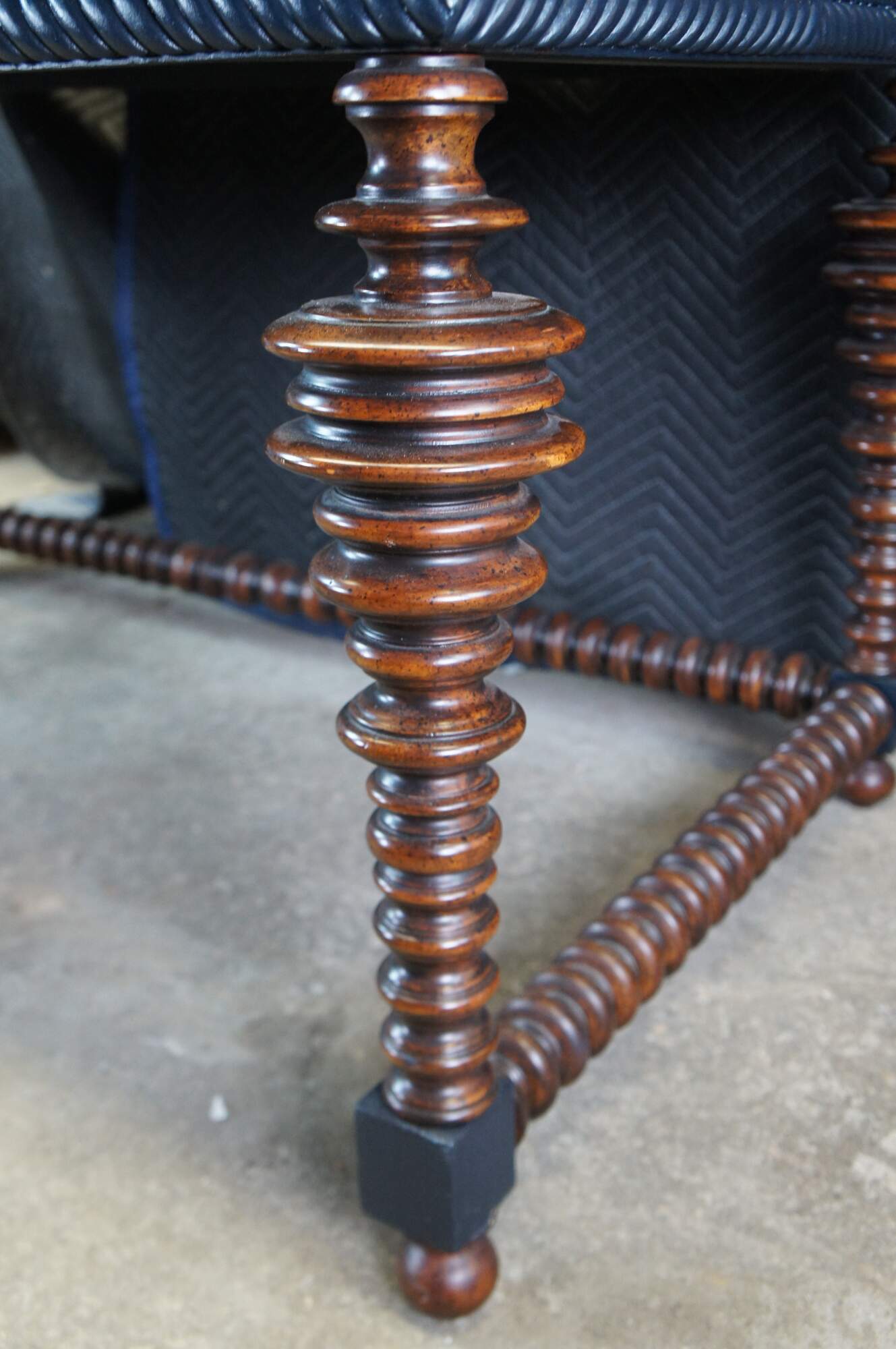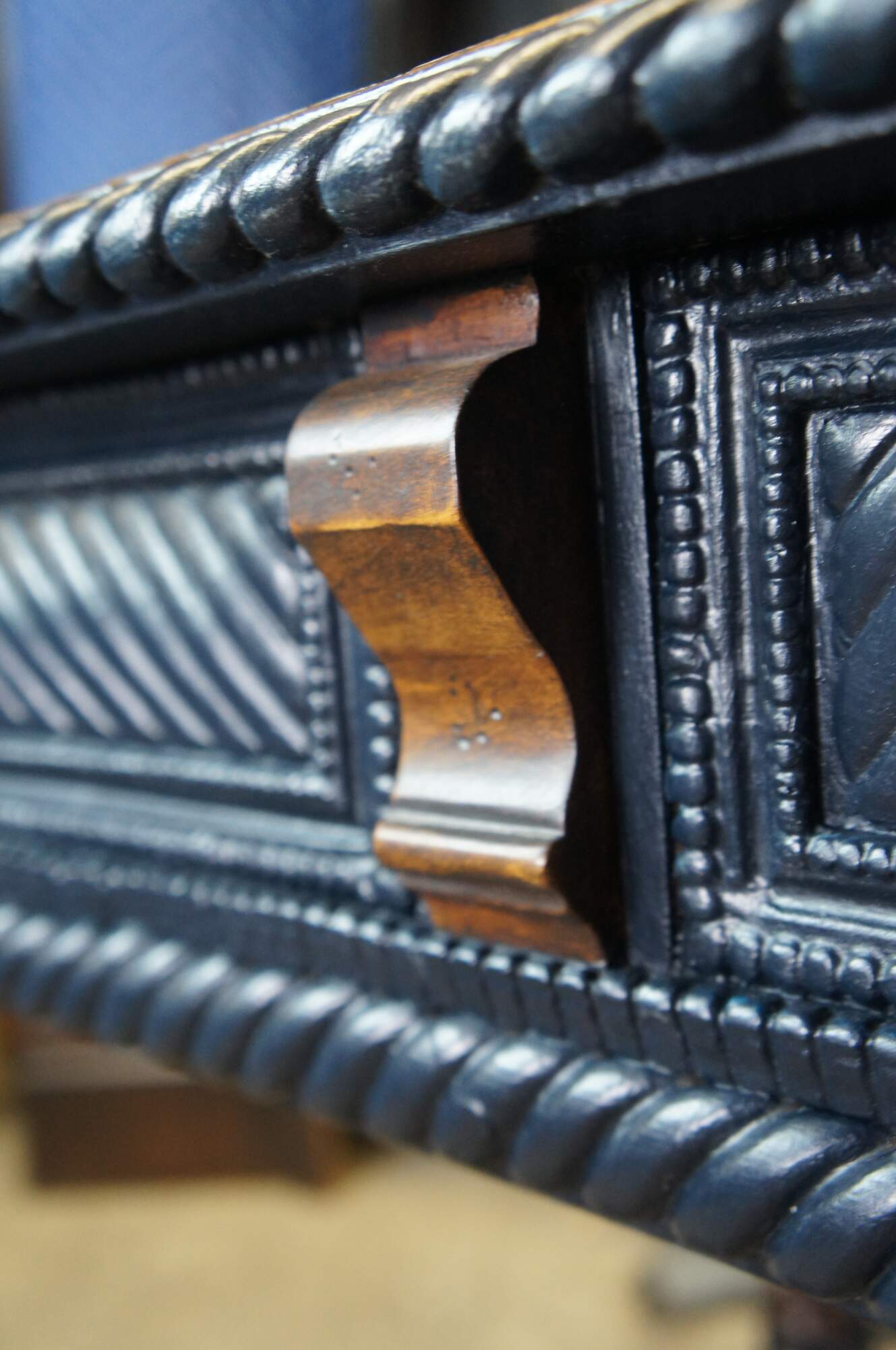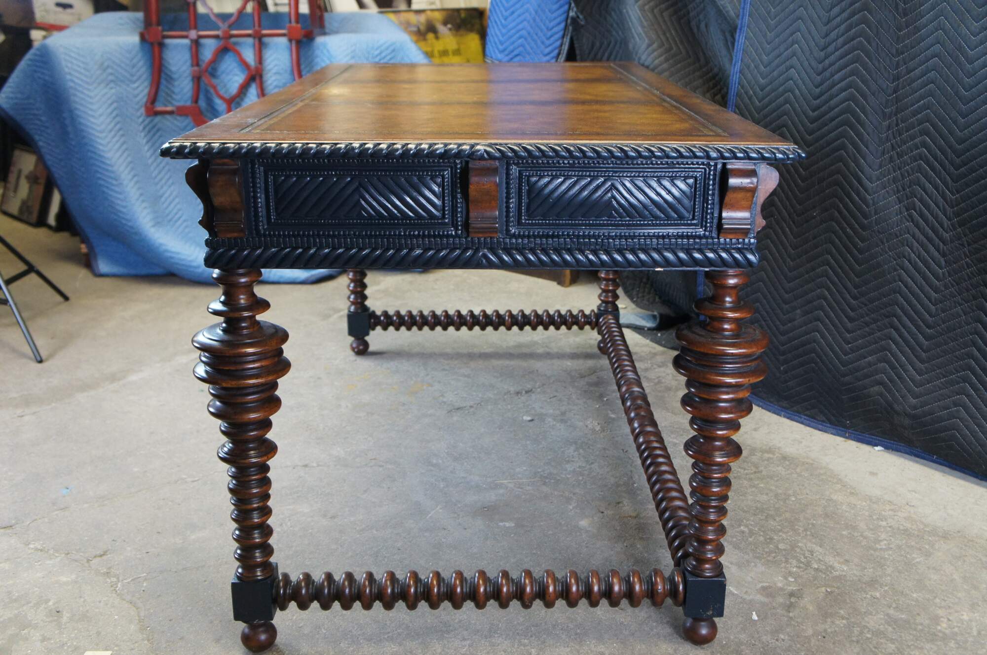 Vintage William & Mary style / Spanish / Colonial / Renaissance Revival library desk featuring a mahogany finish with ribbed and stacked design supporting a tooled leather top with three frieze drawers.
