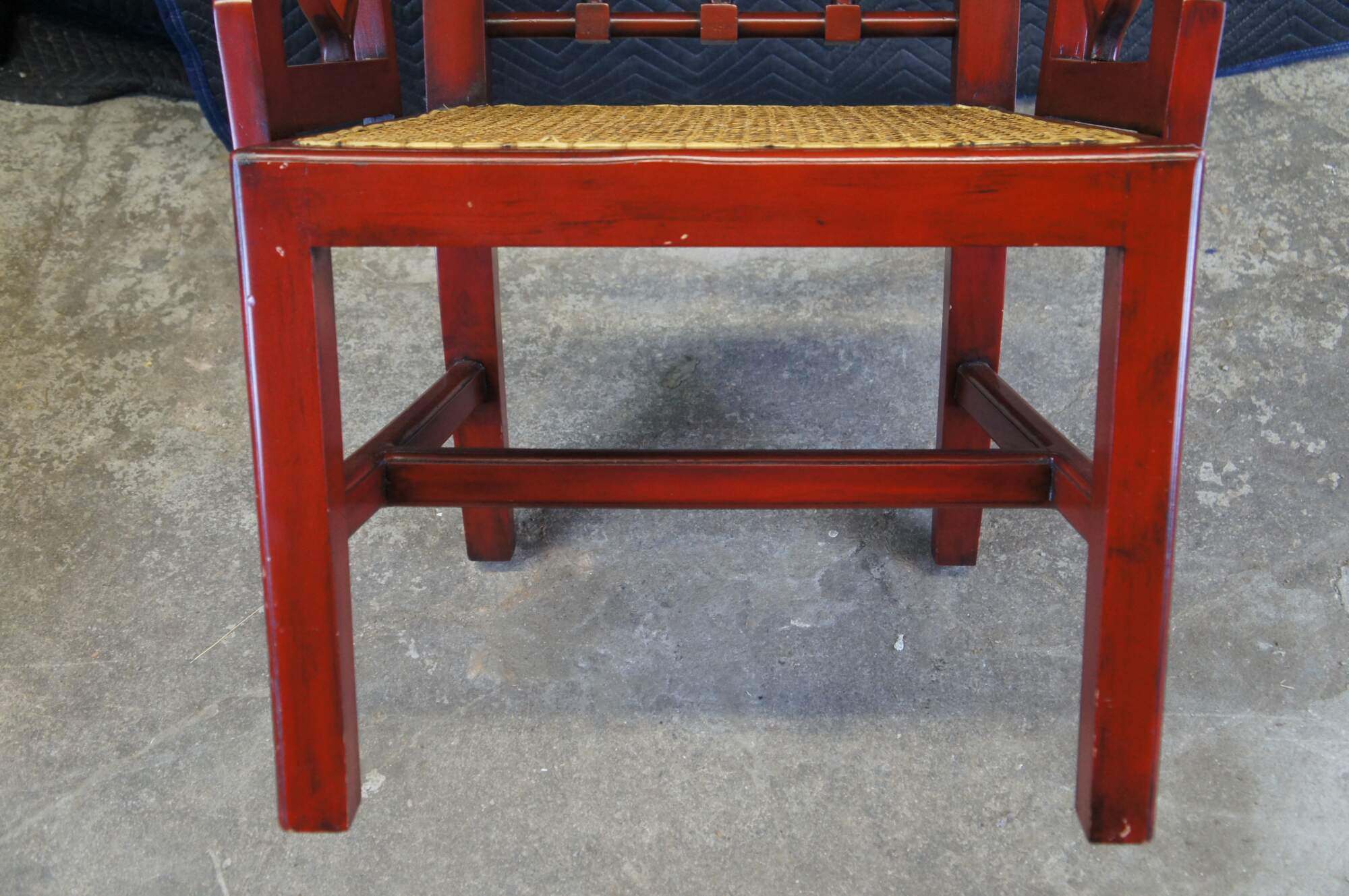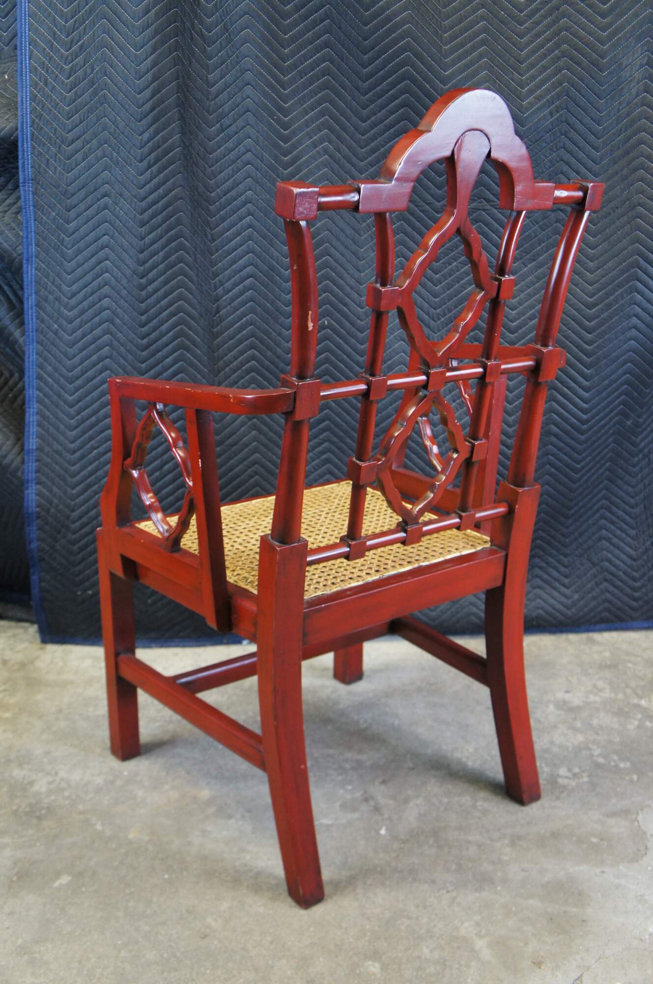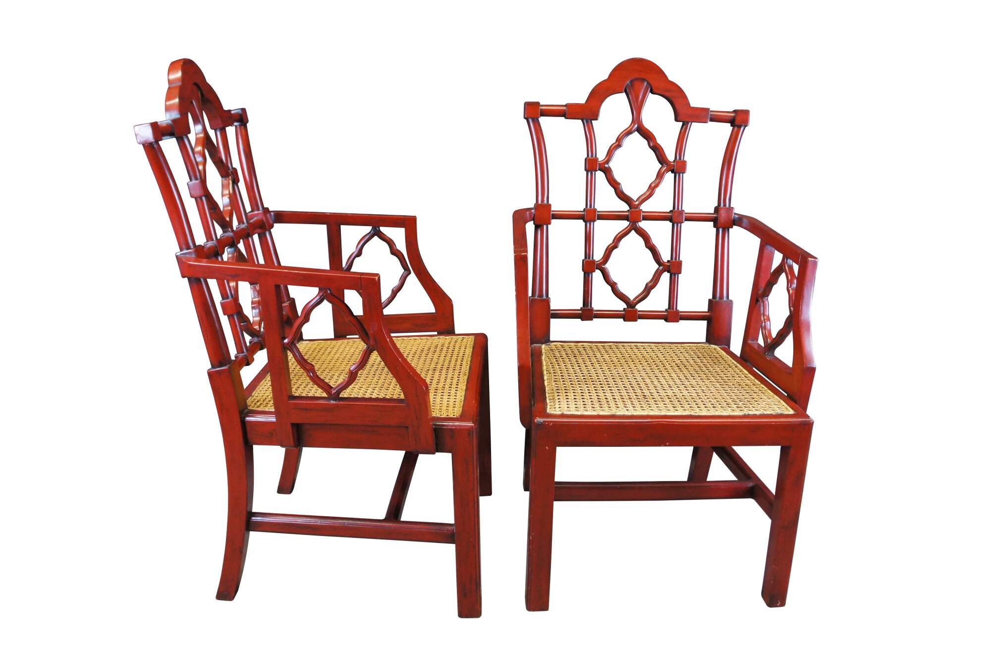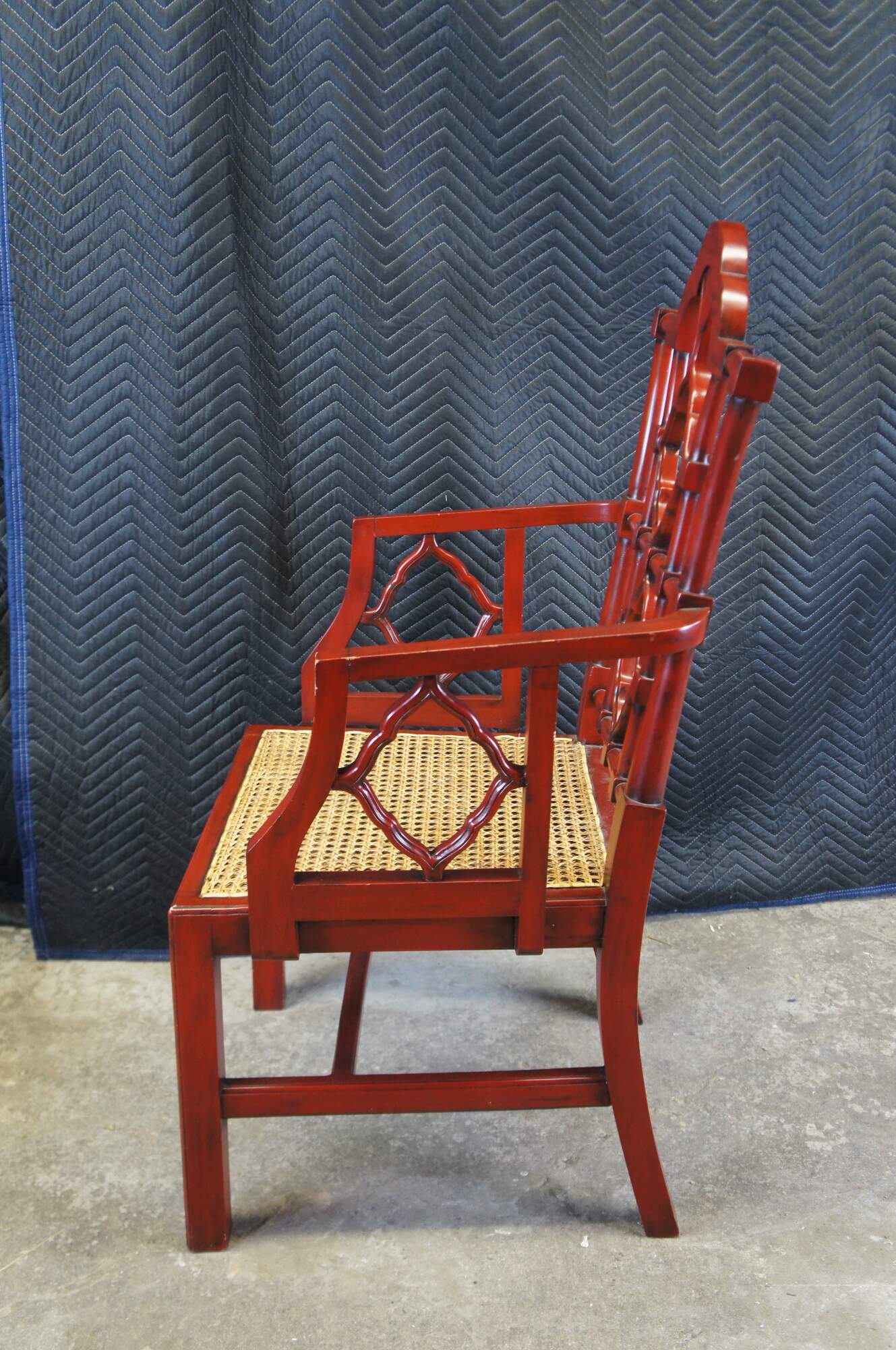 Two vintage Chinese Chippendale / Chinoiserie style arm chairs featuring a red lacquered finish with diamond shaped reticulated lattice back and arched crest rail, high arms and woven caned seats. Made in Indonesia.