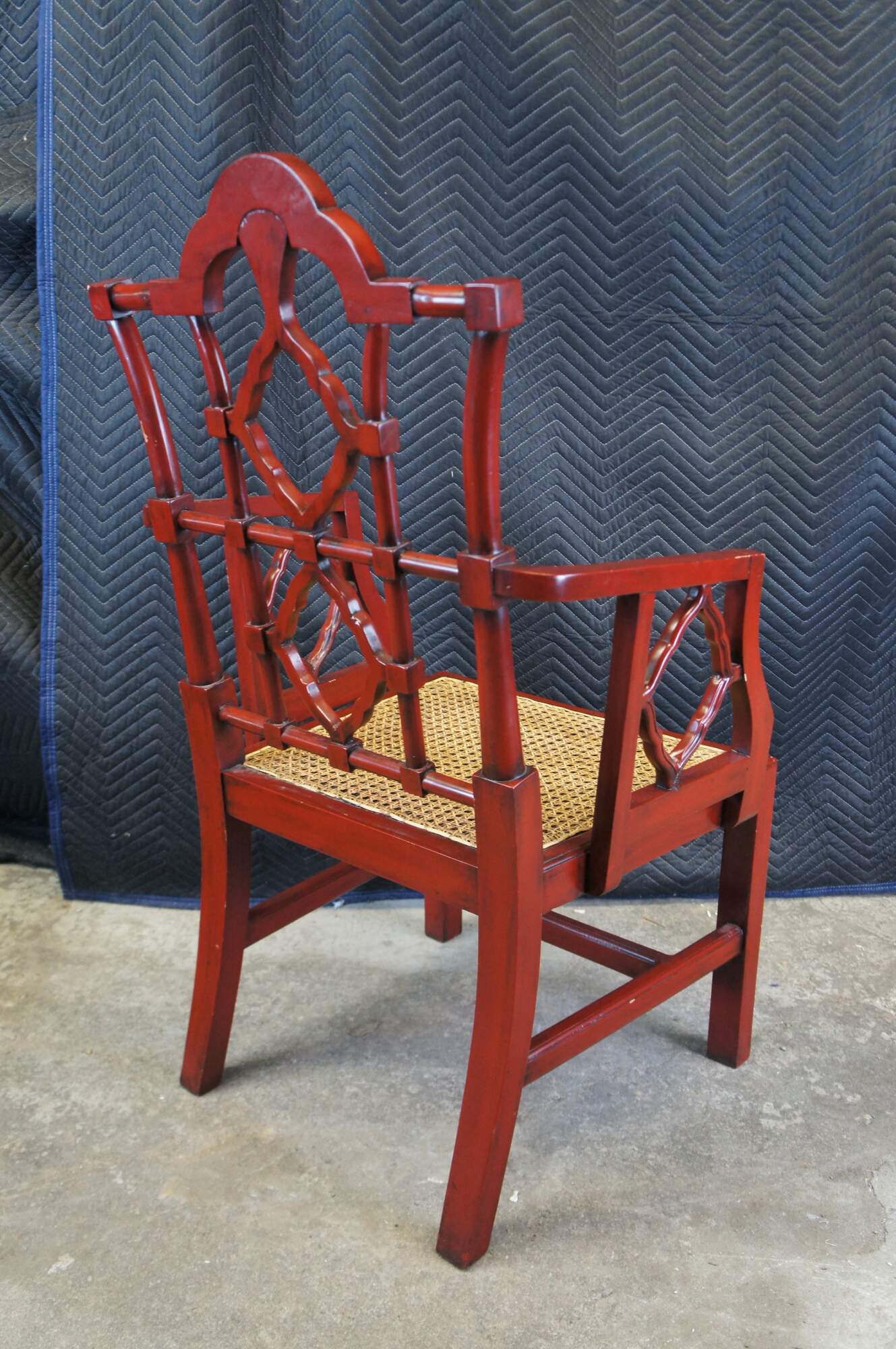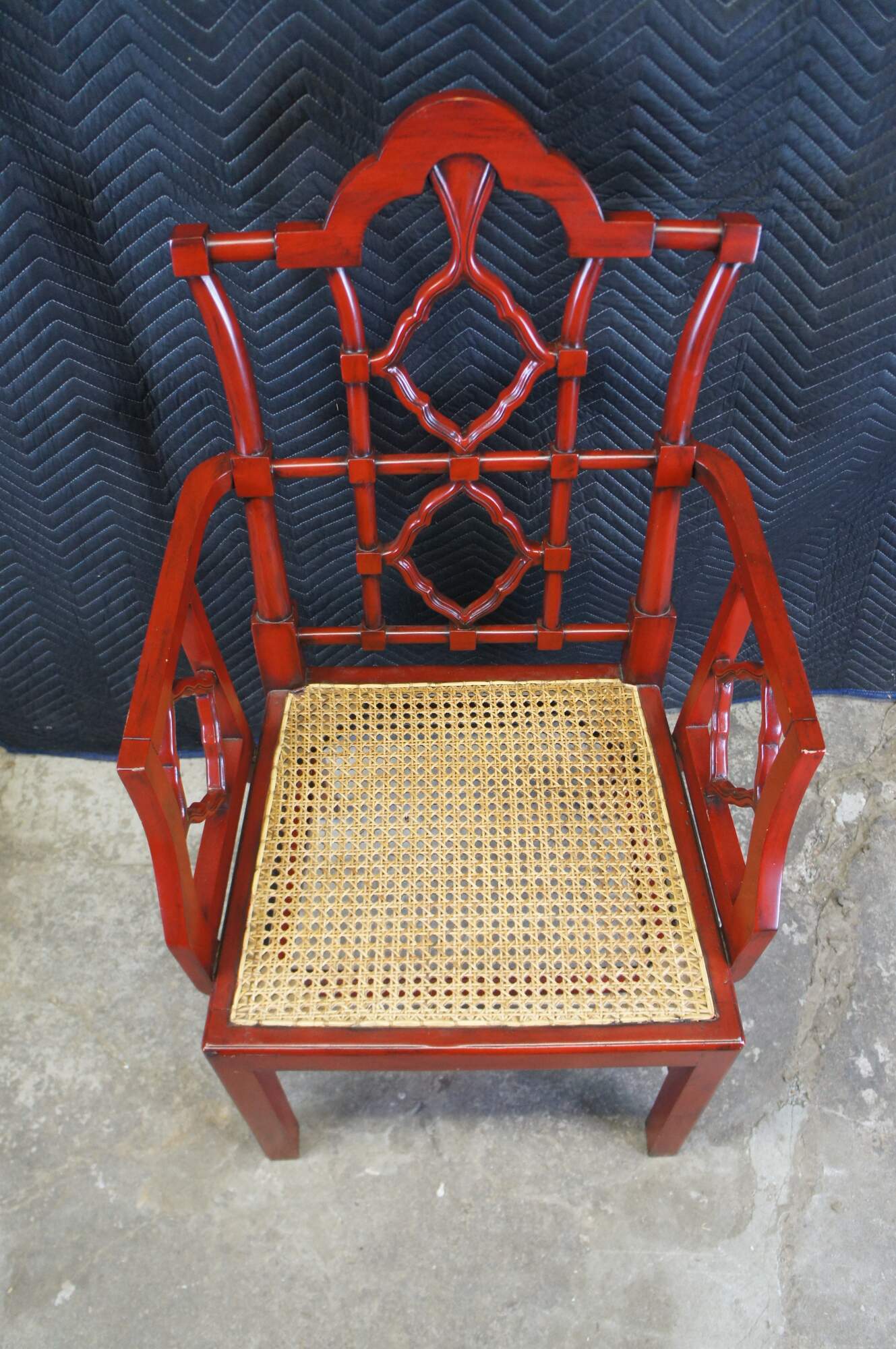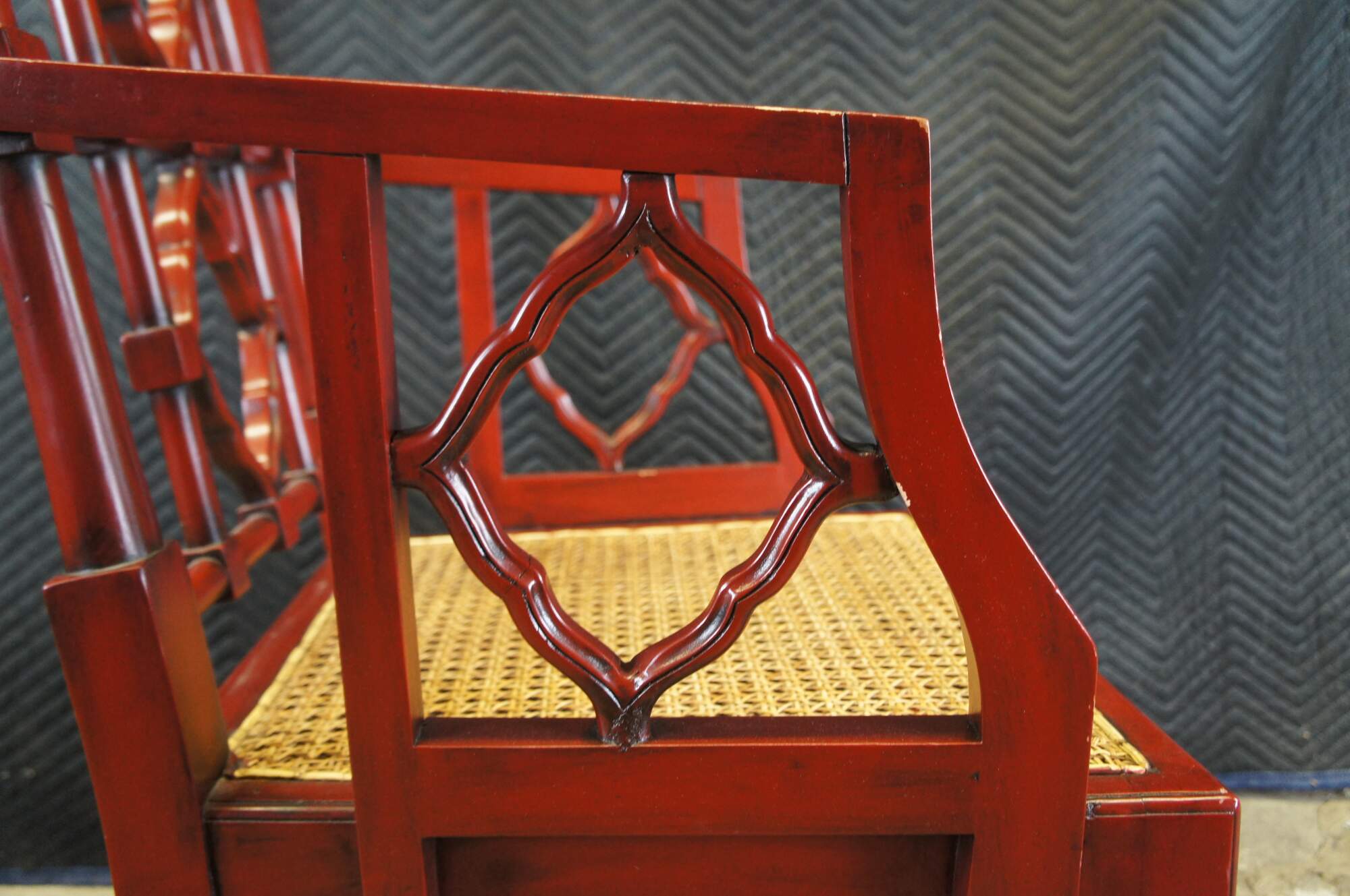 Two vintage Chinese Chippendale / Chinoiserie style arm chairs featuring a red lacquered finish with diamond shaped reticulated lattice back and arched crest rail, high arms and woven caned seats. Made in Indonesia.