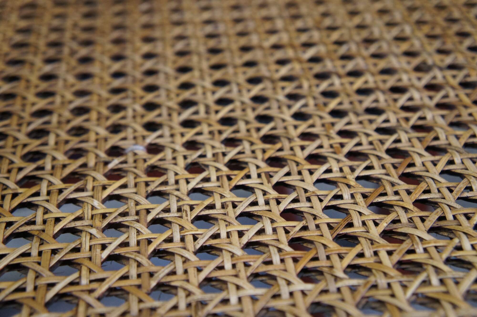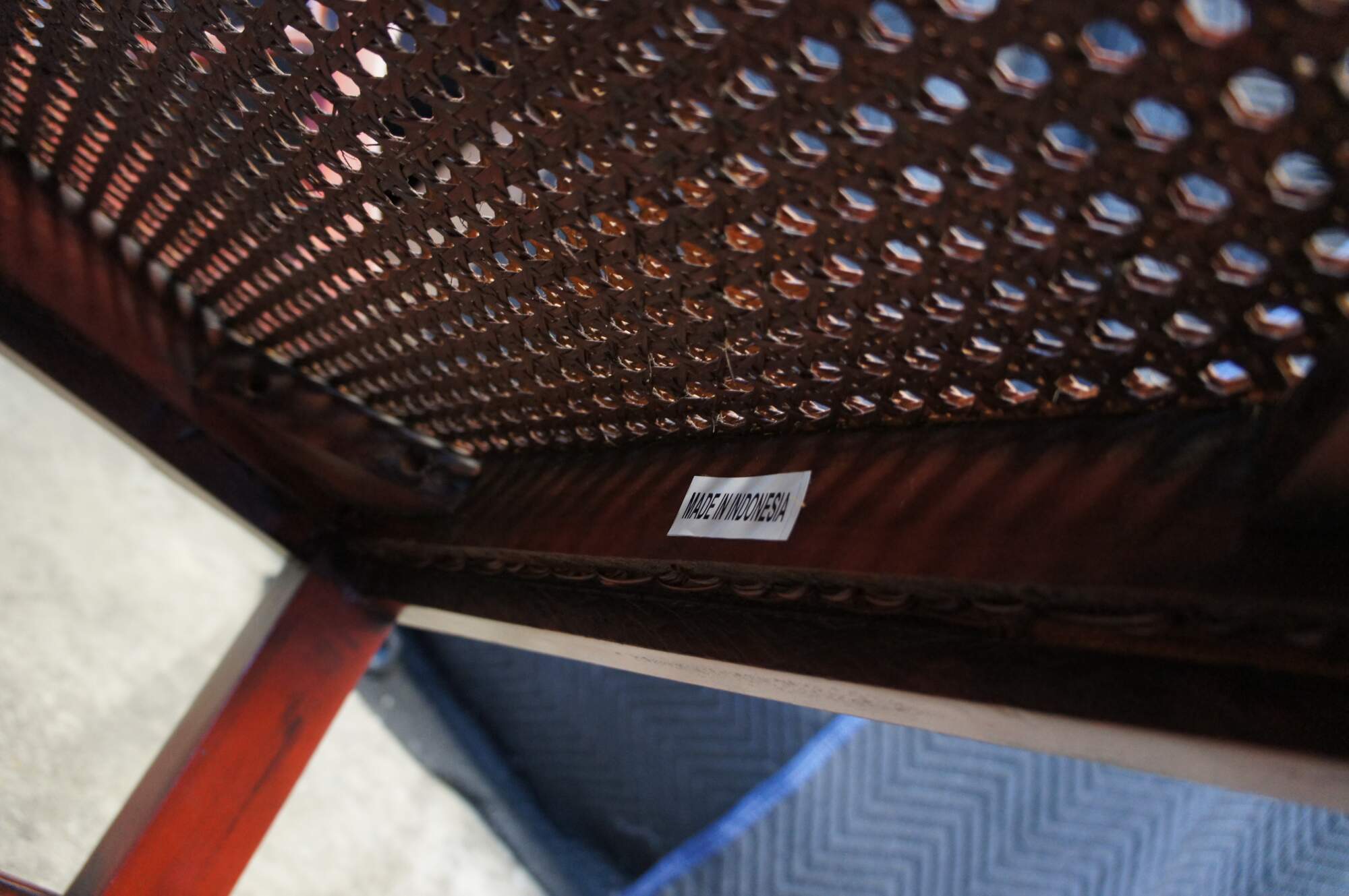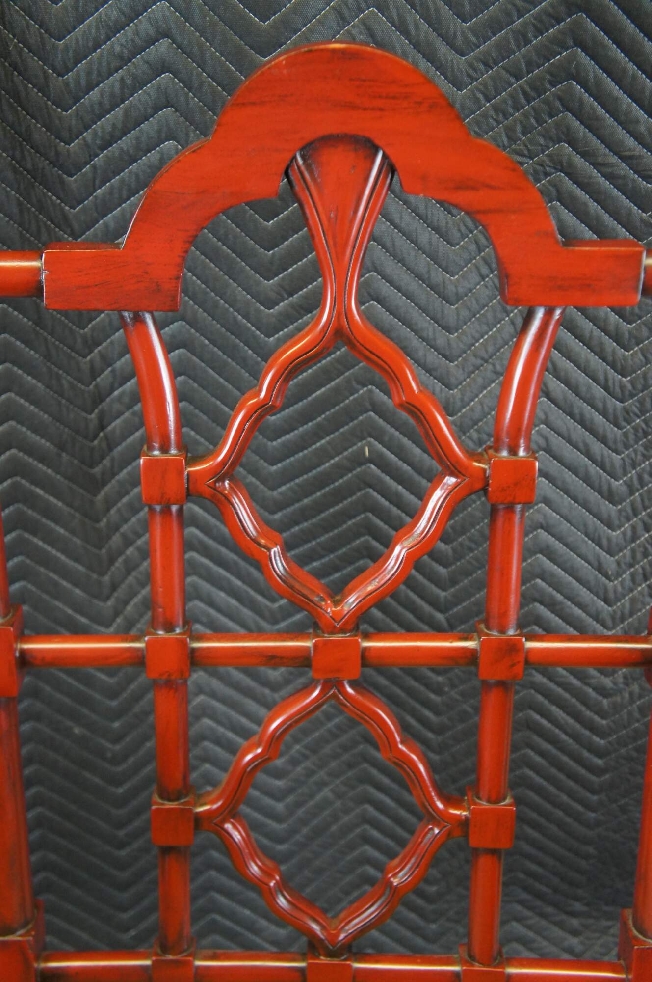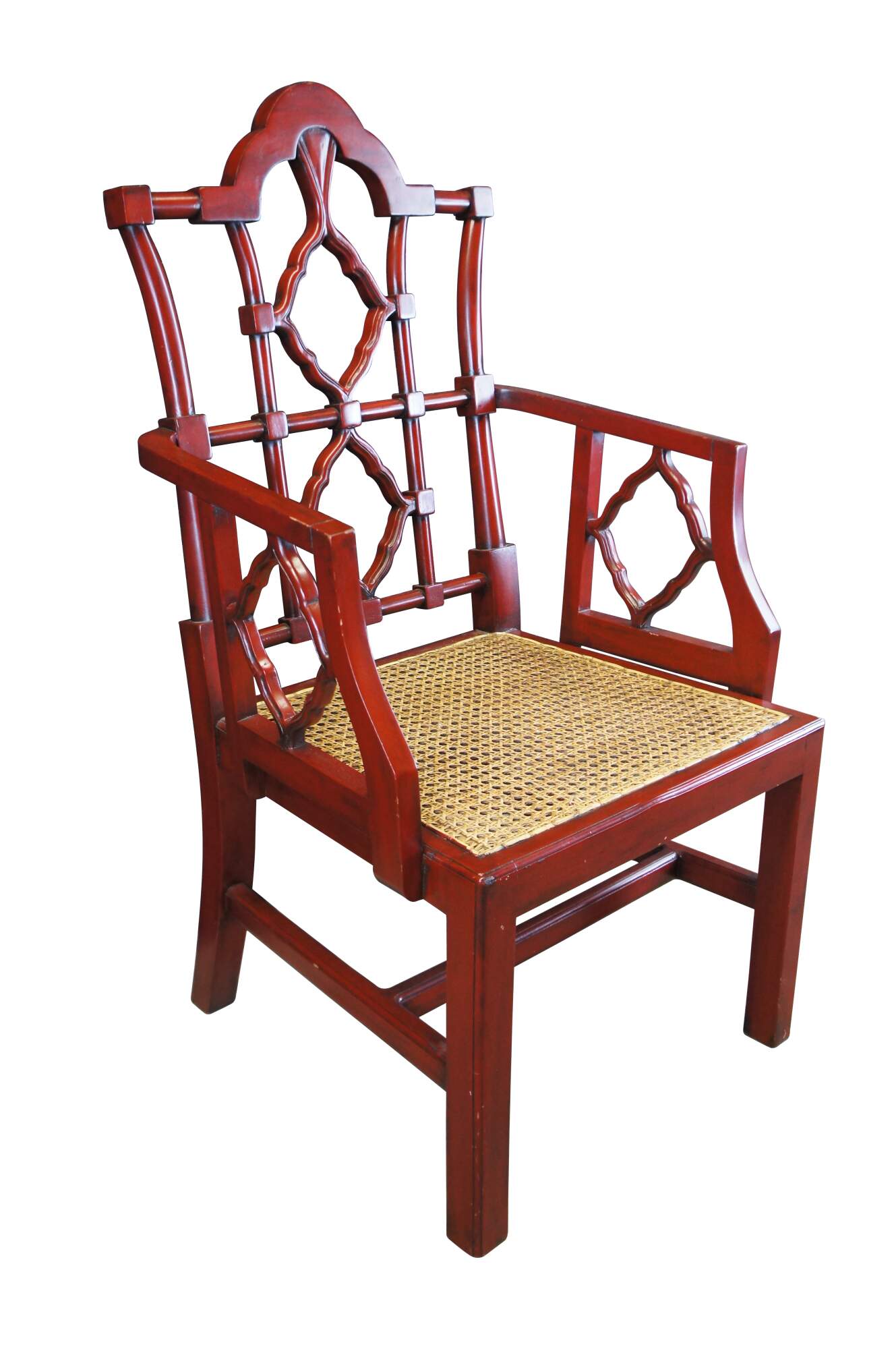 Two vintage Chinese Chippendale / Chinoiserie style arm chairs featuring a red lacquered finish with diamond shaped reticulated lattice back and arched crest rail, high arms and woven caned seats. Made in Indonesia.