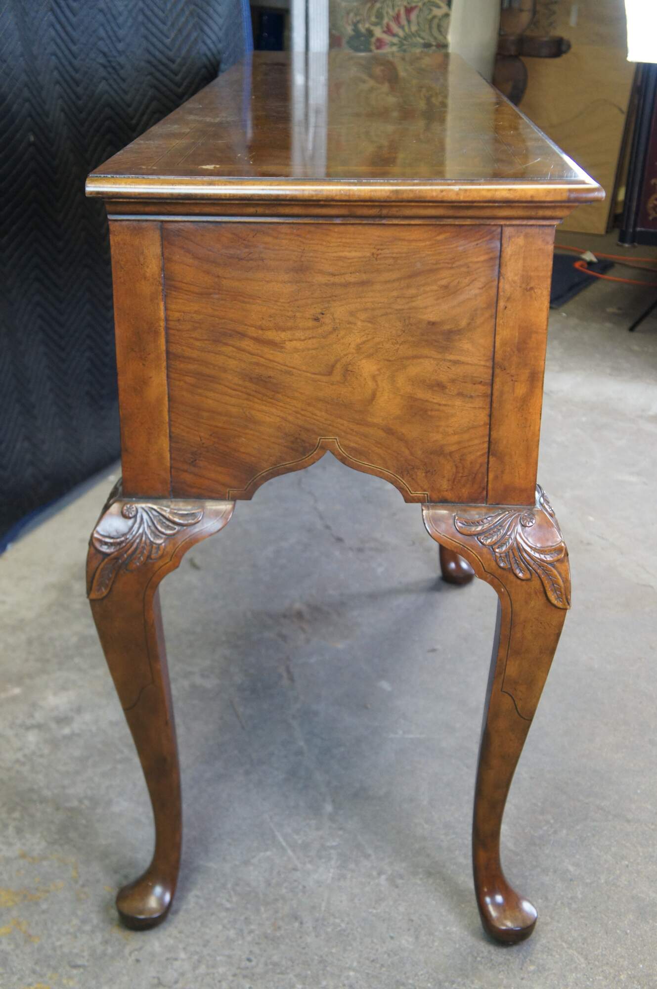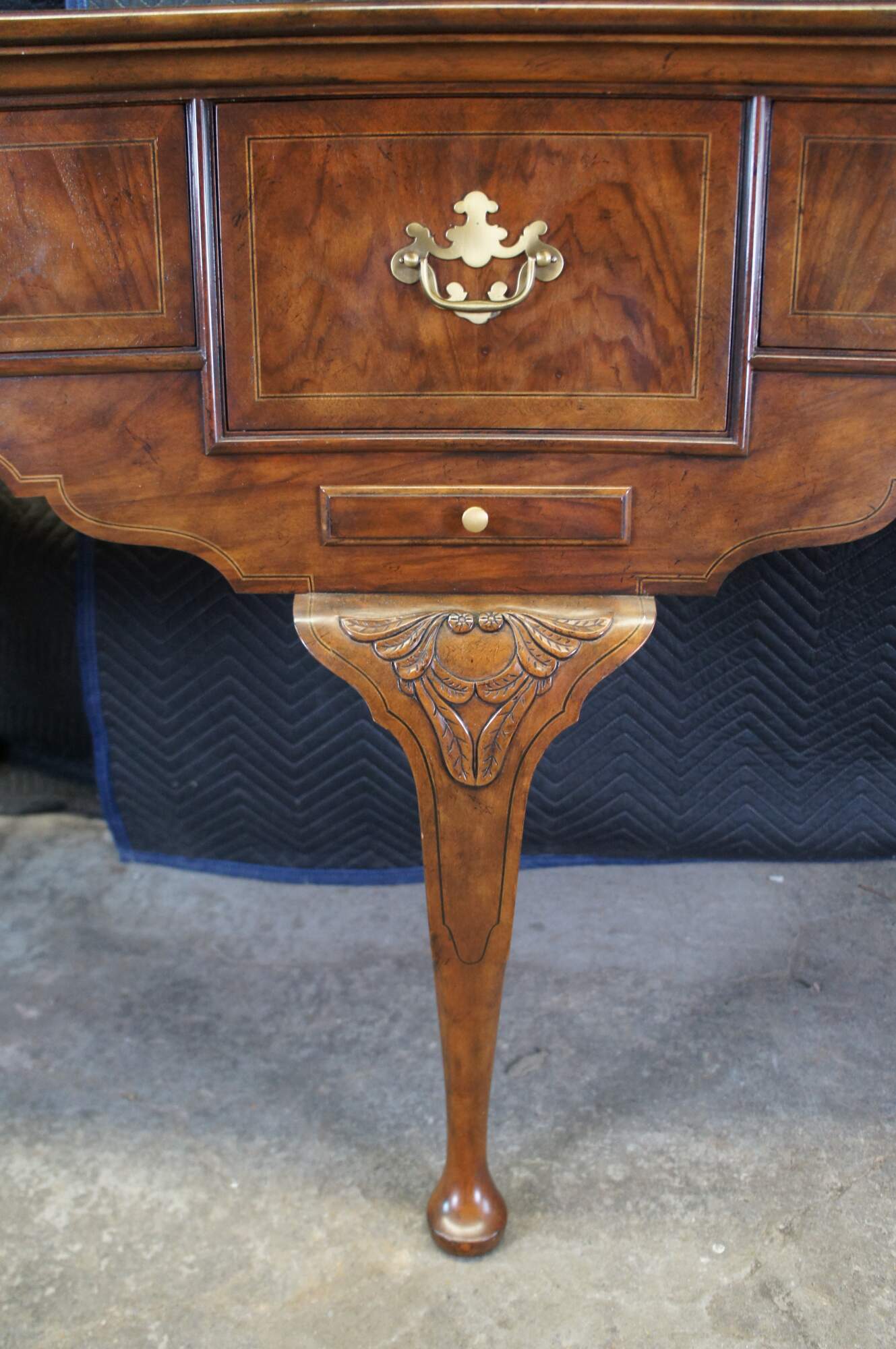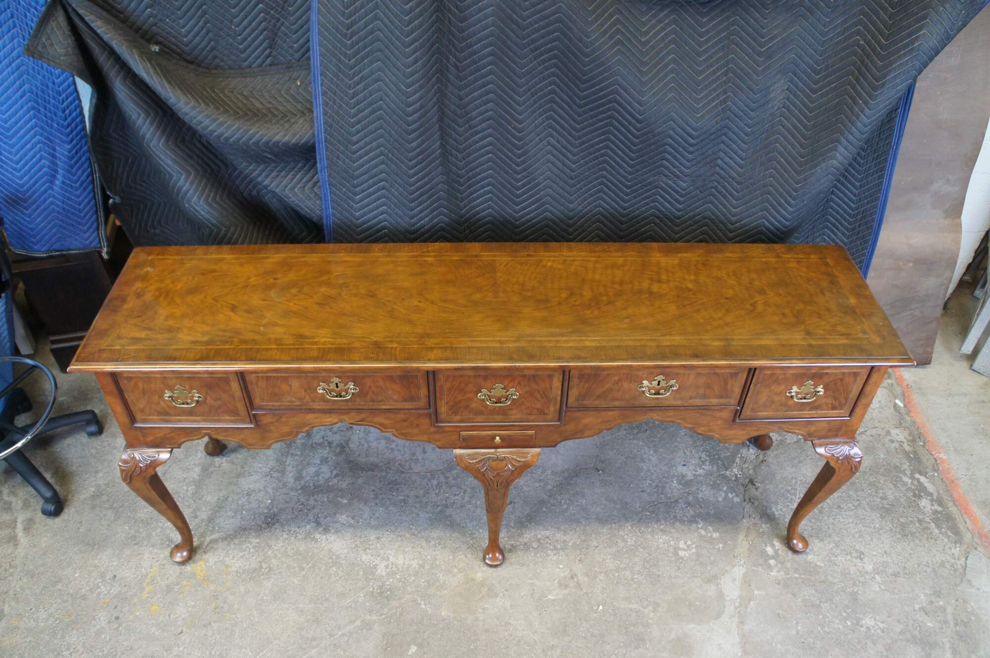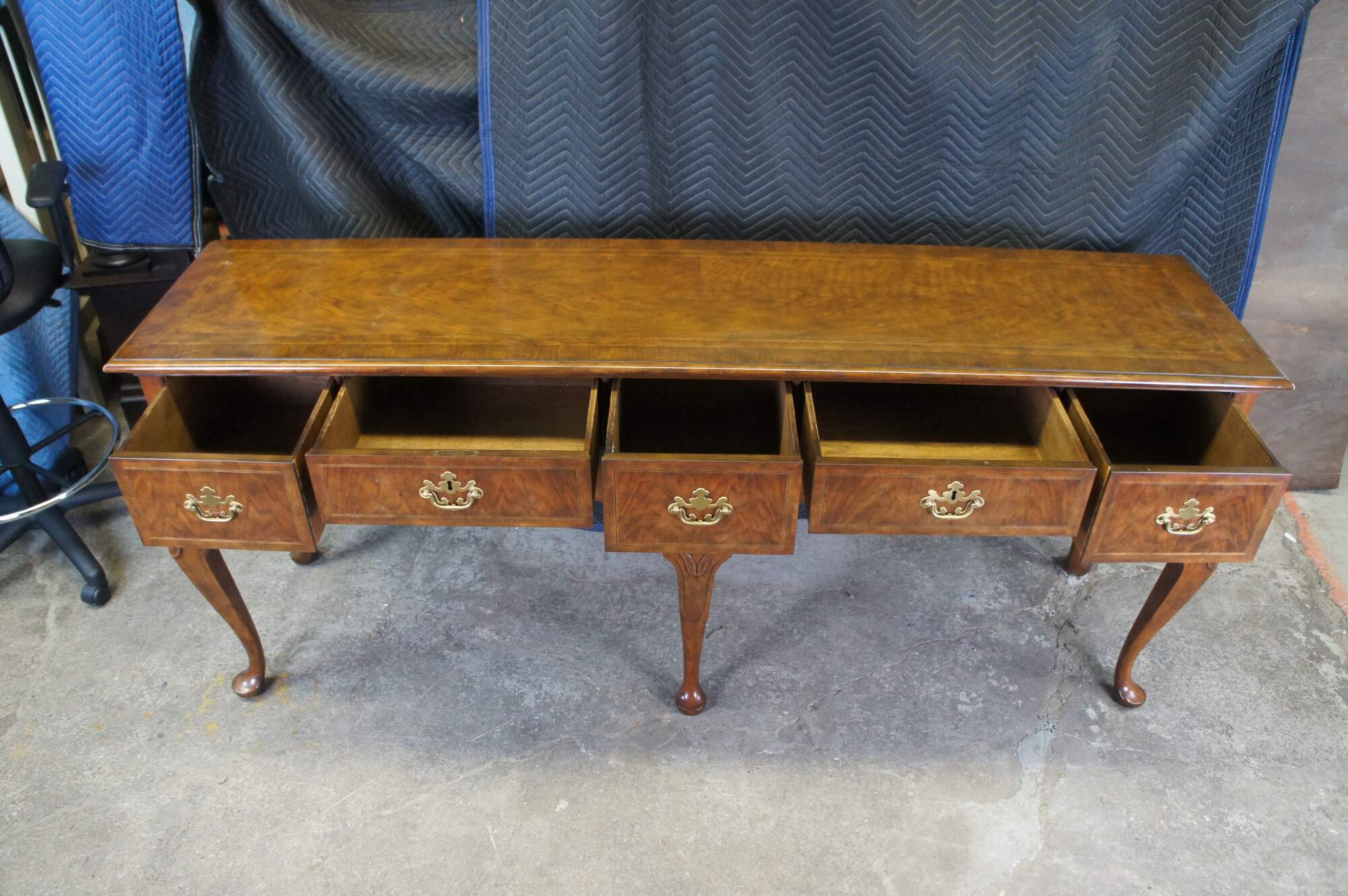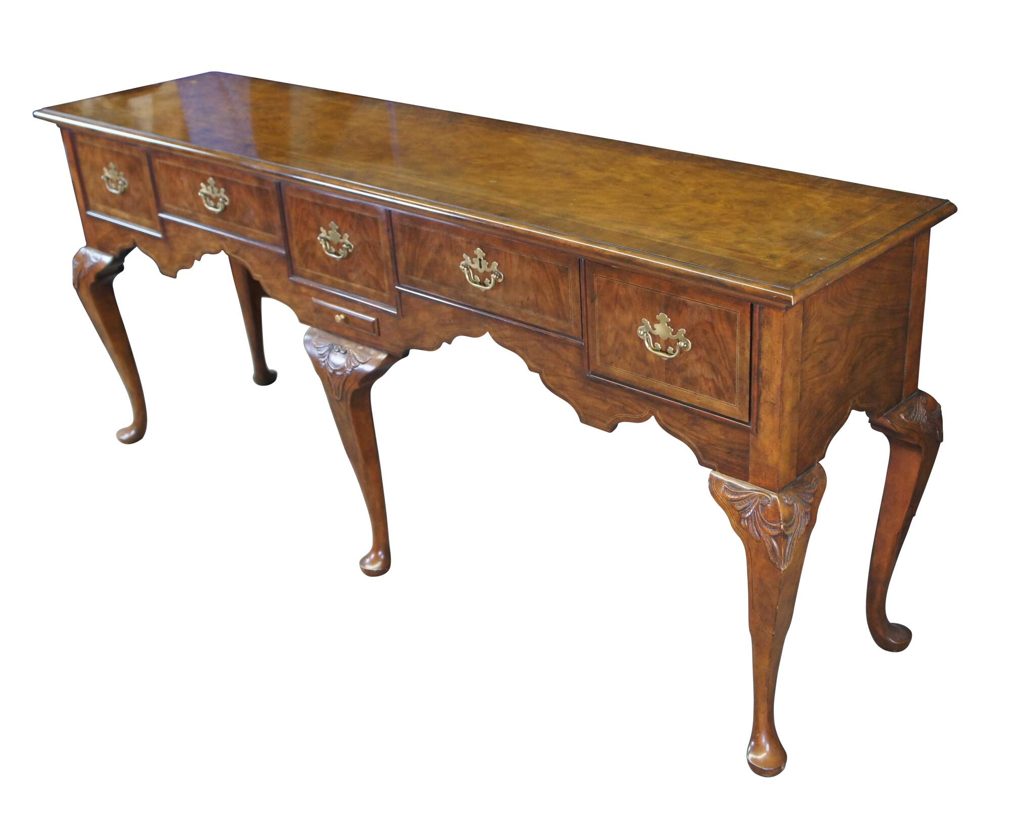 Vintage Baker Furniture Stately Homes Queen Anne sideboard / buffett / credenza / console / sofa table. Made of mahogany featuring rectangular form with five drawers and crossbanding with Herringbone and inlay. Cabriole legs with slipper feet and brass hardware.