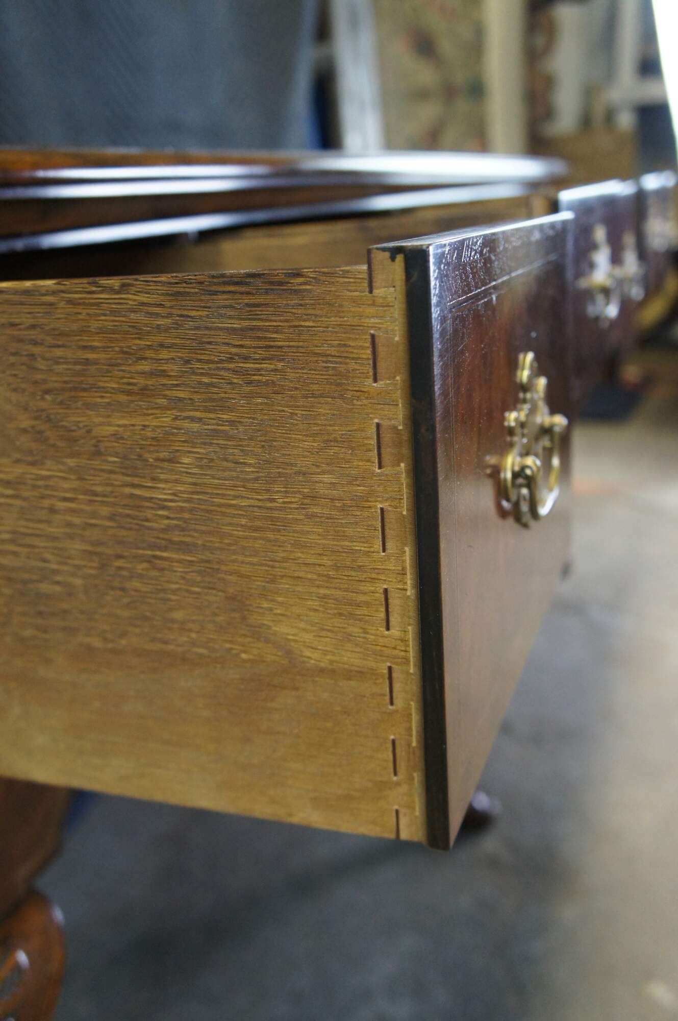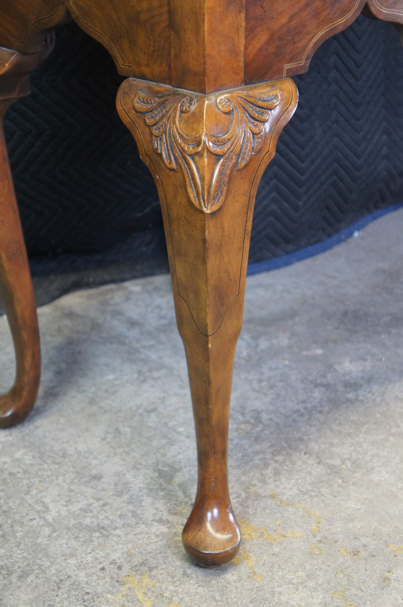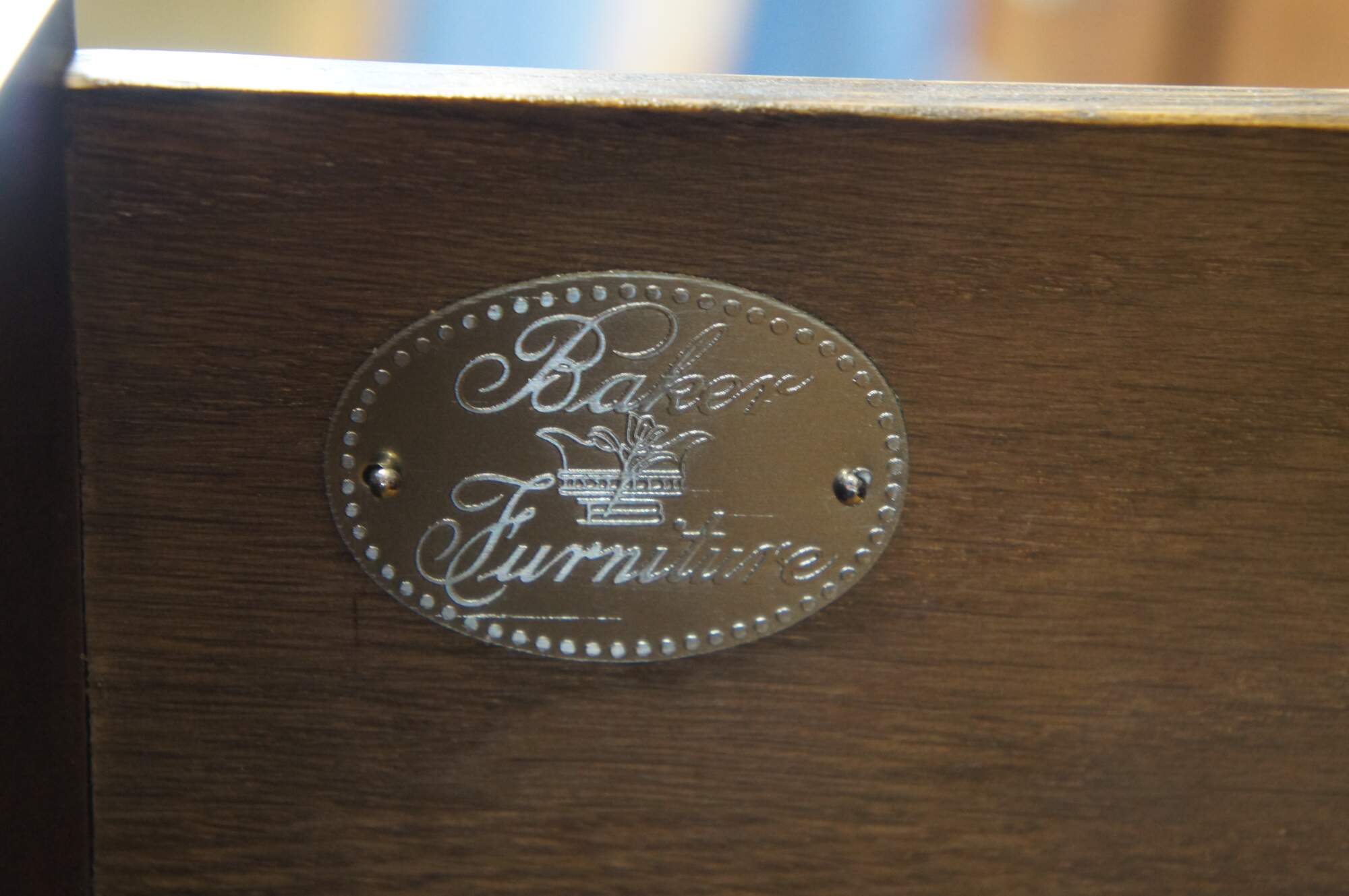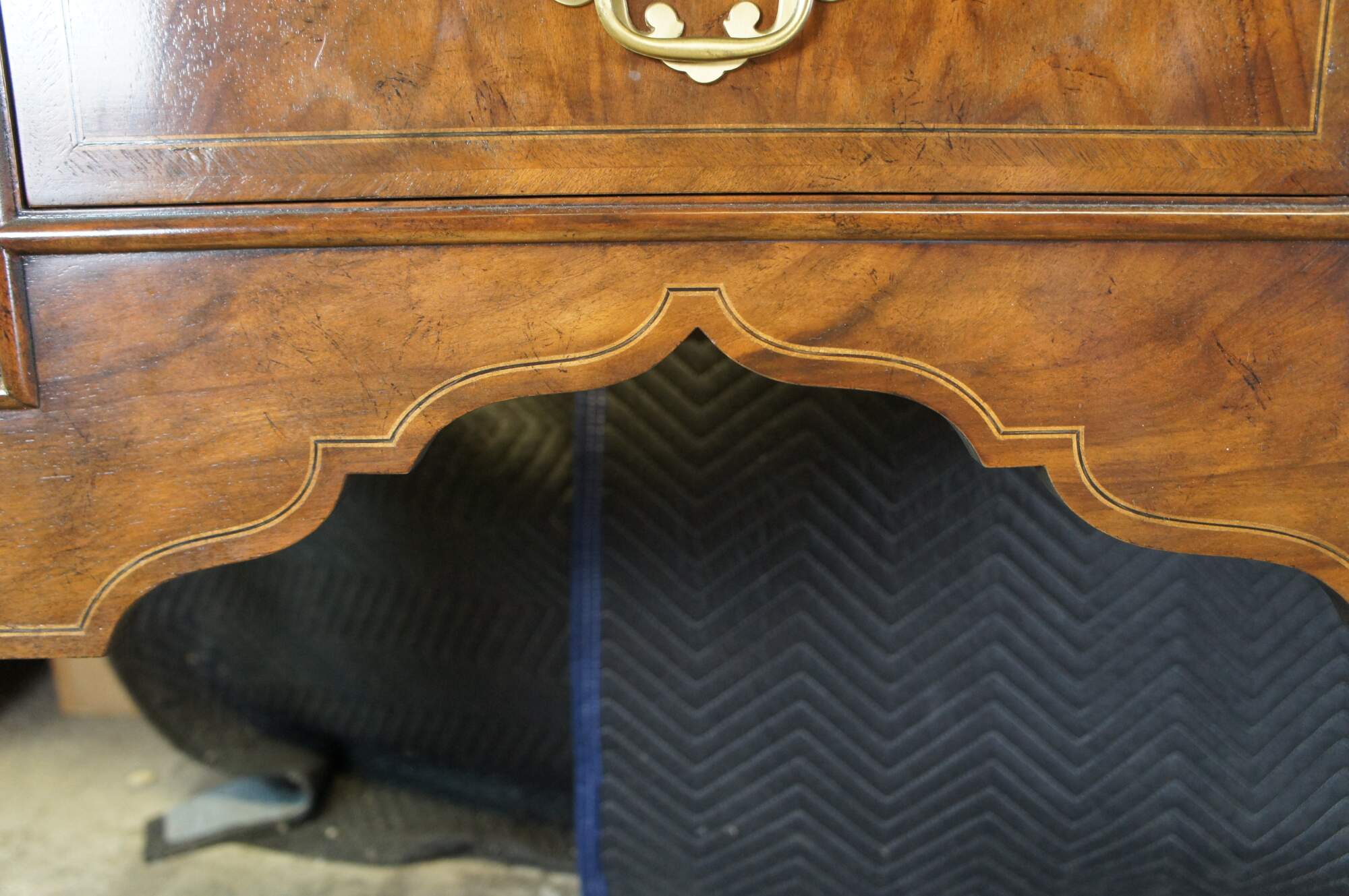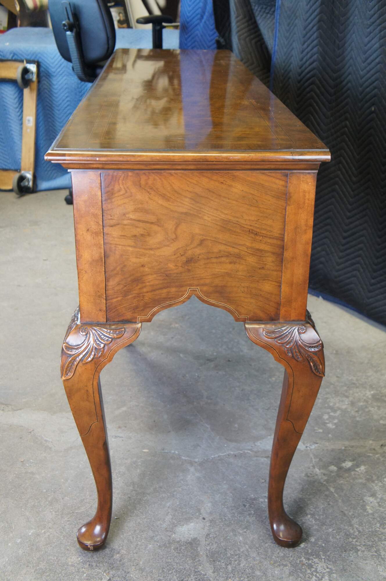 Vintage Baker Furniture Stately Homes Queen Anne sideboard / buffett / credenza / console / sofa table. Made of mahogany featuring rectangular form with five drawers and crossbanding with Herringbone and inlay. Cabriole legs with slipper feet and brass hardware.