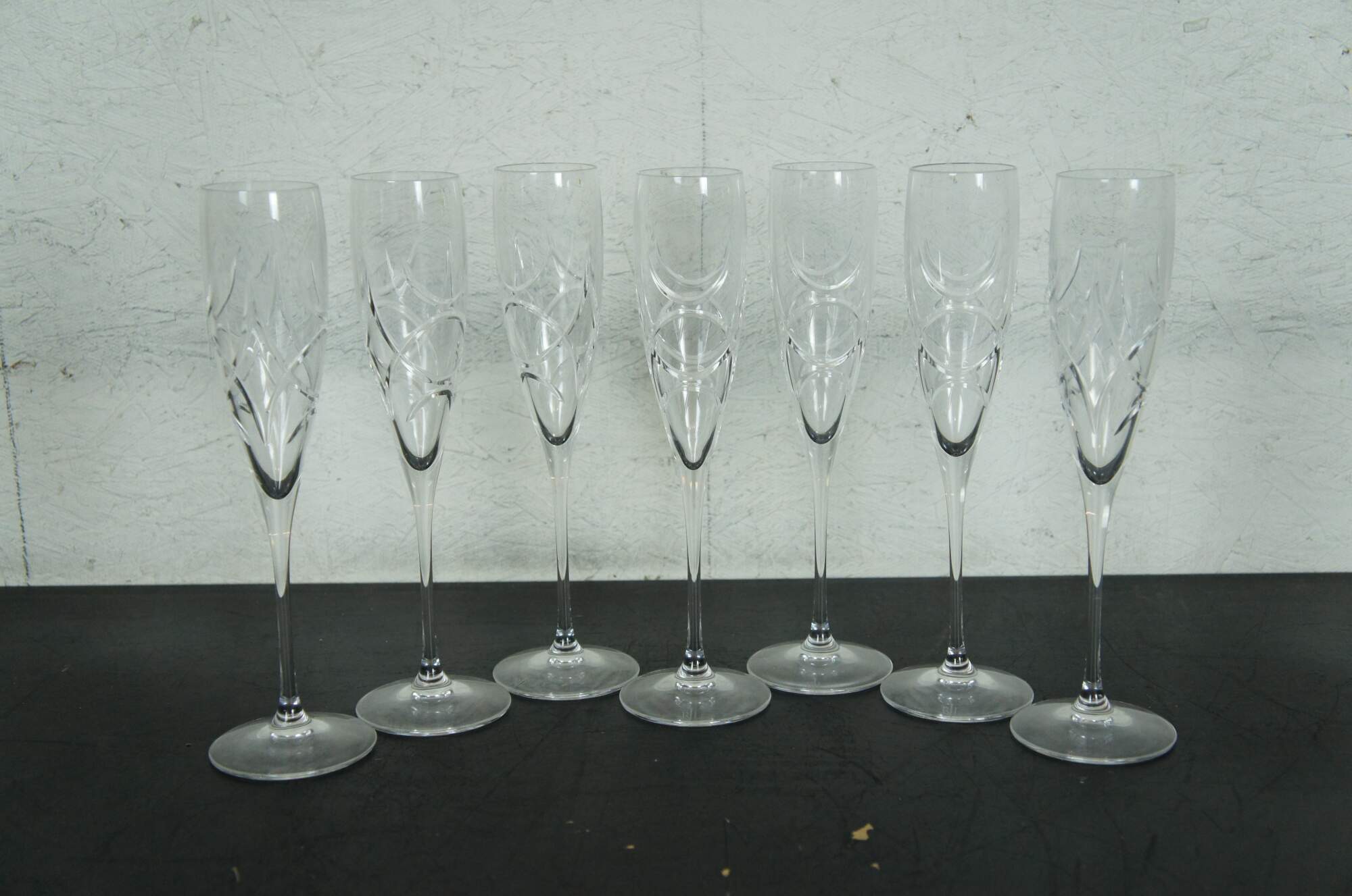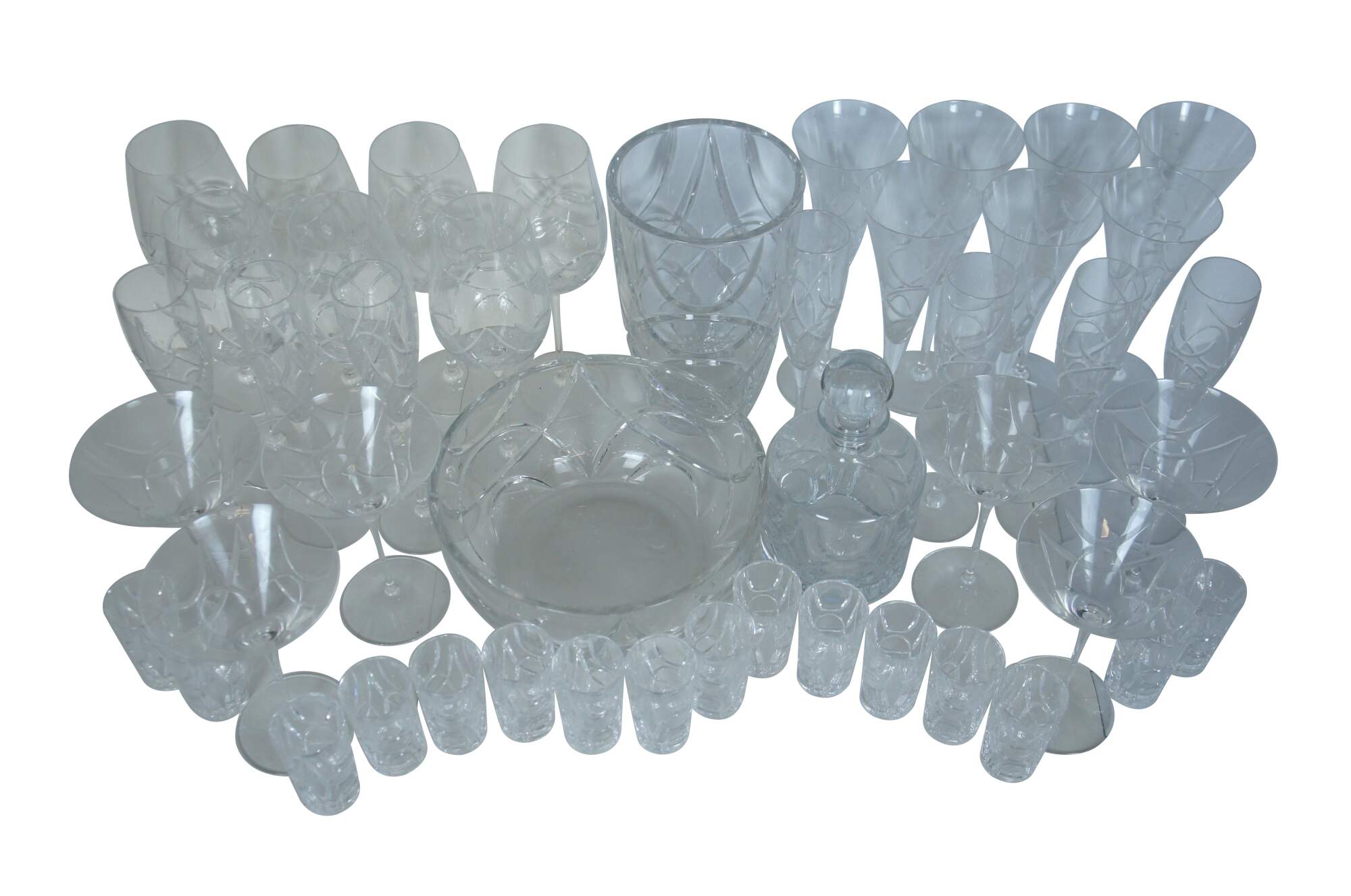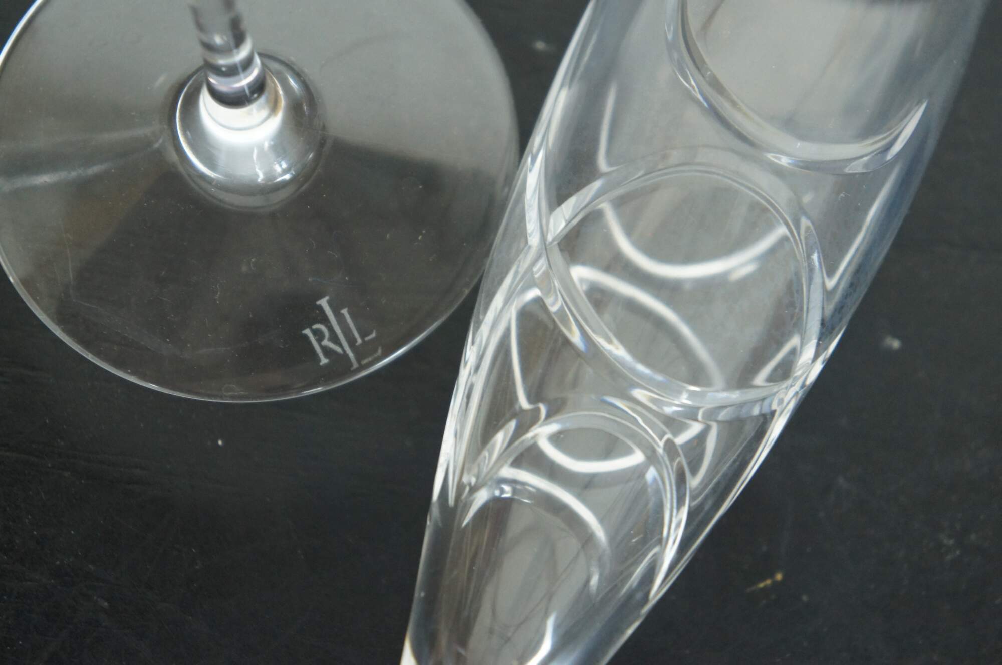 Late 20th century 46 piece lot of Ralph Lauren cut crystal barware / glassware in the Royalton pattern. Lot includes: whiskey decanter with stopper, vase, round bowl, 16 shot glasses, 7 wine glasses, 7 trumpet champagne flutes, 7 standard champagne flutes, and 6 martini glasses. Retired design. Marked on base.