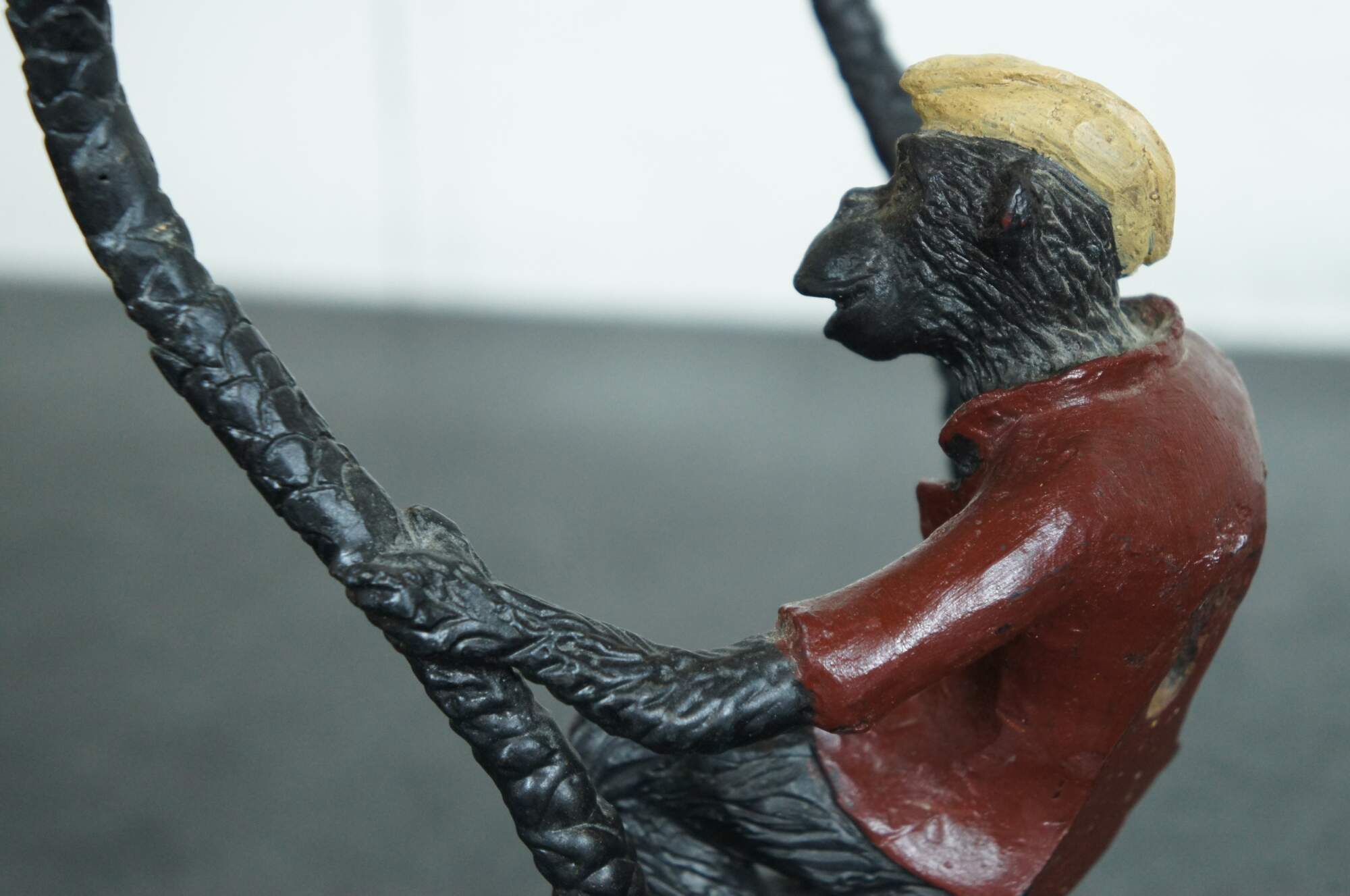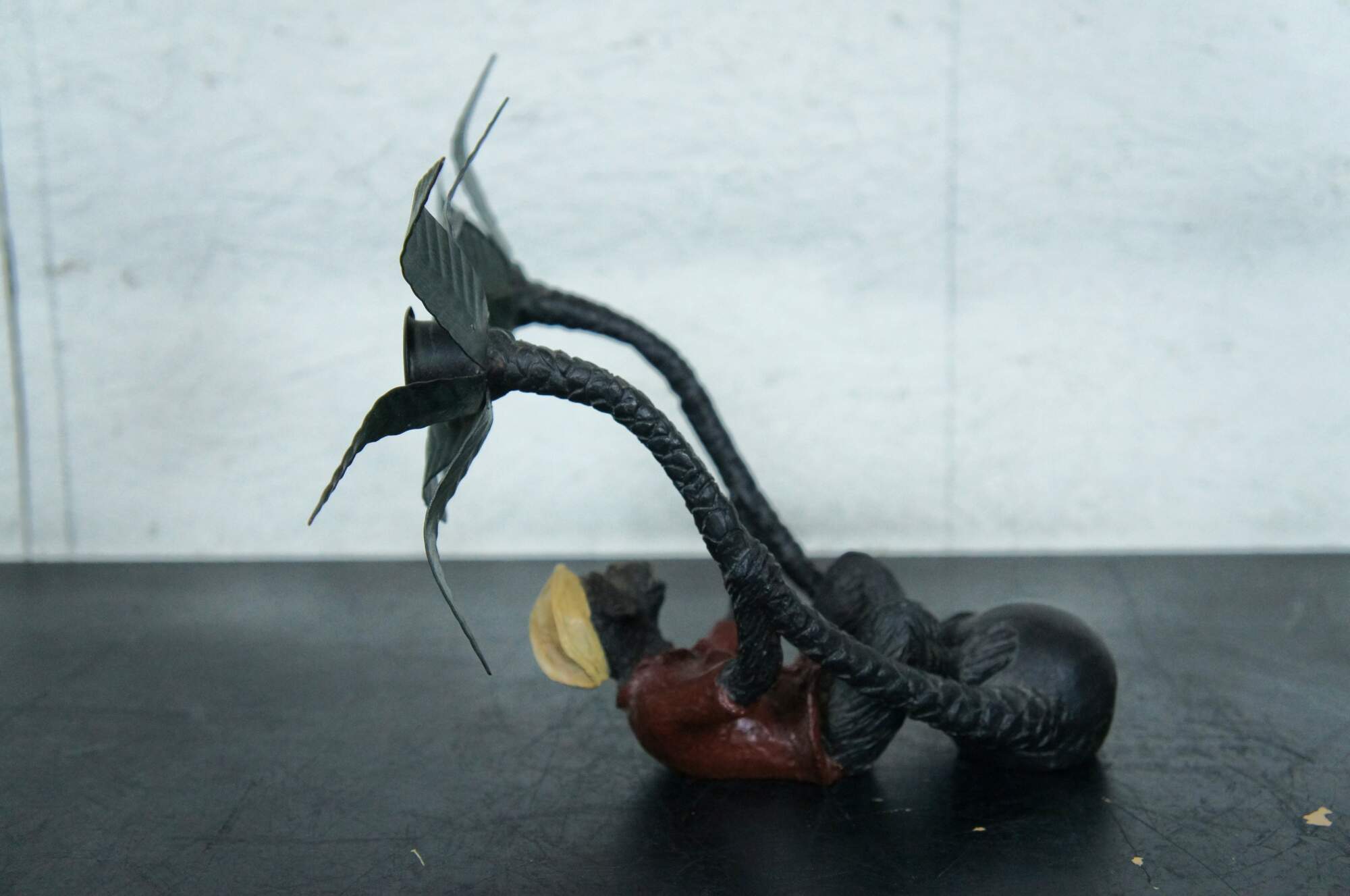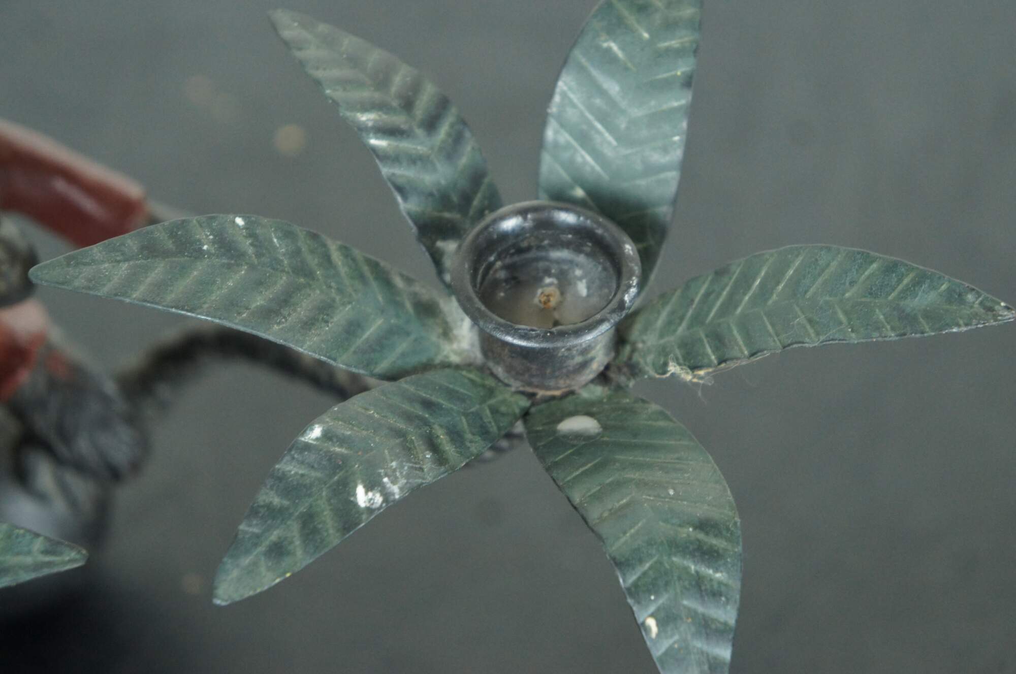 Vintage cast metal wall hanging sconce, featuring a monkey wearing a red jacket and yellow hat, perched on a ball between a pair of palm trees, the tops of which hold a single taper candle.