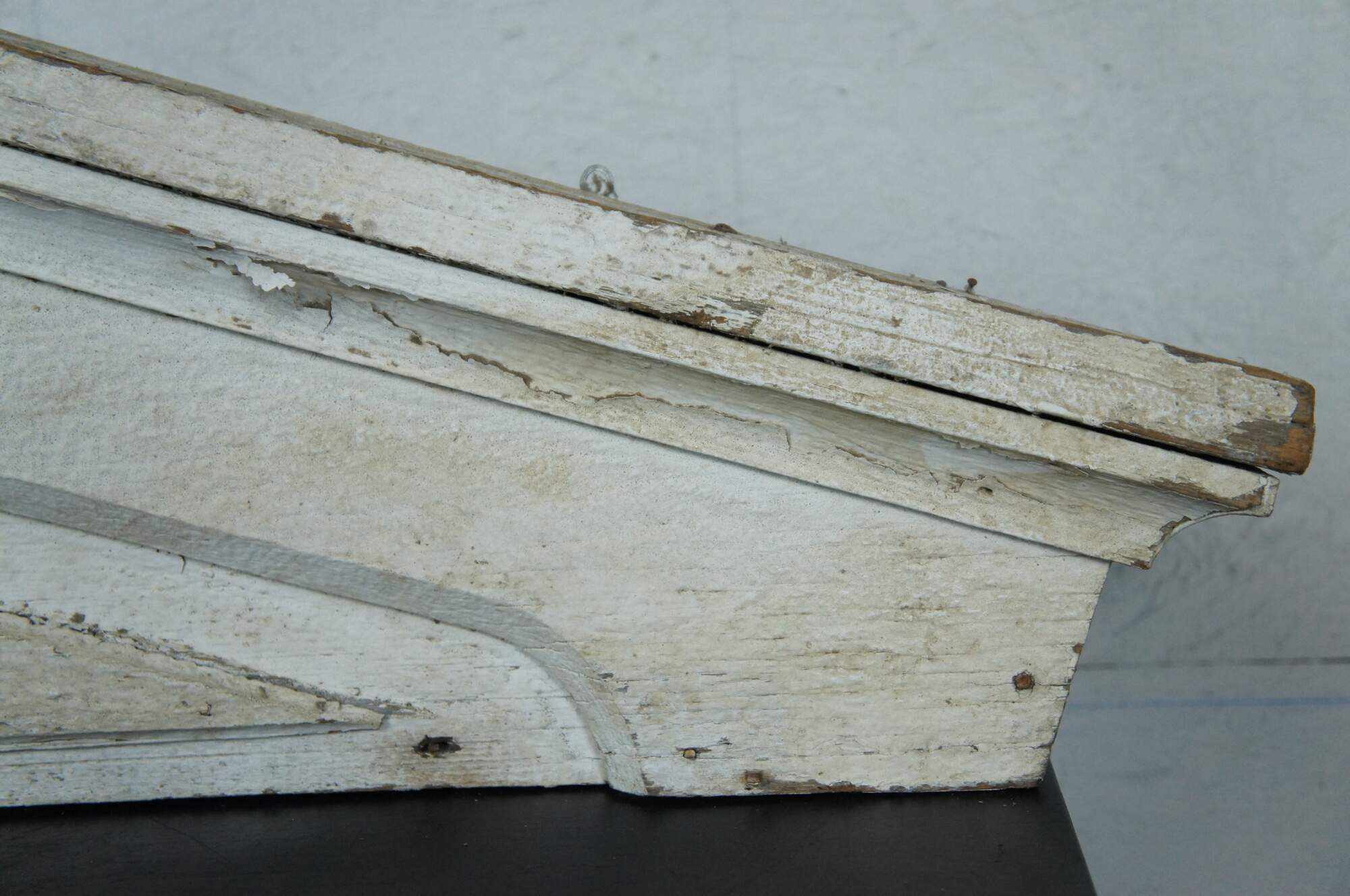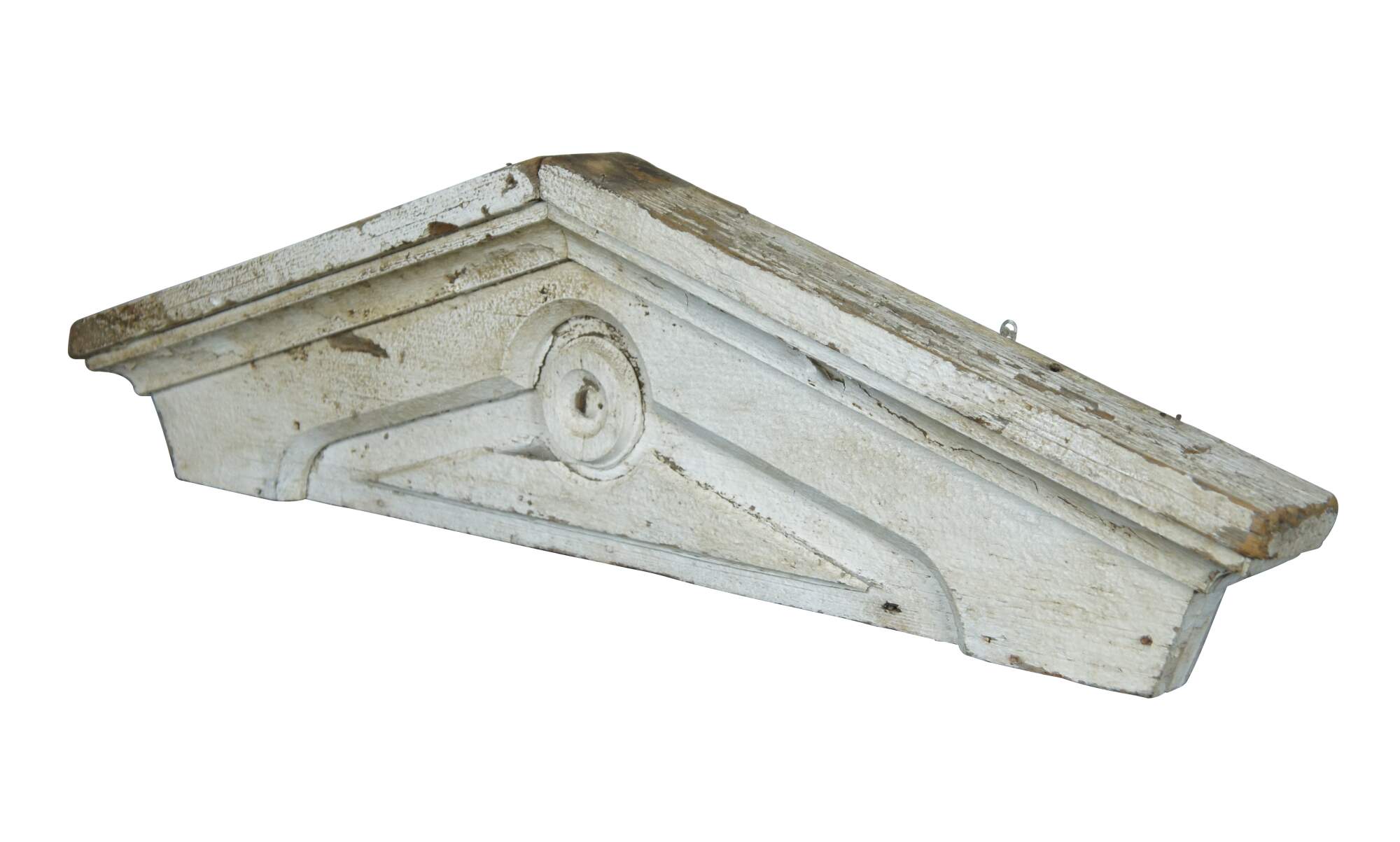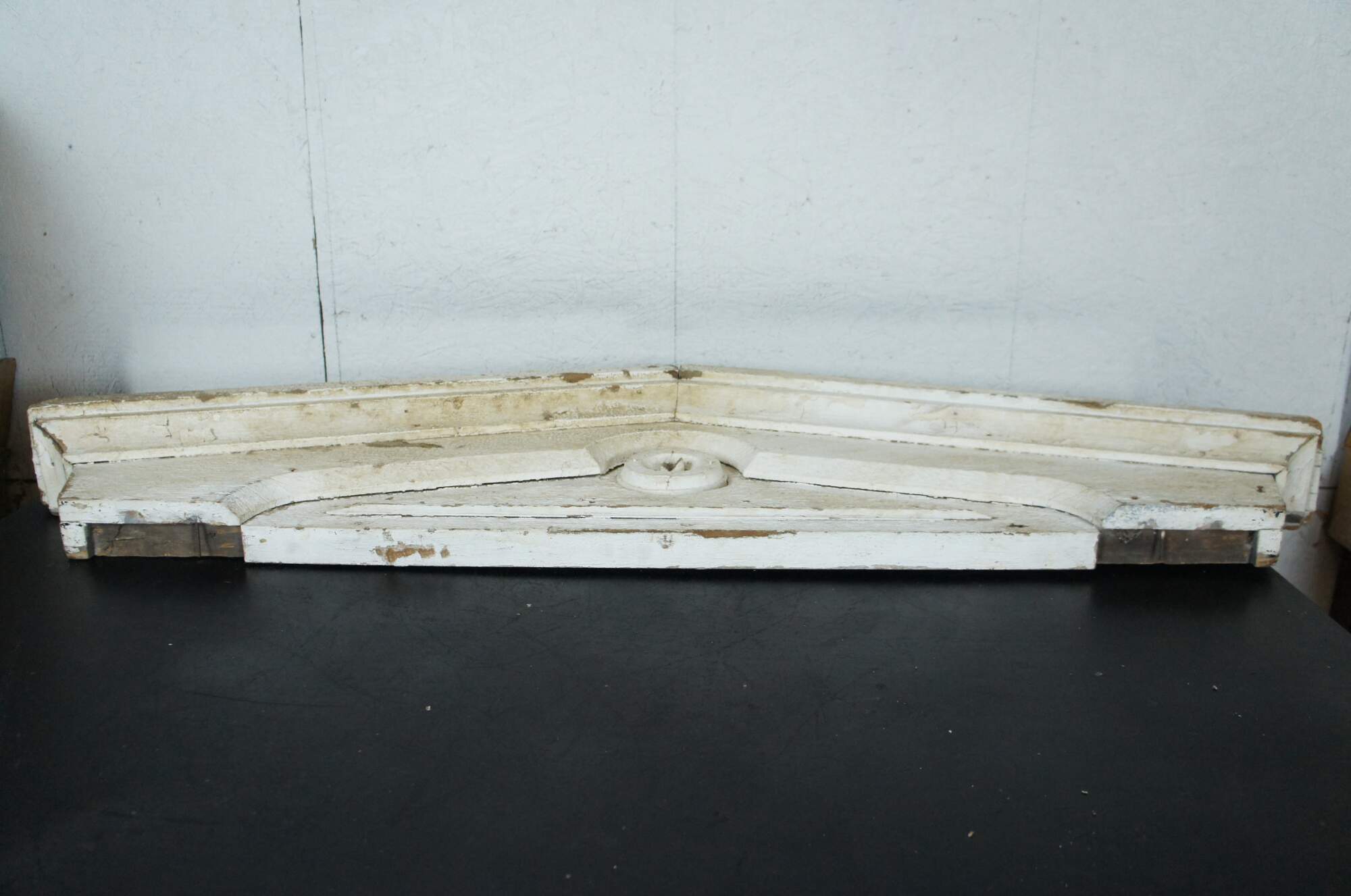 Antique Victorian architectural salavaged wooden farmhouse window or door pediment, lintel or header. Painted white; simple peaked design with beveled bulls eye detail. Fitting with two hooks for wall display.