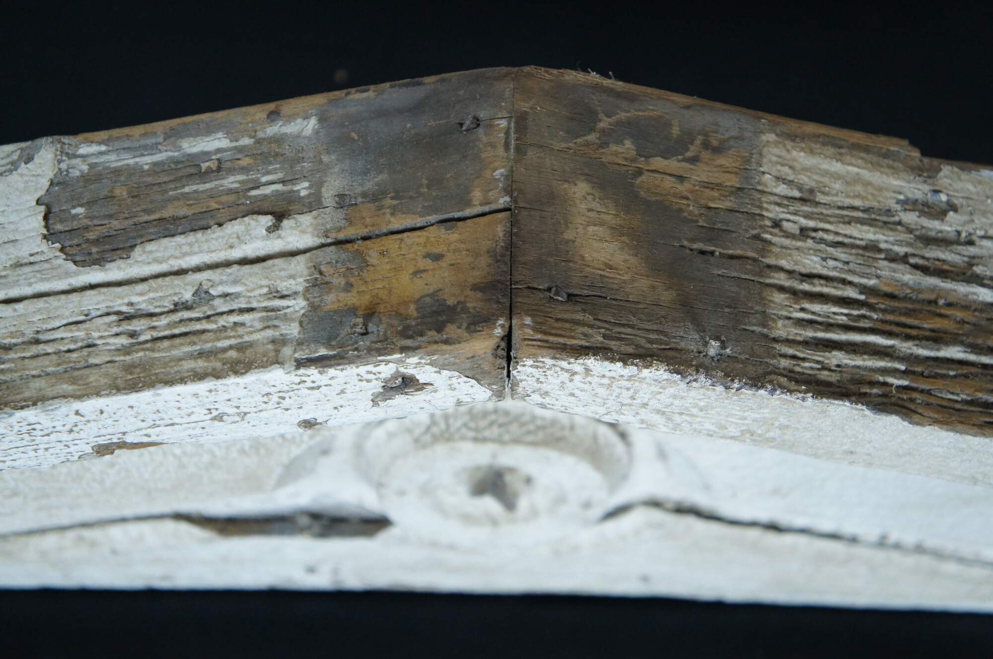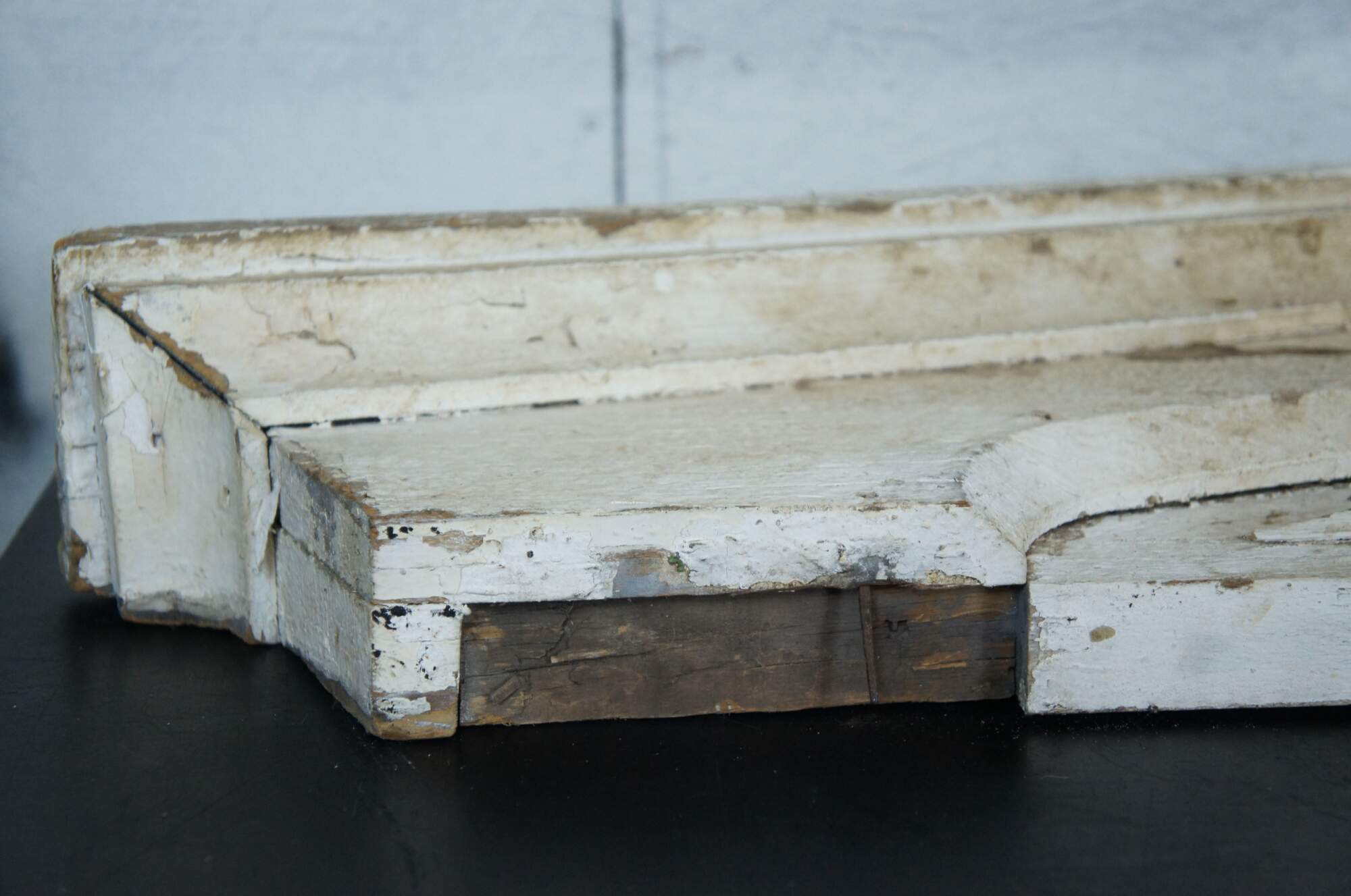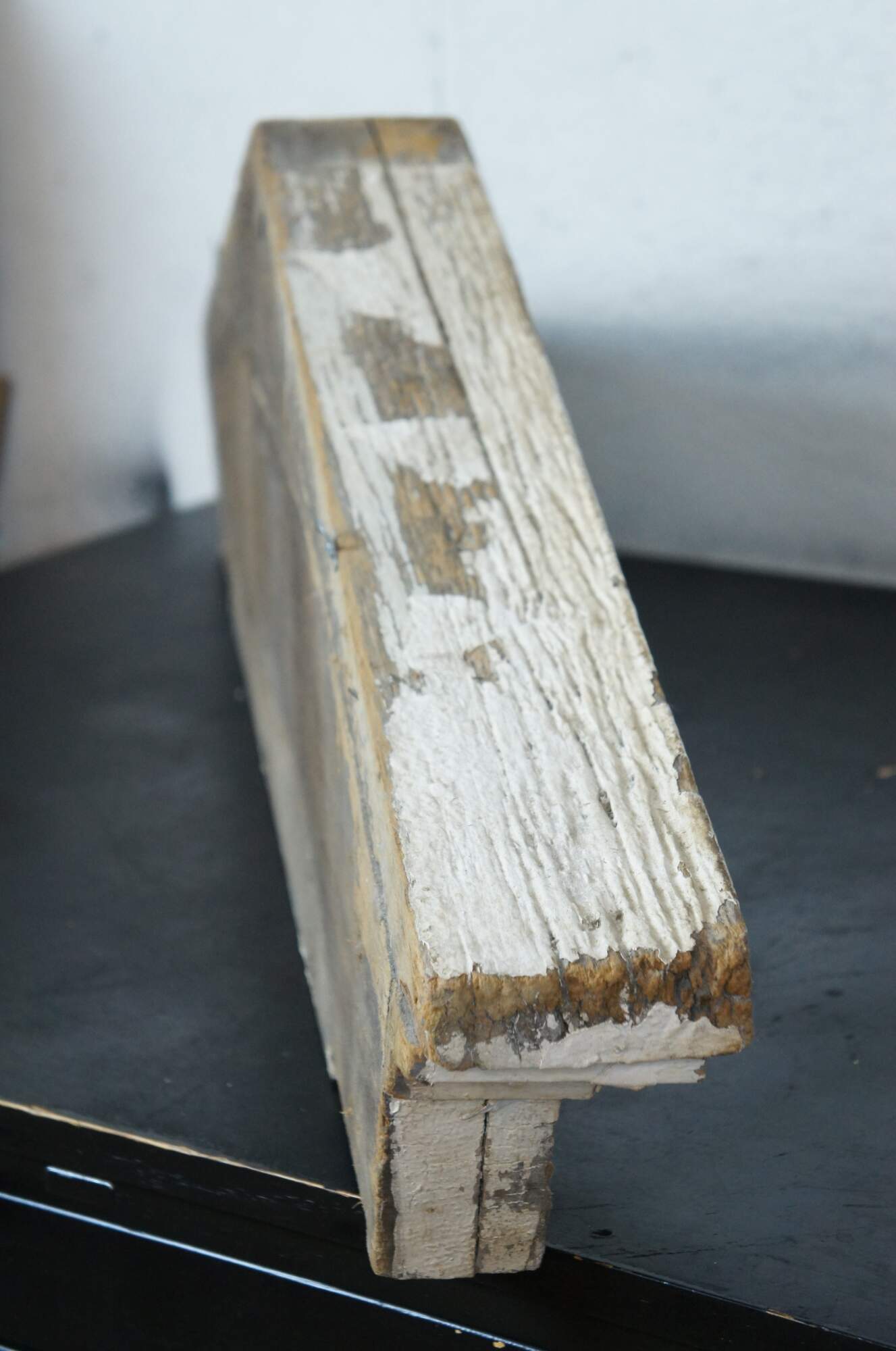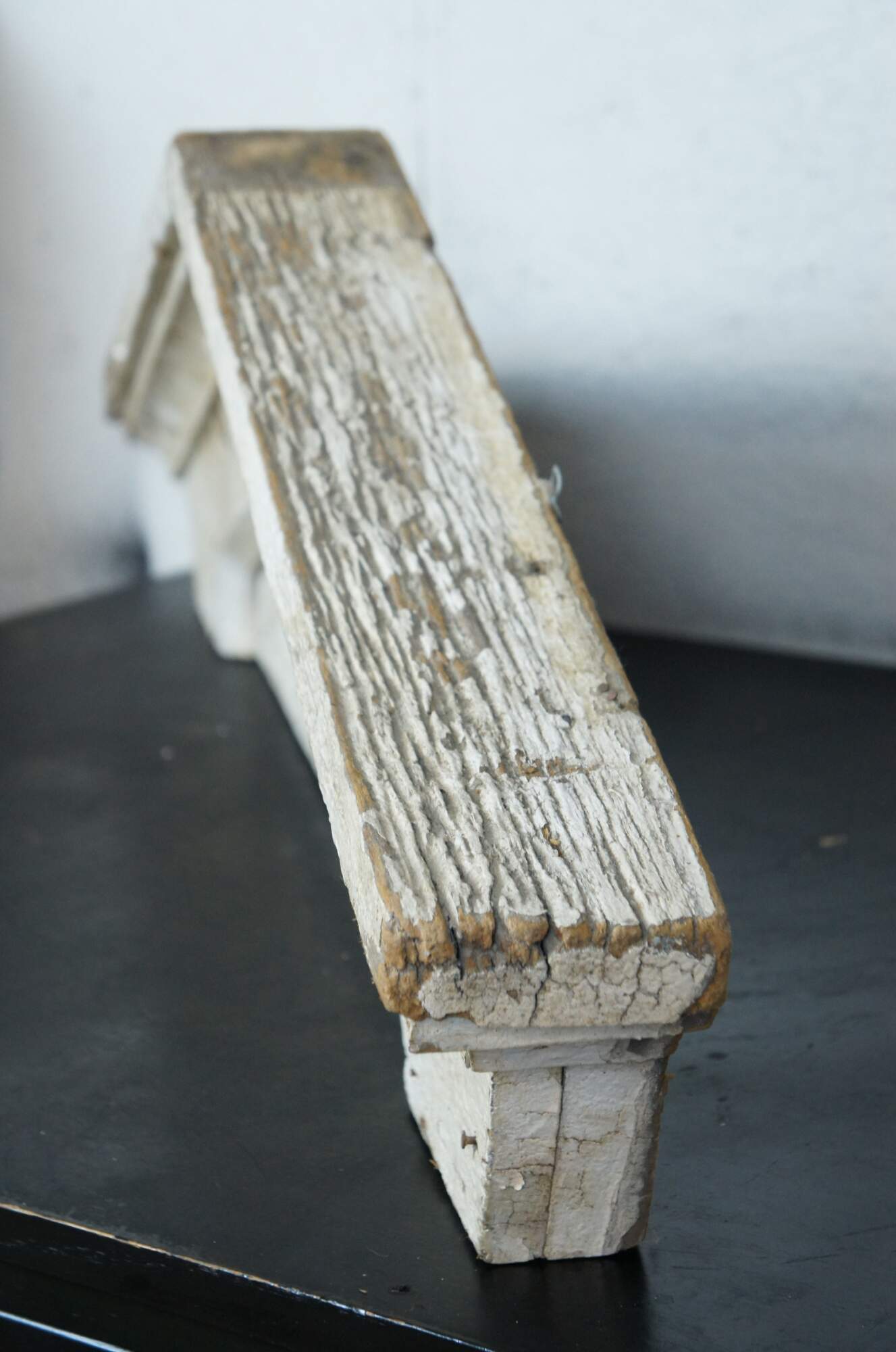 Antique Victorian architectural salavaged wooden farmhouse window or door pediment, lintel or header. Painted white; simple peaked design with beveled bulls eye detail. Fitting with two hooks for wall display.