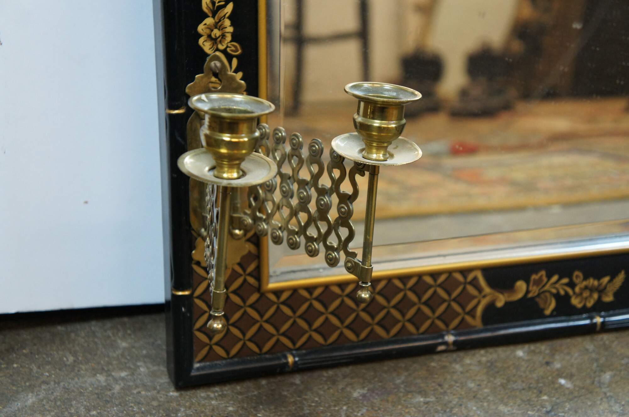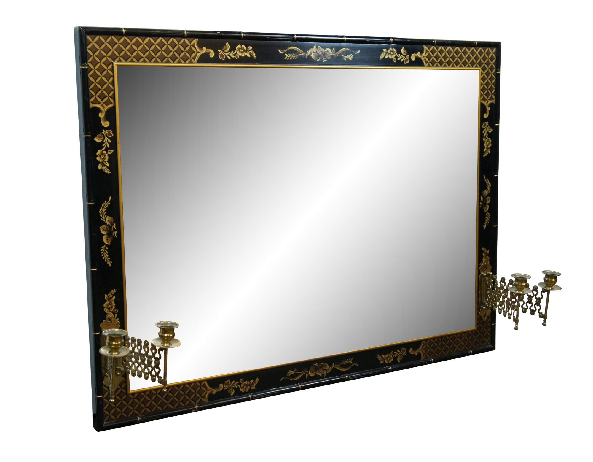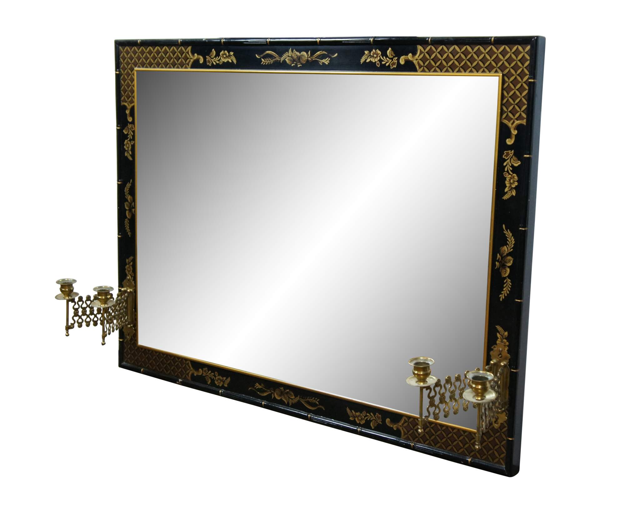 Mid century circa 1963 over mantel wall vanity mirror by Drexel Heritage (Et Cetera Collection). Features a rectangular form with faux baboo edge, painted in black and gold with a Chinoiserie floral and fruit design with lattic corners. Each side is mounted with a pair of swing arm articulating accordion single-taper candlesticks. Beveled glass. Back marked 63 43-215. Drexel Heritage Furnishings Inc - 104035 - Merlene Yates -Inspector, Plant 33.