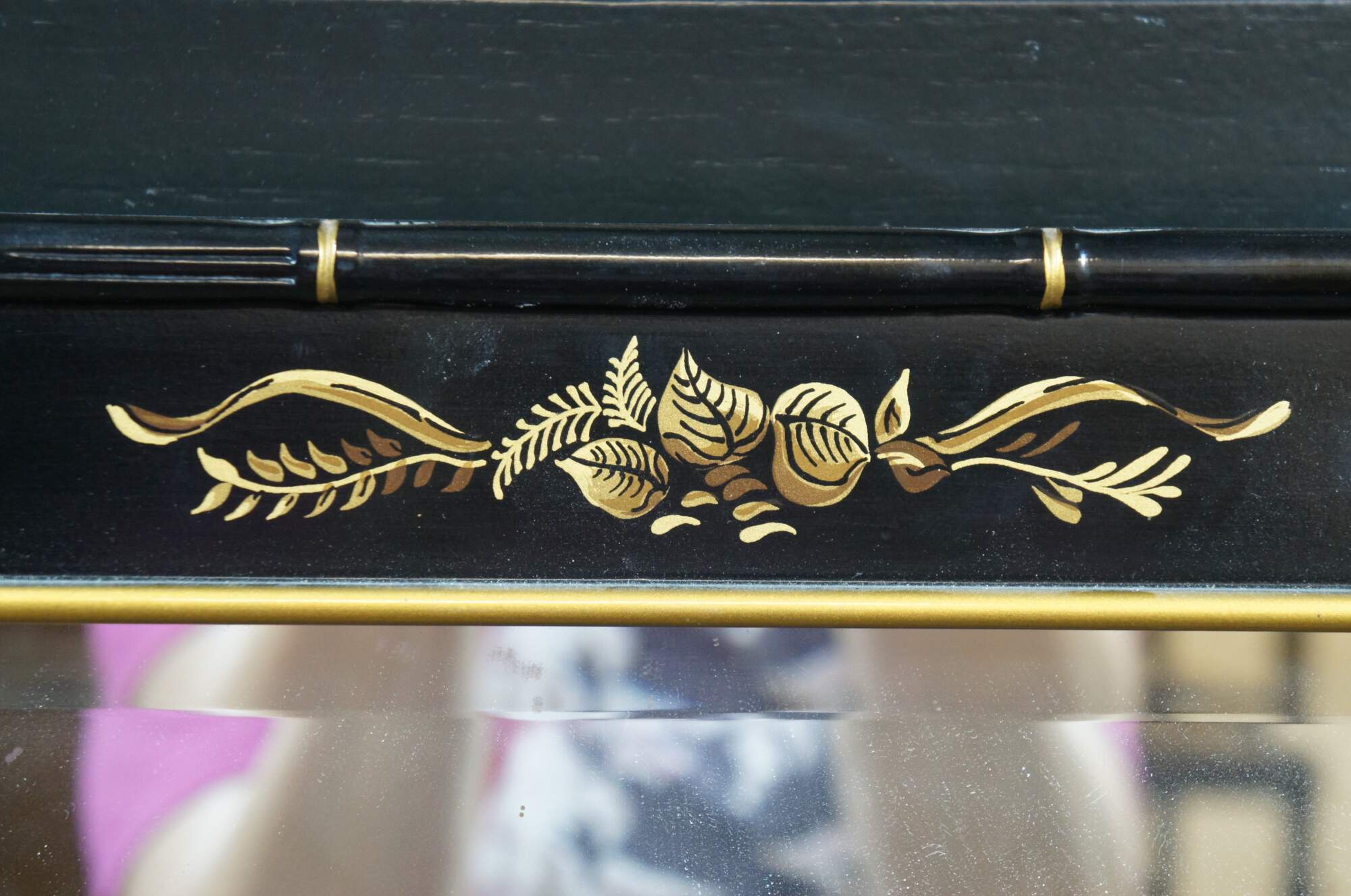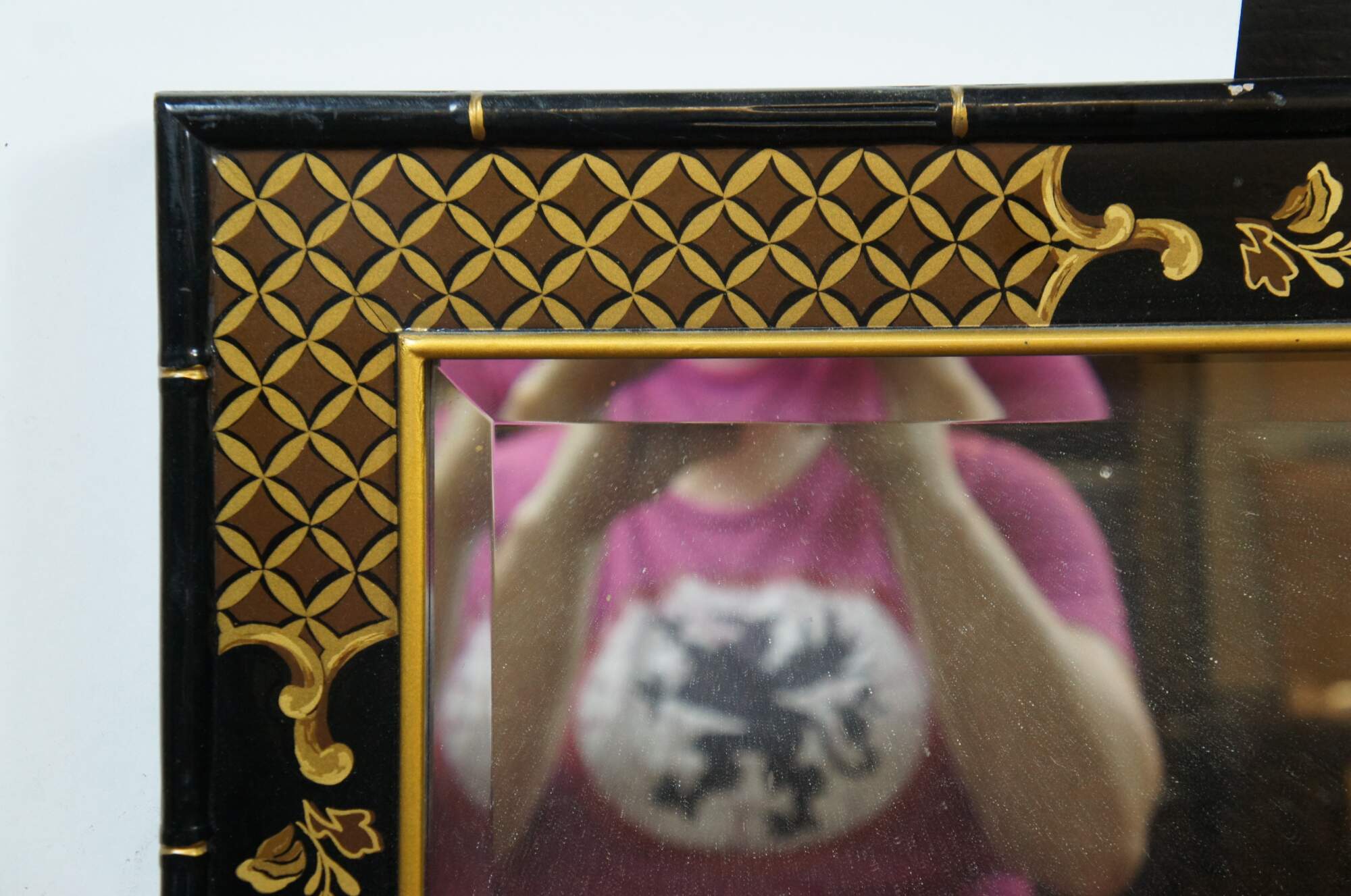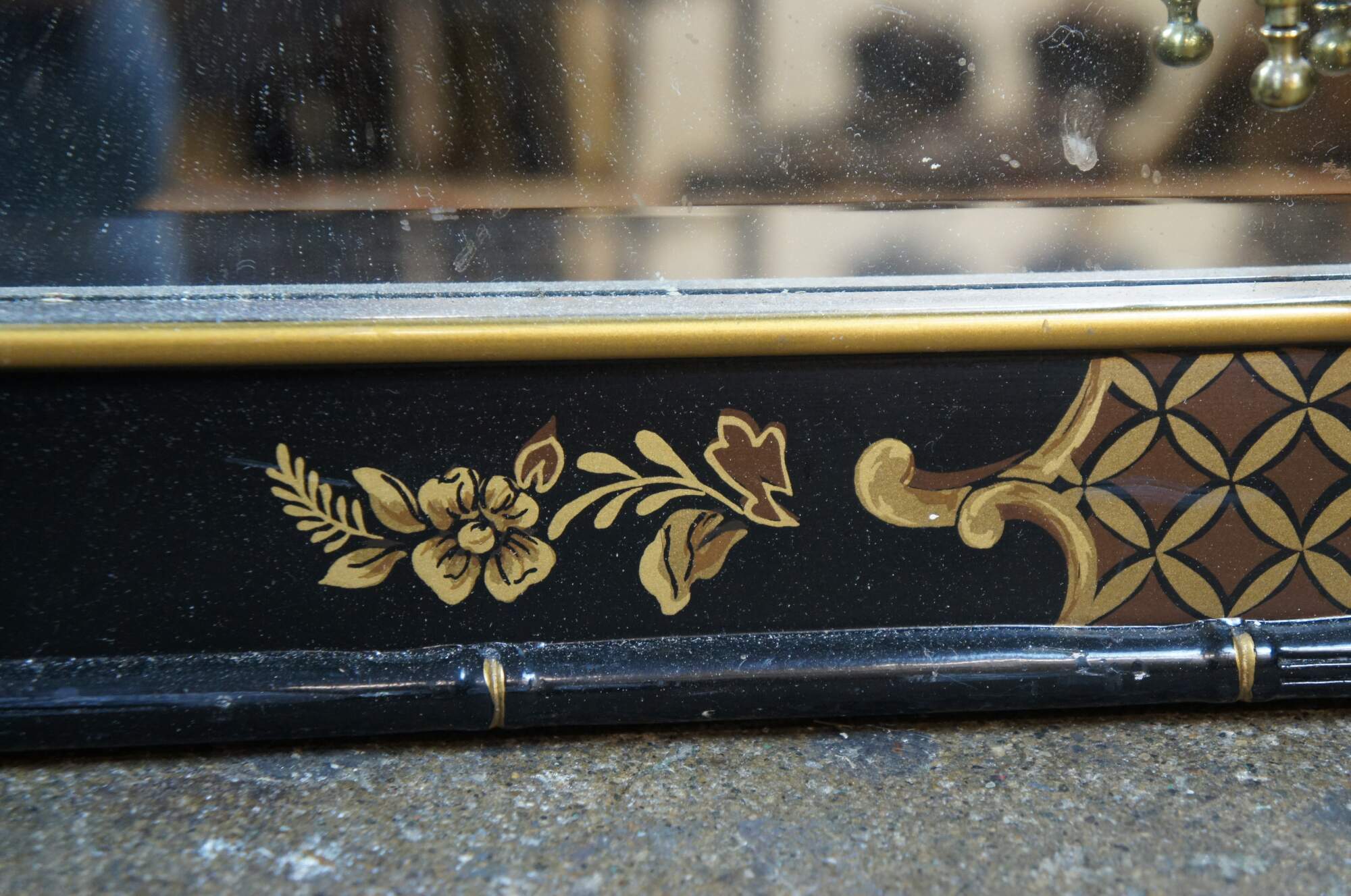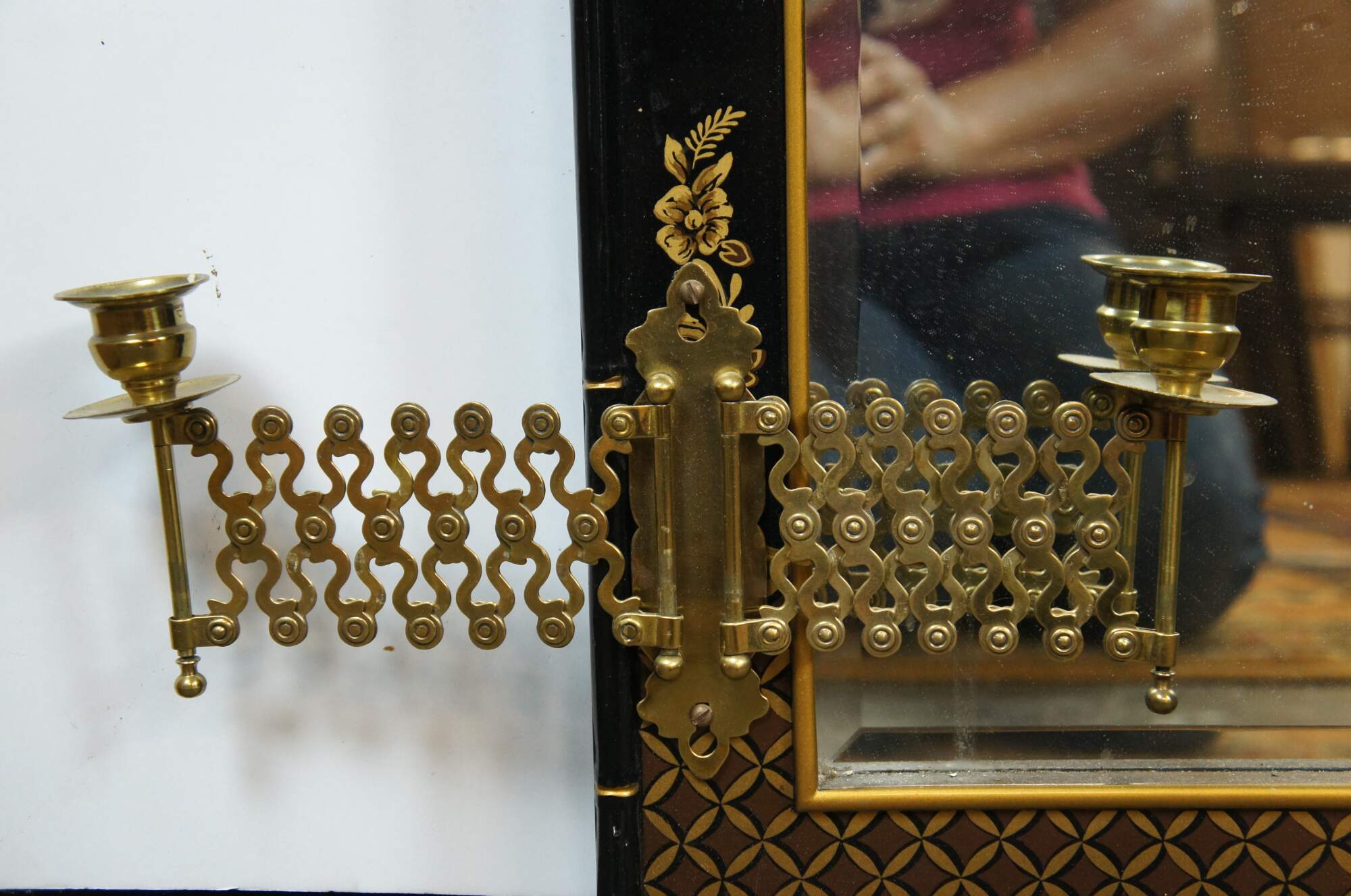 Mid century circa 1963 over mantel wall vanity mirror by Drexel Heritage (Et Cetera Collection). Features a rectangular form with faux baboo edge, painted in black and gold with a Chinoiserie floral and fruit design with lattic corners. Each side is mounted with a pair of swing arm articulating accordion single-taper candlesticks. Beveled glass. Back marked 63 43-215. Drexel Heritage Furnishings Inc - 104035 - Merlene Yates -Inspector, Plant 33.