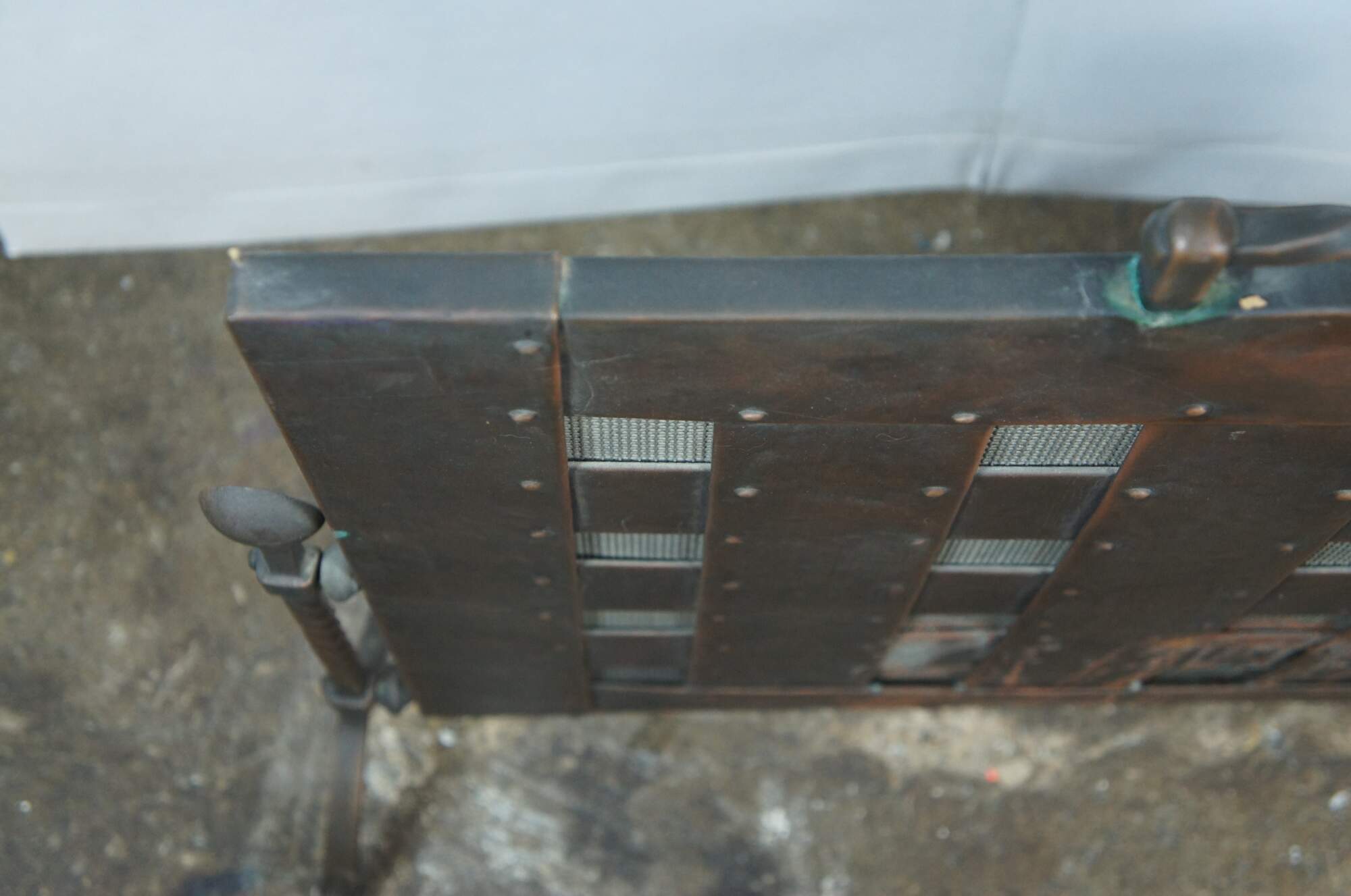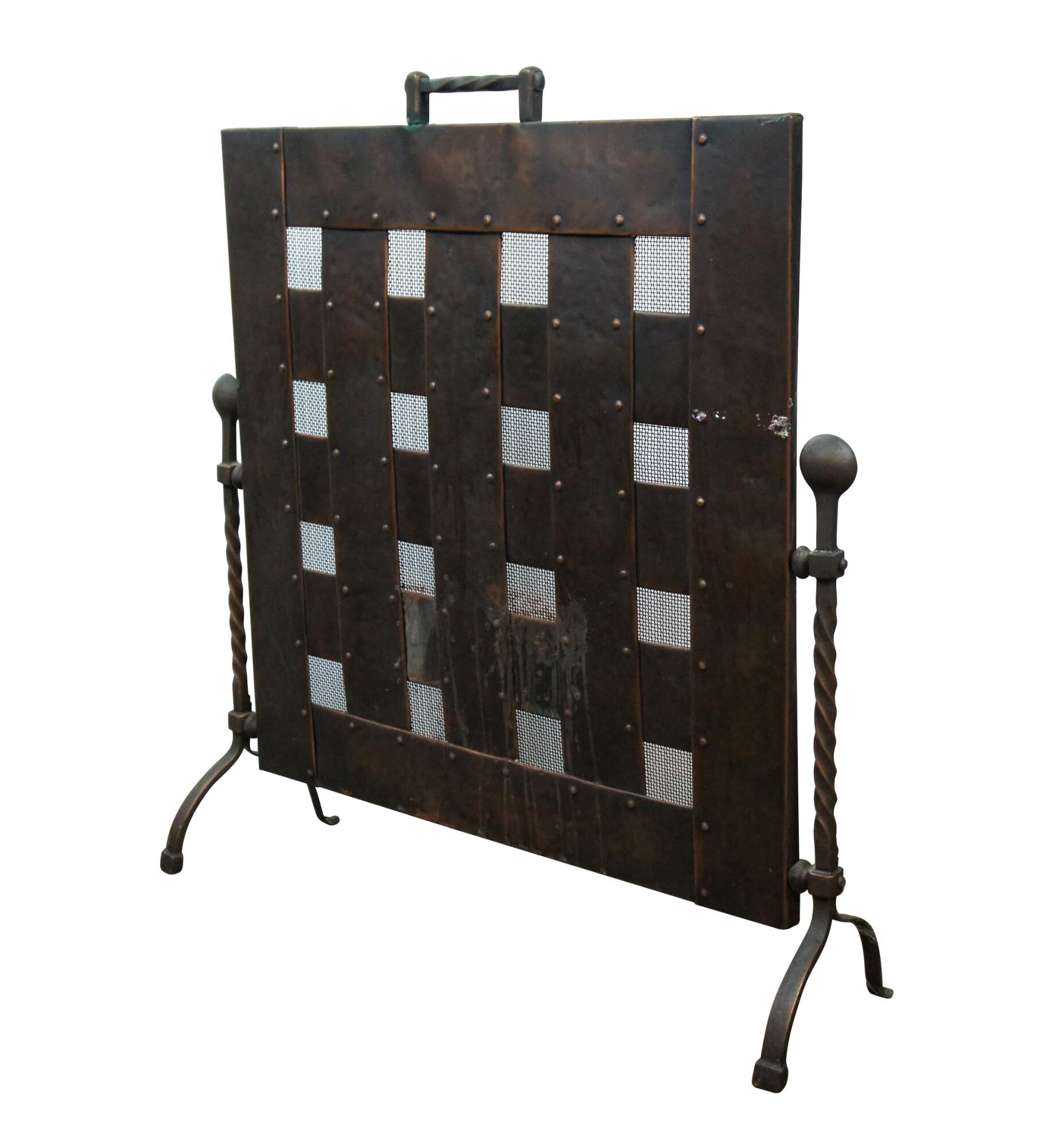 20th century Gothic / medieval style wrought iron and copper fireplace screen featuring twisted iron side supports with ball top and bow legs, flanking a studded lattice panel with nailhead trim and a dark / aged copper, hammered texture and twisted handle at the top. Back lined with metal mesh.