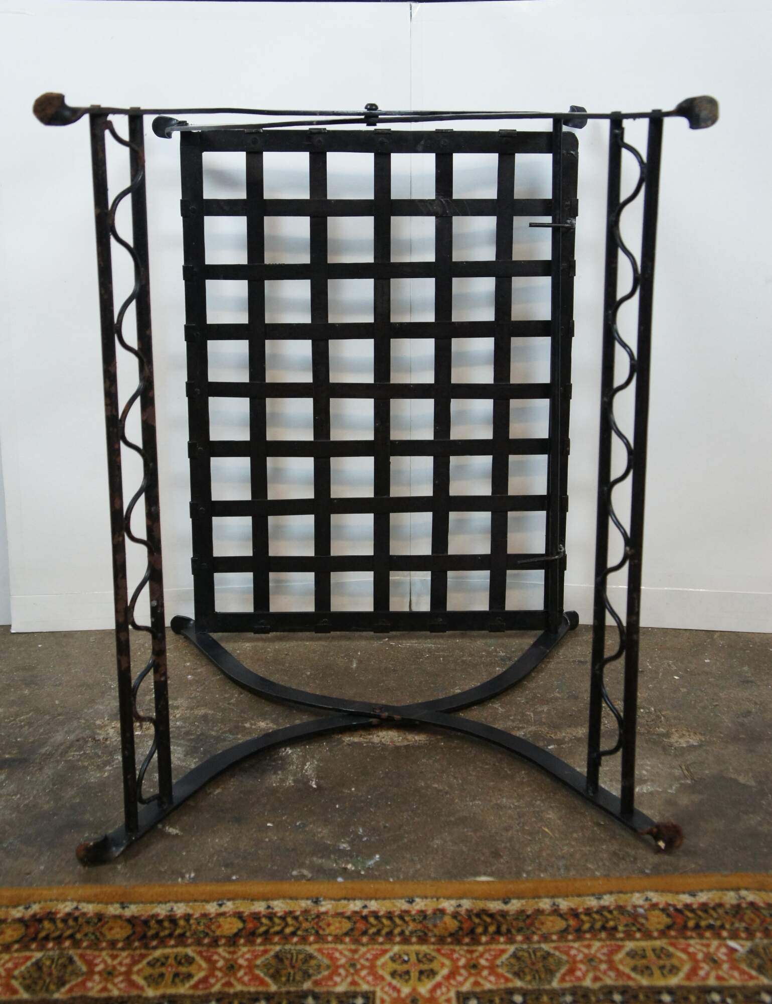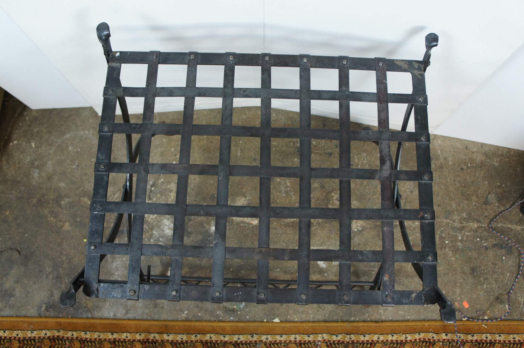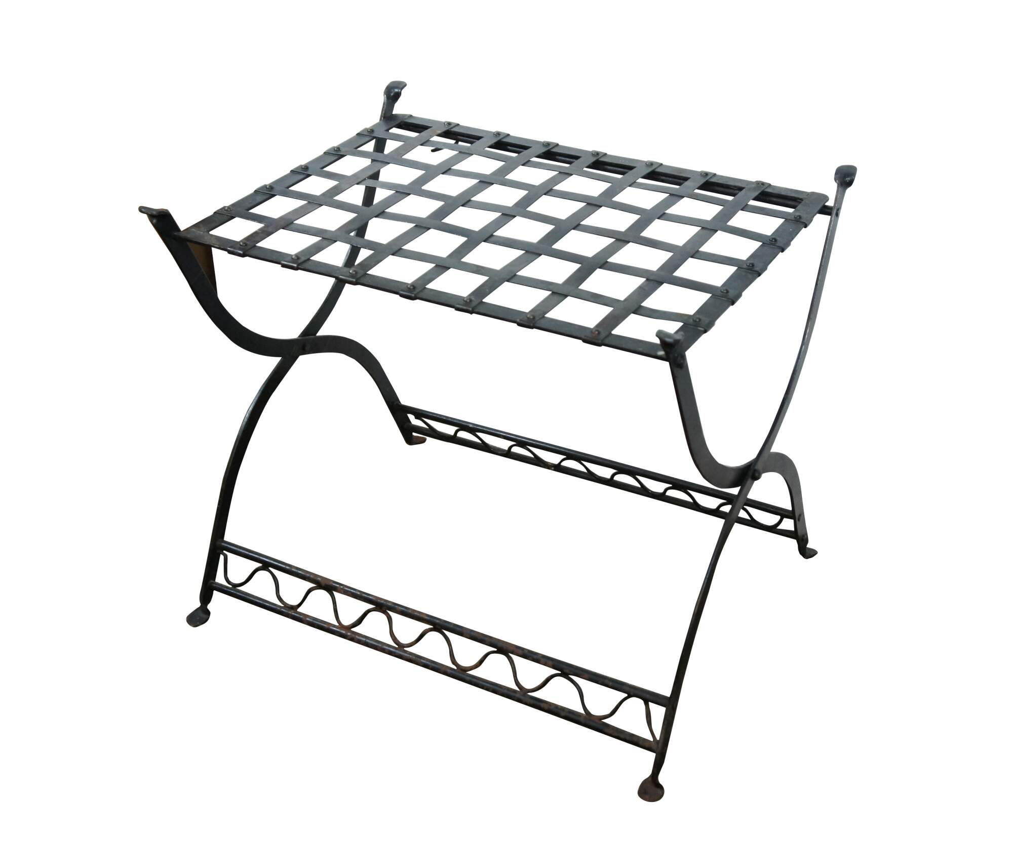 Late 20th century folding iron stand / bench / side table / luggage rack. Curule style legs with wave patterned stretchers, rectangular woven basket weave top.