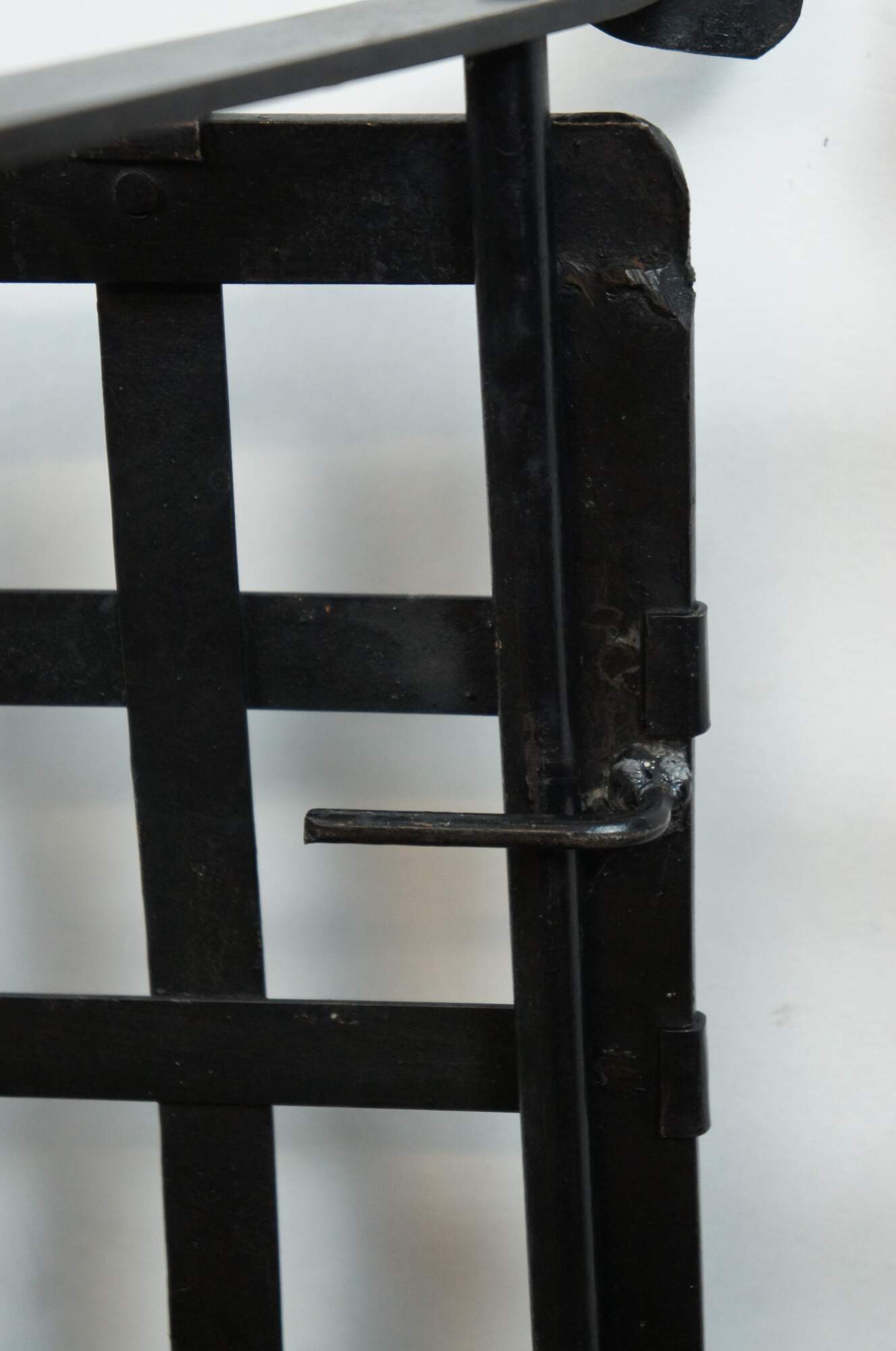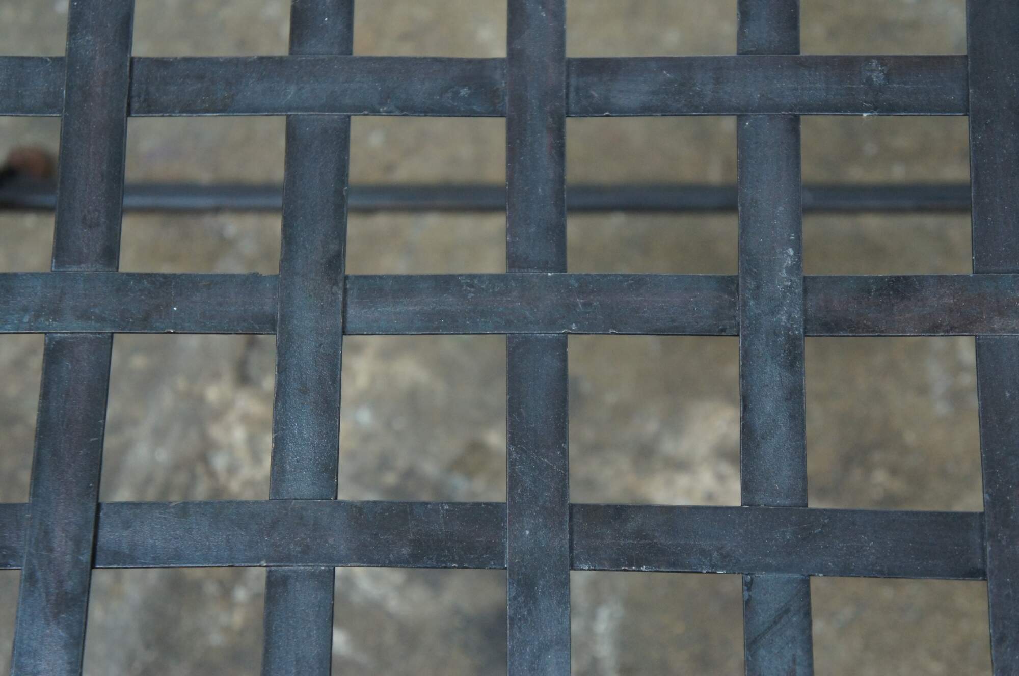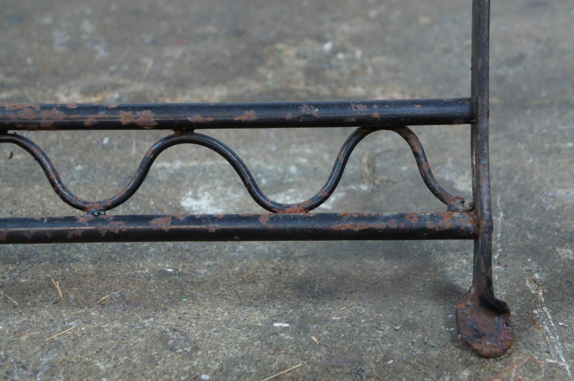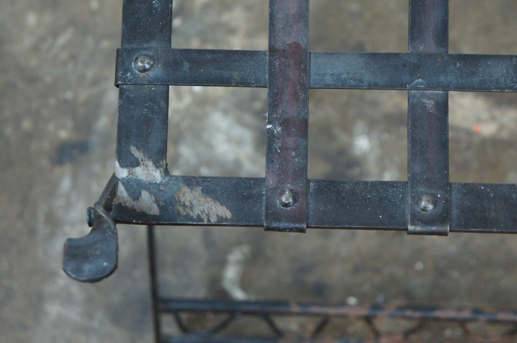 Late 20th century folding iron stand / bench / side table / luggage rack. Curule style legs with wave patterned stretchers, rectangular woven basket weave top.