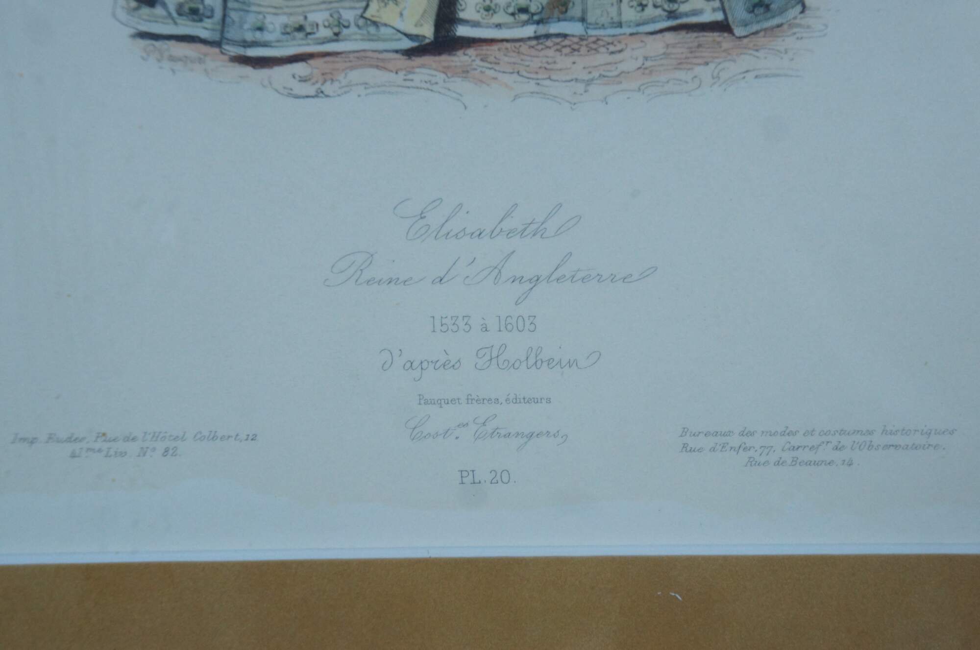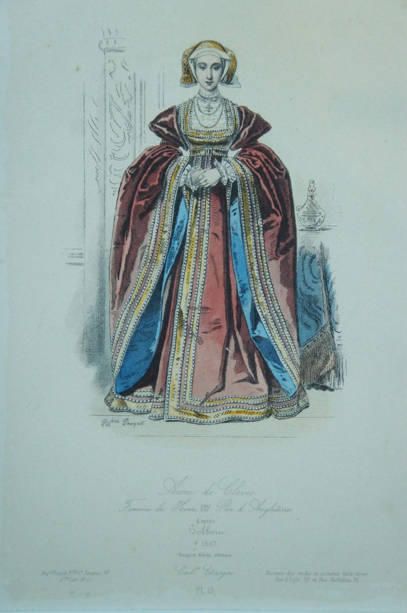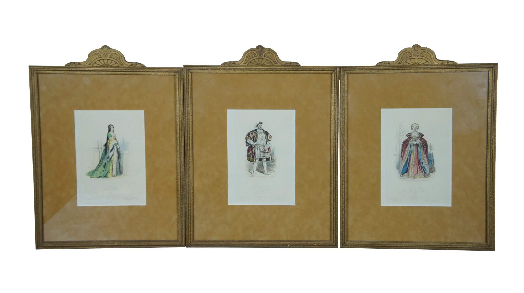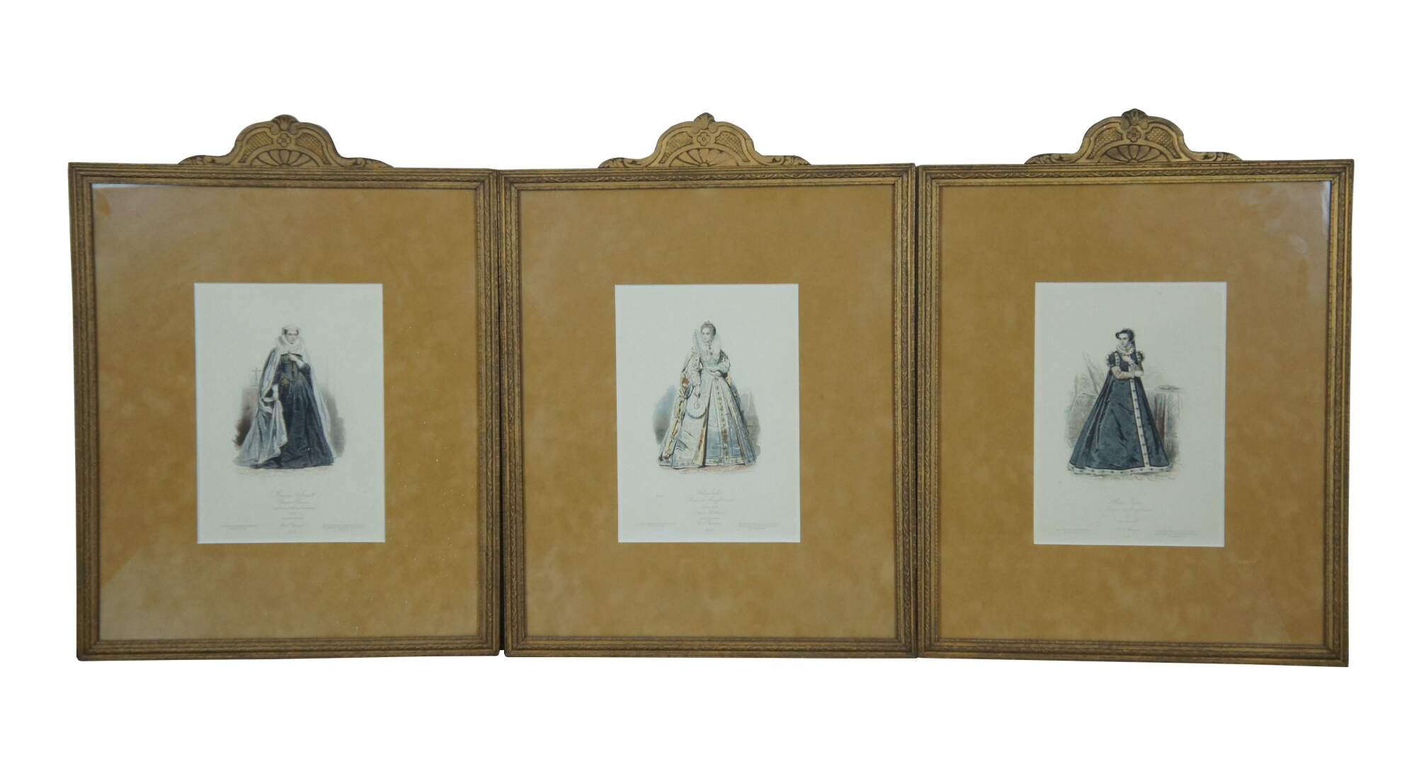 Set of 6 antique colored historical fashion prints by Hippolyte and Polydore Pauquet (Pauquet Freres / Brothers) after originals by Hans Holbein. Published by the Bureaux des Modes et Costumes Historiques (Fashion and Historical Costume Offices). Set inludes: Henry VIII, Jane Grey, Anne of Cleves, Mary Stuart, Mary Tudor, and Elizabeth I. Carved wood frames with scalloped crest, painted in gold; golden-brown mats.